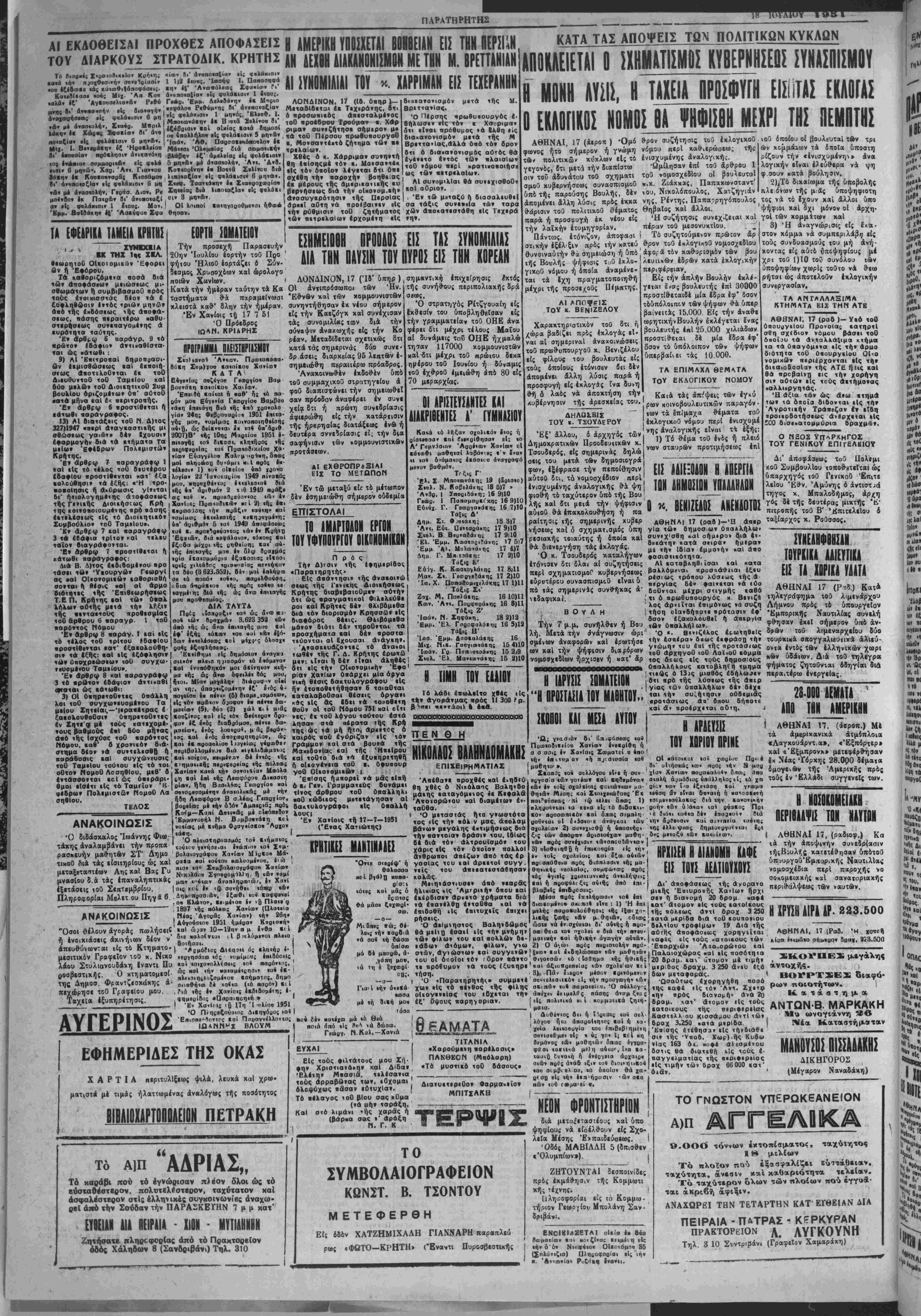 τοθ μα<)—Ή διασπαστική »ΐ»η ΐανό» νά Εβηοεάση άποοασιστι σις ή σημριωθιϊσα ι(ς τούς *όλ «ώς τή* ίξίλ.ξι» «ής ιτολιτι·ής ■ούς τής ϋίΐΕΚ. ή όι?οί<χ δόνα ζωής τής χώρας. Άνόβειξις τοθ γεγο»ό»ος αύ αναχωρεί τοθ ΐόμματος, τοθ είναι δτι είς τοίς εύκλους σθισας βτι δϊοστος τώ» Τν* Φιλιλευθερν» ήρχισβ «Λ συζητηταί ήδη βτι άν γή Μέγα· ί ήοωΐκήν Κάνδανον, ή ό· ανάμνησιν περασμένου λείου. Δι' άπ' εύθείας γαΐ μέ τα διάφορα μέτρα χαΐ ποία, διότι έπολίμησε χατά' τοθ περιορισμεύς δέν Οπάρχουν δι ΓερμανοΟ επιδρεμέω; κα εστρά ότι παρεχωρήθη ρισμένων οΙΉων προνομ.ο* ώ τής πρωτευού σης πού ϊχουν μάθει την τέ χνην, υπό τάς βύλογί« τού χράτουί, νά πλουτίζουν ανέτως* ναί ασφαλώς, ν' άποτ«λοϋν την' θλιβεράν φάλαννα των άετονύ· χηίων καΐ των χομπιναδόρων είς βά(<ος χαί πρός δυστυχίαν' ολοκλήρου τοθ έλληνικοθ λαοϋ. ΦίΗνει το εμπόριον δ όιι δέν ίχει πίστιν. Οί. οίχονομιχοΐ όρ· γανισμεΐ άφοΰ χατώί~-θ·ωσαν ν' άναζ^τήσουν, άπο τό' 'αΐμα καΐ τόν Ιδρ&ΐΛ τοθ λαοθ, ψη έκ ν"εμελίων £έ» η ν' αποκτήση παρά μερικούς χά χοΐέχνους χαΐ πολυδαπάνους ηυ (ΑΥΡΙΟΝ, τδ β' μέρος) ται »ά χαραιτηρισθή «αί ώς συιωμοσΐα 6ιΛ τή» ματαΐωσιν <ώ» εκλογήν, βηέτυχι εατά τή* πρώτην οΰτ!)ς φββι». Καί τοΰ το διότι τσν «. Τσουβερό» ή ιολούθησα» τβλκΰς μόνον 10 βουλευταΙ τχντΐ τώ» 16 οΐόασϊοι ηαρεστησα» είς ιήν σθσυψι» •αθ' ή' ανεκοίνωσε τή» άαοφ» σΙ» τού ηερΐ άηοχωρήσεώς τού έκ της ΕΠΒΚ. Ή βιααΐστω σις αθ'ή τής άδυναμίας τοθ κ. Τσουδερου νά παρασύρη, μεναλο» αριθμόν ρΌυΙιυι&ν βηυιουρν·ϊ <ό« σχηματισμόν άσβαλοθς αλέον ηεηοιθήσεως ό(ΐ ή χώρα βαδιζβι ιατευθιϊαν πρός τάς £«λογά;, έιδεχομε νως Εέ «αί ενωρίτερον τοθ «ροσβιορισββντος χρόνου Έ5' βλλου, η αποχώρησις τοθ ■ ΤσουβιροΟ ουδεμίαν ά ηήχησι» Εσχε* ·1ς τάς λαϊκάς όρν/ο'ώσιις τής ΕΠ ΕΚ «αί ά τί λΙυ συνβσοιξι αιρισσό «ήν συνοχή» τοθ εόμμα τος τ Α όττοίον τώρα τκρισσότε ρο» όμοιογενες «αί συμπαγίς ΘΛ προχωρήοη τθ ταχύτερον ιΐς τή» ηραγματοηοΐησιν τής λαί^ής θελήσεως ή ό ποία ■«- •ρόζιται σήμερον «(ς τό ούν θηοα «ιΐρήνιυσκ—άλλαγή». Ου τω, τό εαανεμφονισθιν Δή μο ραιι«ό» ϋροοβιυτικόν εόμ •·α Οπό τό» «, Τσουβίρό» οθτι βς λαϊ ή κίνησις άλλ' οθτε «ι αι ώς εοινοβουλ' υπ«ή ομάς «αί κατά «οσόνεΐναισυμοιρουσα ήσυνχώ νευσις μιτ' αύτω» τοθ κόμ ματος τοθ κ, Γσουδιρ Ο. Κατά συνΐαεια» αί έλπΐδΐί συγΐροτήσεως κυβεριήσκως έ« τής τιαρηύσης Βουλής δχι μό »ο» έμειώθησαν άλλά έξίλιπο» όλοσχΐρώς «ατα την γνώμη ώρισμί»ω» ηολιτΐκιΤιν κύ<λω· τί όιοΐοι οισ'ίύουν Οτι ή τελι «ή ά-οσα·ή»ισις τής καιοστό σΐως θά επέλθη μετ* τή» ψή •ισιν τοθ έκλογκοθ νόμου ΤΟ ΙΣΤΟΡΙΚΟΝ ΤΗΣ ΔΙΑΣΠΑΣΕΩΣ Έν σχίσιι μέ τό Ιστρρι*ό>