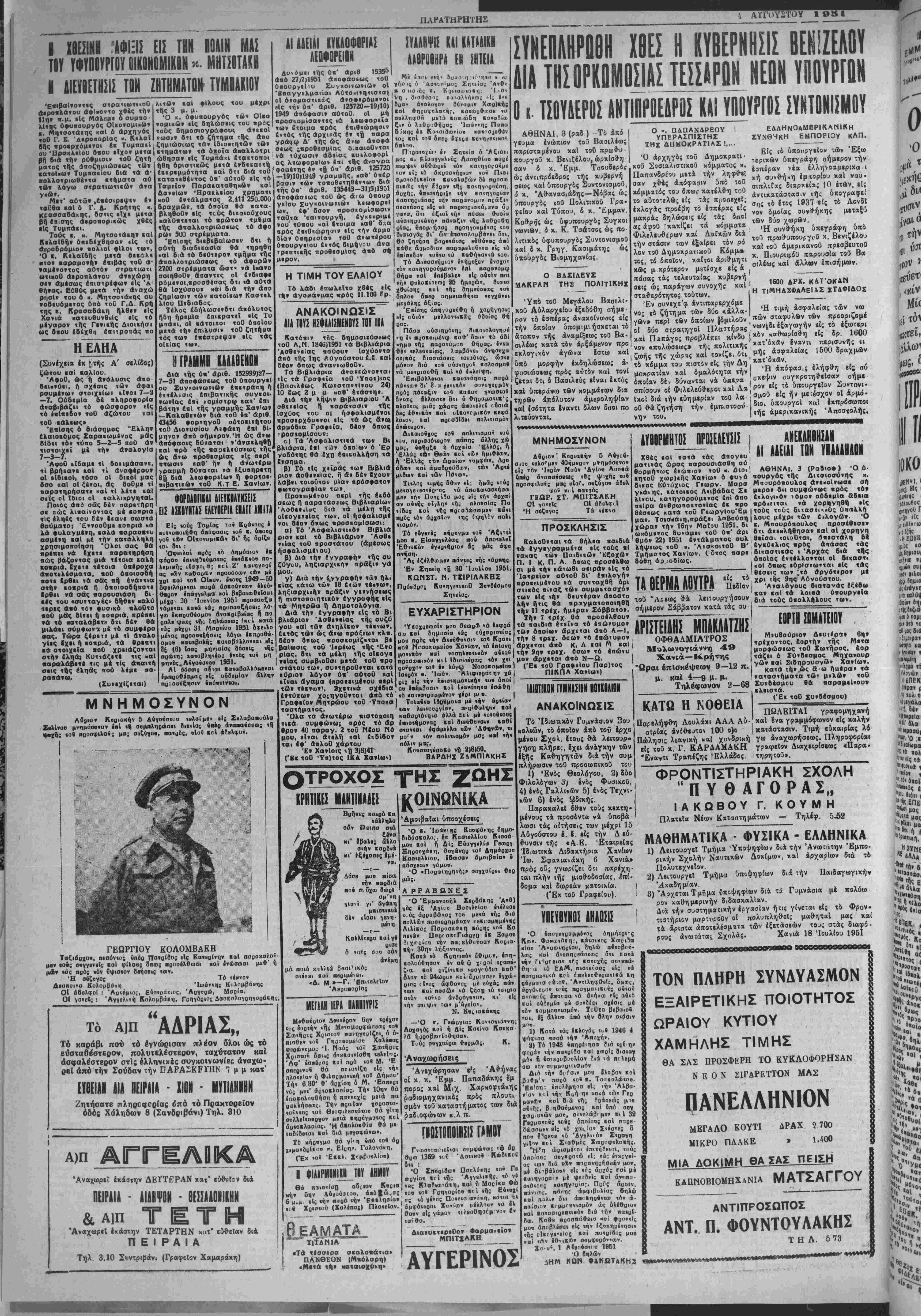 θοον βΙ; γάμοτ <ι)ιοθηοέμ νόν εν ιο<θα. Δια«υκτ·ρ«0ον Φαρμακείον ΜΠΙΤχΑΚΗ_______ ΑΫΓΕΡΙΝΟΣ ΜΝΗΜΟΣΥΝΟΝ Δβοιον' Καοιακήν 5 γ σ;οο «βλο'μβν 40ήμεοπν μνημόσανον βΐ; τόν Ίιαόν Ναόν Άγίοο Αυακά ίο άνσαανσβω; «βς ψοχήϊ «οβ ποοοφιλοίς μας «Ιο?. οοζύγοο άββλ ΐίο» Μι, ί πα«αός ΓΕΩΡ. ΣΤ. ΜΠΙΤΣ,ΑΚΗ ΟΙ γανεΐς ΟΙ άδβλφίΐ Ή οβζογο; Τα ιίίνα ΠΡΟΣΚΛΗΣΙΣ Καλοθνιαι τα Θήλεα παιβιά τα Ιγγεγραμιιεΐα είς τούς «Ι νακας τΰν Παι6ι*ών 'Κξοχΰ* Π. Ι κ, Π. Α. δβως νροσέλθω σι μέ την κάτωθι σειράν είς τό Ιατρειον αθτοϋ δι' ένιλονήν «ροιεΐμίνου »ά συνταχθή όρι στικός αίοαξ των συμμετασχόν των είς «ήν δευτέραν άαοστο λήν ήτις θά οραγμαίοποιηθή την 11 «ρέχ. ημέραν Σάββατον. Την 7 τρΐχ θά προσέλθουν τα «αιδιά έ<«ίνα τό επώνυμον των οποίων άρχεται άαό Α—Ι, την 8 τρεχ. δοωτ *ό έβώτυμον άρχεται ά«ό Κ· Λ καί Μ καί την 9η» τρεχ. βοών «6 εηώιυ μόν άρχεται άβ6 Ν—Ω. (Έκ τοθ Γραφεΐου Παρ)τος ΠΙΚΠΑ Χανίων) ΙλΙϋΤΙΚΟΝ ΙΥΜΝΛΣΙΟΝΒΟΥΚΟλΙΟΝ ΑΝΑΚΟΙΝΩΣΙΣ Τό Ίδιωπχόν Γυμνασιον 3ου κολιών, τό οποίον άπό τοΰ έρχο μένου Σχολ. ίτους θά λειτουρ- γήοη πλήρε:, Ιχει ανάγκην των εξής Καθηγητών διά την συμ πληρώσιν τοϋ προσωπικού τού 1) Ενός Θεολόγου, 2) δύο Φιλολόγων 3) ενός ΦυσιχοΟ. 4) ενός Γαλλΐκδν 5) ενός Τεχνι- κων 6) ενός Ωδιχής. ΠαραχαλεΙ δθεν τούς χεχτη· μένους χά προσόντα νλ ΰποβα λωσι τάς αίτήσεις των μέχρι 15 Αύγούστου έ. Ε. είς την Δ εύ· θ·υνσιν τής «Ά Ε. Έταιρείας Ίδ,ωτιχα Διδακτήρια Χανίων Ιω. Σφακιανάκη 6 Χανιά» πρός ου; γνωρίζει 8:ι παρέχη- ται πλήν τή; μισθ·οδοσία{, επί* δομα χα δωρεάν κατοιχία. (Έκ τού Γραφείου). ΔΪΒΙΡΜΗΤΟΙ ΠΡΟΙΕΑΕΥΙΙΙ ΧΘές «αί «ατά τάς άηογευ ματινάς ώρας παρουσιάσθη αΰ θορμήτως ενώπιον τοθ ·■ Διοι «ητοθ χωρ)<ής Χανίων ό «υγό διεος ΕΟτύχιος Γεωρν- Μαρα γιιάιης, «άτοιιος Λιιβάδας Σε λΐνου, κατηγορούμ*νος επίάπο «εΐρα άνθρωηοιτονΐας εκ νρο θέσεως κατά τοθ ΓεωργΙου'Εμ μαν. Τσισ«άκη,ηράξ«ι λ"Βούση χώραν την 16ην Μοΐου 1951, δι ωκόμενος δυνάμει τοθ ΰπ' ώρι θμόν 22) 1951 εντάλματος συλ λήψεως τοθ ·. Άνα«οιτο0 Β' Τμήμοτος Χανίων. Ούτος «αρε δοθή άρ ,οδΐως. ΤΑ ΘΕΡΜΑ ΛΟΥΤΡΑ τού "Αβειος θά λεπουργήσουν σήμερον Σάββατον χατά τάς συ· ΑΡΙΣΤΕΙΔΗΣ ΜΗΑΚΛΙΤΖΗΣ ΟΦΘΑΑΜΙΑΤΡΟΣ Μυλωνογιάννη 49 Χανιά—Κρήτης "Ωραι επισκέψεως 9—12 π. μ. καί 4—9 μ. μ. Τηλέφωνον 2-68 ΚΑΤΩ Η^ΟΘΕΙΑ Παρελήφθη Λουλάχι ΑΑΑ Αυ¬ στρίας άνέθευτον 100 ο)ο Πώλησις λι*νΐχή **1 χονδρΐκή είς τοθ χ. Γ. ΚΑΡΔΑΜΑΚΗ. Έναντι Τραπέζης Ελλάδος. ΑΜΕΚΑΗΒΗΙΑΝ ΔΙ ΑΑΕΙΑΙ ΤΟΝ ΥΠΑΑΛΗΑΟΝ < ΑΘΗΝΑΙ. 3 (Ραδιο·) Ό ύ· πουργός τής Δκσιοσΰνης χ. Μπουρόπουλος ανεκοίνωσε σή μερο* δ«ι συμφώνως πρός τόν εκλογΐ»όν ιόμο» οϋδεμΐα ΰίδεια «ρ6ε(ΐται νά χορηνηΘή είς ι τούς τού; διτασΐκχό; ύηαλλή [λους μέχρι των έ.λονών. Ό κ. Μπουρόηουλος προσέθεσεν δτι ανεκλήθησαν καί αί χορηγή θεϊσαι «οιαθται, απεστάλη δέ εγκύκλιος «ρός ά<ιάσας τάς δικαστικάς ι Αρχάς διά τής .οποίας έντέλλονται οί βικαστι Ι «οί δνως εΰρΐσιωνται είς τάς ' Θίσεις των *«ό αργότερον μϊ χρι τής 9ης Λονούστου. ι Άναλόγους βιατανάς εζεβ» ' εάν «αί τα λοιπά ύπουργεΐα διά τούς Οηαλλήλους των. ΕΟΡΤΗΙΟΜΑΤΕΙΟΥ Μιυθούριο* Δευτέρα* 6η* τρέχοντος, εορτήν τής Μετα μορφώσεως τοθ Σωτήρος, έορ τάζει ό Συνδεσμος Μηχανουρ γών καΐ ΣιβηρουογΏ' Χανίων. Κατά την.ώς α ω ήιιίρα» τα «αταστήματα τώ* μ·λων τοθ Συνδέσμςυ θά παραμεΐνουν κλειστά. (Έκ τοθ χυνδίσμου) ΠΩΛΕΙΤΑΙ γραφομηχανή χαί Ινα γραμμόφωνον είς καλήν κατάστασιν. Τιμή εύκαιρίας λό γω αναχωρήσεως. Πληροφορίαι γραφείον Διαχειρίσεως «Παρα· τηρητοθ». ΥΠΕΪΒΪΜΟΙΔΗΑΒΣΙΣ Ό «ηονβγοσμμίνο; ΔημηϊοΓ ς Καί», Φοοακάιη:, «ά«οι«ος Χαιρ