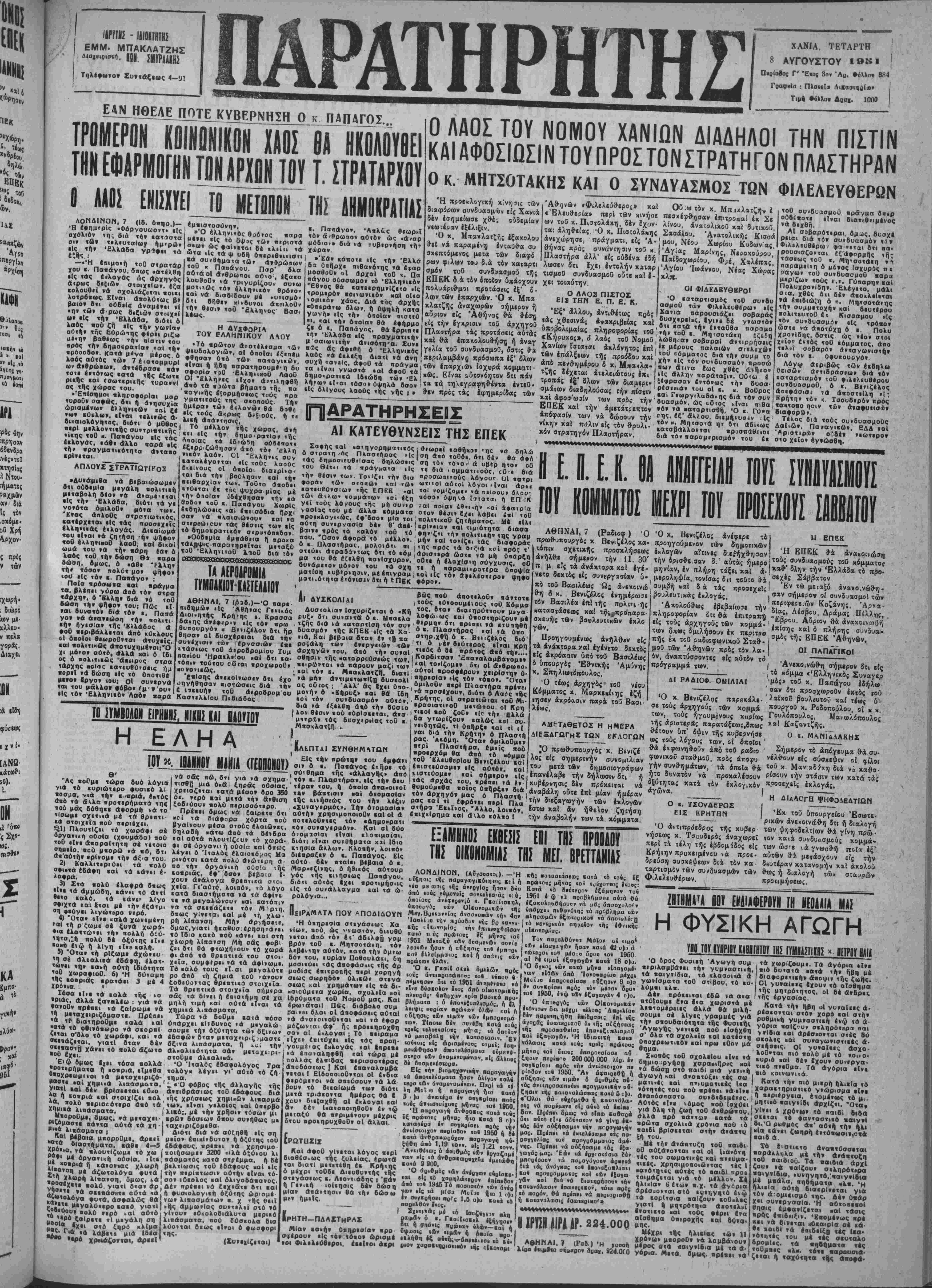 αθ'άοΐ «νθρωποι ο0<ο , εξατκο λουθοθν νά τριγυρϊζουν σιινω μοτκως τό» βλληνιιόν θρόνον ■αί νά διαδΐβουν μέ «υνισμό» δτι βήθιν χΐνβυνοι άηβιλοθν «ή» θίσιν τοθ "Έλληνος* Βασ· λεως. Η ΔΥΣΦΟΡΙΊ ΤΟΥ ΕΆΛΗΝΙΚΟΥ Λ^Υ »ΤΑ πρώτον αποτελεσμα τώ» ψευδολογιων, αί οποίαι ίξιπεμ •βησαν υπό των παπαγκών, ■Ιναι ή ί;,6η ααρατηοουμ··η 6υ σ#οοιο τΐθ Ελλην ιχοθ Λαοθ ΟΙ "Ελλη»ΐς είχον αντιληφθή άπό τα «,ϊώτα βήματα τή; ηα ■αγι·ής έ',ορμήσεως τούς προ νματιιούς της σΐοηούς. Την ημέραν των έιλονω» 0ά δοθή •Ις τούς ά<ρως δίξΌθς, ή τ« λική ααάντησις, Τό μελλον «ής χώρας, άνή ■«ι είς την 6ημο·ρατ(αν ιής ΛποΙας «α Ιδ»ώ5η οΰβεποτε ίξιρριζώθηίαν άΐιό τΑ» '£λ»η νιιόν λαόν. ΟΙ "£λλη»ες αυγ καταλέγονταΊ είς τοϋς λαούς έκεΐνους οί όαοΐοι διαΐρΐνοι ται διά την βούλησιν εαΙ «ήν ■ιιθορχΐο» των. Τουτο άοο&ει ε,νύεται εκ της ψυχραμίας μέ «ή* Αηοΐαν ίδιχθησα» την κα βοδον τού ι. Παααγου ΧωρΙς εκδηλώσεως καί έσκσόβια ήρχι σαν να «λαισιώνου· «αί να στερεώιουν τάς θίσιις των είς «ό δημοκρατικόν σίρ««όηε6ο*. •ΟΟβεμΙα έμειάθιια ή προκα τολ|)ψις ηαρ«τηρεΐται μιταξθ «αθ 'ΕλληνκοΟ λ,ΐοθ δια τόν κ. Παιτάνον. 'Λπλ&,ς βεωρεΐ τό» ά'βρωαον αυτόν ώς «ά»αρ μόδ<ο·> διά νά ·υβ*ρ*ήση τή*