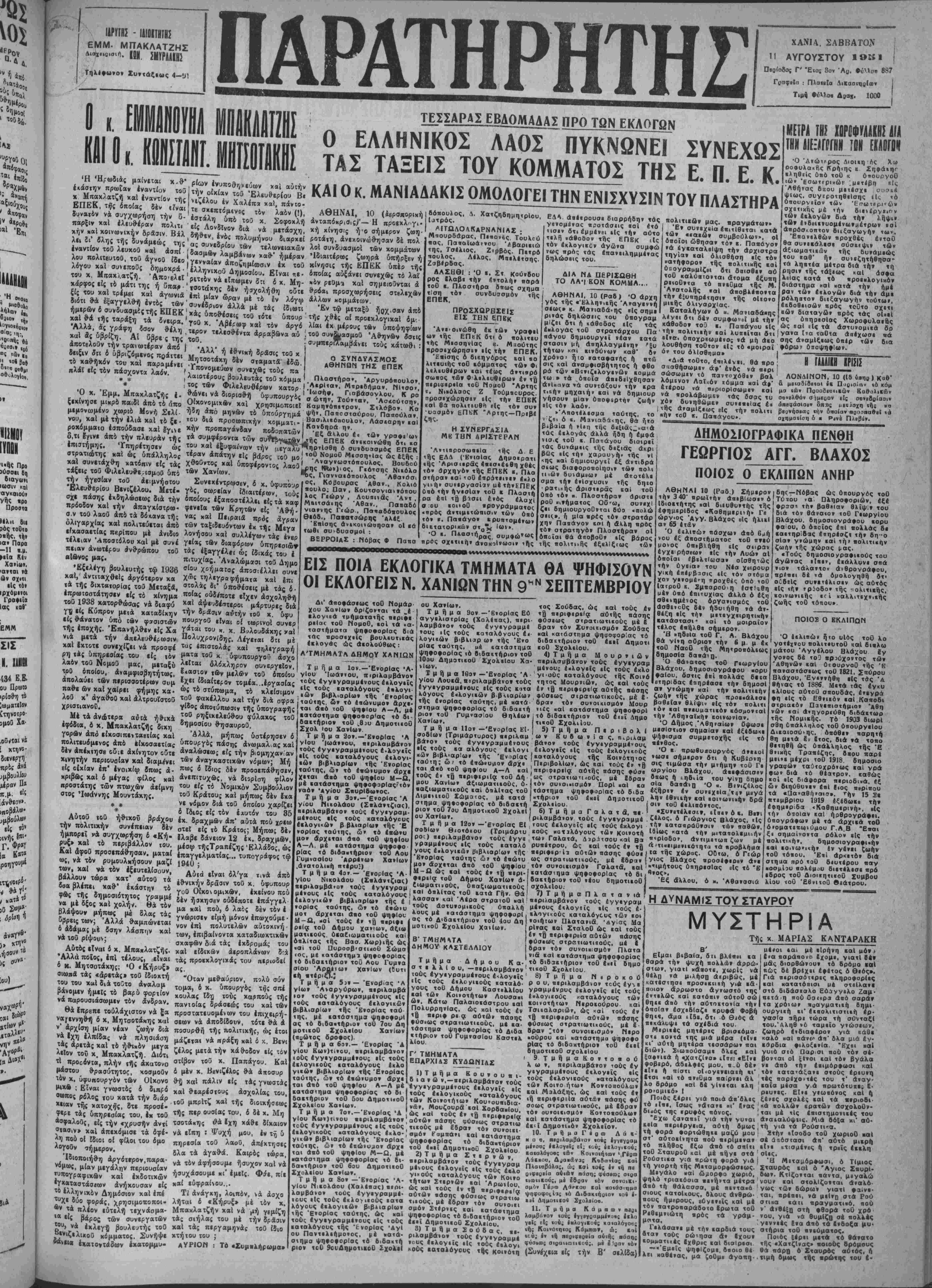 χαΐ *ά τ<)ς ταράξη τα δνειρα. 'Αλλά, &ς γράφη ίσον θέλη χαΐ ί{ ύβρίζη. Αί δβρε ς της άποτελοθν την τρανωΐέραν άπί δειξιν δΐι ό υβριζέμενος πράττει τδ καθήκον τού χαΐ παραμένει πλαϊ ιίς των πάσχοντα λαόν. Ό χ. Έμμ. Μπακλατζής έ· ξεκίνησε μιΝρθ παιδ! άπο το άπο μιμονωμένο χωριό Μονή Σελί- νού, χαΐ μέ την έλιά χαΐ τ& ξε - ροχόμματο έσπούδασε χαΐ βΥινε δ,τι εγινε άπ4 την πλευράν της επιστήμας. Ύπηρέτησεν ώς στρατιώτας κα! ώς δπαλληλος χαι συνετάχθη κατόπιν ιίς τας τίξεΐί τοΰ Φιλελευ#ε;ιαμοΟ υπό τή* ήγβσίαν τού αειμνήστου Ελευθερίου Βενιζέλου. Μετέ- σχε πάσης εκδηλώσεως διά την πρόοδον χαΐ την άπαγκίστρω- σ.ν τοθ λαοΰ άπο τα δοκανα τή; όλιγαρχίας χ αί πολιτεύεται άπδ ειχασαετίας περίπου μέ «νιδιο τελείαν "Αποστόλου χαί μέ συνέ πειαν ανωτέρου ίνθ·ρώπου τοΰ αΐωνος μας. •Εξιλέν», βουλευτής τώ 1936 χά), ίντιτβχθεΐς αργότερον χά ιά της δικτβτορίας τού Μεταξά, ίπρωιοστάτΐ}σεν είς τό χίνημβ τοθ 1938 χατορθώσας νά διαφύ γη είς Κύπρον μετά χαταδίκην είς θάνατον υπό των φασιστών τής ίποχής. Επανήλθεν είς Χά νια μετά την απελευθέρωσιν χαΐ Ιχτοτε συνιχίζει νά προσφέ ρη τ«ς υπηρεσίας τού είς ιόν λα6ν τοθ Νομοΰ μας, μεταξύ τρθ όποίου, αναμφισβητήτως, άπολαύει των περισσοτέρων συμ παθε ών χαΐ χαίρει φήμης χα· λοθ χ' άναθοθ χαί άλτρουϊστοθ χριστιανόν. Μέ τα ανωτέρα αντα ή8·ιχ4 ίφόδια, δ χ. Μπακλατζής δικη γορων άπό εΐχοσιποταβτίας χαί πολιτευομενος άπό είχοσαιτίας δέν απέκτησε ου;ε άκίνητον ουτε κινητήν περιουσίαν χαί διαμένει είς οικίαν έπ' ένοικίφ βπως ά* χριβώς χαί ό μέγας φίλος Μα1 προστάτης των πτωχών άείμντ} οτος Ιωάννης Μουντάχης. ΑΘΗΝΑΙ, 10 (ί6ρσπορΐΗή άνταπόκρισις/— Η προεχλ"γι (ρ1ων ενυπο&Τ/.εύων χβΐ αυτήν την οικίαν τοθ Ελευθερίου Βε νιζέλου έν Χαλέπ» χαί, πάνιο- τε σκεπτ<5μιν*ς τ4ν λαόν (!), Ιατάλη υπο τοθ χ. Σοφοκλή είς Λονδίνον διά νά μετάσχη, χή κίνησις ή'ο αΊιμίρον ζωη (δί)θ·ιν, ενός πολυμήνου διαρκεί ροτάχη, ανεκοινώθησαν δέ πολ άς ουνεδρίου των τελωνειακών λοΐ συνδυασμοΐ των κομμάτων |δασμβν λαμβάνων χαθ·' Ημέραν Ιδιαιτέρως ζωηρά υπήρξεν ή Ι γενναίαν αποζημίωσιν έκ τού κίνησις τής ΕΠΕΚ υπέρ τής ^λληνιχοΰ Δημοσίου. Είναι «ε- δποίας αΰξάνει συνεχδς τό λαί' ριτ»6ν νά είπωμεν δ:ι δ κ. Μη¬ τσοτάκης δέν ήσχολήθη οδτε επί μίαν ώραν μέ τό §ν λόγω συνέδριον άλλά μέ τάς ίδιωτι ΤΕΣΣΑΡΑΣ ΕΒΑΟΜΑΛΑΣ ΠΡΟ ΤΩΝ ΕΚΛΟΓΩΝ Ο ΕΛΛΗΝΙΚΟΣ ΛΑΟΣ ΠΥΚΝΩΝΕΙ ΣΥΝΕΧΩΣ ΤΑΣ ΤΑΞΕΙΣ ΤΟΥ ΚΟΜΜΑΤΟΣ ΤΗΣ Ε. Π. Ε. Κ. ΚΑΙΟ κ. ΜΑΝΙΑΔΑΚΙΣ ΟΜΟΛΟΓΕΙ ΤΗΝ ΕΝΙΣΧΥΣΙΝ ΤΟΥ ΠΛΑΣΤΗΡΑ Δ. Χα«ζηδημητρΙου, ΕΔΑ. απέκρουσε διαρρήδην τάς ηολιτικ&ν μας. «ρανμάτω»» __...... _ ν·*ομί·ας «οοΐϋσεις ·ο» ««6 | Έν συτεχβία επ,τΙΘ.τα. κατ «ΰν «εαεΰ* συμβούλων *4ν ρεθμα χαί σημειούνται ά θρόαι προσχωρήσεις στελεχώ ίλλων «ομμάτων. Έν τω μεταξύ ήΌχσβν άπδ λίαι έχ μέρους τβν ύποψηφίων τοθ συν_ιασμοα "Αθηνών δστΐς τούς κάτωθι (χάς όποβ-έσεις τοθ τδτε υπουρ ' τής χθες αί προεχλονιχαΐ δμ·. Τ°0 χ. Αβέρωφ χά) τόν άργέ λί έ έ ύψί , τερον τελεσθίντα άρραβώνα αύ το°· Ι 'Αλλ' ή ίθνΐκή δράσις τοθ χ Μητσοτάκη δέν σταματδ' έδδ. ('Γπονομευων συνεχβς τούς π» λαιοτέρους βουλευτάς τού χόμμα ι τος των Φιλελευθέρα **., νά δ,ορ,σθή 6φ υΐχονομιχων χαί χρησιμοποΐϊΐ )δ ά ΰύ Πλαστήρα», Άργυρόηουλο», !^·ρ'*α*' Μηρεδήμαν. Μΐ»σο·, Καμηνόβετρον. Σιλοβον. Κο Ψ^ Πθ Π Ψ ρ , Β*°'λ·ε6ι.ου*ο». Λάσ«αρην εαΙ γραΦΐ'ων ής ΕΠΕΚ ανεκοινώθη δτι «ο ηρνΐσθη ό συνδυασμός ΕΠΕΚ τοθ ΝομοΟ Μ·σση·Ιας ώς εξής : Άναγ*ωστόπουλος, Βουδού χης *·ω»)ιος, Γεόν-σης Νιιόλα τις, Γιανναεόπουλος Άθα·όσι ος, Κόβουρας Άθα»., Κολιό πουλο- Πα