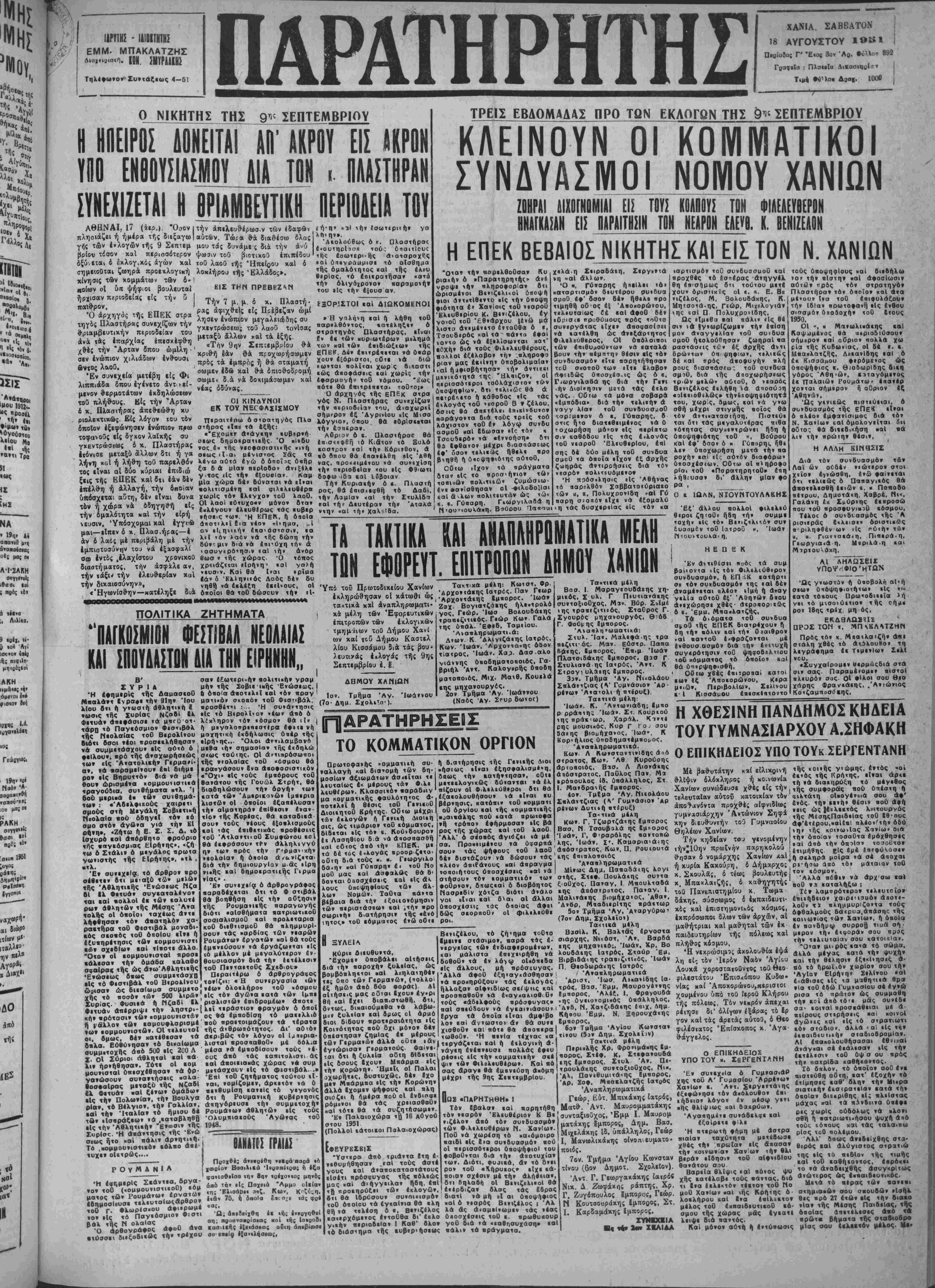 Έν Χανίοις ΐΜ 16 Αίγοόα·ου 1951