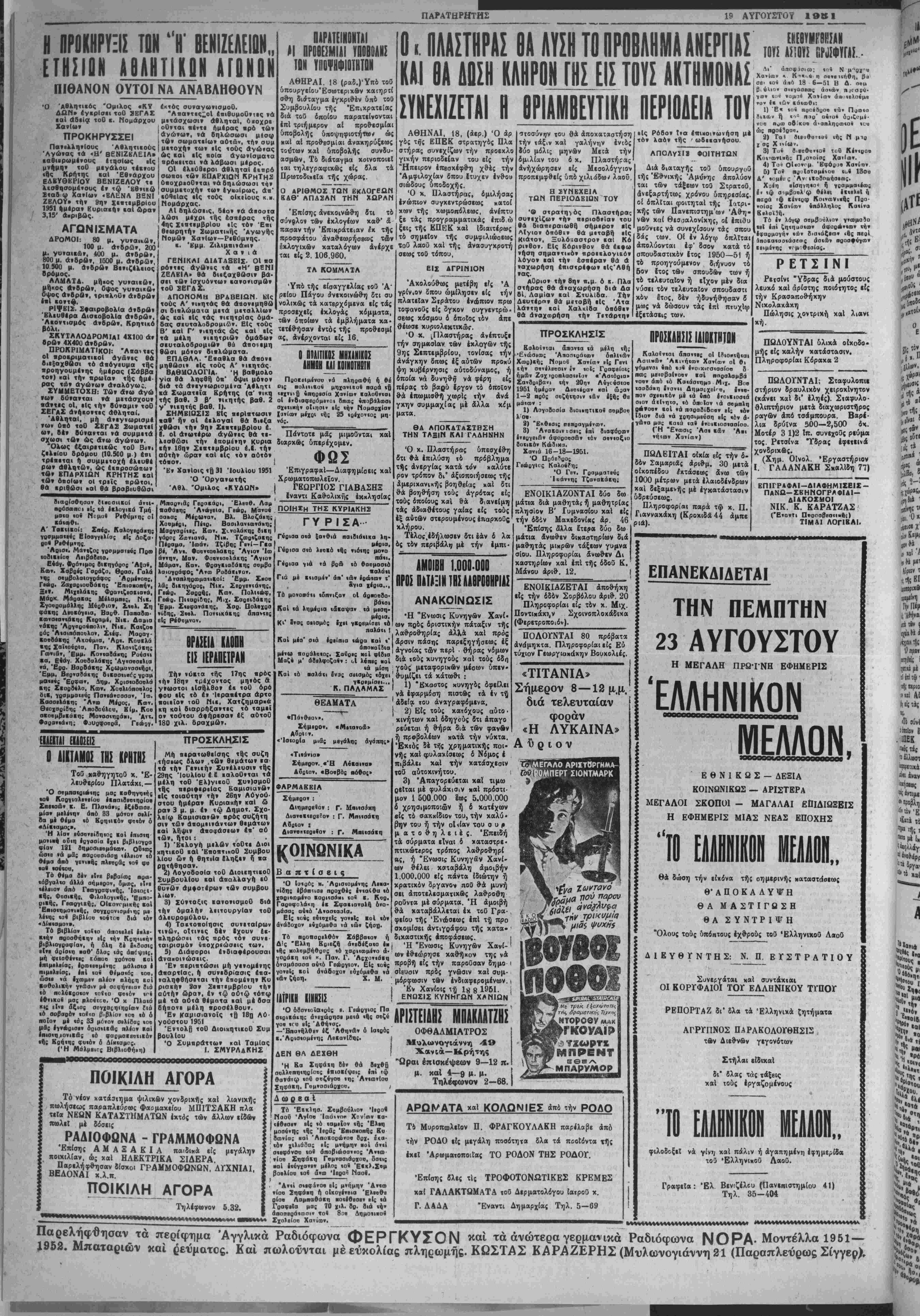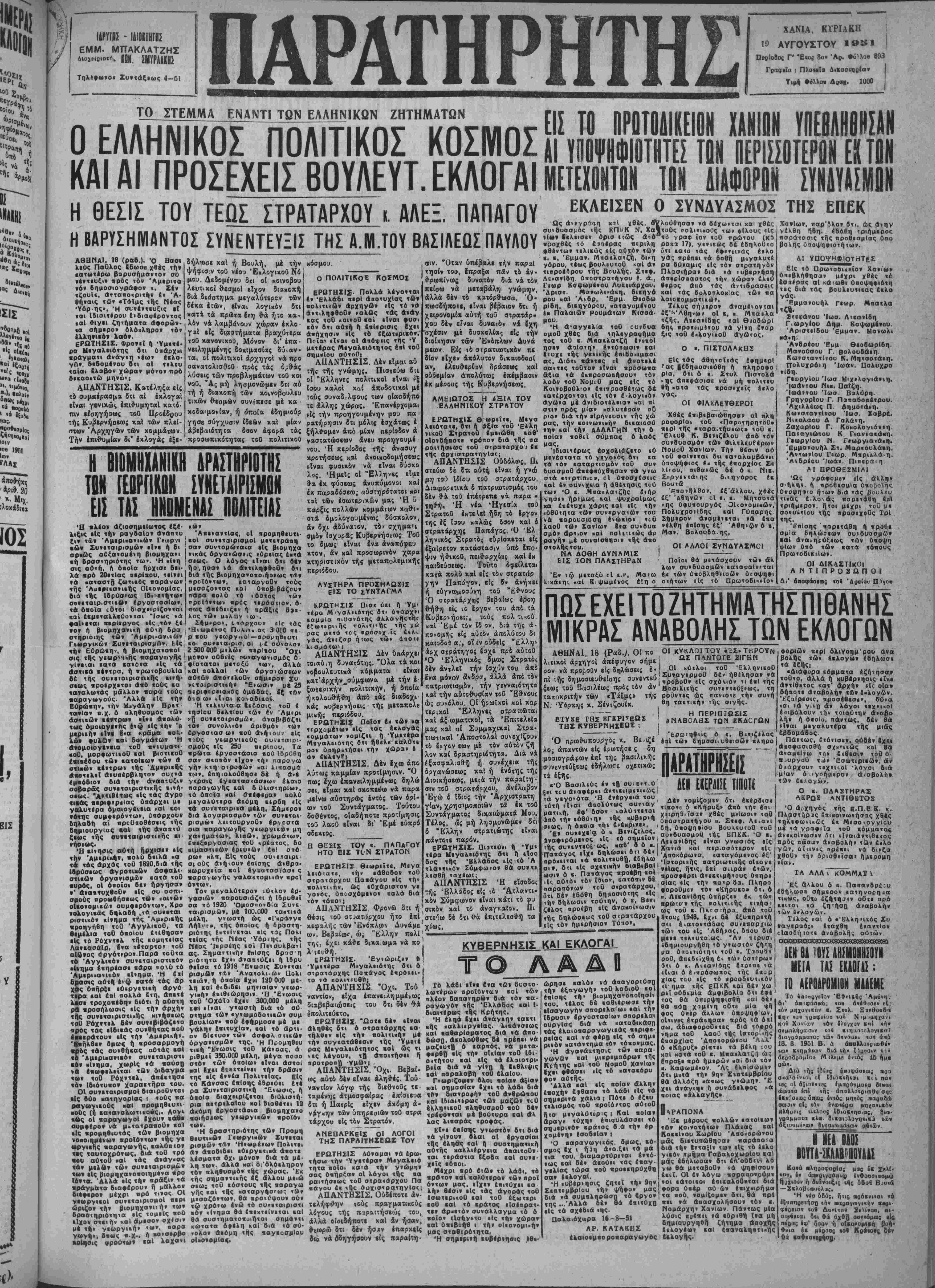 Δΐαχ(ιΒ.ο<ή. ην 2ΗΥΡΑΑΚΗ- Τηλβθωνον Συντάξεως 4—51 ΠΑΡΑΤΗΡ ΤΟ ΣΤΕΜΜΑ ΕΝΑΝΤΙ ΤΩΝ ΕΛΛΗΝΙΚΟΝ ΖΗΤΗΜΑΤΩΝ Ο ΕΛΛΗΝΙΚΟΣ ΠΟΛΙΤΙΚΟΣ ΚΟΣΜΟΣ ΚΑΙ ΑΙ ΠΡΟΣΕΧΕΙΣ ΒΟΥΛΕΥΤ. ΕΚΛΟΓΑΙ Η ΘΕΣΙΣ ΤΟΥ ΤΕΟΣ ΣΤΡΑΤΑΡΧΟΥ ι ΑΛΕΞ. ΠΑΠΑΓΟΥ Η ΗΡΙΣΗΜΑΝΤΟΣ ΣΪΝΕΝΤΕΥΕΙΙ ΤΗΣ Α.Μ.ΤΟΥ ΒΑΣΙΛΕΩΣ ΠΑΪΛΟΪ ΧΑΝΙΑ. ΚΓΡΙΑΚΗ 19 ΑΥΓΟΥΣΤΟΥ ΙβΚΙ Πβρίοοος Γ' Έιθί 3ον Α0. Φΰηοβ 893 ΓοαφιΙα : ΠλαΐεΙα Λικασκ)οία>ν