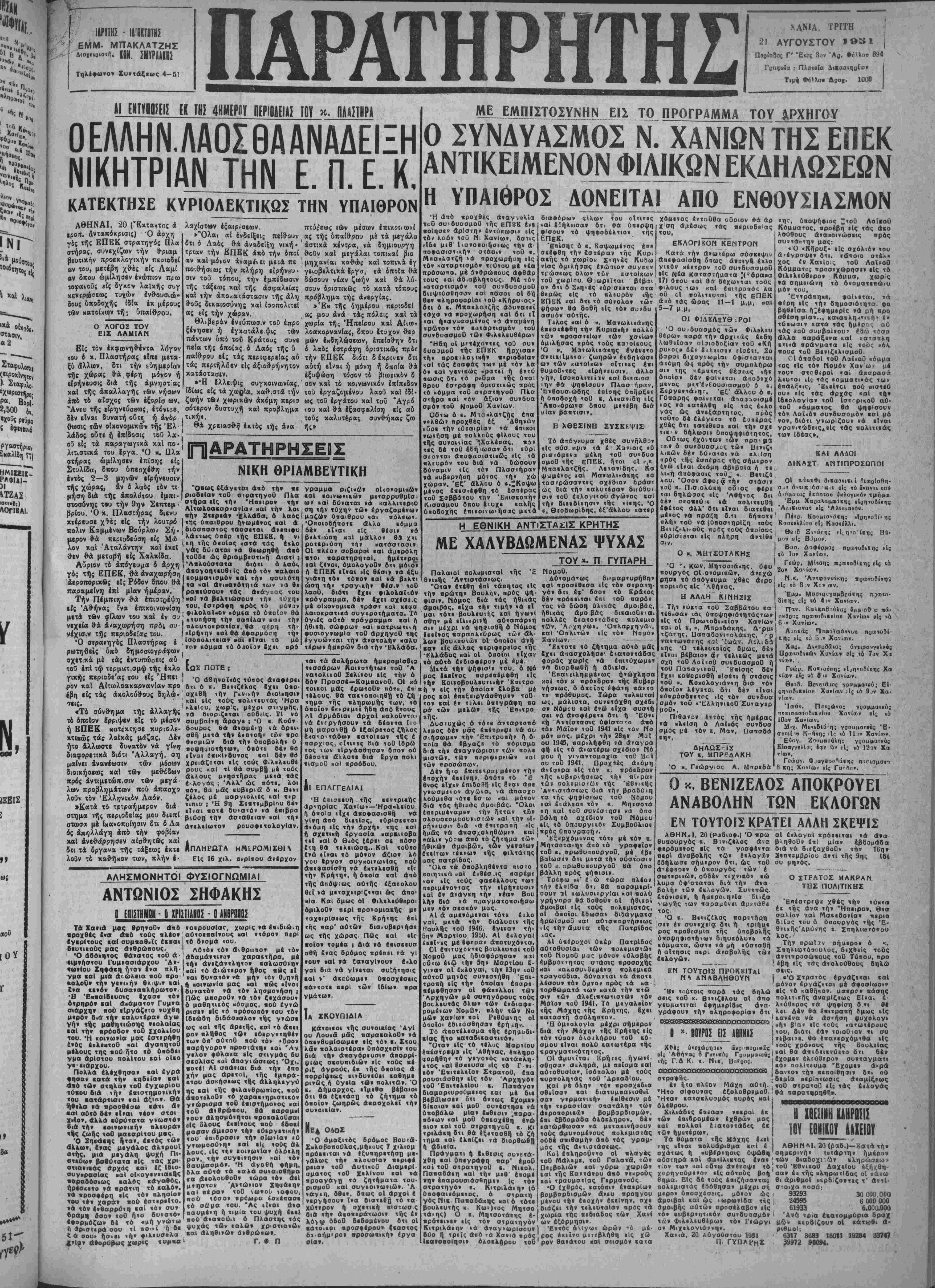 νεχεία θ>ά ά/αχωρήση πρό; συ·| νλουτοερατΐαν, Θά <*ίρη νέχιοιν τη"; περιοδείαν τού. (ειρήνην «αί Θά εφαρμόση Ό στρατηγδς Πλαστήρας ί ,Ιοοηολ.τ.ΐαν .αι .Ιναι τό _ Λ «". * ' , νόν κόμμα τό ότουν 6χ·ι ρωιηθβίς δπδ δημοσΐογραφων ΗΗ _■________ αχετ.χά μέ τάς ίντυπώσει; αϋ | τοθ επί τώ τερματ.σμώ ττ)ς έκλο [ΩΣ ΠΟΤΕ ; γικ<)ς περιοδε'α; τού είς Ήπει | ·0 αΘη,ο,«ός «ύ.ος άναφΐρει ρον χαί Αίτωλοαχαρνανΐαν προ δτι ό «. Βενιζελος ϊχει υπο- «8η είς τάς άκολού&ους δηλώ· σχεθή τή» Γ»ν.»ή» Λιοΐ.ησιν καί «Ις τοΰς πολιτιυτάς Ήρα κλιΐου, χωρ ς, μκχρι στιγμής. νά διοριζεται οϋββίς. ΤΙ νά συμβη!»η αραγε ; Ό κ Κου* δουρος θά άναμέ<ο νά όρκι* σθή μετά την έκπνοή» τΛν προ Οβσμιών διά «ήν υποβολήν Ο οοψη+ιοτήτων, όπότ· δέν θό ιΐναΐ έπικΙ»δυνος «αί δέ* θό χρβιάζεται ιίς τούς Φ.λελευθΐ ρουι. καί τί θά συμβ& μέ τούς βλλους μνηστήρας μετά τάς έ-λογάς ; 'Λλλ' ώς τιότε, λοι ■όν, θά μάς κυβιρια ό μ. Βενι ζέλος μέ μαρνιολιες «αί τ·ρ τιπια ; Έ 9η Σίπτΐμβρΐηυ δέν γραμμα ριζι«ώ? οΙ<ο*ομΐΜώ» «αί «οινω>ιε>ϋν μεταρρυθμΐσι