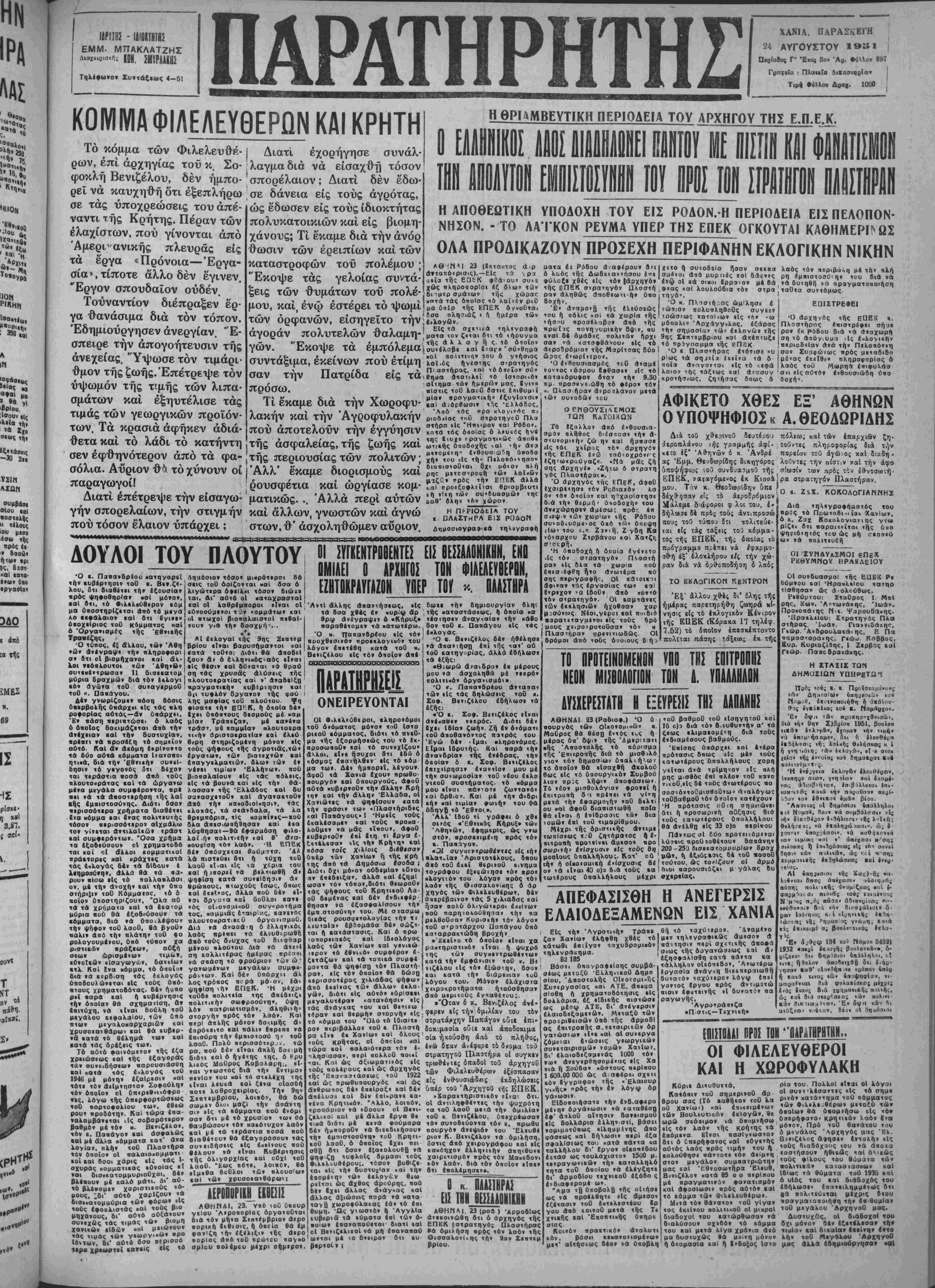 Δΐαΐ·ιοιο<ή: 101. 2ΜΥΡΑΑΚΗ- Τηλέφωνον Συντάξεως 4-51 ΠΑΡΑΤΗΡ ΧΑΝΙΑ, ΠΑΡΑΣΚΕΓΗ 24 ΑΥΓΟΥΣΤΟΥ 1»_1 Πβρίοδο; Γ' Έιος 3ον 'Λο. ·ΰ>λοβ 697