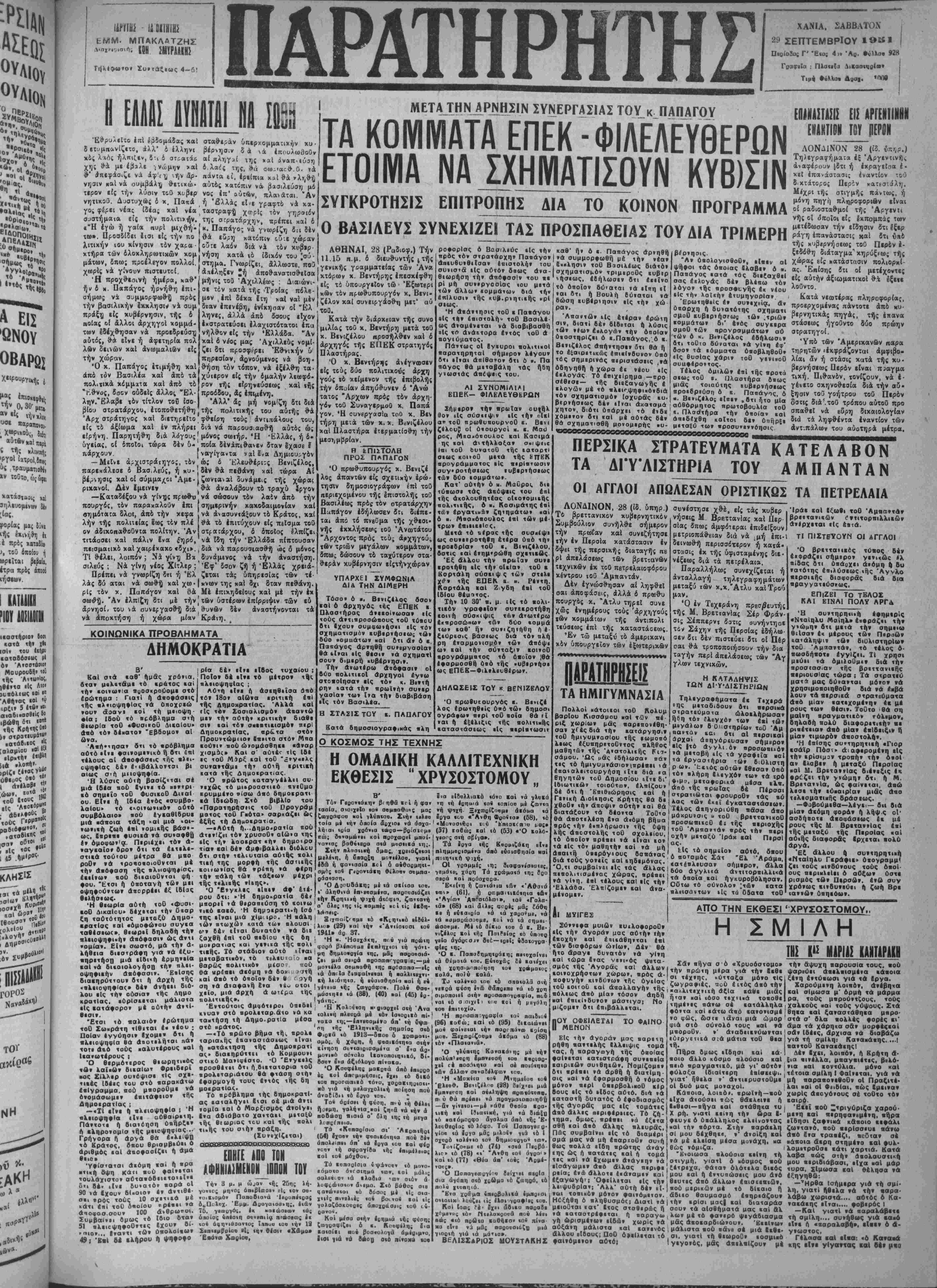 δ λα<ίς της, »ά οω,»αεθ.Ο. τα πάντα. £ί, ίρ,ίπ,β κ»ι »α ,λ,Αη αύτ&ς κατόπιν νά βασ.λεύση μό νος ΐπ' αύτΛν, πλανάται *Αν χ . Π ή Ελλάς εί.ε γραφτδ νά κα· γο; φέριι νέα; ίδέα; χαί νέα | χαοτραφή χαιρΐς ι4ν γηροιόν σοσχήματα είς την πολιτιχήν. της στρατάρχην, πρέπει κα2 δ α*Η έγώ ί) γαία πυρΐ μιχθή- κ. Παπάγο; νά γνωρίζη β:ΐ δέν τω». Προσίίδει ίισι είς την τιο θά εδΐη κατόπιν ιδ:ε χώραν λιτικήν ιου κίνησιν τόνχαρα- οδτε λαόν διά ν* τδν κυβιρ- χτήρα των έλοκληρωτικών κομ νήση χαχά »δ £διχόν τού 'σύ· ματων, 8ηω; προέλεγον πολλοί. σχημα. Γνωρίζει. άλλωστβ "ποϋ χιβρΐς νά γίνουν πιστευτοί. απέληξεν ^ή απο&ανατισθεΐσα Ή προχθεσινή ήμέρα, καθ* ήν δ ν. Πβπάγος ηρνήθη Ιπι- σήμως να συμμορφωθή" πρός την βασιλικήν έκκλησιν ν» συμ πράξη είς κυβέρνησιν, τής δ ποίας όϊ άλλοι άρχηγοΐ κομμά¬ των Ιδίχθησαν νά προεδρεύση ούτος, θ-α είνε ή άφετηρία πολ λ δ ί αλα ί , ή φ λών δεινών χαί ανωμαλίαν την χώραν. Ο Π εί; χ *Ο χ. Παπαγος έτιμήθη χαί λέ ί ά ά μήνις τοθ Άχιλλέως : Διαιώνι- σε τόν κατά τής <ΤροΙας πίλβ- μβν , επί δίκα ίιη »αΙ ναΐ μέν δταν έπενέβτ], ένίκησαν οί Έ λ ληνες, άλλά άπό δσους είχον έχστρατιύαιι ίλαχιστοτατοι «πά νήλθ&νείς την Έλλάδα. "Αν καί δ νέος μας Άχιλλεδς νομί- ζει δτι προσφρριι Εθνικήν υ πηρεσίαν, άονούμενος νά βοη¬ θήση τόν τόπον, ν* εξέλθη τα· :ρον είς την ομαλήν λειυφό- τή; είρηνεύσεως καί τής προόίου, άς επιμένη. 'Αλλ' &ς μή νομίζη δτι διά τής πολιτικάς τού αυτής θά . „ στράτηγός *αί διεττ/ρεΙ:ο|φθε(ρη τούς άντιπάλους τού, είς 'το άξίωμα καί έν πλήρει διά νά παρουσιασθή αύτος ώ; ειρήνη. Παρητήθη διά λόγους| μόνος σωιήρ. *Η Ελλάς, ή δ- ΰγείας. οί ίποΐοι τώρα δέν 6< ποία δενχπεθανεν δταν ξχασε Ι πάρχουν |ναν·ίγα«τα >αί Ι*α Δημιου^γδν