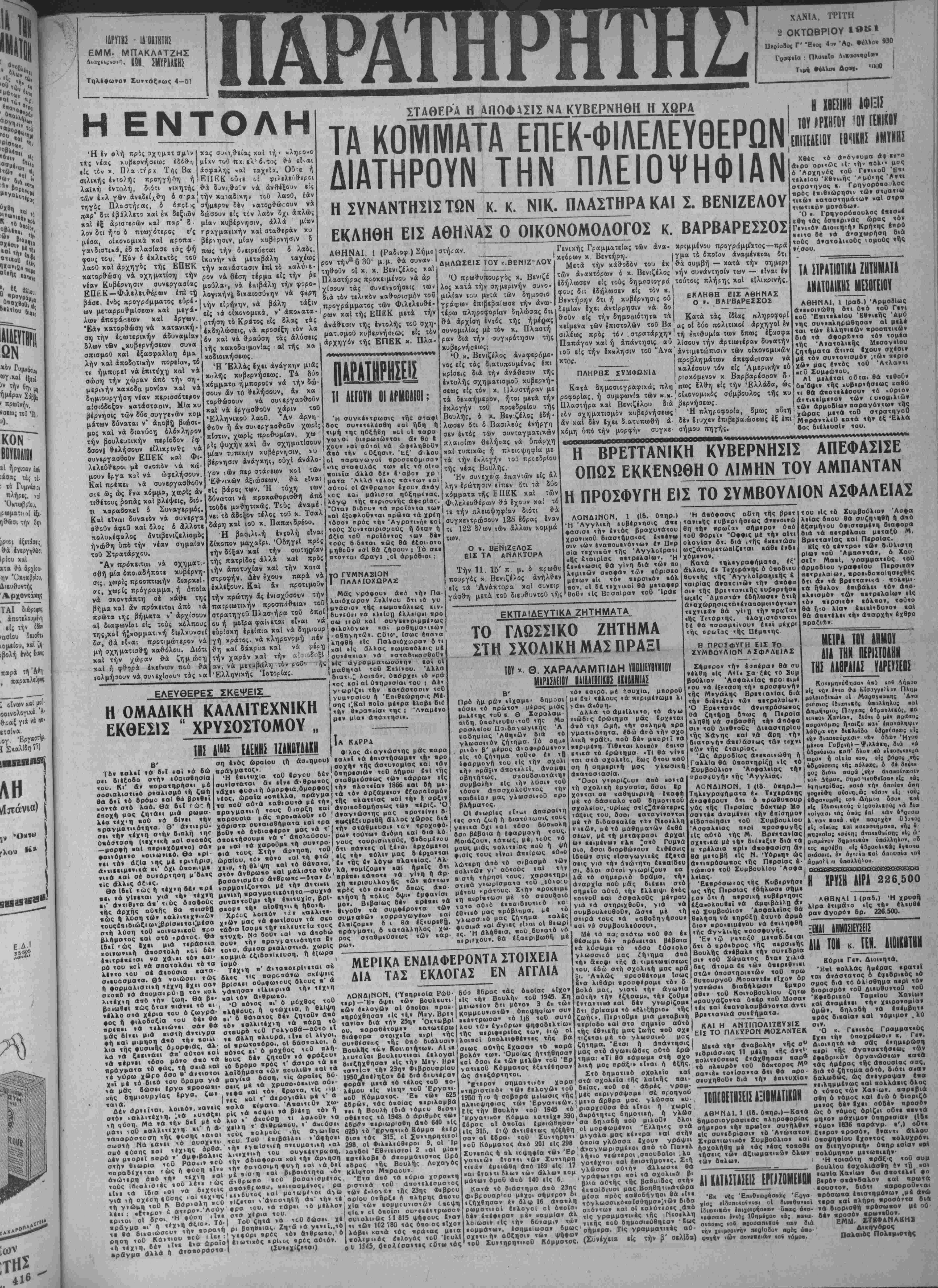 Καθ(σια«αι γ*<ΐα«ό* διι αί «ηό ιο« θβτφιΐεοΐαιοΐ) 'Επιοκάποο Κ« 8ω»ϊας «αί Άηο«οοω»οο αον«ηοο«ί μβ»αι Μυΐ«βοΙ»α1 Σχολαί άςχίζοβν (άς εγγααφάς άηό 1-10—51 είς ιά 5αν «αί 8-ΐν Δημοιιΐα Σχαλβ!α. Τακιιΐά μαθήμαια αοχανιαΐ ιΐη6 16—10-61. ('ϊί «ής Διβαθύνοβαι;) ΙΛΙΗΤΙΚΑ ΕΚΗΑΙ1ΕΥΤΗΡΙΑ ΧΑΝΙΩΝ Είς το Ίδιωτιχόν Γυ μνάσιο ν Χανίων α{ είσαγωγικαί ίξετά- σεις θ·ά διεξ< χττοθν την 6ην μη νός Όχτωβρίου ημέραν Σάββ χον κ αί ώραν 8ην πρωϊνήν (Έκ τής Διευθύνσεως τοΰ Ίδι ωτιχοθ Γυμνασίου). ΒΙΟΑΕΤΑ ΚΑΑΙΟΝΤΖΑΚΗ Χειρουργός Όδοντίατρος, Κυδων'ίας 95 Δέχΐται 9—12.30 π. μ χά 4—6 μ μ "Εναντι Καταστή μα τος Ήλεχτριχών είδών Άποστο λ(δη. ΠΩΛΕΙΤΑΙ φεΰρνος έλεύθε ρος μέ οίχ'αν άνωθεν. Πλτ^ο φορίαι Κόρακα 2. ΑΝΑΛΓΣΕΙΣ οΐνων Να1 μού στων. Φαρμαχα οίνολογικά. Ά ποχρωσιικός άνθ-ραξ γιά νά πε· τύχετε άσπρη ρεχσίνα Χημ.—Οίνολογ Έργαστήρ Ι ΓΑΛΑΝΑΚΗ Σκαλίδη 77) Ίθ ΤίΜΕΙΟΝΐΕΩΡΠΑΪ ΚΙ^ΟΙΡΟΦΙίΠ^Ι ΑΑΙΟΝ Δι* άποοάσεως τοθ ύβουρ γβΐου Γεωργίας δημοσιευθή! σης «Ις την 'Κβ>ημεριδα τής