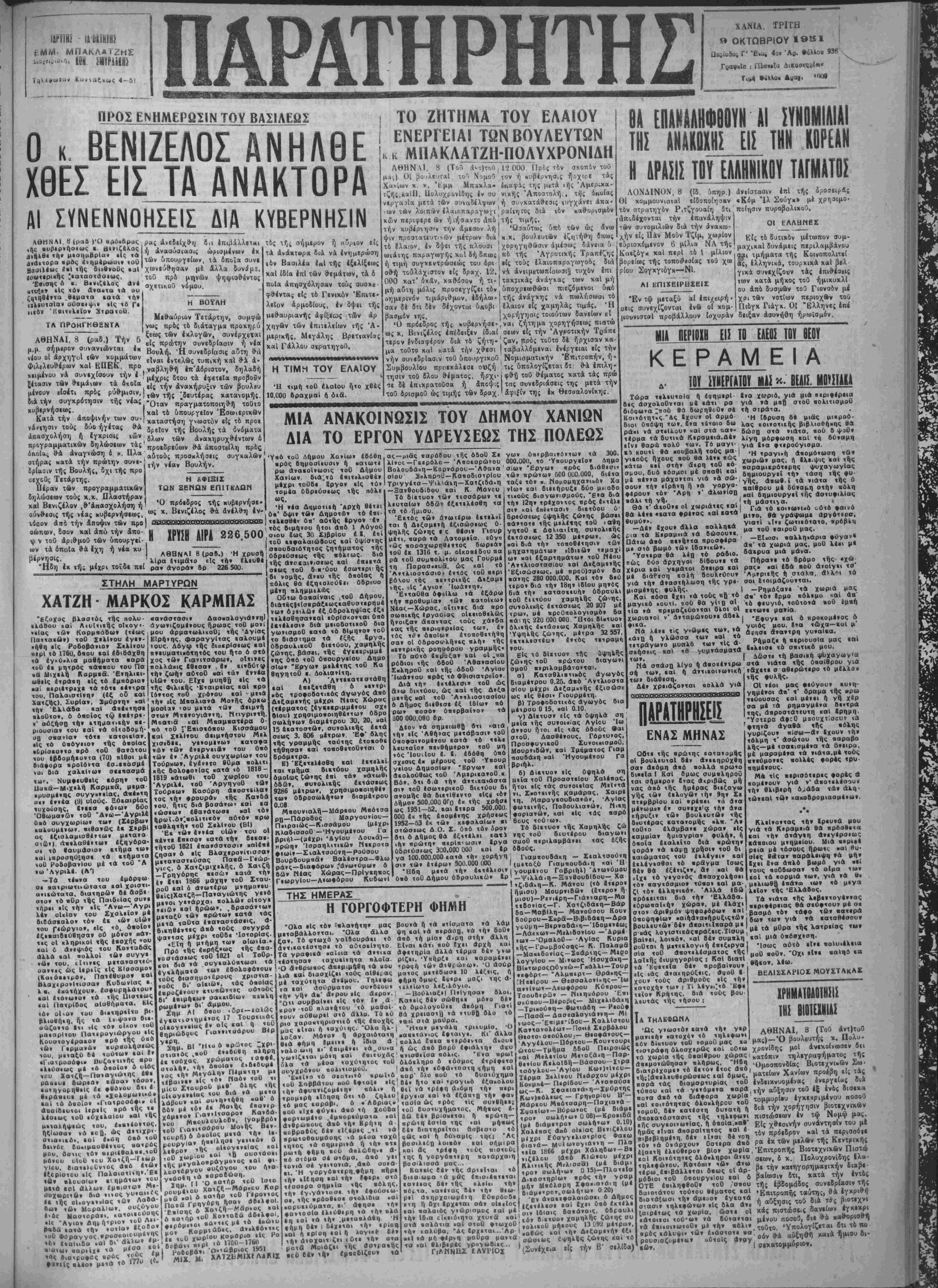 . »ερ1.α#ενερσ<ως 60 όμοι ομόροων καταστημάτων ■[« «ή» Πλατείαν 1878, εκ «οΟ βροΐόν «ος τής πωλήσεως Δημοτικων αΐιοβέδων, «ρός στίγασιν (σα ρΐθμω» «αραγκούχων, μή λα χανοβωλών, βι' οδς βραβύτε ρον βά ληφθή εΐβική μΐριμνα. Εν Χανίοις «4 6Ό«τωβρΙου 1951. Ο Δήμθρχος Χανίων ΝΙΚ. ΣΚΟΥΛΑΣ έν (ή ίφαρμογή αρογράμματός ϊ·1 «ής ανασυγκϋθτήσεως Πόλεως, ήρξατο ήδη άσχο ΠβΛΕΙΤΛΐ είς Καλύβες Ά δέ άποδοτέον είς την τα χτιχήν τής Νομισματιχής Επι τροπής νά προβαίνη είς πβριωρι σμένας χρηματοδοτήσιις πρός αποφυγήν τοΰ χινδυνου τοθ πλη θωρισμοϋ. Αί μεσολαβοθοαι Τρα πεζαι εδήλωσαν δτι δέν Ιχουν ιίντίρρησιν βίς την χρηματοδό τησιν των ελαιουργείον χαί τυ χον υπάρχουσαι αντιροήσεις είς τα ύποχαταοτήματα των Χανί ών θά όφείλονται είς έλλειψιν δδηγιών έκ μέρους των Κενΐρι κων των. Διά την αδξησιν τοΰ ποσοθ ιής χρηματοδοτήσεως εκάστου έλαιοτριβείου καί αναλόγως των αναγχων των, δ χ. Πολυχρονί- δης συνήντησε τόν Διοικητήν τής Τραπέζης τής Ελλάδος χ. ΜαντζαβΙνον χα£ τόν Γενικόν Διευθυντήν ταύιης Ν.Μαυρίχην, οΕ δποΐοι εδήλωσαν δτι άναγνω ρΐζουν τό διχαιολογημένον τοΰ αίτήματοςχαΐ δτι ευθύς ώς χ«τά τα μέσα ιής προοβχοθς ίβδομά δος αφιχθή ή Νομισματιχή Έ πιτροπή έχ Θεσσαλονίκης θά είσαιγάγουν ΐδ ζήτημα είς αυ¬ τήν μόνην άρμοδίαν νά άποφα σίστ) έν ηροχειμένω. Τπό τοθ χ. Πολυχρονίδη ου νιστ&ται ή άνάληψις τοθ έγκε χρΐμένβυ ποσοΰ δρχ. 5.000.000 διΊχαστον ελαιουργείον πρός αντιμετώπισιν των αμεσώτερον ανάγκην.των χ«1 βραδύτερον ΐι τώ τυχδν Ιγχρ συμπληρωμκτιχα δάνειον. ΙΑ "ΟΡΟΚΟΙΑ - ΕΡΓΑ-ΙΑ Το υπουργείον Κοινωνΐχής Προνοίας δι' αποφάσεως ένέχρι νέ την έκδοσιν ένταλμάτων προ πληρωμής έπ' ονόματι των χά ιωθι ύπαλλήλων διά τάς ανά¬ γκας πληρωμής ίδοιπορικών έξόδων ύπαλλήλων χαί υπολό γων μεταχινουμένων δι' υπηρε¬ σίαν, σχετιζομένην μέ την ε¬ φαρμογήν τοθ προγράμματος Πρόνοια—ΈργασΙα. Ο ΑΙΟΡΙ.Μ01 ΤΟΥ ». ΟΡ|ΠίΙΛΙΙΙΙυΑΙ(ΙΙ •Ο Γενικάς Διοΐϊητής Κρήτης ε. Σ«υλ. Κούνδουρος ύβεγραι ψε τ6 παρελθόν Σάββατον Λ·ό Φασιν, διά «ής όαοίας διορΐζ· «αι Διευθυντής «οΟ Έ*<δριχο0 ΤαμιΙου Χανίων δ κ. θραούβαυ λος Σ·αν«ιδά«ης. ΒΕίΤΙΟΙΙΙ ΤΗ. ΟΑΟΥ ΗΥΡΟΝΙΤΒΥ - ΟΑΑΑΙΟΙΒΡΙΙ Δι*αποφάσεως τοΰ ΰπουργείώυ Δημοσίιον "Εργων ώρίσθησκν μέλη τής έπιτροηής διεξαγωγής τής δημοπρασίας έΝΤΐλέσεως των εργασιών βελτΐώσεως των συνθηχών χυχλοφορίας τής 6π' άριθμ. 170 έθνΐχής δδοΰ Κρή της, από τού χωρΐοα Ταυρωνίτη (χλμ. 19,100 δδοΰ Χανίων—Κα στελλίου Κισσαμου. μέχρι Πα¬ λαιοχώρας Σελίνου, ήτοι μή χους 56,5 χιλιομέτρων οί χ, χ. Διευθυντής Νομαρχίας Χανίων ώς πρδιδρος, Περιφερειαχός μη χανιχός Μ. Πιερομπόνν,ς χ» μηχανικάς τού Δήμου Χανίων. 'Η 'δημοπρασία γεννήσεται την προοίχ^ Πέμπτην. Γεωρ. Πετουσάχη τέως Β τοθ Κέντρσυ γραμμα' Κοινωνι ΕΠΑΜΗΛΘΕΝ Ο κ. ΝΟΜΑΡΧΗΙ κης Προνοίας Ρεθύμνης 1 έκ. δραχ. Γεωρ. .._. Κοινωνΐχής επί σης 1 έχ. ρη τοΰ Κίντρου Προνοίας Χανίων δραχ. Η ΕΓΜΔΗΜΑΤΙΙ0ΤΗ2 Ώς προχυπτει έχ τής ιίσης πορά τής Διοικήσεως Χωροφυλαχής Χανίων εκθέσε¬ ως άδιχημάχων χαί συμβάντων κατά την διάρκειαν τοθ Β' 15 θημέρου τοθ μηνός Σεπτεμβρί- ου έ.Ε. έλαβον χώραν έν τή πό ριφεριΐα τοθ νομοθ μας τα κάτω θι άδικήματα καί συμβάντα, Προχθές Κυριακήν θεν ενταύθα έξ Αφήνων δ Νο- μάρχης Χανίων κ. Καχούρης. ΜΜΜ ΔΙΚ«~ Ενώπιον τοθ Καχουργιοδινβί ου τής πόλεώς μας βΗδιχάζβται την προσέχη Παρασκευήν 12ην Έξυβρίσεις δημοσΐων υπηρ«< ^ των 1, ίδικοι έπιθ·έσεις 1, 6νο·!^,τ πλοι απειλαί 1, ζωοχλοπαι 3, ύηεξαιρέσεις 1, παρανομοι δπλο φορίαι 5, παβάνομοι δηλοχατο Καλημερακη, ..