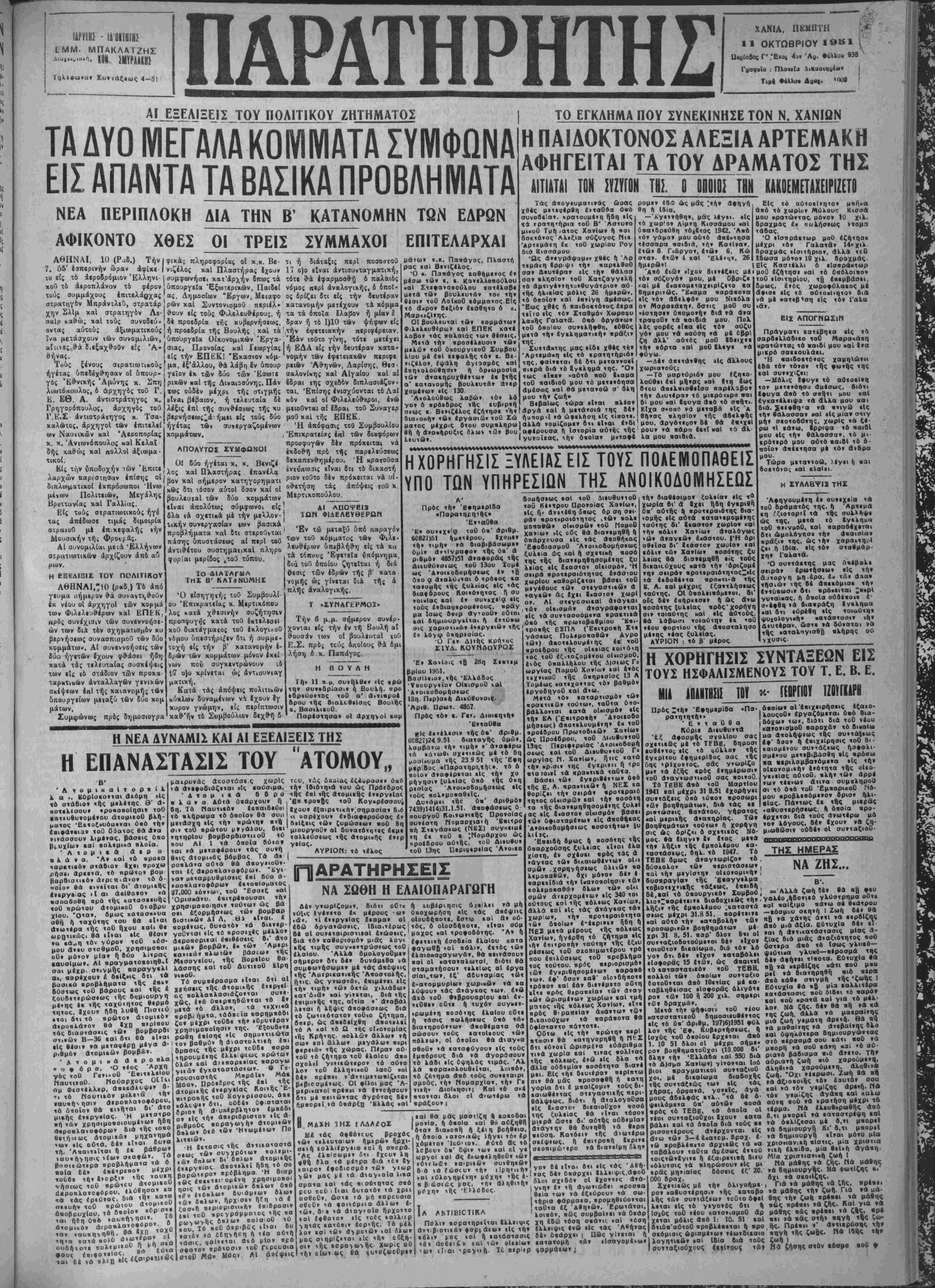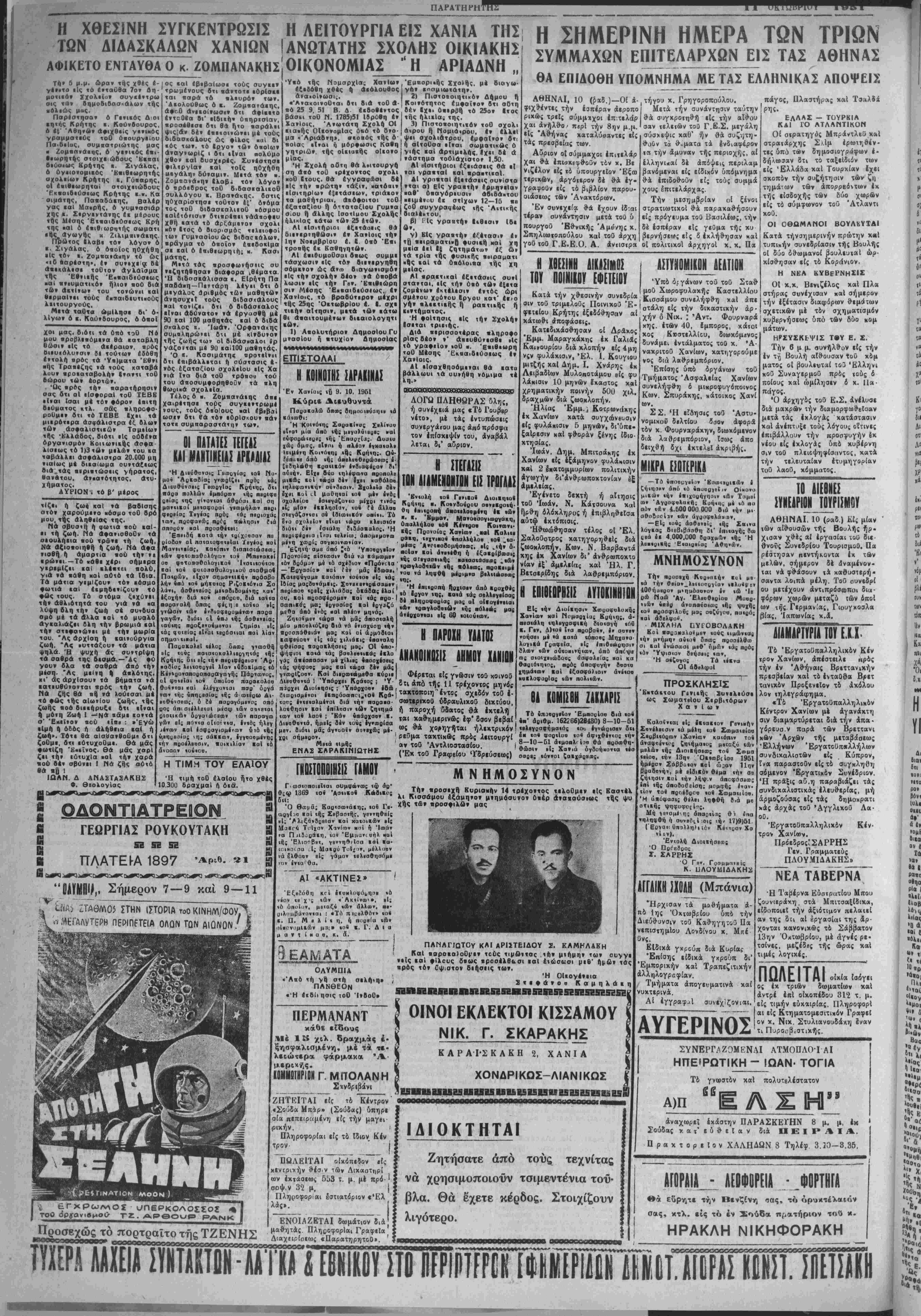'νηλητΐθη ή οονβ». ί οις <ή» 17)9)51 ('Εοναιι ΰηαλλη'ι ;ών Κέ»«ςον Χά νΐιν), Έκολή Δια»*ήαβαο5 Ό Ποι'εϋοθΕ Σ. ΣΑΡΡΗΣ Ό Γβ·. Γοομμΐ'ΒΪς Κ. υΛΟΥΜΙΔΑΚΗΣ ΑΓΓΛΙΚΗ 5Χ0ΑΗ (Μπάνια) "Ήρχισαν τά μαθήματα ά- πό 1ης Όχτωβρίου υπό την Διεύθυνσιν τοΰ Καθηγητού Πά νεπιστημΐου Λονδίνου χ. Μπέ ϋνς. £1διχά γχρούπ διά Κυρίας Έπίσης είδικά γκροϋπ δι' Εμπορικήν χαί Τραπεζιτικήν άλληλογρβφίαν. Τμήματα άπογευματινά χαί νυχτερινά. Αί εγγραφαί αυνεχΐζονιαι. ΚΑΡΑΙ'ΣΚΑΚΗ ΧΑΝΙΑ ΤΩ ΛΙΕ8ΝΕ. ΣΥΚΕΑΡΙΟΜ ΤΟΥΡΙ.ΜΟΥ ΑΘΗΝΑΙ, 10 (ραδ.) Εί, μίαν των αί&ουσών τής Βουλής ήρ. χιοαν χθές αί εργασίαι τού διε- θνοϋς Συνεδρίου ΤουρισμοΟ. Πά ρέστησαν πεντήκοντα εκ των μελών, σήμερον δέ αναμένον¬ ται νά φθασουν τί καθυστερή· σαντα λοιπά μέλη. Τοθ συνεδρί ου μετέχουν άντιπρόσωποι δια¬ φόρων χωρών μεταζύ των ίποί ών της Γερμανίας, Γιουγκοσλα βίας, Ίαπωνίας κ.α. Κέν¬ ΑΥΓΕΡΙΝΟΣ ΛΙΑΜΑΡΙΥΡΙΛ ΤΟΥ ΕΙ Χ Τό Έργατοϋπαλληλιχόν Κέν τρον Χανίων, απέστειλε πρός την έν Αθήναις Βρετταν»χήν πρεσβείαν χαΐ τό ένταθθα Β^ετ τανιχόν Προξενείον τό έχόλου λον ΐηλεγράφημα. «Τό ΈργατοϋπαλληλΐΝΟν Κέντρον Χανίων μέ άγανάχτη σιν διαμαρτύρεται διά την άπα· "(όρΕυα.'* παρά των Βρεττανι κων Άρχών τής μεταβάσεω; 'Ελλήνων Έργατοϋπκλλήλων συνδικαλΐστών είς Κύπρον, ίνα παραστοθν είς τό συγκληθτ^ σόμενον Εργατικόν Συνέδριον. Ή πράξις αϋ.η παραβιάζει τάς συνδιχαλιστικάς ελευθερίας, μή άρμοζούσας είς τάς δημοχρατι «•άς αρχάς τοθ 'ΑγγλιχοΟ Λα· ου. Έργατοϋπαλληλιχόν τρον Χανίων. ΠρόεδροςίΣΑΡΡΗΣ Γεν. Γραμματεύς ΠΛΟΥΜΙΔΑΚΗΣ» Ή Ταβέρνα Εύστρατίου Μπου ζουνιεράχη, στά Μπιτσαζίδιχβι, ειδοποιεί την αξιότιμον πελατεί¬ αν της δ:ι αί εργασίαι της ίρ- χονται κανονικώς τό Σάββατον 13ην 'θΜτωβρίου, μέ ά?νές ρε· τσίνες, μεζέδΐς τής ώρας καί τιμές λογιχές. ΠΩΛΕΙΤΑΙ οϊχίγ ος έχ τριών δωματίων καί άντρέ επί οίχοπέδου 312 τ. μ. είς τιμήν εύκαιρίας. Πληροφορί αι είς Κτηματομεσιτΐπόν Γραφεί όν χ. Νικ. Στυλιανουδάκη Ιναν τι Πυροσβ0στιχΐ)ς. ίΗΤΚΐΤΑΙ ιίς τό Κέντρον Σούδα Μπάρ» (Σούδας) ΰπηρΐ ία »τεπειρ«μίνη είς την μαγβι ικήν. Πληροφορίαι είς τό ίδιον Κέν ρον- ΠΩΛ ΕΙΤΑ Ι "οίκόπεδοΤ" «ίς εντρικήν θέσιν των Λικασττιρϊ ών εκτάσεως 553 τ. μ. με πρό· οψ.ν 32 μ. Πληροφορίαι Εστιατόριον «'Ελ ΧΟΝΔΡΙΚΟΣ-ΛΙΑΝΙΚΩΣ Ι ΙΕ5ΙΙ1Ε1Ι15ΞΗ1Ε1ΑΕ5 II 1£ «515|51ΙΗ528Ε515«5Β8ί ΠροαΕχώς τό πορτραΙτοτήςΤΖΕΝΗΣ | ΕΝΟΙΑΖΒΤΑΙ δωμάτιον διά| μαθητάς Πληροφορίαι ΓραφεΙα Διαχειρίσεως «ΠαρατηρητοΟ». ' ΙΔΙΟΚΤΗΤΑΙ Ζητήσατε άπό τούς τεχνίτας νά χρησιμοποιών τσιμεντένια τοΰ- βλα. Θά εχετε κέρδος. Στοιχίζουν λιγότερο. ΣΥΝΕΡΓΛΖ9ΜΕΝΛΙ ΑΤΜΟΠΛΟΙ Αί ΗΠΕ'ΡΩΤΙΚΗ - ΙΩΑΝ· ΤΟΠΑ πολυτβλέστατον αναχωρεί εκάστην ΠΑΡΑΣΚΕΥΗΝ 8 μ. μ. έκ Σούδας χατ' ευθείαν διά ΠΕΙΡΑΙΑ. Πρακτορείον ΧΑΛΗΔΩΝ 8 Τηλέφ 3.20-8.35, ΜΙΡΛΙι_ι ΑΕΟΦΟΡΕΙΑ -..ΦΟΡΤΗΙΑ Θά Εΰρητε την Βενζίνη σας, τό όρυχτέλαιόν σας, κτλ. είς τό έν Σούδα π^ατήριον τού κ. ΗΡΑΚΛΗ ΝΙΚΗΦΟΡΑΚΗ _ ι ΤΥΙΕΡΑ ΛΑΙΕΙΑ ΣΥΝΤΑΚΤΟΚ - ΛΑΊΚ* ί Ε Β ΗΙΚ Ο Υ ΣΤΙΐΙΡΪΙΜΜβΐΐΤ.ΑΙίΡΑΣ ΜΙ ΙΙΠΙίΙΙ