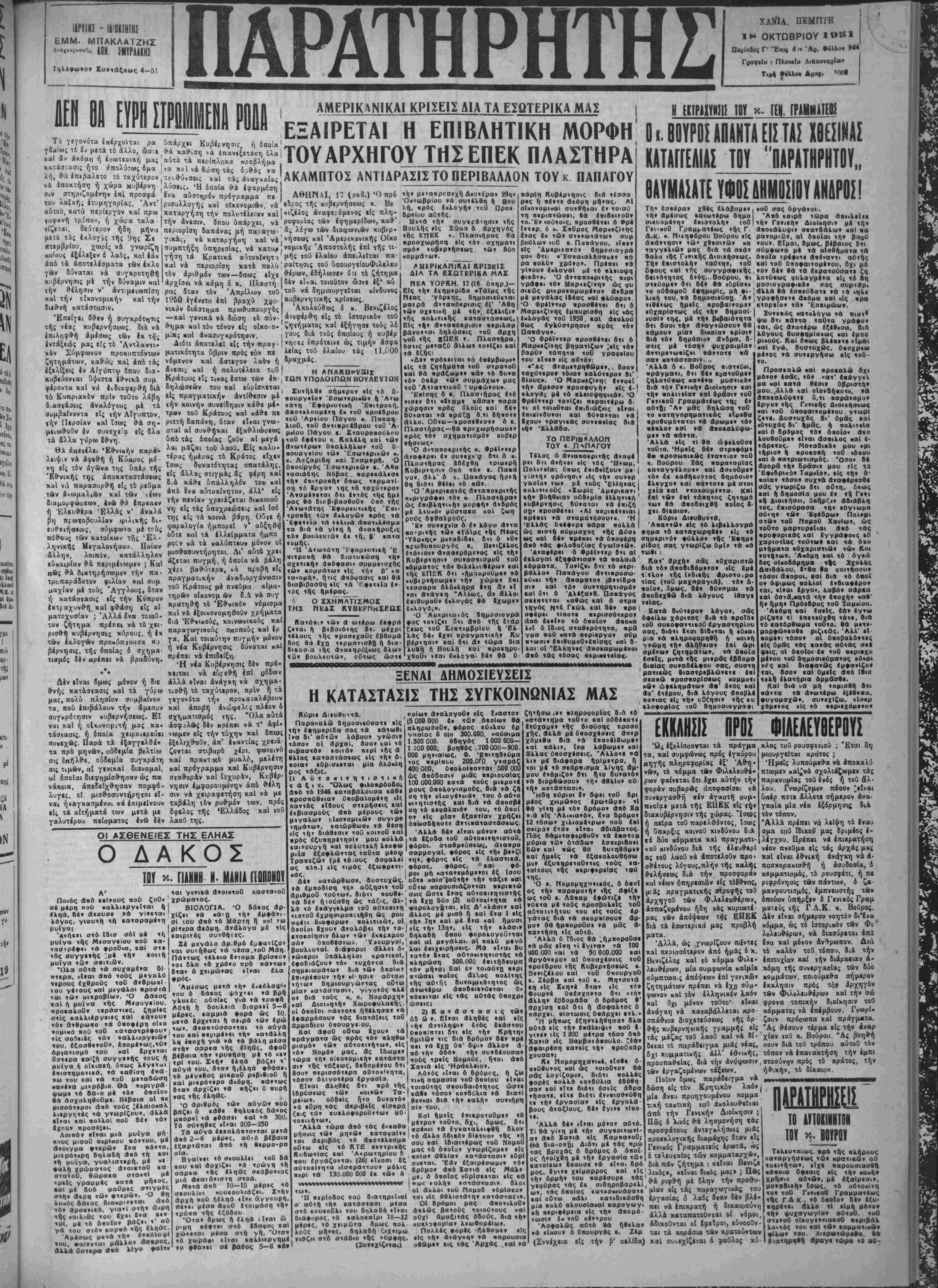 χίζει νά κά<ο τή· εμ«ά»ι σί τού άνό τό Μάρτη ή «αί τω ρΐτερα άκόμη, άνάλογα μέ τίς καιριιές συτθήκς. Σέ μεγάλο άρ.θμό έμ·α»ίζο» ται συιήθως τα 'ΐέσα,τοθ Μάη Πάντως τελεία Εντομα βρΐσκον ται δλο τό χρόνο πρό πάντων δτα» 6 χιιμώνας «1·αι έλα «ρός. Άμέσως μ«τά τήν έ.ΐόλαψΙ» τού ό δάκος ψάχι«ι νά βρή γλοιές οΰσΐις Υιά νά τοα«ή Αυτή ή δουλιιά διαρ««ί 5—6 μέρες. καμμιά «ορά ώς 10, μετά Ερχεται ή σειρά των Ιρώ των, άναντύσσονται τα αθγά τού καί νιοφένιι τήν «ατάλλη τή* επιτροιΐήν δνως οη τό Ιργον της τό ταχύτερον Λναμένεται βτι έντός τής ήμε ρας θά βιοβιβασθοθν ΰνό τής Ανωτάτης '1£«ορ«υτι«ής Επι- τροπής των βκλο,γων νρός τα τα διά νά γίνη ή άναιήρυξις των βουλιυτών έκ τή. Β' κατα νομής. Ή Ά«ωτάτη Τ«οριυτιε.ή Έ νιτροπή θά διατυπώση την σχετικήν άπό«ασι» συμμετοχής των κομμάτων ·1ς την τανομήν, ήτις απόφασις καί θά διαβιβασθή «Ις τα Ή««τ·ΐα έν τος τής ημέρας.__ Ο ΣΧΗΜΛΤΙΣΜθε ΤΗ2 ΝΕΔΣ ΚΥΒΕΡΝΗΣΕΩΣ Κατόηι» των ά ωτερω ε«θρα εται ή βιβαιόιης Οτ. μεχρι τΑλους τής «ροσεχαθς έθοομά 6ος θά ϊχπ τερματισθή ή 6ια- Οκασ.α τής άναεηρύ£«ως δλω» των βουλιυτων, ούτως ώστε Είς την έςτημερίβα «Τάϊμς τής ΝΙας 'γόριης, δημοσιιύεται μαιρά άντανόιρισις έί' Άθη «α» σχετική μέ την, εξέλιξιν ή λή νάρΕη Κυβέρνησις διά τίσσα ρες ή νέντε άκόμη μήνας. ΑΙ οΐΝθνομκαί συνθήκαι έν τοιαύ τη περιπτώσει, θα Ενιδειτοθν το.Έν «ούτοις, «ροσθετει ό Φρί Ιντερ, ό ». Σ«0ρος Μαριεζίιης 6»ας ε« των στενωτάτων συμ βούλων ΐοθ κ. Πανάγου, ε!·«ν είς Αμερικανόν δημοσιογρά φόν δτΐ: «Έσαα<αλήσαυετ νά ρα νολύν χρόνον. ΠρΙνει νά γίνουν εκλογαί μέ τό «λειοψη οιεότ». Ό άντανοκριτής π8ρι γράοει τόν ΜαρκιζΙνην ώς φυ σικώς μικροΐαμωμενο» άνδρα μέ μεγάλας Ιδίας «αι «λύαρον. •Ο ΦρεΙντερ ·ροσθ«τει 6τι δ ΜαρκεζΙνης έμαυρΐσθη είς «άς ύ 1950 ί ά τής νολιτιιής καταστάσιως. ι εκλογάς τού 1950 καί άκολοΰ Είς τήν άντανόκρισιν πιριλαμ βάνονται δηλώσεις τοθ άρχη γοθ τής ΙΠΕΚ ν. Πλαστήρα, όστις μεταξό άλλω* τονΐζει καί τα εξής: «Δέν νρόιιιται νά ένέμβωμε» είς τα ζητήματα τοθ στρατοθ ναΐ θά πράξωμεν νβν τό βυνα τόν υπέρ των συμμάχων μας τοθ Άτΐιαντικοθ ' υμ«ώνου». ΈπΙσης δ κ, Πλαστήρας £τ6 νισ«ν δτι «Ιιαμι πάσα» πσρα χώρησι» πρός όλους «αι βέν δύναται *ά πρόξα δ,τι βήποτι άΊιλο. Ούτω—προσέθισεν ό κ. Πλαστήρας—θά νροχωρήσωμιν πρός τόν σχηματισμόν κυβερ νήσιως» Ο ά>ταηοκριτής κ. Φρέΐντιρ