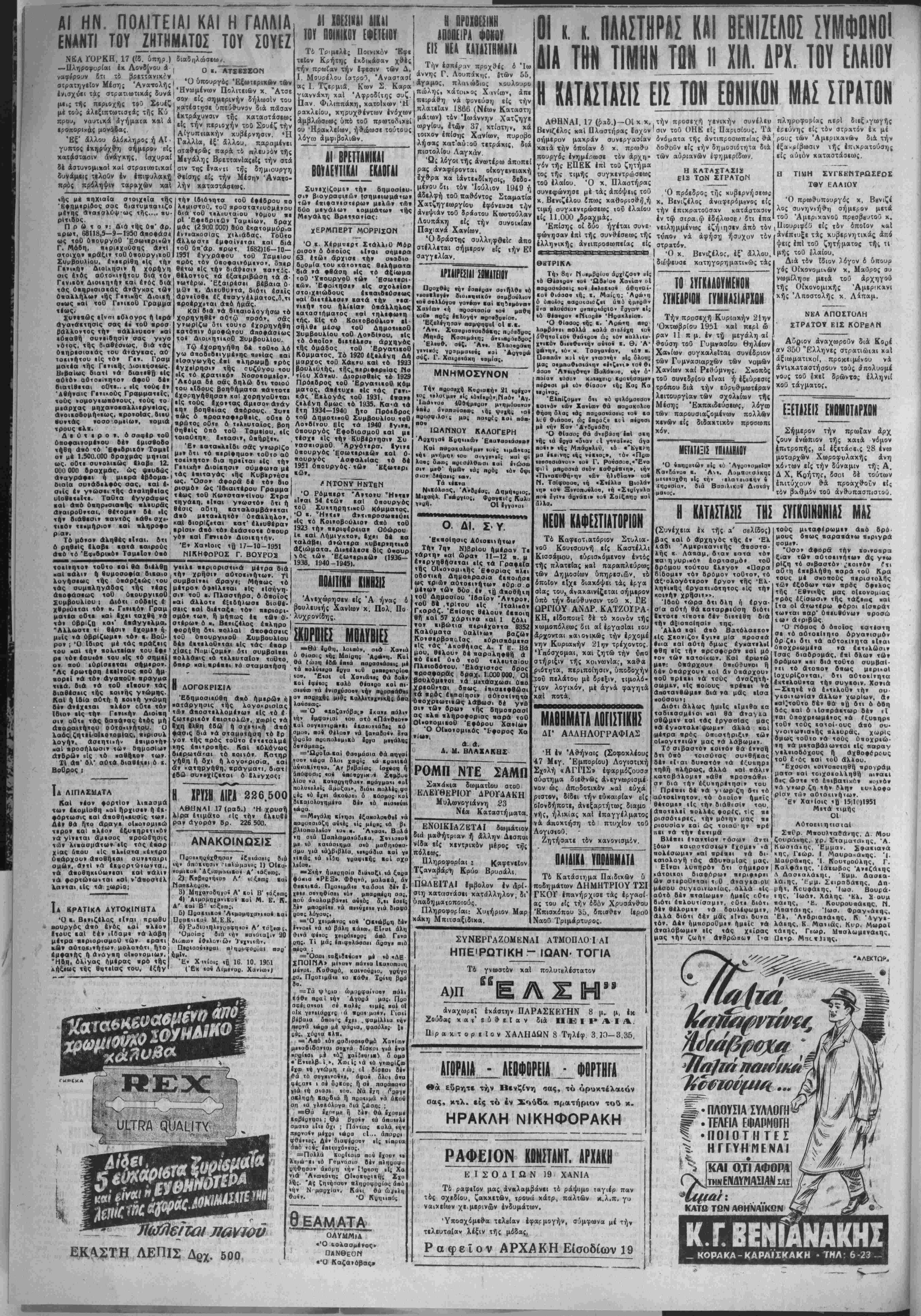 «τι· <α# Ξΐνοηυνλοα, ·ή «Σ«βΙγι·λα (ΐο· ίγΐνι άο«ά(ι» «οί Σαίξαηο «οί & την προσέχη γενικήν σανέλευ σιν τοθ ΟΗΚ είς Παρισίους. Τα δνόματα τής άντιιΐροσωπιίαις θά δοθΌθν είς την δημοσιότητα διά των αυριανήν εφημερίδων. Η ΚΛΤΛΣΤΛΣΙ2 £12 ΤΟΝ ΣΤΡΑΤΟΝ Ό πρ&ίδρος τής κυβερνήσεως χ. Βενιζέλος άναφερίμβνος είς την έπιχρατοθσαν κατάστασιν έν τώ σιρα,ψ εδήλωσε/ δτι Ι πά νειλημμένως εζήτησεν άπό τόν τύπον νά αφήση ήσυχον τόν στρατόν. | Ό χ. Βενιζέλος, έξ' δλλου, διέψευσε κατηγορηματικάς τάς ΝΕΟΝ ^ΕΣΤΙΑΤΟΡΙΟΝ Τ6 Καφΐστιατόριον Στυλια· νοΰ Κουτσουνή είς Καστέλλι Κισσάμου, ευρισκόμενον έντός τής πλατείας χαί παραπλεύρως των Δημοσίων ύπηρεσιών, τί οποίον εΐχε διαχόψει τας έργα οίας τού, άναχαινίζεται σήμερον υπό χήν διεύθυνσιν τού χ. ΓΕ ΩΡΓΙΟΥ ΑΝΔΡ. ΚΑΤΖΟΪΡΑ- ΚΗ, ειδοποιεί δέ τό κοίνον τής κωμοπόλεως διι αί εργασίαι τού άρχονται κανονικώς την Ιρχομέ νην Κυριακήν 21»;ν τρέχοντος. 'Υίΐόσχομαι, χαι ζή τώ την υπο στήριξιν τής χοινωνίας, χα&α ρότητα, περιποίησιν, ύποδοχήν τού πελάτου μέ δρεξιν, τιμολό- γιον λογικόν, μέ αγ ν α φαγητά χαί ποτ». ΜΑΒΗΜΑΤΑ Α0Π2ΤΙΚΗΖ ΔΓ ΑΛΛΗΛΟΓΡΑΦΙΑΣ ■Η έν Αθήναις (Σοφοχλέους 47 Μεγ. Έμπορίου) Αογιστιχή Σχβλή «ΑΓΓΙΣ» εφαρμόζουσα αύατημα διεθνώς άνεγνωρισμί· νόν ώς άποδοτιχον χαΐ εύχά ριστβν, δίδει την ευκαιρίαν είς οιονδήποτε, ανεξαρτήτως διαμο νήί, ήλιχίας χαί έπαγγέλματος νά αποκτήση τδ πτυχίον τοθ ΑογισϊθΟ. Ζητήοατε τδν χανονιαμίν. ΡΙΙΙΔΙΚΔ ΥΠΟΑΗΜΑΤΑ Το Κατάαιημα Παιδιχων ΰ ποδημβτων ΔΗΜΗΤΡΙΟΥ ΤΣΙ ΓΚΟΓ έπανήρχισε τάς εργασί¬ ας τού «?ς την οδόν Χρυσάνθου 'Βπισχοκου 35, δπισθεν ίεροθ ΝαοΟ Τριμάρτυρος. ΣΥΝΕΡΓΑΖΟΜΕΝΑΙ ΑΤΜΟΠΛΟ Ι Αί ΗΠΕ'ΡΩΤΙΚΗ - ΙΩΑΝ· ΤΟΓΙΑ Τό Α)Π γνωστόν χαί πολυτβλέστατον αναχωρεί 2οΰδας χ α τ' II ρα χ τ ορ ι Ιον ΧΑΛΗΔΩΝ 8 Τηλέφ. 3.30-3.35, εκάστην ΠΑΡΑΣΚΒΪΉΝ ιύ «· ε Ι α ν διά Π«Έ Ι 8 μ. μ. έχ Ρ Α Ι Α. ΜΟΡΑΙ*__ ΑΕΟΦΟΡΕΙ» ^_ ΦΟΡΤΗΓΑ Θά εΰρητε την Βενζίνη σας, τό ορυκτέλαιόν πας, κτλ. είς τό έν Σούδα ηματήριον τού κ. ΗΡΑΚΛΗ ΝΙΚΗΦΟΡΑΚΗ ________| «Ό Καζαιόβας» ΡΑΦΕΙΟΝ ΚΟΝΣΤΑΝΤ. ΑΡΧΑΚί Ε Τ Σ Ο Δ Ι Ω Ν 19 ΧΑΝΙΑ Το ραφείον μας άνκλαμβάνει το ράψιμο ταγιέρ παν τος σχιδίου, ζαχχετών, τρουά χάτρ, παλτων κ.λ.π. γυ ναιχειων χε,μερινών ίνδυμάτων. Ύποαχόμεθ'α τελείαν εφαρμογήν, σύμφωνα μέ την τελευταίαν λέξιν τή; Ραφείον ΑΡΧΑΚΗ Είσοδίων 19 ΤΟ .ΥΓΚΑΑΘΥΜΕΝΟΝ ΣΥΝΕΔΡΙΟΝ ΓΥΜΝΑΣΙΑΡΧΒΝ Την προσέχη Κυριακήν 21ην Όχτωβρίου 1951 καί περΐ ώ ραν 11 ΐτ μ. έν τ^ μεγάλη αί θούση τοθ Γυμνασίου Θηλέων Χανίων συγχαλεΐται συνέδριον των Γυμνασιάρχην των νομών Χανίων χαί Ρεθύμνης. Σχοπός τού συνιδρίου είναι ή έξ«ΰρεσις τροπου διά την εΰρυθμωτέραν λειτουργίαν τιον σχολείων τής Μέσης Έχπαιδευσεω;, λόγω των παρουσιαζομένων πολλ&ν χεντβν εϊς διδακτικόν ηροοωπι χον. Μ€ΤιΤ*ΞΙΣ ΪΠΑΑΑΗΑΟΪ Ό ηΐ ΚανίΙάνοα κ •ιηοβοία*. μαιυ;. ε·; «ά 'ΛνρονομεΙαν κ. Άν». Λαμαοισίκη; εί; «ήν ΐελωτβιακήν « Βιά Βασιλικυ» Διαΐάγ πληροφορίας περΐ διεξ .γωγής ερεύνης εί; τόν στρατόν έχ μέ ρους των Αμερικανόν διά την εξακρίβωσιν ή; έπιχρατούσης είς α υϊόν καταστάσεως. II ΤΙΜΗ ΣΥΓΚΚΜΤρΩΣίΟΣ ΤΘΥ ΕΛΑΙΟΥ Ό πρω&υπουργός χ, Ββνιζί λο; συνηνιήθ·η σήμερον μετά τοθ Άμεριχανοθ πρεσββυτοθ χ, Πιουριφόϋ είς τόν οποίον «αί ανέπτυξε τας κυβερνητικάς άπό ψεις επί τοθ ζητήματος της τι μής τοθ ελαίου. Διά τόν Ιδιον λόγον δ υπουρ γος Οικονομικήν χ. Μαϋρος αυ νωμίλησο μετά τού άρχηγοΰ τής Οίχονομικής Α χής Άτςοστολής χ. ΝΕΑ ΑΠΟΣΤΟΛΗ ΣΤΡΑΤΟΥ ΕΙΣ ΚΟΡεΛΝ Αυριον άναχωροθν διά Κοοέ αν 350 Έλληνες στρατιώΐχι χαί άξιωματιχοί, προχειμένου νά άντιχαταστή
