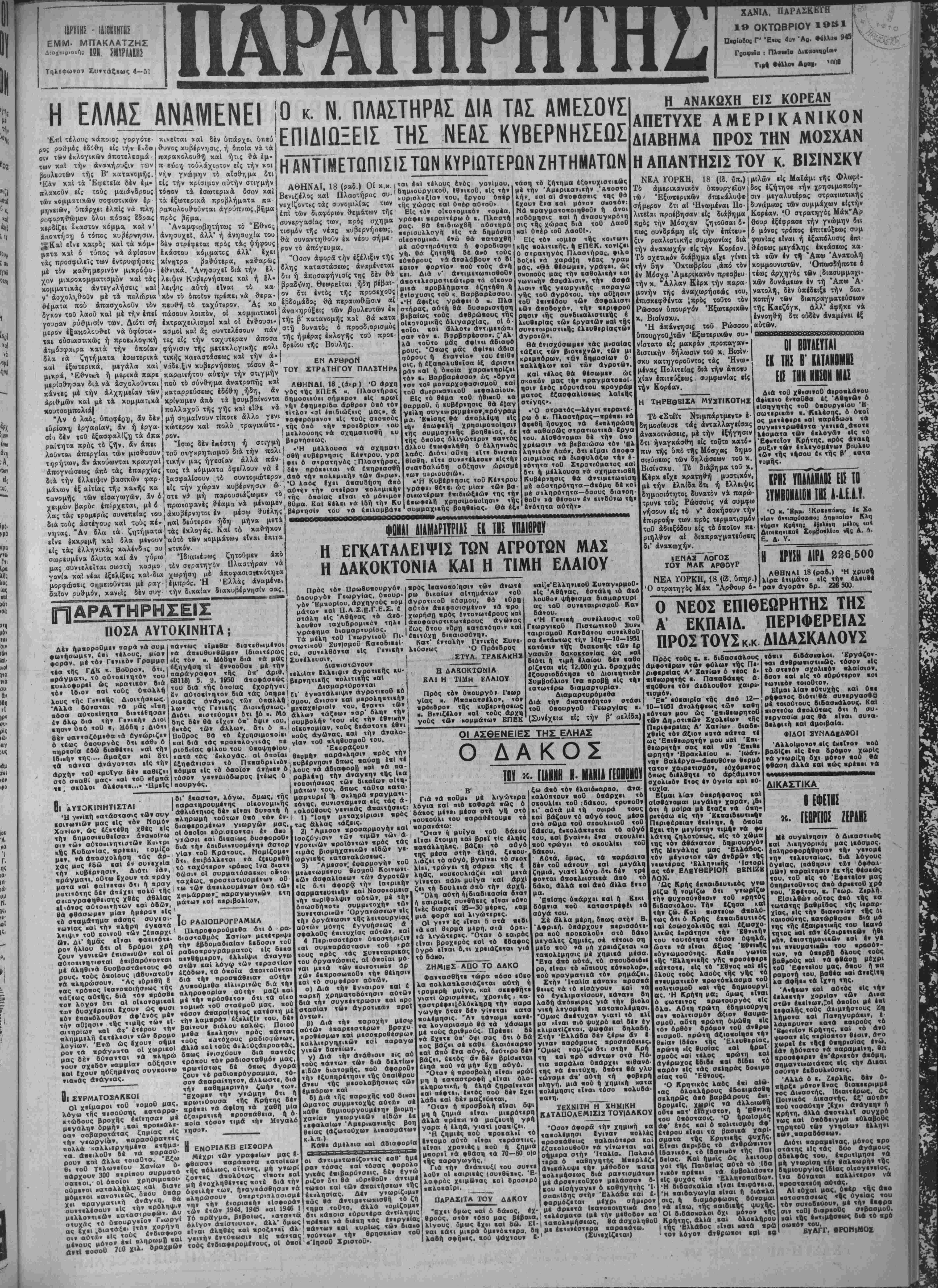 χ < Είς «άν οικονομικόν νομέα. νράφει περαιτέρω ό ι. Πλαστή ρας. Θά επιδιωχθή αύστηρά ■ιρισυλλογή είς τα δημοσία οΐιονομικά. έ»ώ θά παταχθή έ θό τάση τό ζήτημα ίξονυχιστικώς μέ την Αμερικανικόν ,Άποστο λή*. καΐ αί άποφάσεις «ής θβ ίχουν ίνα «αί μότον σκοπόν: Νά πραγματοποιηθοθν ή άνοι κοδόμησις καΐ ή ΑνασυγΝρότη σις τ ής χώρας διά «οΟ μοΙ ΰαίρ «οθ ΛαοΟΙ». ΔαοΟ Είς τό» ιομία τής κοινωνι λή ή ΠΚ μέ αθστηρό«ητα ή φοροδιαφη Κής ,Ολιτι«ής. ή εΠΕΚ. τον«ζ·ι "Οσον άφορβτήν εξέλιξιν τής ?ί;Α"* 1ΡζηΙγϊ.Λ*Λί"6 ου.ς( ΰ σιρατηγός Πλαστήρας, φιλο .....?..ι_ ' 2....Υ. '. ·0«6ρους νά Αναλάβουν τό δί Βοε·ϊ νά γαοάΕη νέαο νοαυ έθ·νιχά. Άνησυχεΐ διά την έλ¬ λειψιν Κυβερνήσεως και ή έλ¬ λειψις αυτή είναι τδ κα· .. κδν τδ διτοΐον πρέπκι νά θερα·[Ον 8τι *ντδς πού άπασχολοΰν τδν πευθή τδ ταχύτερον. "Ας χο εβδομάδος θα περαιωθδσιν αί'€.Η _„.„., ,„_,,_._ „,___ δγχον τοθ λαοΰ και μί την έπεί πάοουν λοιπδν οΕ κομματικοί άνακηρύξεις των βουλευτων έκΐοτηρας, αυτή Θά δυσαρεστηθή γουσαν ρύθμισιν των. Διότι σή έκτραχειλισμοί καί ο£ ένθουσι.|τής β' κατανομής χβί θά κατα ·■·-·«- -«Λ* *.*«*--------β. δλης καταστάσεως άναμένεται ,αιο, #0ρ,ι0, ΒΟύ τοΰς άνή διι ή άποσαφήνισίς της δέν θά κει. Διά ν' ά»τιμ«τωιιισΘοΟν βραδύνη, θεωρεΐται ήδη ρίβαι-1 αποτελεσματικωτέρα τα οΐκονο Γ - - - ' ' γ '■—* -""ιβλήματα ίζητήθη ή τοθκ Βαρβαρόσσου. γράφκι ό μ. Πλα μέραν ίξακολευθ-εί νά υφίστα- ασμοΐ καί άς συντελέσουν πάν^ΐ δυνατδ; δ προσδιορισμός τβΐ οδσιαστιχως ή προεχλογική τες είς την ταχυτέραν άποσα τΐΐ5 ημέρας εκλογάς τοΰ προ*- άτμόαφαιρα χαχά την οποίαν φήνισιν τής μετεκλογιχής ηολι δρεΐου τής Βουλής. δλα ιά ζητήματα έσωτ,εριχά τική"ς καταστάσεως καί την ά·| ---------- κ«1 έξωτερικά, μεγάλα χαι' νάδειξιν κυβερνήσεως τόσον ά-' ΕΝ ΑΡΘΡΟΝ μικρά, Έθνικά ή μερικά παρε" παραιΐήτου αύχήν την στιγμήν ΤΟΥ ΣΤΡΑΤΗΓΟΥ ΠΛΛ2ΤΗΡΑ μερίσθησαν διά νά άσχολοΰνται Ι πού τδ σύνθημα άνατροπής καΐ ΑΘΗΝΑΙ 18~7α~ο πάντες μέ την άλχημείαν των|«αταρρΐύσεως έδίθη (ήδη, άν νός τής κΠΕΚ κ. ι αριθμών καί μέ τα Χομμαπχά χρίνιομεν άπό τα |συμβα(νοντα δημοσιεύει σήμερον είς «ρωϊ πολλαχοΰ της γ«ς χαι εΐθ·» νά »*Ι» έφημ«ριδα άρθρον υπό τό» - ' - ' - - «ίτλον «αί επιδιώξιις μας», ά - , , . , , ναφ·ρόμ·νο* »1ς «ούς σεοπούς κωτερον καί πολυ τραγιχωτε- -ής 0,0 ,ή, ,ροΐ6ρ1ο» τού ρον. ! μ«λλούοης νά σχηματισθή ε,υ κουτσομπολιά| "Αν δ λαδς όπαφέοη, αν δέν ευρίσκη εργασίαν, άν ή εργα¬ σίαι δέν τοθ έξασφαλίζη τα άπα ραίτητα πρός τδ ζήν. αν άπει λοϋνται άπεργίαι των μιοθοσυν τηρήτων· άν ακούωνται κραυγαΐ άπογνώσεως άπδ τάς επαρχίας διά την Ελλειψιν βασιχών φαρ- μάχων έξ αίτίας τής καχής χά τανομής των εϊσαγωγών, άν 6 χειμών βαρύ<: έπέρχεται, μί β Ίσως δέν έπίστη ή στιγμή δ η η βερνήσεως. πολι Ι ι'Η μέλλουσα νά σχηματι Πβν.'σβή «υβερτησις Εβ,τρου. γρα ! ·»ι ό στρατηγό Π λας τάς τρομεράς συνεπείας τού! ακυβέρνητοι έν μίσφ θυέλης διά τούς αστέγους χαί τούς πέ-1 παί δεύτερον ήδη μην α μετ χ νητας. "Αν δλα τα ζητήματα τοθ συγκρητισμοθ διά την τικήν μας ήγεαίαν άλλά , #>( 0 β ; Πλαστήρας.