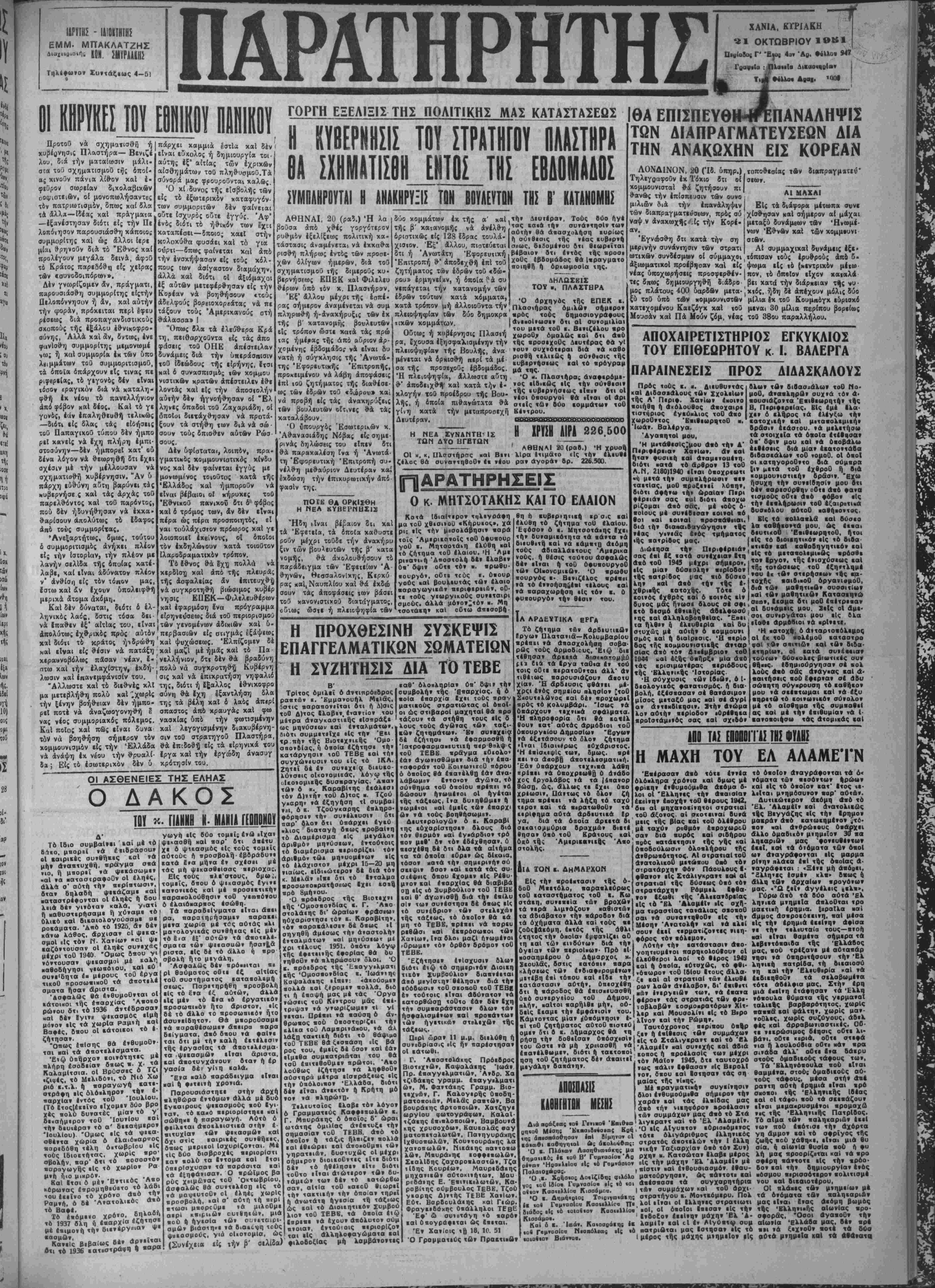 Καΐοίκοα Άθη»Δν Βι' ά«θααιηακ<α »ία» εξ όιιελεία;. Κω». Ν· Λοαλοααάεη ί» Χανίων Βι' άηάιη» κοί, Έμμ. Χά. Γαββα Ικ Πειοαι»; Β," '—'-ι------ δέν βμποδίζει την κυριαρχίαν τής γεσμανιχής χυββρνήσεως χαί συνέχισε: Αί βφεδρΐχαί δυ νάμεις, τάς οποίας οί σύμμαχοι διατηροΰν, είναι τόσον ισχυραί ώστε οί σύμμαχοι θά ίχουν πάν τοτε την απεβοχήν είς χείρας των Αί προβφατοι ηαρατηρήσεις τοθ ανωτάτου διοικήται) των δυ νάμεων τοΰ Άτλαντικοΰ, ,στρα τηγοΰ "Αίζενχάουερ, δτι αί άμε ριχανιχαΐ δυνάμεις {είναι (δυνα τόν νά άηοχωρήσουν έξ' Εύρώ |πηςέντός δύο 1 τριών ίτών,δέν είναι έξ' ολοκλήρου άκατάλλη λο: δι* Ινα πιθανόν ΰηοψήφιον είς την προεδρίαν των Ήνωμέ νων Πολιτειών. Η ΕΥΡΩΟΛ Ι'ΚΗ ΕΝθΤΗΣ .ΡΙΥΜΑΙ,ΙΜΟΣΕΡΓΑΤΟΝ Την 2 ιι. μ. ώραν τής νρο χ·ές κα«έιιεσεν έκ «ής οΐιοδο μής τοθ κ. Χαμηλάεη κβΐκένης είς την συνοιεΐαν ΒσστελλΙου της ιιόλεΰς μας Α έν αΰτΒ ερ γαζόμενος Στυλιανός Μυλωνά ■ ής, εάτοιιος Χανίων, δ όποΐ ος κα< ύβίσνη θλβσιν τής κνή μης την 4 μ. μ, ώραν «ής 161 άς ημέρας κατίβεσιν ΙηΙσης «■ τής αυτής οΐκοβομής δ ,Αρ τΐμιος Μυλωνονιανναιης, ό δ- αοΐος «αί ύαβσιη έγιεφαλικήν βιάσεισιν. Αμφότεροι οί τραυμάτισβέν τες διεΝομΙσβησαν είς την κλι νίκην τοθ ■. Γεωργιλα6ά>η