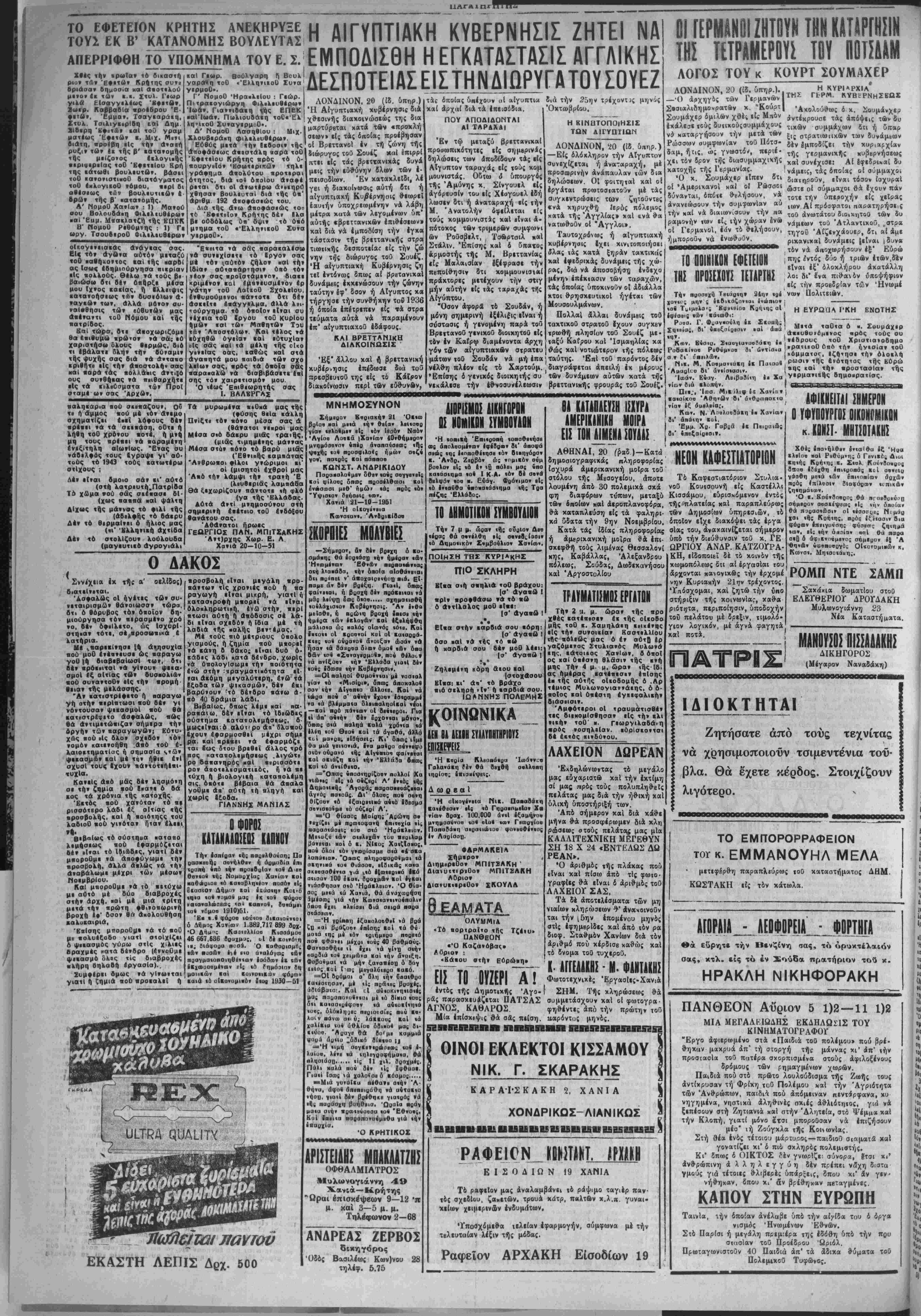 γερμανιιής 6ημοιρατ<ας. ΑΦΙΚΝΕΙΤΑΙ ΣΗΜΕΡΟΝ Ο ΥΦΥΟΟΥΡΓΟΣ 0ΙΚ0Ν6ΜΙΚ0Ν κ. ΚΩΝΣΤ- ΜΗΤΣΟΤΑΚΗ- Χθί; 5ηα»τ)λθί» £»«α«θα ίζ Ήοα Κλεΐοα «αί Ρβθύμνη» δ Γενικάς Διυι Κηιής Κοήιη; Κ. Σ«ολ. ΚοννΒονυο; Βποα ίΪΒϊθη ίπι«οοπά; Κοί αβνβΐο γάοθη μβιά «ώ» έπκαηίων αρχφν ποός Ιπΐλοοιν διαφοράν ιιπικ&ν ζηιημάχκν, Ό κ. ΒούνΒααρος θά ηπιιΒοιύοιι οήμβοον οοσΐέψβως ·Ι; «ήν όηυία» Θά ποοασιέοοι» οί «ίοοσυϋ; Νομύα ■αι ιης Κοή«ης, ποίκ; ιξίιαοιν Βια φόοων ίπΐιγυνσης φύίΐρ'τς ζη«ηι»ά ιων, β Ι; ιήν ό «αί ο» βαί Οιί ηαοα οιβ Α άφικνπνμενο; σήμεουν ίξ Ά θη«&» ύιρβηοβογ6ϊ ΟΙ«α»ομιιών κ, Κωνοι. Μηΐοοιαιιη;, ΡΟΜΠ ΝΤΕ ΣΑΜΠ Σαχάόαα δωματΐου στοθ ΕΛΕΓΘΕΡΙΟΓ ΔΡΟΓΔΑΚΗ Μυλωνογιάννη 23 Νέα Καταστή* ματα. ΜΑΝΟΥΣΟΣ ΠΙΣΣΑΑΑΚΗΣ ΔΙΚΗΓΟΡΟΣ (Μέγαρον Ναναδάκη) ΙΔΙΟΚΤΗΤΑΙ Ζητήσατε άπό τούς τεχνίτας νά χρησιμοποιοΰν τσιμεντένια τοΰ- βλα. Θά εχετε κέρδος. Στοιχίζουν λιγότερο. ΤΟ ΕΜΠΟΡΟΡΡΑΦΕΙΟΝ τογ κ. ΕΜΜΑΝΟΥΗΛ ΜΕΛΑ μετεφέρθη παραπλεύρως ιοθ καταστήματος ΔΗΜ. Κ&ΣΤΑΚΗ είς τόν κάτωλα. Α ί ΟΡΑΙΑ _γ_ Α ΕΒ Φ ΟΡΗ Α__^_ΦΟΡΤΒΧΑ Θά εΰρητε την Βενζίνη σας, τό όρυκτέλαιόν σας, κτλ. είς τό έν Σούδα πρατήριον τού κ. ΗΡΑΚΛΗ ΝΙΚΗΦΟΡΑΚΗ ΠΑΝΘΕΟΝ Αυριον 5 1)2—11 1)2 ΜΙΑ ΜΕΓΑΛΚΙΩΔΗΣ ΕΚΔΗΛΩΣΙΣ ΤΟΥ ΚΙΝΗΜΑΤΟΓΡΑΦΟΓ "Εργο άφιερωμένο στά (Παιδία τοθ πολέμου» πού βρέ¬ θηκαν μαχρυά άπ' τή στοργή τής μάννας χι' άη' την προσταοία τοθ πατέρα σχορπισμένα στούς άφιλοξένους δρόμους των ρημαγμένων χωρών. Παιδία πού στό πρώτο λουλούδισμα τής Ζωής τους άντίχρυσαν τή Φρίχη τοΰ Πολέμου χαί την Άγριότ^τα των Άνθρώπων, παιδι^ι πού άπόμειναν πεντίρφανα, χυ νηγημένα, νηστιχά άληθινές πχιές αθλιότητος, γιά νά ξεπέσουν στή Ζητιανιά καί στήν 'Δλητεία, στά Ψέμμα χαί την Κλοπή, γιατί μόνο έτσι μποροθσαν νά έπιζήσουν μέο" ιή Ζούγχλα τί|ς Κολωνίας. Στή θέα ενός τέτοιου μάρΐυίΐος—παιδιοθ σιαματδ χ«1 γονατίζει χι' ο πιό σχληρός πολεμιβτής. Κ ι" δπως δ ΟΙΚΤΟΣ ?έν γνωριζει σύνορα, ίτσι χι' ανθρωπίνη ά λληλεγγύη δέν πρέπει νδχη διστα γμούς γιά τέτοιες θλιβερές υπίρξεις, δπου χι' ίν γεν» ήθν, δπου κ/ δν Ρρίθηχαν πεταγμένες. ΚΑΠΟΥ ΣΤΗΝ ΕΥΡΩΠΗ Ταινία, ήν οποίαν ανέλαβε υπό την αίγίδα τού ό όργα νισμός Ήνωμένων Εθνών. Στό Παρ'σι ή μεγάλη πρεμ:έρα της εδόθη 'όπό την που στασίαν τοΰ Προέδρου 'Ωριόλ. Πριοταγωνιστοΰν 40 Παιδία άπ' τα άδιχα θύματα τοθ ΠολεμιχοΟ Τυφώνος.