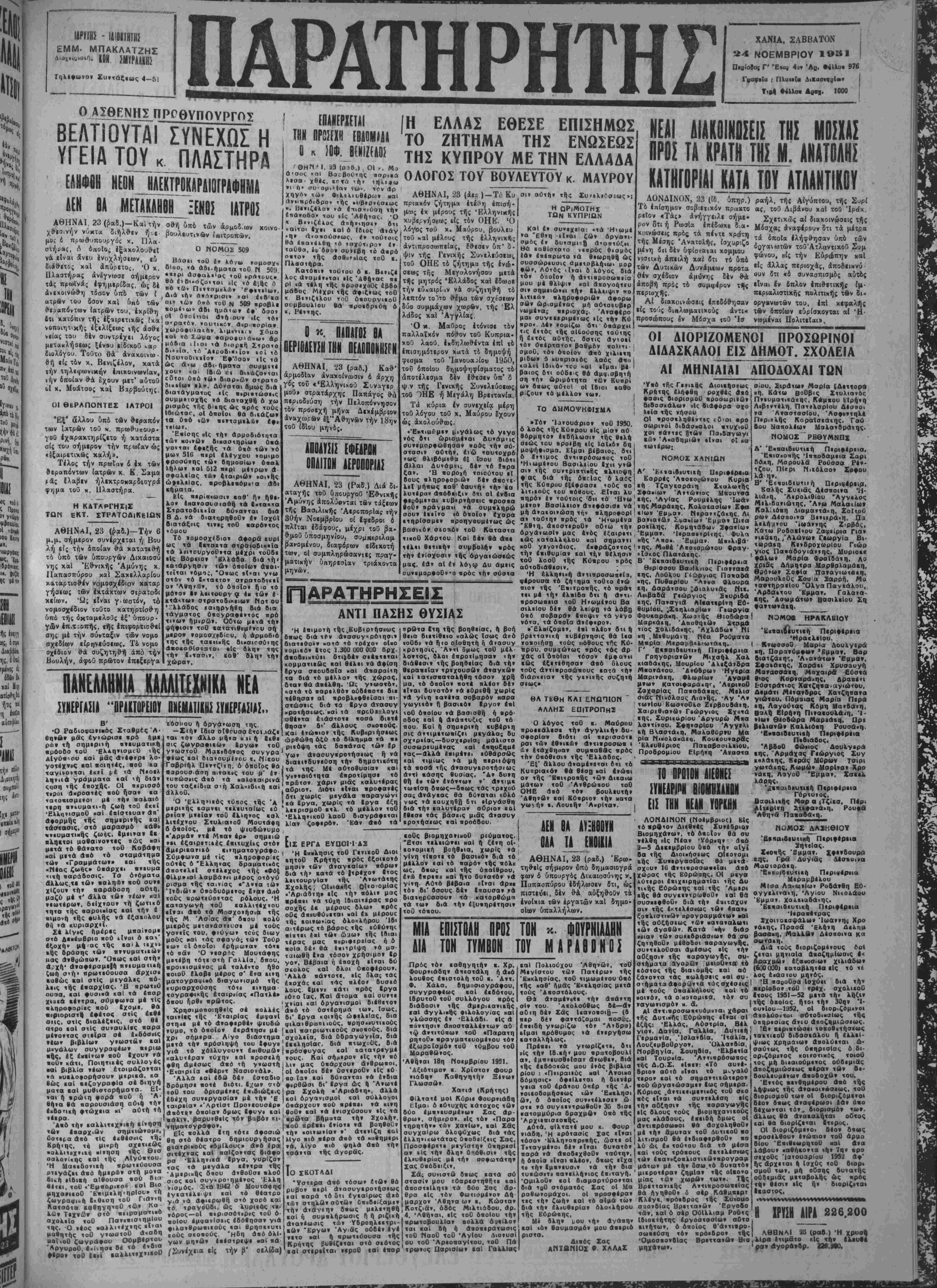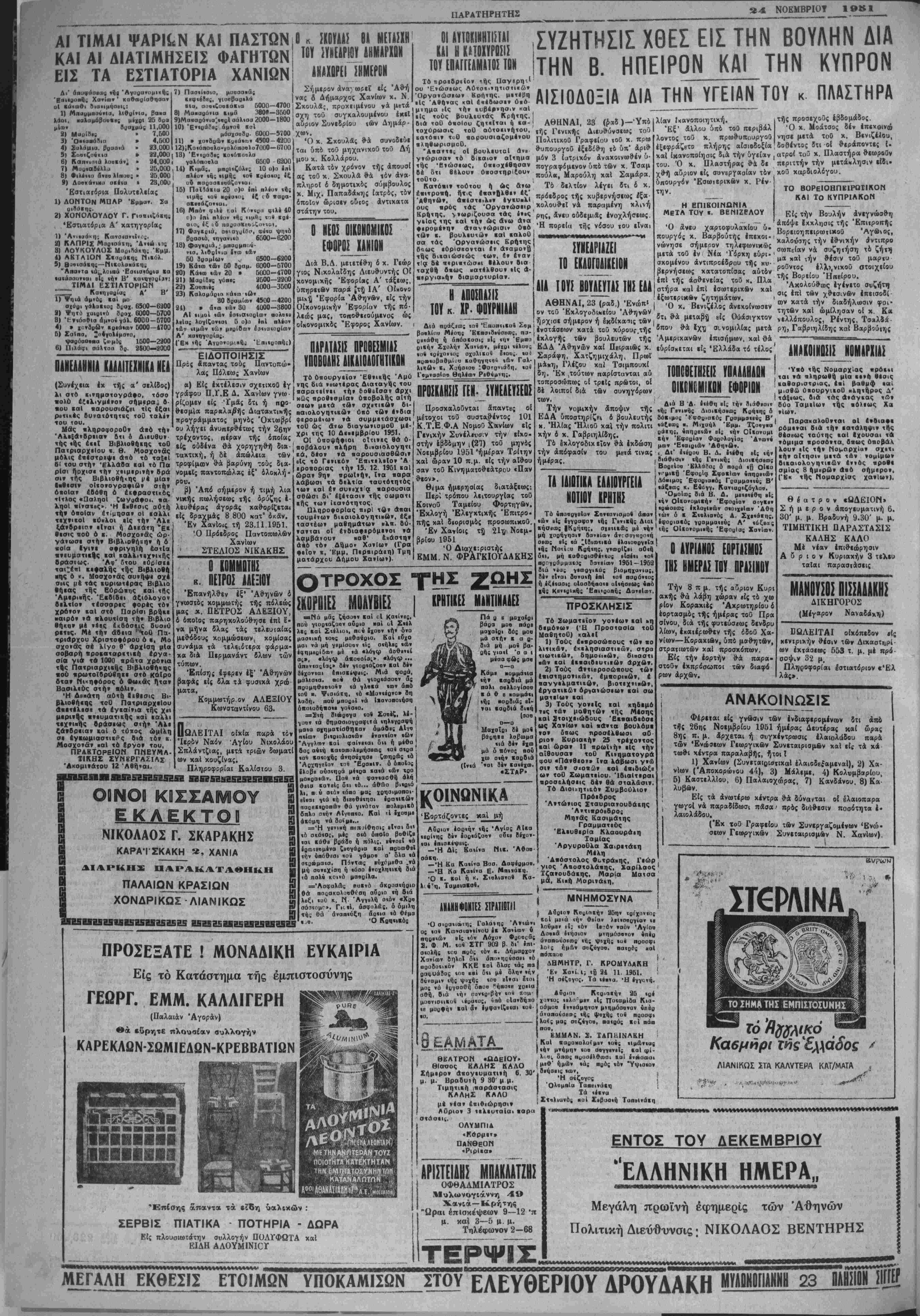 Πεοίοβος Γ' Έ«οβ 4α* Ά0. ·<λΧο· 976 Γβανεΐα : ΠΧαεεΙα ΔιΚααιιοΙβτ 1000 ΒΕΛΤΊΟΥΤΑΙ ΣΥΝΕΧΩΣ Η ΥΓΕΙΑ ΤΟΚ^ΙΛΑΣΤΗΡΑ ΕΑ1ΦΙΚ ΗΙΞΟΗ ΗΑΕΚΤΡΟΚΑΡΑΙΟΓΡΑΦΗΜΑ ΛΕΗ 1Α ΜΕΤΑΚΑΗΘΗ ΞΕΗΟϊ ΙΑΤΡΟΣ ίΟΑΚΡΙΠΑΙ 1811 ΠΡ51ΓΧΚ [ΒΛΟΜΙΛΙ Ο κ !ΟΦ. ΒίΙΙΖίΑίί 'ΘΗΝ' Ι, 23 (ομ6.) ΟΙ »ι ίι» συ'βμιΜα* τω», Η ΕΛΛΑΣ ΕΘΕΣΕ ΕΠΙΣΗΜΩΣ ΤΟ ΖΗΤΗΜΑ ΤΗΣ ΕΝΩΣΕΩΣ ΤΗΣ ΚΥΠΡΟΥ ΜΕ ΤΗΝ ΕΛΛΑΔΑ ,ϊίϊί ΟΛΟΓΟΣ ΤΟΥ ΒΟΥΛΕΥΤΟΥ κ. ΜΑΥΡΟΥ αρ υβμιΜα* τω», ττ^ν αρ τ»» Φιβ,αιυθερω* καΐ ΑΘΗΝΑΙ, 23 (άερ ) —Τό β ή ό ζ έ ΝΟΜΟ2 509 Β*ο., τοθ ί. :6νω ,ομοοϊβ βΐοο, τα άβι.ήματα τοΟ Ν 509 ά Κ των Ιατρών τοΰ *. ρ γοθ εχαραχτηρίζετο ή κατάατα αί; τού σήμερον την πρωίαν ώς ιίξαιρετικώς καλή». Τίλος την πρωϊαν & έκ των θεραπόντων ιατρών κ Κ Σαμα ^ας Ιλαβεν ήλεκτροκα φημα τοΰ χ. Πλαστήρα. ΤΩΝ Η ΚΑΤΑΡΓΗΣΙΣ ΕΚΤ. ΣΤΡΑΤΟΔΙΚΕΙΟΝ ΑΘΗΝΑΙ, 23 (ρ"αδ.)-Τήν 6 μ.μ. σήμερον συνίρχεται ή Βου λή είς την οποίαν θά κατατεθή το υπο των υπουργών Δικαιοού νης καί Έθνιχής Αμύνης χ. ΙΙαπασπύρου καί Σακελλαρίου έ νομοσχέδιον καταρ ά δ ρ μχ ρ γήσιως των εκτάκτων σιρατοδι κείων. Ώ; είναι γ·.(ασίαν, τό νομοσχέδιον τουτο κατηρτίσθη 6πό της όχταμελοΰς έξ' υπουρ¬ γόν Ιπ,τ;οπής, τής έπιφορΐιοθεί σης μέ την σύνταξιν των νομο οχεδίων είρηνεύσεως. Τό νομο σχέδιον θ·α συζητηθή άπό Τ·ήν Βουλήν, «φού πρώτον έπεξεργα ό θ/ιοΐο; Ιξα.κολουθ'εΙ ν* είναι άνευ ενοχλήσεων, εύ ίΐ«ί3·ετΒί κ«1 άπύριτος, Ό χ. Πλαστήρας άνέγνωσβ σήμερον ·βιρι *σε>αλε'"ός 'οθι κρΛτοΰς»