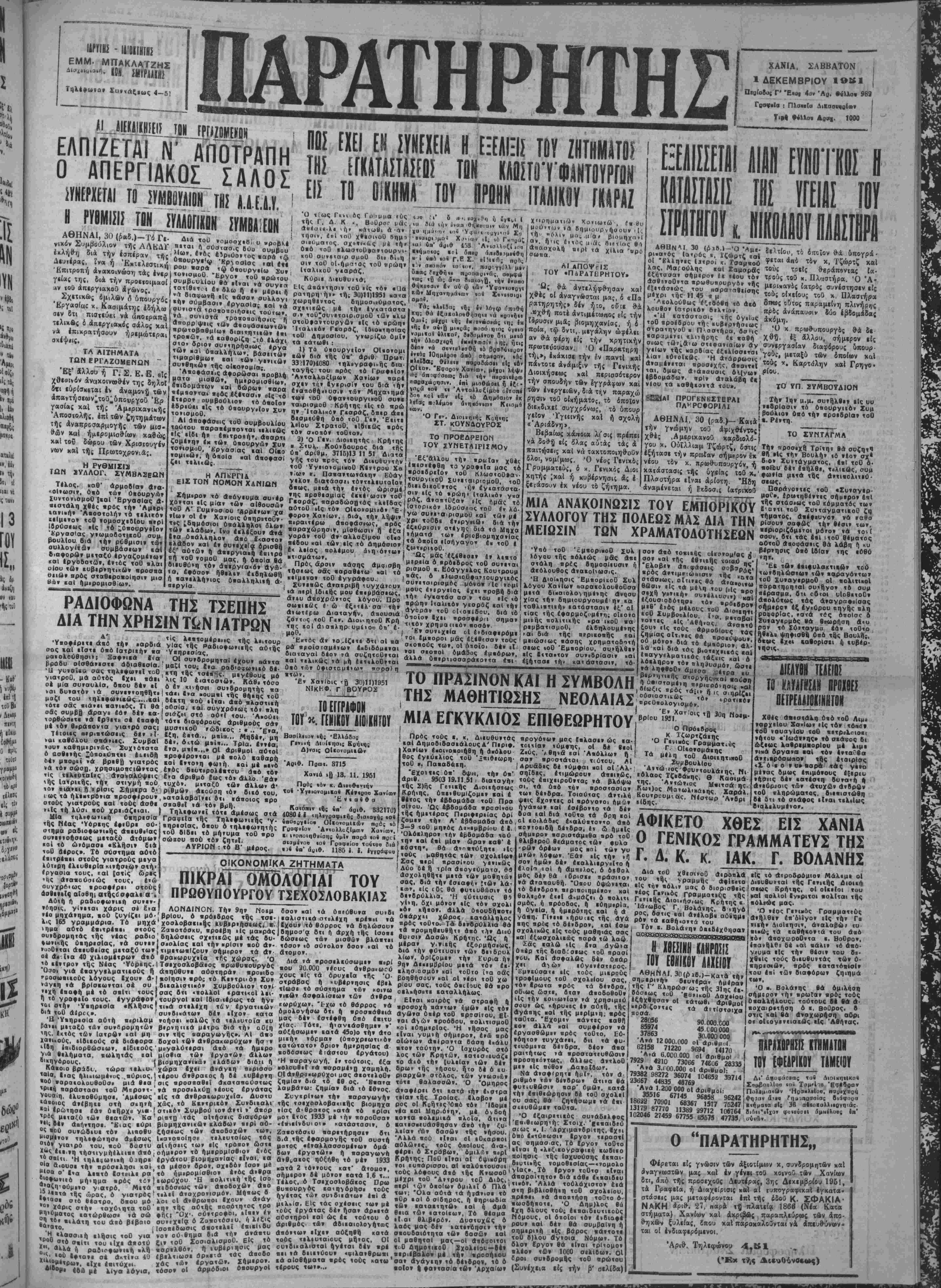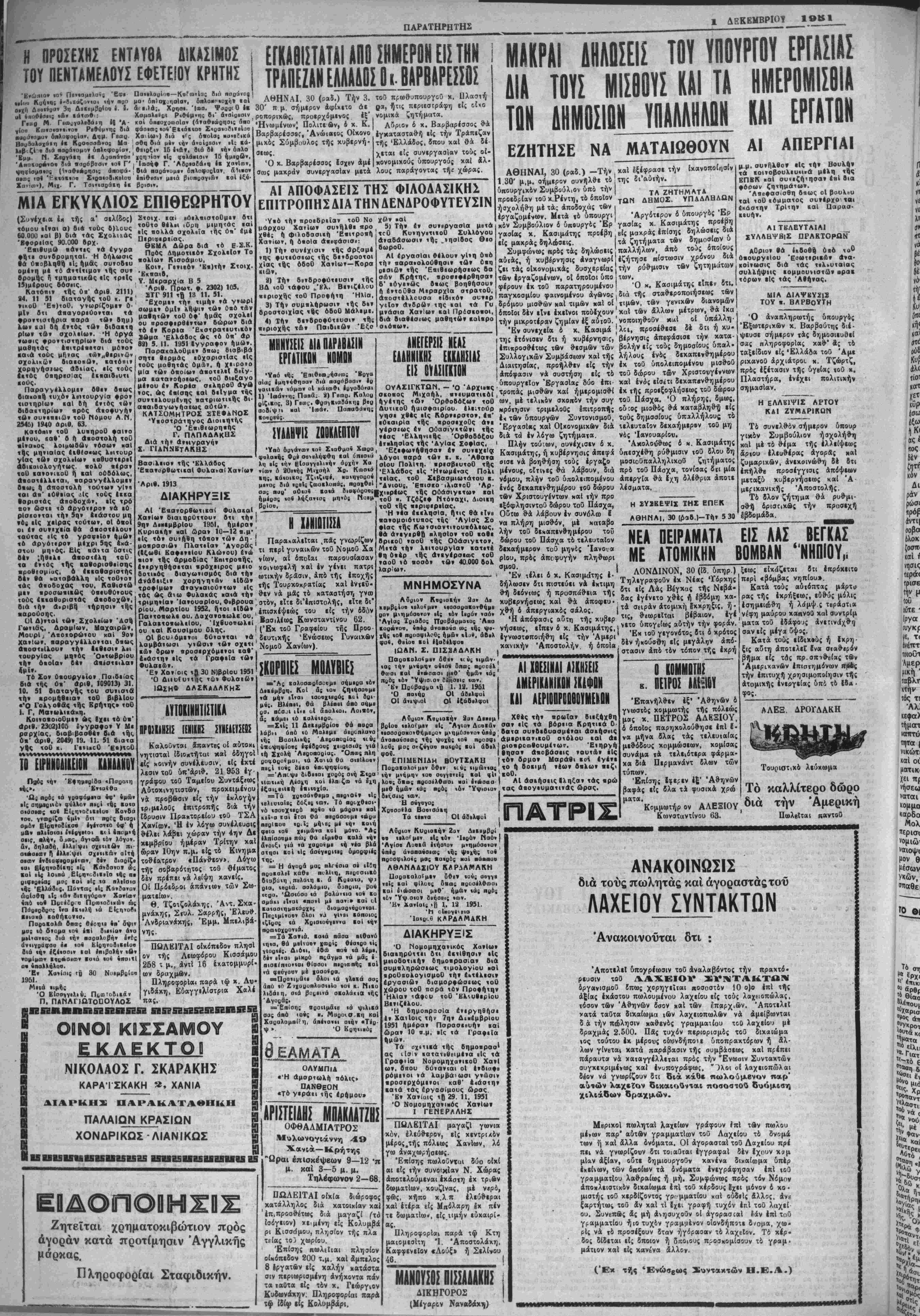 νομίμοον ΐβςβοιων >σ<ά ·ο« «πσιτί α· «ηαλΚάλοο. Έν Χα»ίπΐ{ Γμ 30 1951, Μιιά ειμής Ό ΕΙσογγιλιϋ. Πι,α)Τ(,5ι»άν Π. ΠΑΜΑΠΩΤθΠΟΥΛθΣ ΑΥΤΟΙΙΙΗΙΙΣΙΙΜ ■ΡΙΧΝΗ! ΙίΙΙΙΙ! «ΗΙΙίΚΙΙ! Καλοϋνται άπαντες οί αύτοκι νητισταί ίδιοπτήται καί δδηγοί είς κοινήν συνέλευσιν, εί; έκτέ λεσιν τοθ δκ'άριθ. 21953 έγ ■. γράφου τοϋ Ταμείου Συντάξεως Αύτοκινητιστών, προκειμένου νά προβώσιν εί; την εκλογήν τρ.μελοθ; έπιτροπής διά την ίδρυσιν Πρακτορείου τοΰ ΤΣΑ Χανίων. Ή έν λόγω συνέλευσις θέλει λάβει χώραν την 4ην Δέ χεμβρίου ημέραν Τρίτην χαί ώραν 10ην π.μ. είς τδ Κινημα τοθέΛτρον «Πάνθεον». Λόγω τής σοβαρόττιτος τοΰ θέματος δέν πρέτιει νά λείψη χανεΕς. Οί Πρόεδροι άπάνιων των Σω· ματεΐων. Θ. Τζοτζολάχης, Άν-Ε. Σκα- μνάχης, Σιυλ. Σαρρής, Έλευθ. Άνδριανάχης, Έμμ. Μπελιβά- νης· ΠΩΛ ΕΙΤΑ Ι οικόπεδον πλησι όν τής Λιωφόρου Κισσάμου 258 χ μ., άντΐ 16 έχατομμυρί- ών δραχμνν. Πληροφορίαι παρά τώ χ. Αυ· γιδάκη, ΕύαγγελΙστρια Χαλέ πας. τού 1ασιλ·ως Κωνσταντίνου (Έκ τοΰ Γροφείου της Προο δευτική; Ενώσεως Γυν«ιχών Νομοΰ Χανίων). 2Κ0ΡΒΙΕΣ ΜΟΑΥΒΙΕΣ —"Λς ιολοθΦοΙσοομε οήμερα «ό» Διιβμβοη. ΚοΙ ά; «ο« ζηιήοοομκ «Α μή» ίΐναι «οοοχιερ,ός πςί δρι- μνς. Βλ·αει, Θά βλΐρβΐ άρΰ οςμβ μο. οίο^ι ιΐνβ υΐ άηολίθι. Λοιβό», άς ΐάμβι ΐό ΐαλ<ί«(οο. —Σ«ίς 11 ΔβιβμρΌ'ον θά πορα λάβει ά πό «ό Μοίβμβ ιής Βαοιλιβή: σίου Πολίτη, «ρεσβευτοθ τής "«« νά βοηθήση τού; έργαζο μοσιοϋπαλληλιχοθ ζητήματο; ΈΚλάΒος είς Ηνωμένας Πολι μένους, οίτινες θά λάβουν, διά πρό τοΰ Πάσχα, τονίσας δ(ΐ μία τεΐας, τοθ Σεβασμιωτάτου β. νόμου, πλήν τοΰ υπολειπομένου άπεργία θά έχη δλέθρια άποτε -Αν,ου8 •^σ.ο^λ,α.οΟ^Αρ. ένός δ.χαπ.νθημΐρου ,οθ δώρου λέσματα. Τζόζεφ Ντόναχι. Δ.οιιη τβν Χρ«στουγίντων καΐ την προ τοθ τής περιφερείας. εξόφλησιντοΰ δώρου τοΰ Πάσχα, •Η νεα εΐελησΐα, ήτις Θα ιΤνε Οδτω θά λάβουν έν συνόλω ϊ λήν τοΰ δεχαπενθημέρου τοΰ δώρου τοΰ Πάσχα τδ τελευταίον δεκαήμερον τοΰ μηνός Ίανοι-α ■ανομοιότυηος τής 'Αγίσς Σο Οίας τής Κωνσ«αντινουαόλ<ως, ΘΑ άτεγιρΘΒ πλησίον τοθ «αθε ΒριιοΟ ναοθ τής ΟΟάσιγκτον, Μιτά την λειτουργίαν ιατετί ναοθ »ό νόσον των 40.000 Βολ λαρΐων. ΜΝΗΜΟΣΥΝΑ ΑΟοιο» Κοο,αΐή» 2α. Δ. ιβλο«μι» *εαοαοαβο»θήμβ ό .Ις «όν 1,βό» ,αό» βό Ά Η ΪΥΪΚΕΨΙΣ ΤΗΣ ΕΠΕΚ ΑΘΗΝΑΙ, 30 (ρ3Β.)-Τήν 5 30 ' ΚΠΒΚ «αί συνεζήτησαν 4βί Βια -- ζητηματων. 'Λκβοασισθη δβως οί βουλχυ ταΐ τοθ «όμματος συνΐρχο ται εκάστην Τρίτην «αί Παρασ¬ κευήν. ΑΙ ΤΕΛΕΥΤΑΙΑΙ _ ΣΥΛΛΗΨΒΐΣ ΠΡΛΚΤΟΡΟΝ Αθριον βα ικΒοθτί ΰαό τα» Οιουργειου Έαωτερικ&ν ανα¬ κοίνωσις Βιά τάς τελευταίας συλλήψιις ιομμουνιστων αραε τόρων είς τάς Αθήνας. ΜΙΑ ΔΙΑΨΕΥΣΙΪ ΤΟΥ «. ΒΛΡΒθΥΤΗ Ό άναπληρωτής ΰπουργ/4; Εξωτερικών χ. Βαρβούτης διέ· ψευσε σήμερον τάς δημοσιευσεί σας πληροφορίας χαθ' άς το ταξείδιον εί; 'Ελλάδα τοΰ Άμε ριχανοθ άρχιάτροι. χ. Τζώρτζ, πρό; εξέτασιν τής δγβία; τοΰ χ. Πλαστήρα, ένέχει πολιτικήν σημασίαν. Η ΕΛΛΕΙΨΙΣ ΛΡΤΟΥ ΚΑΙ ΖΥΜΛΡΙΚαΝ Τδ συνελθόν σήμερον υπουρ γικδν Συμβούλιον ήσχολήθη καΐ μέ τό θέμα τής ελλείψεως άρΐου ελευθέρας άγορΑς καί ζυμαρικων, ανεκοινώθη δέ δτι επήλθε προσέγγισις άπόψεων μεταξύ κυβερνήσεως καί Ά με(Γΐκανικής ' Αποστόλη;. Τδ δλον ζήτημα θά ρυθμι- σθή δριστιχως την προσέχη έβδομάδα. ΝΕΑ ΠΕΙΡΑΜΑΤΑ ΕΙΣ ΑΑΣ, ΒΕΓΚΑΣ ΜΕ ΑΤΟΜΙΚΗΝ ΒΟΜΒΑΝ 'ΝΗΠΙΟΥ,. Οον *υ0<β»οο, σμοθ. | Έν τέλει δ χ. Κασιμάτης ε¬ δήλωσεν δτι πιστεύει νά έκτιμη θή δεόντως ή προσπαθεία τής κυβερνήσΐω; χαί θά άποφευ· άπεργιαχδς σάλο;. | τή; χυβερ ΛΟΝΔΙΝΟΝ, 30 (ίδ. ύπηρ.) δας εγένετο χθέςή Ιβδίμη χ«- τα σηράν άτομιχη ΐκκρηςις, η · θ Βέβ έέ άπόφο,σ,ς «ής ψο· νήσεως, ε