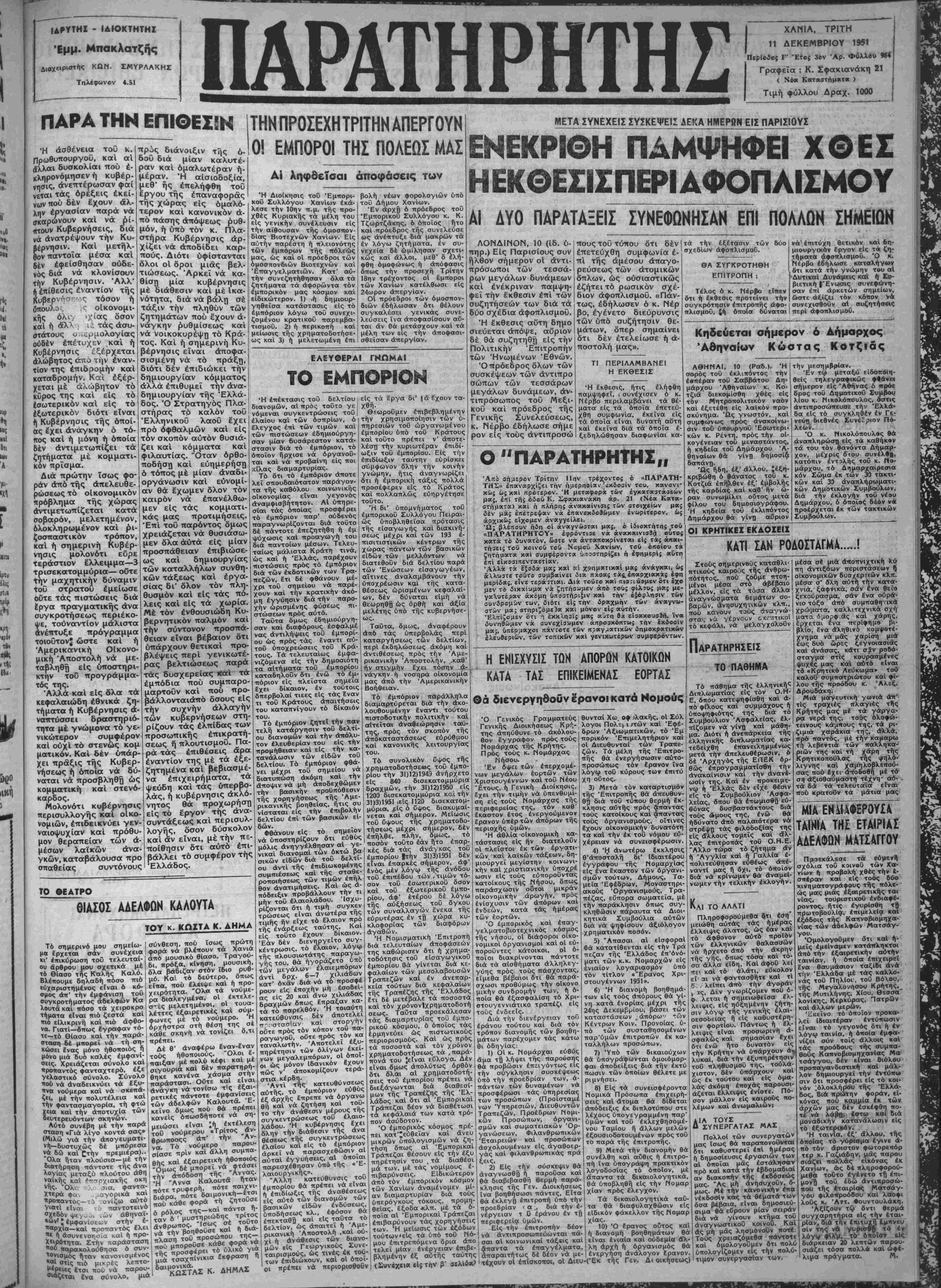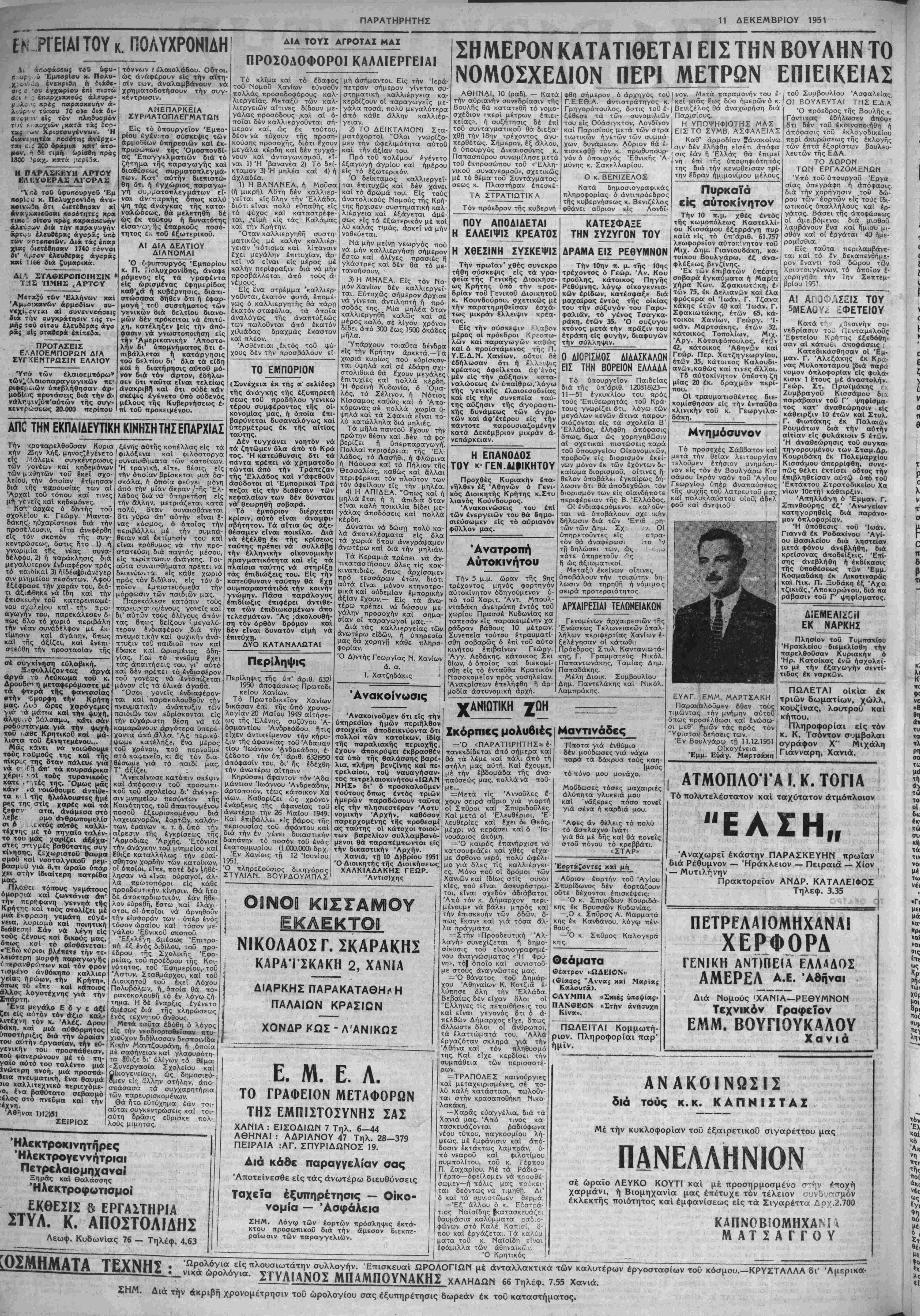 <ορηγήθη την Ιην Σεπτεμ- βρίου 1951 ΑΙ ΑΓΌΟΛΣ2ΙΣ ΤΟΥ Κατά τ.ν, Α0εσινήν συ¬ νεδρίασιν το»/ Πί^νταμελοΰς ΈφετεΙου Κρήτης εξεδόθη¬ σαν αί κάτωϊι άποφάσεις : Κατεδικάσθησαν οί Έμ· μαν. Γ. Αλεξάκης έκ Κρά- νας Μυλοποτάμου ζδιά παρά νομόν όπλοφορίαν είς φυλά¬ κισιν 1 έτους μέ αναστολήν. Γώ Σ Πά Γεώρ. Στ. Ζυμβραγοϋ άβ μ Πρωιμάκης Κισσάμου διά ϋ Γ' ί μβργ μ ά παράβασιν τοϋ Γ' ψηφίσμα- τος κατ' αναθεώρησιν είς κάθειρξιν 10 έτών καί Στυλ. Γ. Φιωτάκης έκ Παλαιών Ρουμάτων διά την αυτήν αΐτΐαν είς φυλάκισιν 5 έτών. Ή άναθεώρησις τοϋ συγκα- τηγορουμένου των Σταμ.Δρ. Κουριδάκη έκ Πολεμαρχίου Κισσάμου απερρίφθη, συνε* πώς θέλει έκτίσει οΰτος την έπιβληθεϊσαν αύτω υπό τοθ Έκτάκτου Στρατοδικείου Χά νίων ΙΟετήί κάθειρξιν. Άπηλλάγη ό Έμμαν. Γ. Σπινθούρης έξ' "Ανωγείων κατηγορηθεΐς διά παράνο¬ μον όπλοφορίαν. Ή υπόθεσις τοϋ "Ιωάν. Γιαννά έκ Ροδάκινου Άγί- ου Βασιλείου διά ληστείαν ϊ(μετάφόνου ανεβλήθη, διά κρείσονας άποδείξεις. Έπί- σης ανεβλήθη ή έκδίκασις τής υποθέσεως των Έμμ. Κοσμαδάκη έκ Λικοτιναράς καί Νικ. Π. Πυδάκη έξ Άχα τζικιάς,Άποκορώνου, διά πά ράβασιν τοϋ Γ' ψηφίσματος. ΕΥΑΓ ΕΜΜ. ΜΑΡΤΣΑΚΗ Παρακαλούμεν δθεν τούς τιμώντας την μνήμην αιότοΰ δπως προσέλθωσι καί ένώσω- σι μεθ' ημών τάς πρός τόν "Υψιστον δεήσεις των. Έν Βουλγάρω τή 11.12.1951 Οίκογένεια Έμμ. Εύαγ. Μαρταάχη ΔΙΕΜΕΛΙ^ϋ ΕΚ ΝΑΡΚΗΣ Πλησίον τοΰ Τυμπακίου Ηρακλείου διεμελίσθη την παρελθούσαν Κυριακήν ό Ήρ. Κατσίκας ένώ ήσχολεϊ- το μέ την εξαγωγήν σεντ(· τιδος έκ ναρκών. ΠΩΛΕΤΑΙ οίκία έκ τριών δωματίων, χώλλ, κουζίνσς, λουτροϋ καί κήπου. Πληροφορίαι είς τόν κ. Κ. Τσόντον συμβολαι ογράφον Χ" Μιχάλη Γιάνναρη, Χανιά. ΑΤΜΟΠΛΟΓΑ Ι. Κ. ΤΟΓΙΑ Τό πολυτελέστατον και ταχυτατον ατμόπλοιον "ΕΑΣΗ,, Αναχωρεί εκάστην ΠΑΡΑΣΚΕΥΗΝ πρωΐαν διά Ρέθυμνον — Ηράκλειον — Πειραια — Χίον — Μυτιλήνην Πρακτορείον ΑΝΔΡ. ΚΑΤΑΛΕΙΦΟΣ Τηλεφ. 3.35 ΠΕΤΡΡΛΑΙΟΜΗΧΑΝΑΙ ^ΧΕΡΦΟΡΔ ΓΕΝΙΚΗ ΑΝΤ)ΠΕΙΑ ΕΛΛΑΛΟΣ ΑΜΕΡΕΛ ΑΕ. Άβήναι Διά Νομούς 'ΧΑΝΙΑ—ΡΕΘΥΜΝΟΝ Τεχνικόν Γραφειον ΕΜΜ. ΒΟΥΠΟΥΚΑΛΟΥ Χανιά διά ΑΝΑΚΟΙΝΩΣΪΤ τούς κ.κ. ΚΑΠΝΙΣΤΑΙ **» Μέ την κυκλοφορίαν τοθ έξαιρετικοθ σιγαρέττου μας ΠΑΝΕΛΛΗΝΙΟΝ σέ ώραϊο ΛΕΥΚΟ ΚΟΥΤΙ καί μέ προσηρμοσμένο σ^ήν ίτι χαρμάνι, ή Βιομηχανία μας επέτυχε τόν τέλειον συνδ'ητητμόν έκλεκτίϊς ποιότητος καί εμφανίσεως είς τα Σιγαρέττα Δρχ.2.700 ΚΑΠΝ0Β10ΜΗΧΑΝΚ *'?> '- : ' - Ί' ΜΑΤΣΑΓΓΟΥ
