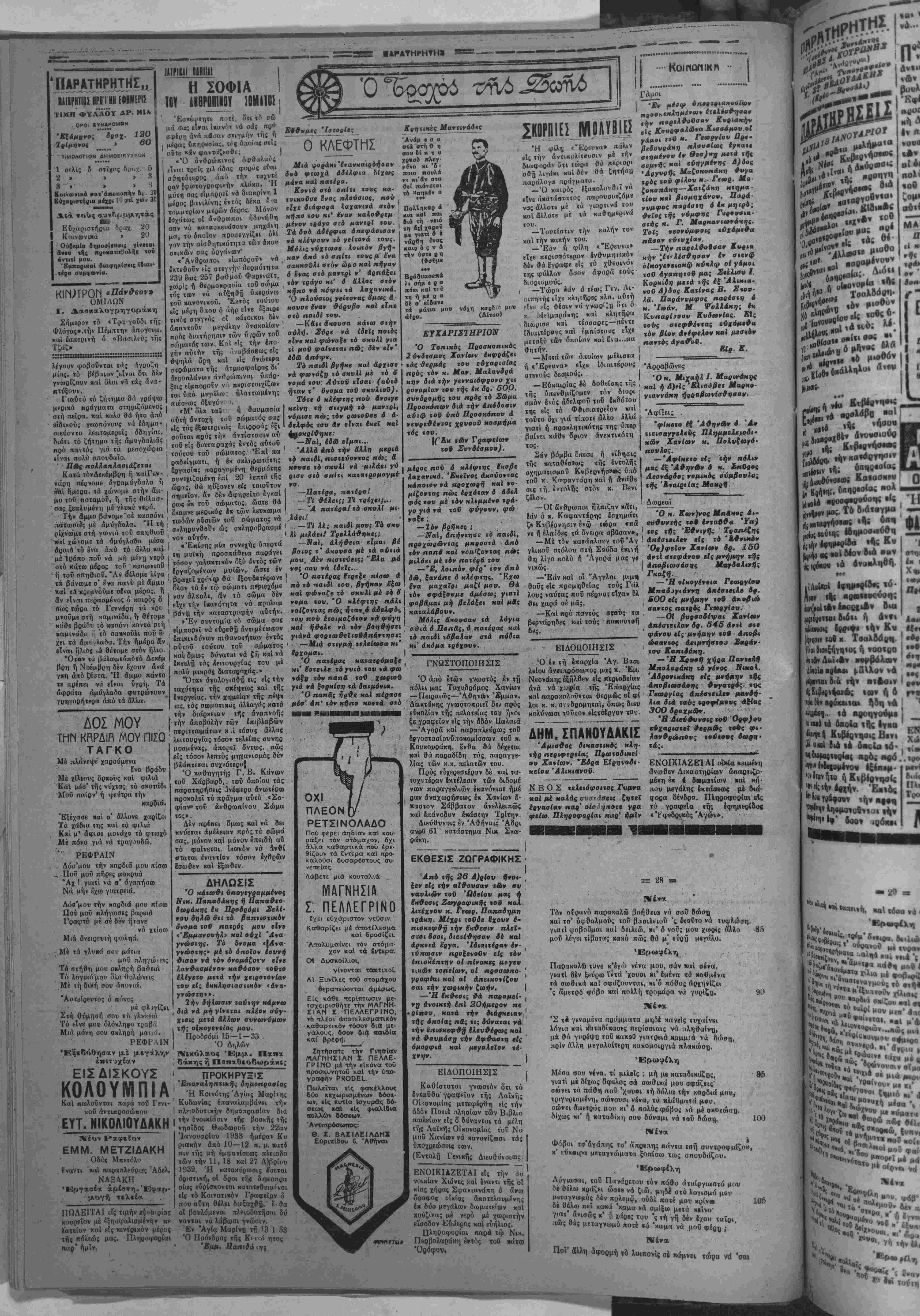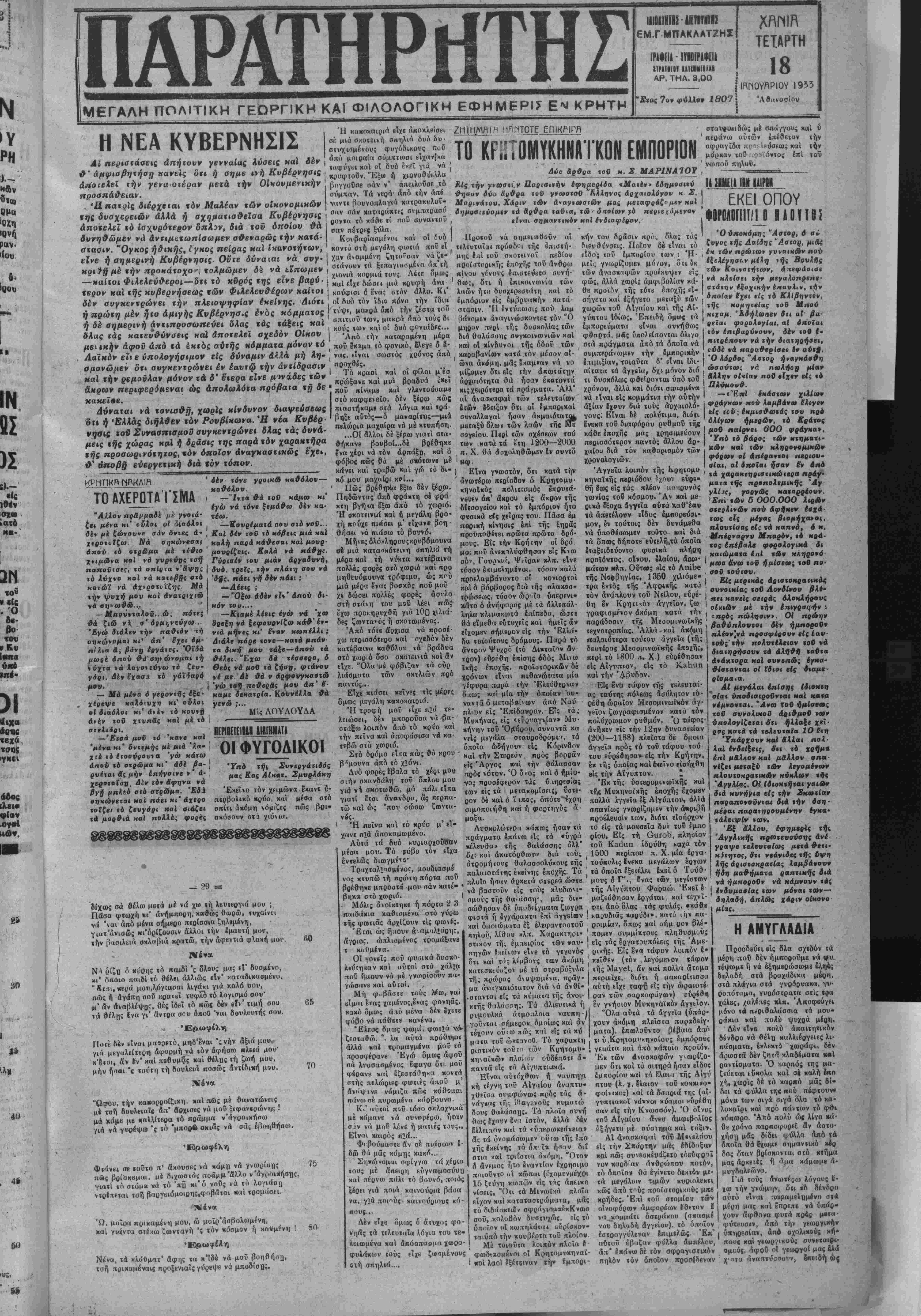 νΐας καΐ Ήηβίρου ηαραμδνουν β.ο<«' ΩΡΑ 3«ΠΡΩ ΓΝί. ΒΑΙΝΟΜΕΝ ΠΡΟΣ ΝΕΑΣ ΕΚΛΟΓΑΣ ΤΙΖΗΤΕΙΟκΤΣΑΛΑΑΡΗΣ ΑΘΗΝΑΙ 17 Ίανουαρίβυ (τοδ άντακοκοιτοδ μας).- Ή νέα Κυβέρνησις συνβπληοώθη τβλικώς ώς εξής: Βενιζέλος Πρωθυηουργός δνβυ χαρτοφυλακΐου χαΐ ύ πονργός των Στρατιωτικών μέχοι τής άφΐξβως έξ Ήοα· κλβίου τοδ χ. Κατβχάχη, Παπαναστασίου, τής ΈΒνικής ΟΙ κονομίβς, Μπβχάλμπβσης τής Γβωργίας, Κούνδουρος των Ναυτιχων, Μυλωνδς τής Πβιδιίας, Λϊβαντής ύφυπονρνύς τής ΣυγχοινΜνίας. Γενικός Διοιχητής Κρήτης τοποθετβΐται ό κ. Κνο,κος, Εξηντάρης τής Μαχβδονίεις καί Ζει,βός Θράχι,ς. ΔΗΛΟΣΕΪΣ ΤΟΥ κ ΒΕΝΙΖΕΛΟΥ Ό Ποωθίΐ ι-ογόί χ. Ββνιζιλος μβϊά την &ο»ιωμο οίαν τή. ΚυβΓ.ν^οΒως ομιλών πρός τιύ; δημοοιογρά φοτς ετόνισε δ»ι παρουσιαζόμβνος αίς «ήν Βουλήν θά.ζη τήσϋ «ήν ενίσχυσιν «αυτής διά «ήν εφαρμογήν τοϋ προ γρ,άμμ&τος τίΐς νίας ΝυββρνήσΒως. "Αν ουναννήσχ] δυσχι οείαί, δ κ. Ββνιζέλος έδήλωσβν, δτι θά προβΰ &(ς «ην διάλυσιν «τίς Βουλής καί ιήν άμεσον ηροχήρυξιν Ιχλογ&ν. ηΜΦΙΣΒΗΤΕΙΤΗΙ Η ΠΛΕΙΟΦΗΦΙΗ Κατβ τάς μβχοι τής ατιγμής πληροφορίας μου ή Κυβέο νηθις είναι άμφισβητήσιμος έ«ν θά συγχβντρώση την πλει οψηφίαν έν τή βουλϋ εάν ληφθή ύπ' δψβι δτι θά καταψη φισθή υπό τβν Λαϊχών των Κομοννιστβν χαί ομάδος των άγθρτιχβν τοδ κ. Σοφιανοπούλου. ΠΟΤΕ ΕΜΦΑΝΙΖΕΤΑΙ ΕΙΣ ΤΗΝ ΒΟΥΛΗΝ Ενώπιον τής βουλής ή Κυβέρνησις θ« εμφανισθή την ερχομένην έβδομάδα χ«1 θ« ζητήση την ψήφον έμπιστο- σύνης ή άνοχής, Παντω- κατά τάς πληροφορίας των πολι τικών κύκλων ή διάλυσις τής Βουλής είναι πιθανοτάτη. ΑΙ ΑΠΟΨΕΙΣ ΤΣΑΛΔΑΡΗ Ό κ. Τσαλδάρης ομιλών πρός τούς δημοσιογοάφους έδή λωσεν δτι είς περίπτωσιν χβθ' ήν διαλυθή η βουλή Μαι προκηρυχθοϋν νέαι εκλογαί Οά ζητήση παρά τοδ πρόεδρον τής Δημοκρατίας τόν καταρτισμόν άχρόου ύπονργβίου διά την διενέργειαν αυτών. Η ΣΤΑΣΙΣ ΣΟΦΙΑΝΟΠΟΥΛΟΥ Πληροφοροΰμαι Ιχι ή υπό τοϋ κ. Σοφιανοπούλου ομάς των άγροτικβν πιθανώς νά ϊϊαρβσχΐ) ψήφον άνοχης είς την νέαν Κυβέρνησιν. = 30 ϊβ. νύκτα, νά μυίνης μβτί μέ πβρίσαια ηριχαμένη. Δυο περιστεργια πλουμιοτά μοϋ 'φαίνεΐόν», νίνη, 'ς Ινα 'ψηλόταρο δκντρό «ι' Ιθώρου φωλεμένα,' χι'^σμΐγασι κανακισιά καί σπλαχνιχά φιλοΰοα. Η'. ^",1* "λλο" Ι(ί Λαβτ) τωί σοΰ Φ«ίνκτο 'μιλυΰβκ' μ ^ απάνω τοή χαοαΐς τωνε γεΐς λούπτ)ς ηεινασμένος σωνει ς τή μέοη «αί τδ δυό, περίσσια ουμωμένος, «ι αιίπαξβ τό'να ξαφνπκά τ' άλ,λοϋ άπό την Λγκά κ'^έξϊσκισέ το κι' έφαν το μ'άχορταγιά μβγάλη· κι' ίχεϊνο άπ' άπόμεινε τόσα πολλά λυπήβη, «τΐοΰ «'έκε,ΐνο νά μΜ ζή μίαν ώ'ίαν Ιβουλήθή, καί τό ζημιο τή μούρην τού -Οός ταή καρδίας τα μέοτ, ιιπηχει κι αύιό «αί σφάζεται γιά τ'άκρι0όν χον ταΐοι. Κι αλυπητα μ Ιξυπνησε ηβρίσσια ξαγοιβμένη . χι Λλτιμερνής νά στέχωμαι μέ κάνει ηρικαμέντι· 160 λουίΐης μί)ν εί ν* ό χύοης μοτ. τρομάσω καί χ ίμϊΐς «ι Μρισκρι'α&ΐ'ί χι' δμαοι 150 155 φοβοϋμαι αχοτωθοδμ· 1 Νένα Μηδέν τ οοΐοτ, γεΤς Θ6ός ποιέ, ν,ουσΟχΒΟά μου. τόσοχακομή δούσινετ'άμμάνια τα δικά μου ! Μ «νέν και θέλουν οί ούρανοί νά βλάψου τό κυρμί σον. 1 βδ ρμενα το βυμον τωνρ ααςακκλώ νά σΡύοου Γ!!14.10,^^ ίν"^. ^ β·««ο«ι οέ θλίψι, Κι γιατί σέ η, μή σΐίκΕσαι ο τι οε τούτη ΐη δουλειά γι«τρβιά δέ θέλει !0?ν ^ν1^"™"»1 ψϊυάστσ νυτο δύν8ται τέλος χ«λό νά δώαη. Π ΐ μέ γνώσι, α V ,ς νυτο δύν8ται τέλος χ«λό νά Φοόνιμο τόν Πανάρετο ^'αΛυνατό γνΐίζ ϊ ^ν στράτα ίίην Αλ«Η» ^«νιαΐςτοΰταις Υ'* 'δδ/κ,ιί «άλι οα ζύγωξε χ«1 τά π8ρ[σσια «ληγαιμένη αου χο,ρδιά «αοηγοριάν Έρωφίλη 170 175 νηί, * χά «ολυ«ληγωμένα, μου,Ισΰο"^. τώρα χαλλά να5αΚ°ΐβίς ^^ ί τού "° 130 λ0ιΛί)· ·»ιδ»τ8νθμά μου, 