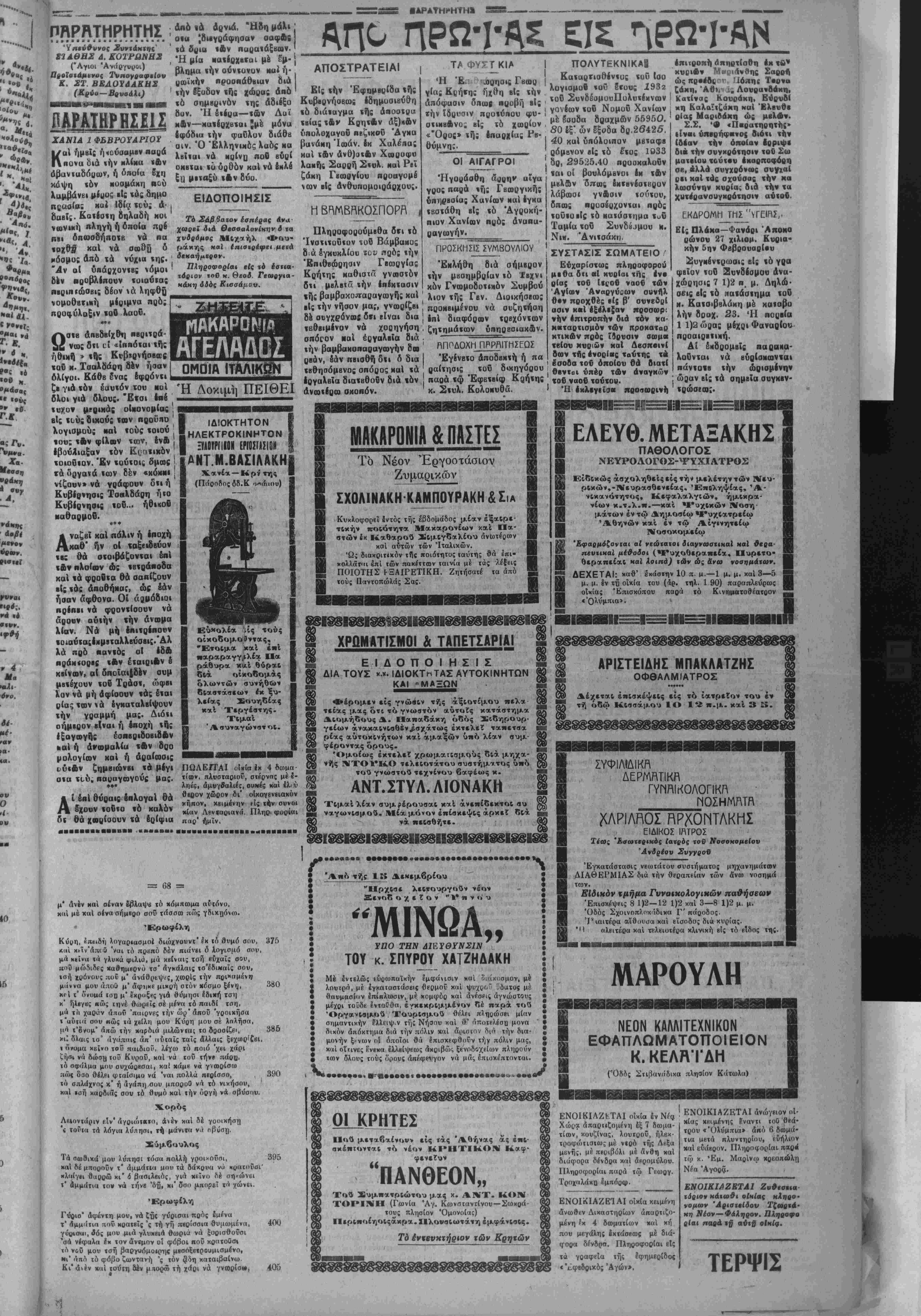 νωντσι άμέσ< ; «ά χα«άλλη λα πρβφνλ'. τικά χοί προ ληπτιχά μετ. ϊχβτιχώί ,-έ «ήν «ν Η ραχλε'φ γρίππην ό . Νο μίατρος ανεκοίνωσεν δτι χατά τόν τρέχοντα Ι»*.*" εσημειώθησαν πλείστα χρού σματα έλσφβάς δμως μοο φής Θίνατβι έκ γρίππης εσημειώθησαν τινές επί γβ ' ρόντων. ΙΕΠΙΤΙΣΤΑΣΙΣ ΙΕΡΙΔΡ ΕΙΣΤΟΗΡΑΚΛΕ Υ ΟΝ Ηρακλειον 3ΓΙανουσρ(ου <«ον άν«αποχριτον μας)·— Άπό τής παρελθούσης Πεΐμπτης αφίχθησαν ·ίς'Ηοτί κλβιον ό κ Βαλασάκης δι&ν θ«ντή( τής πολιτιχής άερο- ποβίας κιΐ ό γιρμανθς άοχι χολστος ής έλληνικής άβρο ποοικής ι ταιρίας «'Ιχαοος» πρός έ{ ' σιν βφ' έν·$ «·ΰ ύπο3βιχ£ ι«ος ώς χατσλλη λοτβΌον ν -.)θου διά «ην ϊβρν σιν τού ά Γθδρομίου Ήρ« κλείονχαί '.» «ήν προμβλέ «ην «ής άπ ? ^τοιώσβωςτβν χώοου τού ν ,. Όχ. Βαλασβ κης με«ά τοδ άρχιχιλότου καβώρισαν «ά 500 στρέμμα «α πού άναγχαιονν βίς «· άεαοδςόμιον, Έκ τούτων «ά 200 περίκου στρέμμα«α άνή κονν είς «ήν χοινό«η«α'Αλι καρνασσον εδήλωσε δτι εύ ζαρίστως πσραχωρεΐ «αΰ«·, οί χά«·χοι δμως «Αν ύπολ λοίπων σ«ρεμμά<ων προέβα λάν ταύτας αξιώσεις ιιά «ούς άχοούς «ών ζητήσαν «ες 15.000 δρσχμ. «ό οτρέμ μα ώστε νάποχλεΐβται πασά μεταξύ των σννενόησις. Ή αβροποριχή ύπηοεσία θά ζητήση πβρα τής Ενβεο νήο·ως«ήν νόμιμον «παλ λοτρίωσιν «ών άγρών «ού «ών οριζομένης λογιχής ■ ποζημιώσεως δι' έχτιμητων. Ή έιαιρία «Ίχαρος» ευ¬ θύς μετ· «ην «ακ«οπο(ησιν «ου άβροοδρομΐου θά κανο νίου ήμερήσια ά·ροποριχά «αξείδια „ μετ* έπιστροφής είς Αθήνας καί δι' δλλων άβροπλάιων γραμμήν 'Αθη νων—Ήραχλείον— Άλεζαν δρβΐας μ·«' έπιθτροφής διά «ής αυτής όδοϋ Πάς τις έν νοεΐ «ό χέρδος «ής πόλεως έκ των άβροποριχών αυτών γραμμών καί διά τούτο Μα θήκον δλων είναι νά πβί- σονν τβύς δυστροπούντας νά έλθουν είς μίανσννβννόη σιν συμβιβαστικήν διά νά μή ΧΟθνίθΒ τό ζήτημα μέ «άς νομΐμονς δικαστιχάς διατνπώσβις. Η ΠΟΛΙΤΙΚΗ ΚΙΝΗΣΙΣ ΕΣ ΤΟΝ ΝΟΜΟΝ ΡΕΘΥΜΝΗΣ ΡΕΘΥΜΝΟΝ 31 Ίανονα ρ(ο;(«ο€ άνταποχριτοΰ μας). —Είς «ήν πόλιν μας εύρον χαλιν ευκαιρίαν οί χαινό οκουδοι όπως κυκλοφορή σονν «άς παοαδοξντερας «Ον φημων περί «ών Απιχει μέν ών σννδυασμων «Δν υπο ψηφίων. Κατονομαζονται ου ιω πρόσωκα καί λύσεις έιεινοούμβναι υπό τής φαν «ασίας «ών διαφόρων ένδια Φερομένων παρουσιβζοντκι ώς «ετελεσμένα γκγο«ότα. Ώς δύναμαι νά γννΕ'ζοα σχετικήν υπόστασιν έχη μόνον ή είδησις καθ' ήν ό Βονλευτής Ρεθύμνης κ. Βασ. Σκονλάς φαίνκται σο βαββς δια«εθειμ«νος δηως διά λόγονς ύγιβίσς άποσνρ θβ «ή; ένβργοδ πβλι.ιχής, κα«ιρχόμενος β({ «ήν π^λιν μας καΐ «ήν Ιδιαι«έραν ;'ηο χ(αν «·ν δπως έν συνεν οή σ·ι μβτά των φ(λων «όν υπο δείξη, «όν έκ «δν συνεπαρ χιωτών «όν διάδοχον έν «ω Κνβερνητΐχφ αννδνααμώ τόν οποίον ΜαΙ θά ύηοσ«η ριξη έκεΐνος καί οί φίλο. «όν. Σημειωτέον δτι οί φΐλοι «·ν κ. Σκονλόί έκφρόζονν με«ά πεκοινήσβως «ην έλπί δα δτι δμα τή καθδδφ «αν αί πιέαεις «βν φΐλων θά «όν μεταπείοονν. Έντός τής αρχομένης εβδομάδος κατέρχον «αι οί μ.ν. Β. Σκουλάς καΐ Ν. 'Ασκούτσης κοΐ ό μι«ο βάς κρός συνάντησιν κ. Ιω άννης Γοβατζιδάκις. Ή ο πό Φ·σις κεςί κνβερνητιχού Σννδυασμού Ρεθύμνης θά ληφθή ποοφανώς ένταθθα, έ{ενρισκομένης ηιθανώ«α«« λύσεως ήτις θά ίχανοποιή οβ «λήο«ς όλόχληο·ν «ην όγκώδη Βενιζελικήν ~αρά «αξιν «ού Νομόν μας. Η ΠΑΤΑΤΟΚΑΛΛΙΕΡΓΕΙΑ Σετιχώς μέ «ήν πατατο | καλλιέβγειαν βίς «ήν πεοιφέ ρειαν «ου Νομόν Χανίων πληροφορονμβθαδτι ή ένταν ' θα Πιστωτική Ένωσις Χανί ών μέ «ήν οίπονομιχήν ένί οχναιν «ου Ύη)τος τής 'Αγ ροτιχής Τραπέζης έν όν ν εν νοήσειχαι μβτά τοδ έν'Αγίφ Νιχβλάίω Υπ)τός της ήγό Οασβ κ·· έφωδίασβ