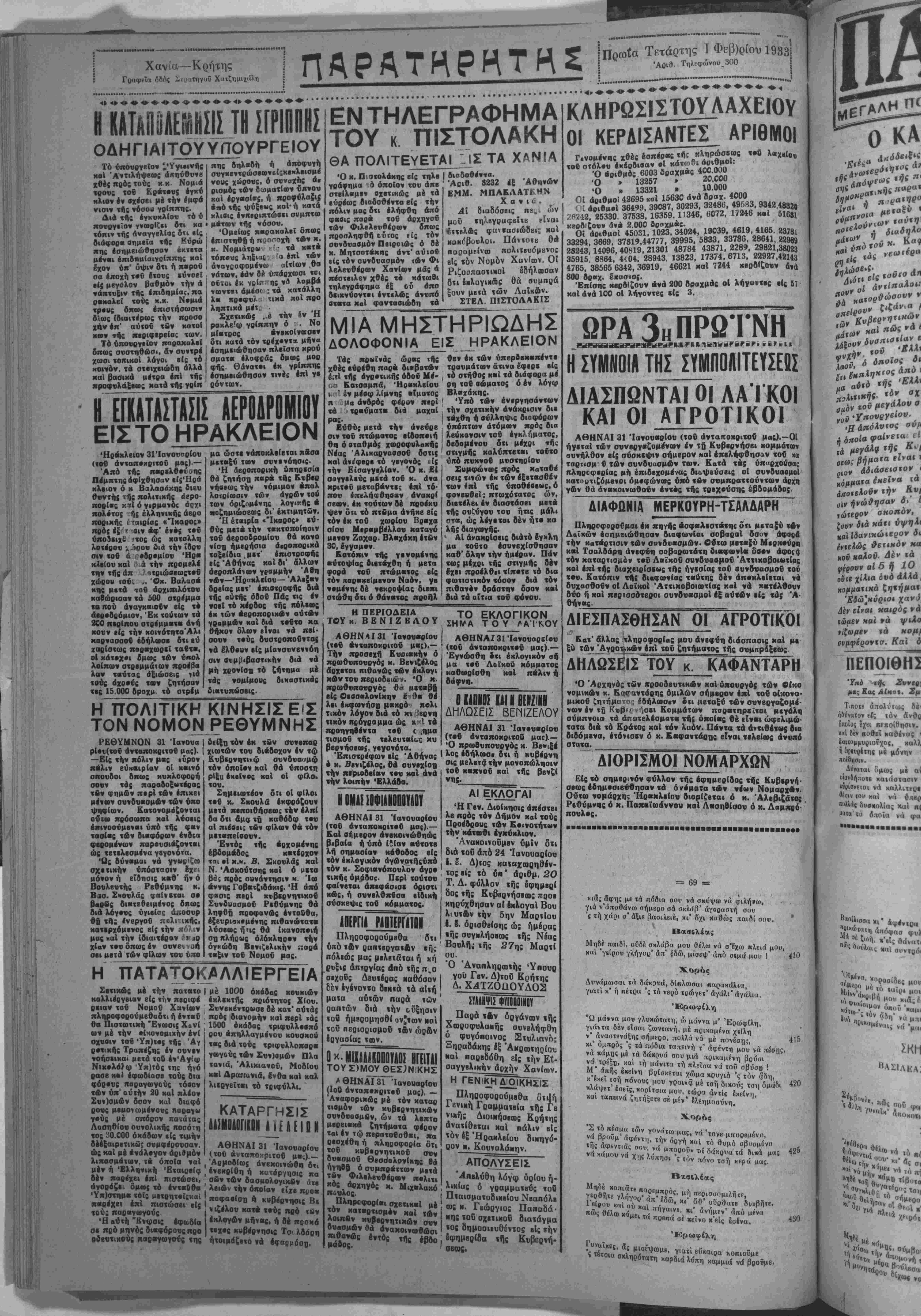 πρωθυπουργός θ<« μεταβή βίς θεσσαλονίκην έ θα θε λβι έκφωνήση μαχρό πολι τιχόν λόγον διά «ό ηλ 5βρνη «ικόν πβόγραμμα ώς χ Ι τα προηγηθέν«α «·β ι ,ημα «ισμού «ής «βλβυταίι,ς κυ ββονήσβω;, γβγονότα. 'Επιστρέφων είς Αθήνας Ι • κ. Βενιζέλος, θά συνεχίση «ήν περιοδβίαν «αν καί άνά «ήν λοιπήν 'Ελλάδα. ΒΟΜΛΠΟΦΙΛΜΟΠΟΥΛθί ΑΘΗΝΑΙ 31 Ίανοναρίον (τού ανταποκριτήν μας).— Καί σήμερον άνβχοινώθηώς βεβαία ή υπό ίίίαν «ύ«ο«β λή σημασίαν καθοδος βίς «όν έκλογιχόν άγώνατήςύπό «όν κ. Σοφΐανόπονλον άγο· «ικής ομάδος. Περί τούτον φαίνβται απεφάσισε όριστι κώς, ή σννβλθπ€σα ΐίδική σύσχβψις τού κόμμα«ος. ΑΠΕΡΓΙΑ ΡΑΠΪΕΡΓΑϊΙ Ηληθθφοοούμβθα δτι υπό των ραπτβργατ&ν «ής ηόλιώς μας μελβιάται ή κή ρυξΐί απ«ογ(ας άΉό «ής π^ο σεχοθς Δβυιέρας καθόσον δέν εγίνοντο δβΝΐά «ά αΐιή μαΐα αυτών παοά «ών' ραπτών διά «ήν ϋΰξησιν «ου ήμβρομησθί υν^των Μοί «ου πεοιορισμοΰ «Αν ώρ,&ν <θγαοίας «ών. Ο χ ΗΙΧΙΑ4Ι000ΥΑ0ΙΗΓΕΙΤΑΙ ΤΟΥΣ)ΜΟΥ0ΕΣ(Ν|ΚΗΣ ΑΘΗΝΑΙ 31 ΊανουαοΙον (Ιοδ άνταποχριτοΰ μας), — Αναφορικώς μέ «όν καταρ «ιβμόν των κυβιρνητικών οννδνοομβν, ών «ά λιπτο μβρβιαχά ζητήματα φέρον «αι έν τφ πβρατοβοθβι, πά Ρβοχέθηή πληροφορία δτι «οβ κυβερνητικόν σν* δνασμοί ΘεσοΌλονίκης 8ά ήγηβί όσνμπραττων μΒτά Τ5* ίίλ·λ«««έρων πολιτι κός άρχηγός «. Μιχ.λακό πίνλος ΕΚΛΟΓΙΚΟΝ ΤΟΥ πίνλος. | Πληροφορίεΐι σχβ«ικ·1 μέ χον κα««β«ιομ·» καί των λοιπβν κνββονητιχών σνν ΙνΖ0η%*9ϊ βνα»ιοινωθώσι πιθανώς έντός «ής έββο ΤΟ ΣΗΙΥΑ ΑΘΗΝΑΙ 31 ΊανοναοκΕβν (τον άν«αποχρι«οϋ μας)— Εγνώσθη ίτι έκλογικόν σή μ α «ου Λοϊκοδ κόμματος καθωρίσθη καί πβλιν ή δάφνη. ΟΙ10Ν02 Ιϋ Ν ΒΕνΖΙΝΝ ΔΗΛΩΣΕΙ^^ΕΠΙΖΕΛΟΥ ΑβΗΝΑΙ 31 Ιανουάριον (τσΰ άνταποχριτοδ μας).— Ό πρωβυπουργός χ. Ββ«ιξ< λος εδήλωσε δτι ή χνβέρνη σις μελβτ« «ήν μονοπώλησιν τον χαπνοΰ καί «ής βενζί νης. αι εκλογαΓ" Ή Γεν. Διοίκησις άκέσ«βι λβ «ρός «όν Δήμον χαί «ούς Προέδοους «ών _οινο«ή««ν την κάτωθι εγκύκλιον. Ανακοινούμεν υμίν δτι διά «ου άπό 24 Ίανουαρίον Ι· ε. Δ)ΐος χαναχωρηθέν- τος βίς «ό ΰιΓ άριθμ. 20 Τ. Δ. φύλλον «ής δφημερί δος «ής Κνββρνήσιως προ» κηρυχθησαν αί ίπλογαΐ Βου λιυ«Αν «ήν 5ην ΜαρτΙου Ι. 8. όρισθβίοης ώς ημέρας «ής συγιιλήσΒως «ής Νδας Βουλή; «ής 27ης Μαρ«ί ου. Ό Άναηληροοβής Ύβουρ γοϋ Γβν. Δ)«ο0 Κρή«ης Δ. ΧΛΤΖΟΟΟΥΑΟΣ " ΙΤΑϋΊΊΣ ΦϊΙΟΙΟΪϋΟϊ Παρά «Αν δργάνων «ής Αωροφυλαιιής συνελήφθη ο φυγόποινος Βχυλιανός -ηραδάχης ίξ ΆΜρωϊηοίου Ναί παρβδόθη είς «ήν Εΐ- ΒλΐΜήν αρχήν Χάν(-ν. Η ΓΕΝΙΚΗ ΔΙΟΙΚΗΣΙΣ Πληροφορούμβθα δΐι|ή Γενιιιή Γραμμα«βία «ής Γβ ν»ι·ης Διοικήσεως Κρή«ης Λνα«.»βϊαι καΐ πάλιν β(ς «όν έξ ΉραΝλβίου δΐΜηγό- 8ον μ. Κουναλάκην. ΑΠΟΛΥΣΕΙΣ "4ι«λύθη λόγφ δρ(ου ή- λΐΗίας δ γραμματεύς «οβ Πΐαισμα«οΒιιιβίου Νβαπόλε °°δ ". Γεώργιος Παπαδά · κης «ου σχετικόν1 διατάγμα «ος δημοσιιυθένιος είς «ήν βφημβρίΒα «ής Ευβερνή- 08ης, ΚΛΗΡΩ-1Π_Υ-ΛΑΧΕΙ°Υ ΟΙ ΚΕΡΑΙΣΑΝΤΕΣ ΑΡΙΘΜΟΙ Ό Λριθμός 6003δραχμ«ς Ό » 13257 » •Ω » 13321 » 10·000 Οί άοιθαοί 42695 καϊ 15630 βνά βοαχ. 4000 Γ άριθί.1 16499, 39087. 30293, 32486, 49583.9342.4832, ?β242. 25330. 37538. 16359.11348, 6072. 17246 καί 51681 Κ8Ο?&Μ 19039 4619 4165. 23,8ι 33294. 3669. 37819,44777, 39995. 5833. 33786 28641 22989 28243 14096. 40819, 21301 48784 43871. 2289, 29821,38023 35915 8864, 4<04. 28943, 13823, 17374.6713, 22927,42143 4765, 38565 6342, 36919, 46621 καί 7244 κβρβίςονν ά»ά 800 δραχ. έκαστος. .... Έπίσης κβοδΐζουν βνά 200 δραχμάς οί λήγοντες είς 57 καΐ άνά 100 οί λήγοντες είς 3. ΩΡΑ 3η ΠΡΩΊ ΝΪ Η ΣΥΜΝΟΙΑ ΤΗΣ ΣΥΜΠ0ΛΙΤΕΥΣΕ8Ι ΔΙΑΣΠΩΝΤΑΙ 0| ΛΑ'ΓΚΟΙ ΚΑΙ ΟΙ ΑΓΡΟΤΙΚΟΙ ΑΘΗΝΑΙ 31 Ίανουβρίον (τοΰ άνταπακριτοΰ μας).—Οί ήγεταί «ών ουνβργβζομβ'νων έν τή Κυβερνήσει κομμάτων συνήλθον είς ονσκεψιν σήμερον καί έπβλήφθησαν «οβ «α ταρτισμ ν τω
