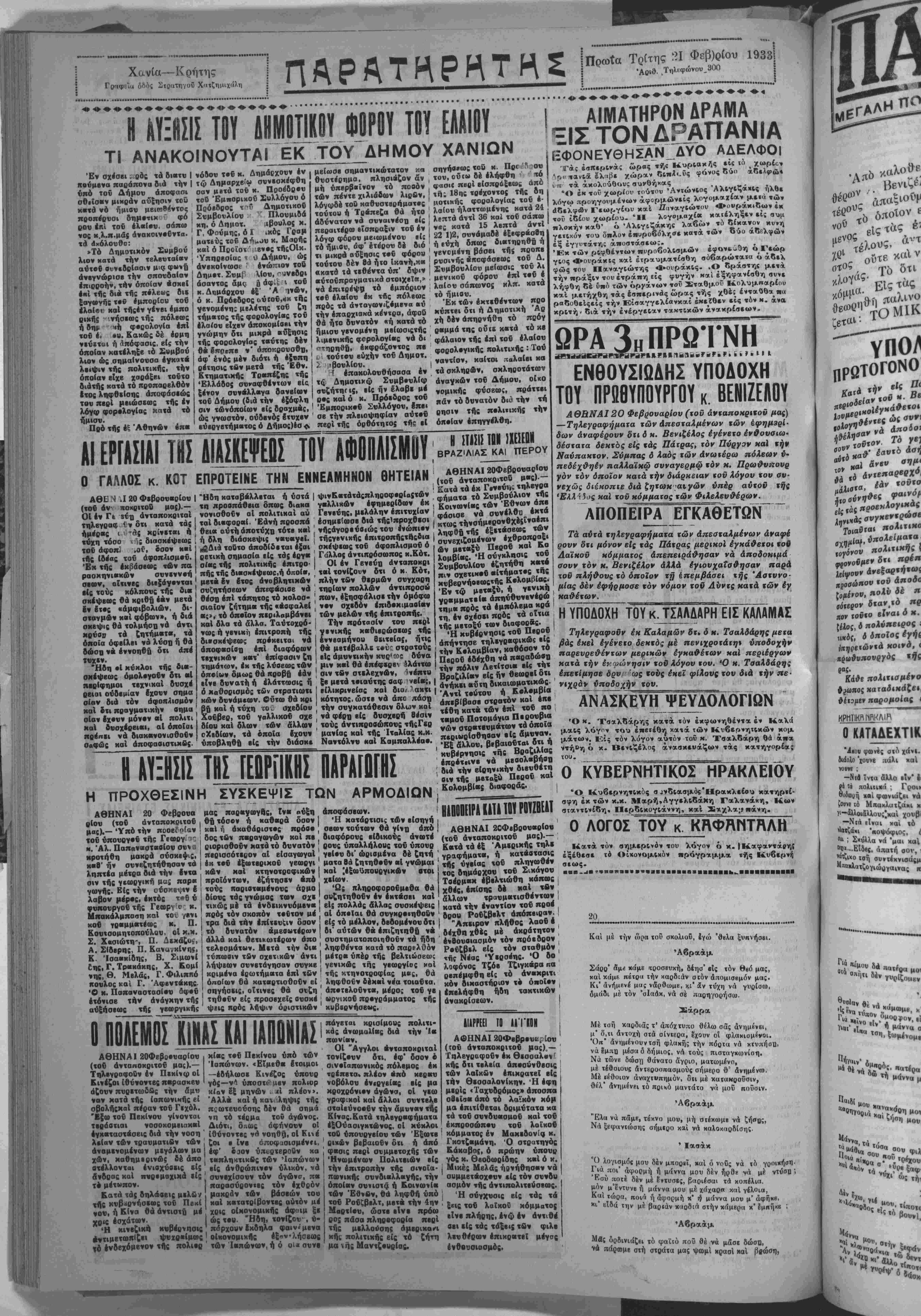 γός—ν<ΐ υποστήμβν πολιορ χίαν έξ μηνών . Α πλέον». Άλλα καί ή χα ληψι; τής πςωτβνούσης δέν θά σημα νη τό τέβμα τού αγώνος. Διότι, δηως άφήνουν οί Ιθύνοντες νά νοηθή, οί Κινέ ζοι ο Ινβ έ-οφασισμένη, έφ' βίον ύπυρτεροΰν κα ταπληκτικβς των Ίαπώνων βίς ανθρώπινον υλικόν, «ά σννβχίσονν τόν άγώνσ, πά παρασύραντες τόν εχθρόν μακράν των βάσβών τού καί χατατρΐβοντες αυτόν μέ χρις οίκονομικής άφαιμ ξΐ ώς τού. "Ηδη, χονίζου , ν- πσρχουν Ικδηλα φαιν·'μενα οίκονομικής έξ^νλήσβως των Ιαπώνων, ή ό οί* συν· πάγβται κρισίμους πολιτι¬ κάς άνωμαλίας διά χήν 'Ια πωνίαν. ΟΙ "Αγγλοι #νχαποκριχαΙ τονίζουν δχι, έφ' δσον ο , σινβϊαπωνιχός πόλβμος έκ τρέπιχα» πλέον άηό κβραν νοβόλον ένιργείας είς μα χροχρόνιον άγώνσ, οί γεω γραφικοί καί άλλοι σννχβλε σταΙεύνο·δν την άμυναν τής ΚΚνας.Κατά τηλβγραφήματα έξθύασιγκτώνος, οί κύκλοι τοδ υπουργείον των Έξωτβ ; ριχνν βεβαιοΰν δτι ή άπό | φ«σις περί συμμετοχής των Ήνωμένων Πολιτβιών είς την επιτροπήν τής σινοϊα- πωνικής συνδιαλλαγής, χήν οποίαν σντΐσχ^ ή Εοινωνία των Έβνβν, Οά ληφθή υπό τοΰ Ροΰζβελτ, μετ· την 4ην ΜαρτΙου, ώστε είνε πρόω ρος πάσα πληρβφορία περί τής μελλούσης άμερικα^ι κης πολιτιχής είς τό ζήτη μα ίίς Μαντζθϋρίας. , 1 ΙΙΙΪΙΙ 101 1ΙΕΙΕΟΙ ΒΡΑΖΙΛΙΑΣ ΚΑΙ ΠΕΡΟΥ ι ___ ι ΑΘΗΝΑΙ 20Φεβρουαρ(ον (τοΰ άνταποκοιτοδ μ·ς)·— • Κατά τα έκ Γ·ν·ύης τηλβγρα φηματα τό Σνμβούλιον τής ; Κοινωνίας των Εθνών άπβ ι αάσισβ νά σννέλθυ έκτα Ι κτως τήνσήμεοονθχέίϊναέπι ληφθή τής έξΐτίσβως των σννβχιζομένων έχθροπροδ· ών μβτβ,ν Πβροΰ καί Εο λομβίας. ·Η σύγκλΐισις τοΰ Σνμβουλίον εζητήθη κ«τ· πιν σχβτικ·ΰ ·1τήματ·ς τής κνββρνήββωςτής ΚολομΡίας. Έν τφ μβτα,ν, ή Υ·νική γοβμματεΐα άπηυθυνβνέρώ τημα πρός τα έμπόλβμα κρά τη, έν βχέσ*ι πρός χά οϊτια τής μβταξύ των βιαφοΰβς. •Η κυβέρνησις τοΰ Περοΰ άηήνχησε τηλΐγρειφικώς είς την ΚολομβΙαν, καθόσον τό Πβροΰ εδέχθη νά παραδώση την πόλιν Λβχίτσιβ ·1ς «ι* Βραζιλίαν είς ήν Οβωο.Ι δχι ανήκη β«τη δικαιωματικώς. Ι ΆντΙ τούτου ή Ε·λ·μβία άπεβίβασβ στρατόν καί έκ· χέθη καχβ των επί τοΰ πό ταμοΰ Ποτομάγια Πβρουρια νών στοβτβνμβτων τα όποία περΐΝρίσθησαν είς άμνναν. , Έξ δλλον, βββαιοΰταΐ δτι ή κνβέρνησις τής Ββ»ΙΑΙος έπρ·τ·ιν· νά μεσολαβήση ,' διά την ειρηνικήν διβυθίτη ' σιν τής μβταξύ Πβροΰ καί Κολομβίβς διαφοράς. ΙΙΟΟΒΙΡΑΙΑΙΑΐΟΐΡΟΒΟΜΙ ΑΘΗΝΑΙ 20Φ«βροναρίον (χοΰ άνχαποχβιτοΰ μας).— Κατά τα έξ Αμβρικής τηλ· γραφήματα, ή χατβατασις τής νγβίας τοΰ πληγωθέν τος δήμαρχον τοΰ Σικάγου Τσέρμακ εβελτιώθη κάπης χθές,έπίσης δέ καί τβν άλλων τρανμβτισθέντων κατά την εναντίον τοΰ προ· δρον Ροΰζββλτ άπόπβιραν. "Απειρον πλήθος λαοΰ έ δεχθή χββς μέ ακράτητον ενθουσιασμόν τόν πρόεδρον Ροϋζβιλ είς τόν σταθμόν «ή; Νέας Ύιρσέης. Ό δο λοφόνος Τζόβ Τζιγκβρα πά ρβπέμφθηβΐς χό άνακριτι κόν δικαστήριον τ· οποίον επβλήφθη ήδη τακτικών άναχρίσεων. ΔΙΑΡΡΕΕΙ ΪΟ ΑΑΓίΟΚ ΑΦΗΝΑΙ 20Φββρ·υι,ι Ιου (τοΰ άνταποκριτοΰ μας),— Τηλβγροφοΰν έκ Θεσσαλονί χής δτι τβλβία άπσούνθβσις των λαΐχών έκικρατβί βίς την Θεσσαλονίκην. Ή έφη μερίς «Ταχυδρόμος» άποσπα σθιΐσα άπό τό λαϊκόν κόμ μα έπιτίθεται δριμύτατα κα τα τοΰ σννδυασμοϋ καί τοΰ έχπροσώπου τοΰ λαΐκοΰ χόμματος έν Μακβδονία κ. Γκοτζαμάνη. Ό στρατηγός Εάκαβος. ό πρώην υπουρ γός κ. Θβοδωρίδης καί δ χ. Μιχβς Μελάς ήανήθησαν νά αυμμβτβσχβυν είς τόν σννδυ ασμόν τής άντιπολιτβύσβως. Ή σύγχνσις βίς τάς τα ξεις τοΰ λαϊκόν κόμματος •Ινβ πλήρης, ένφ έν άντιθέ σ·ι είς τάς τάξεις τβν φιλβ λευθέρων έπικρατβΐ μέγσς ένθονσι