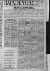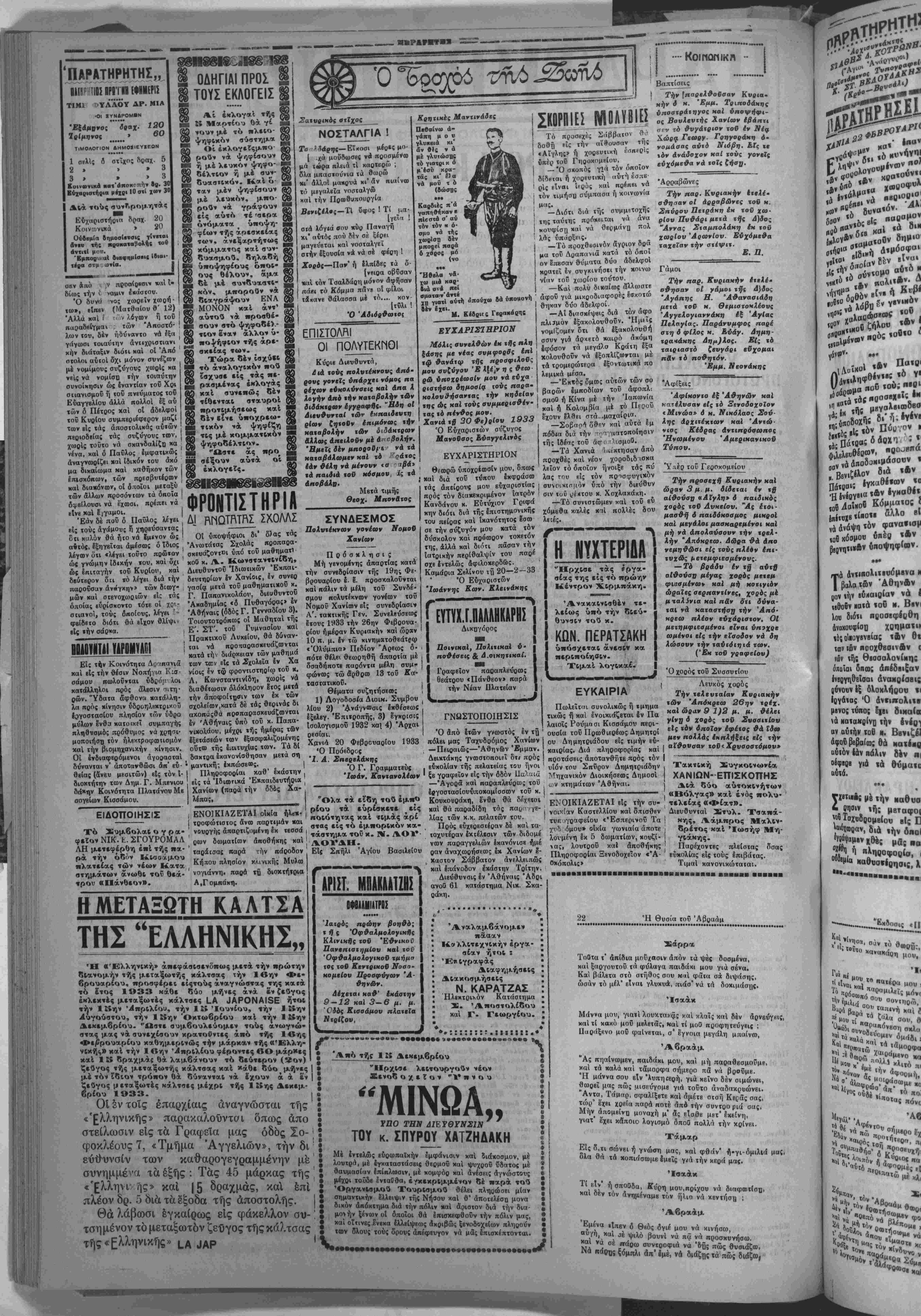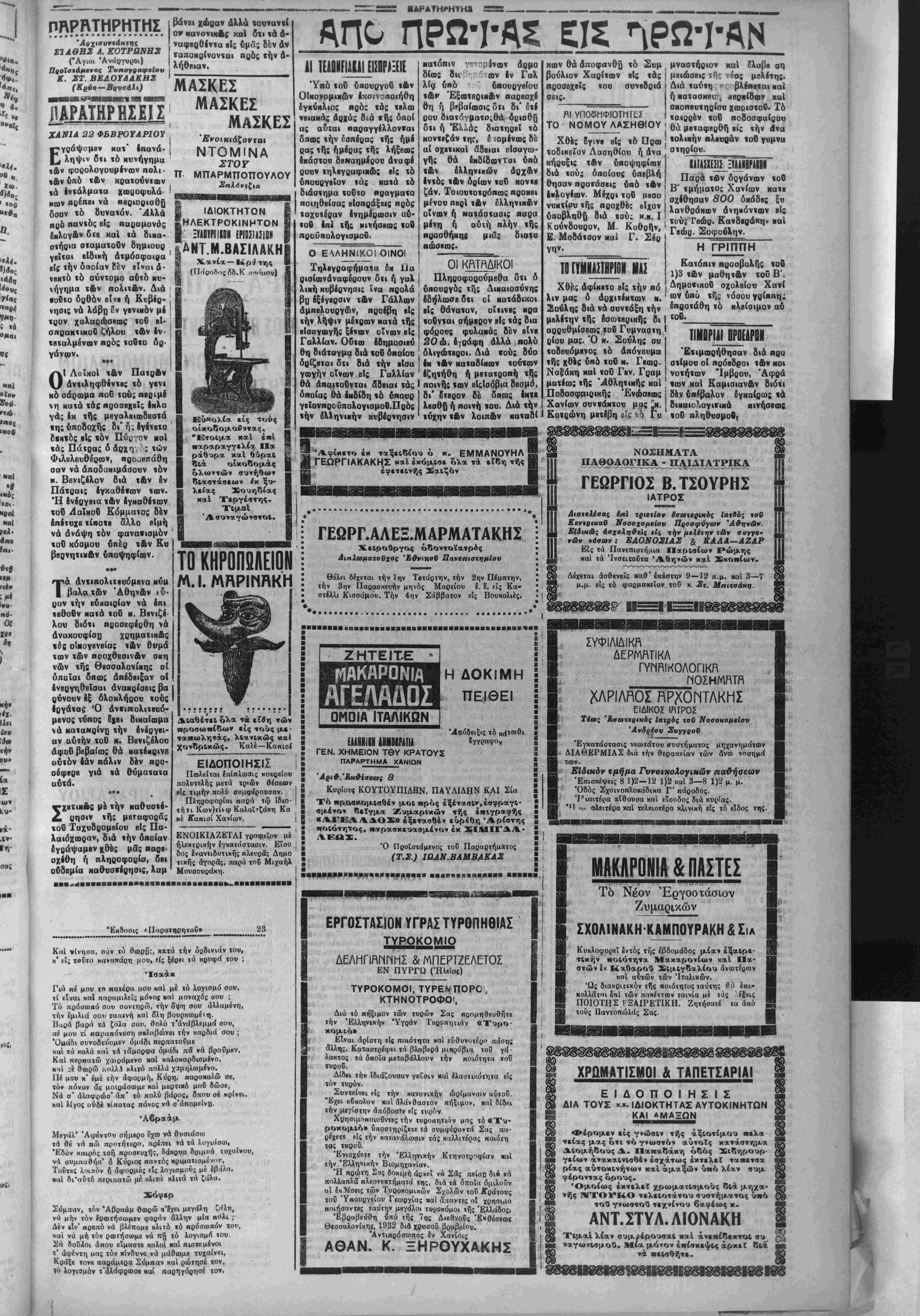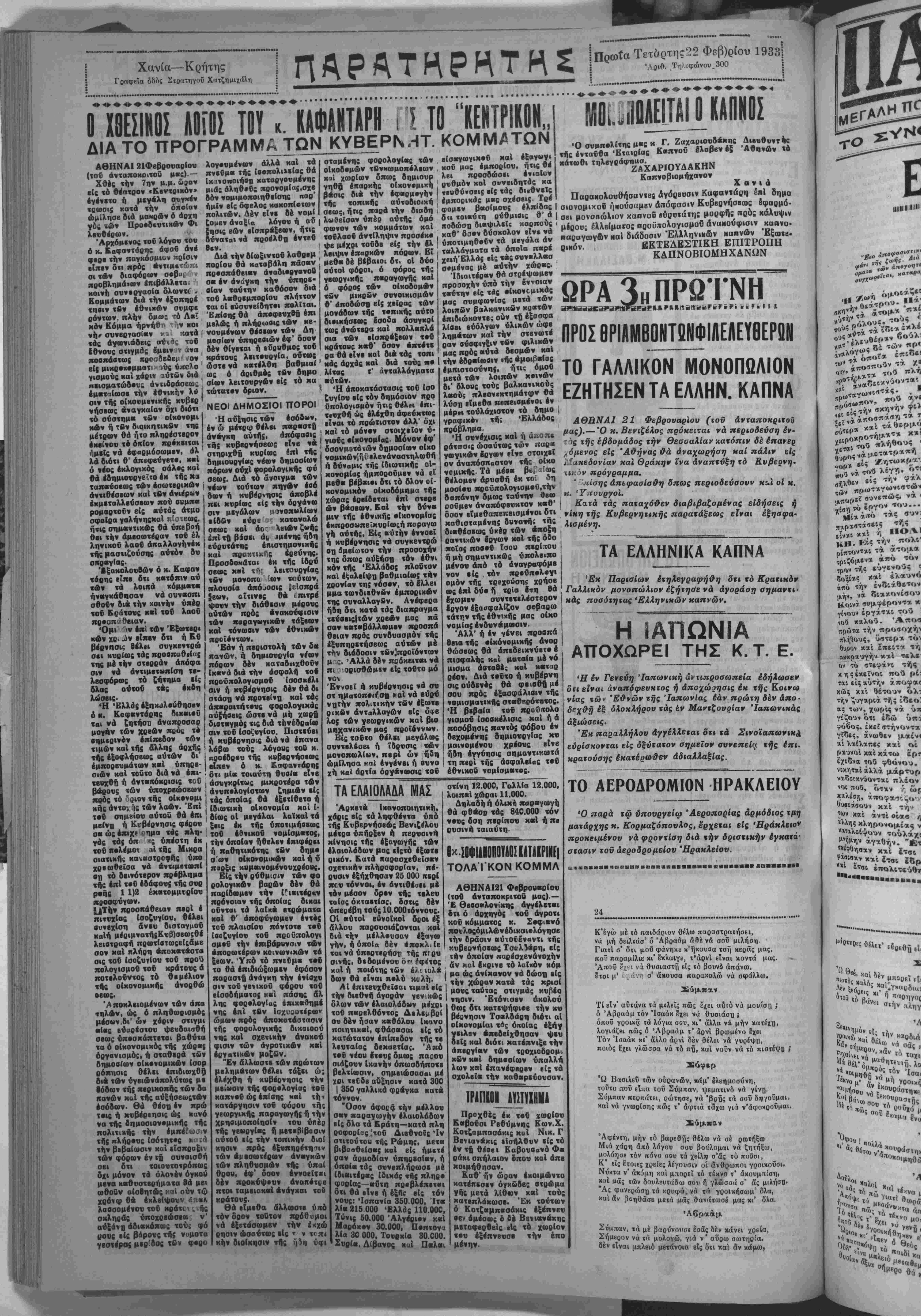 σι>ής( δεδομένου δ<· ίφίτος καί ή ποιότης των έλι ιολ« δών θά είναι πολύ «ολή. ΑΙ έπιτβυχθιϊσαι τιμαί βίς την διβθνή αγοράν γεν κώς δλων των έλαιολάδων μέχρι τοδ παοελθόντος Δβλεμβρί ου δέν ήσαν χαθόλου ίχανο ηοιητιχαί, φθάσασαι είς τό κατώτατον επίπεδον τής τε λενταίας δβΜαετία;. Άπό τοΰ νέον έτους δμως παοου σιβζουν Ικανήν δπωσδήποτε βελτίωσιν, σημειώσασαι μέ χρι τεΰδβ αύξησιν κατά 300 | 350 γαλλιχά φράγκα κατβ τόννον. Όσον άφοο$ την μέλλου σαν παραγωγήν έλαιολάδων βίς δλα τα Κράτη—κατά πλη ροφοοίσς |τοβ Διββνοΰς Ίν οτιτούτοΗ τής Ρώμης, μετα βιβασθβίσας καί είς ήμετέ ραν αρμοδία* υπηρεσίαν, ή όποία τάς σννβπλήρωσε μέ Ιδιαιτέρας Ιδικάς τής πληρ· φορίας—αυτή προβλέπβται δτι θά εΐνβ ή εξής βίς τόν νους: Ισπανία 350.000, Ίτ« λία 215.000 Ελλάς 110.000, Τύνις 50.000 'Αλγέριον κ«1 Μαρόχβν 30.000, Πβπτογα λία 30 000, ΤουβκΕα 30.000. Συρία, Λίβανος καί Π«λ«ι στίνη 12.000, Γαλλία 12.000. λοιπαί χώραι 11.000. Δηλαδή ή όλιχίι παραγωγή θά φθ«σπ τάς 840.000 τόν νσυς δση πιρίπου καί ή πι ρυσινή τοιαύτη. Οχ.ΣΟΦΙΔΝΟΟΟΥΑΟΣΚΑΤΑΚΡΙΝίΐ ΤΟΛΑΙΚΟΝΚΟΜΜΛ ΑΘΗΝΑ 121 Φββρου«οίου (τοδ άνταποχριτοδ μας).— Έ Θεασ«λονίκης αγγέλεται ότι ό άρχηγός τοδ άγροτι κου κόμματος κ. Σ·φι«νό πονλοςόμιλώνέδιχαιολόγησε την δράσιν αύτοδΐναντι τής χυβεονήσΐως Τσολϊάρη, είς την οποίαν παρέσχενάνοχήν δν χαΐ έκρινβ τό λαϊκόν κόμ μα ώς ανίκανον νά δώση β16 την χώραν κατά τάς κρισί μους ταύτας στιγμάς κυβέο νησιν. Ετόνισεν άκολού θως δτι κατεψήφιοβ την χυ βέονησιν Τσαλδάρη διότι αί οίκονομίαι τας οποίας έξη γ γειλβν βπβδείχθησαν ψΐυ δεΐς καί διότι κατέπνιξε την απεργίαν των τροχιοδρομι κβν χαί δημοσίων ύπαλλή λων καί έπανέφερεν ΐίς τα σχολβ!· την χαθβρΐύουσαν. ΙΡΙΠ10Ι ΙΙΠΙΙΝΙΙί Προχθκς έκ τοδ χωρίου Καβοΰσι Ρεθύμνης Κων.Χ. Κοτζαμπασάκις καί Νικ. Γ Βεηανακις ιίσήλθυν είς «ό έν τ& θέσβι Καβουβανό Φα ράχι σπήλαιον ίπου καί άπε χοιμήθησαν. Καθ* ήν ώραν εκοιμώντο κατέπεσεν όγκϋδες στρώμα Υής μετά λίθεον χαί τοΰς χατεπλάκωσε. Έκ τούτων ό Κοτζαμπισάχις έξέπνευ ο εν άμέσως ό δέ Βενιανάκης μεταφερθείς είς τό χωρίον τού έξέπνβυσι την έπο μίνην. κ Γ. Ζαχαρ.ουδβκης Διβυθυντ4ς Κ.πνοδ «λαβεν έ, Αθηνών ,ό 7χΑρ,0ΥΔ Καπνοβιομήχανον Χανιά Παοα-ολουθήσανΐΒς ΛγόρΒυσιν Καφαντάρη έηί δημο σιονομικοδ ή-ούσαμεν απόφασιν Κυβερνήσεως 6φαΟμό- σβι μονοπώΧΐον καπνοθ βΰρυτάτης μορφίίς: πρός κάλυψιν μίπου; έλλβίματος π0ούηολογισμο0 άναιιουφισιν καβνο 1 '^^ ΚΤ Κ4ΠΝΟΒΙΟΜΗΧΑΝΩΝ Μ Κ ΠΡΟΣ ΒΡΙΑΜΒΟΝΤΩΝΦΙΛΕΛΕΥΒΕΡΟΗ ΤΟ ΓΑΛΛΙΚΟΝ ΜΟΝΟΠΟΛΙΟΝ ΕΖΗΤΗΣΕΝ ΤΑ ΕΛΛΗΝ. ΚΑΠΝΑ ΑΘΗΝΑΙ 21 Φεβρουάριον (ιοΰ άνταπσκρινον μας(.— Ό κ. ΒενιζέΧος πρόχειται νά περιοδεύση εν. - )ς τής εβδομάδος την Θεσσαλίαν κατόπιν δέ έαανερ /όμενος είς Ά&ήνας&ά αναχωρήση καί πάλιν είς ϊΐαχεδονίαν χαί Θράκην ίνα αναπτύξη τό Κυβεονη, τι>:3ν πρόγραμμα.