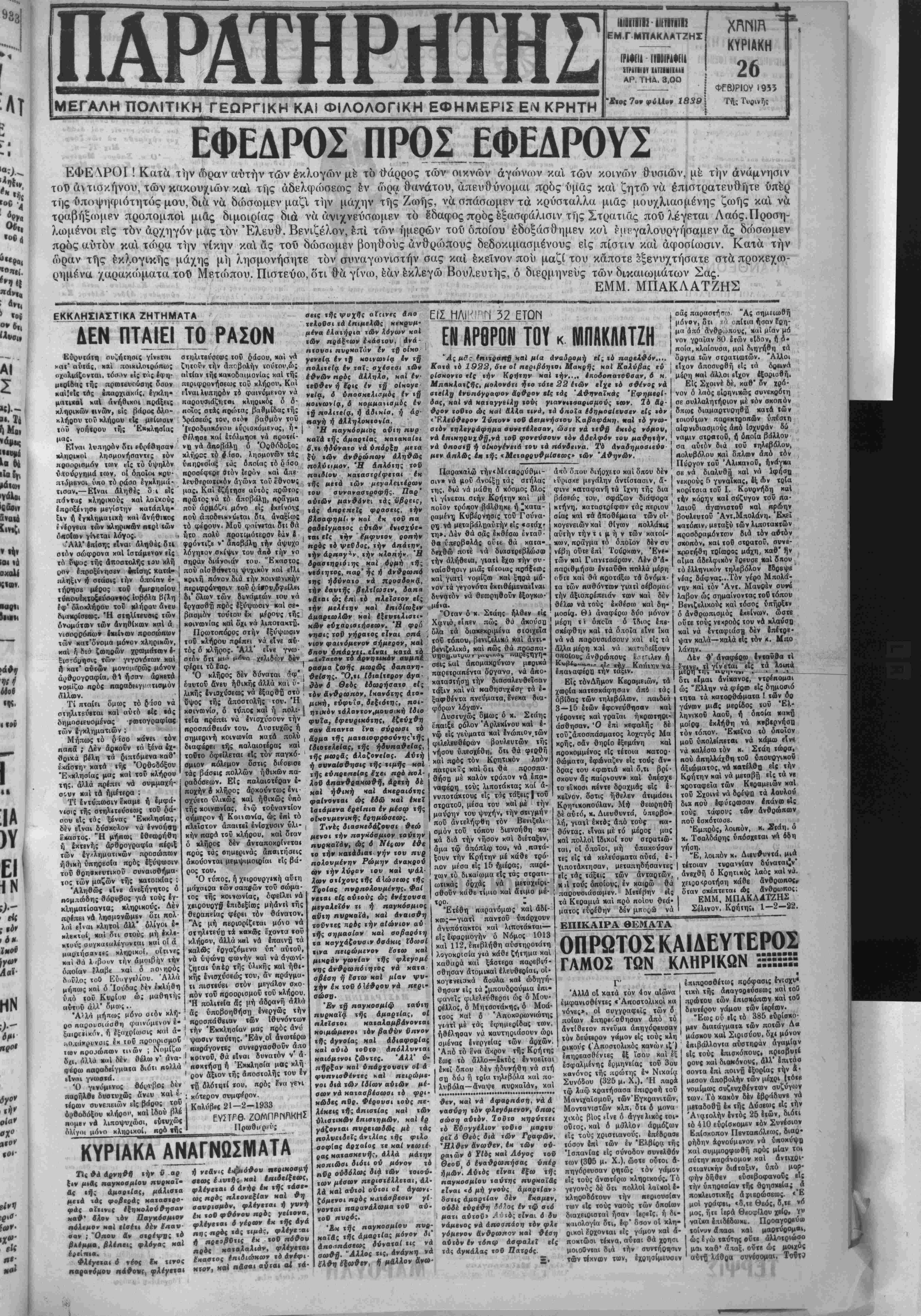 ρημ-τ.να /αρακώματα τοΰ Μετώπου. Πιστεύω, δτι θά γίνω, εάν έκλεγώ Βουλευτής, ό διερμηνεϋς των δικαιωμάτων Σας. '°^'