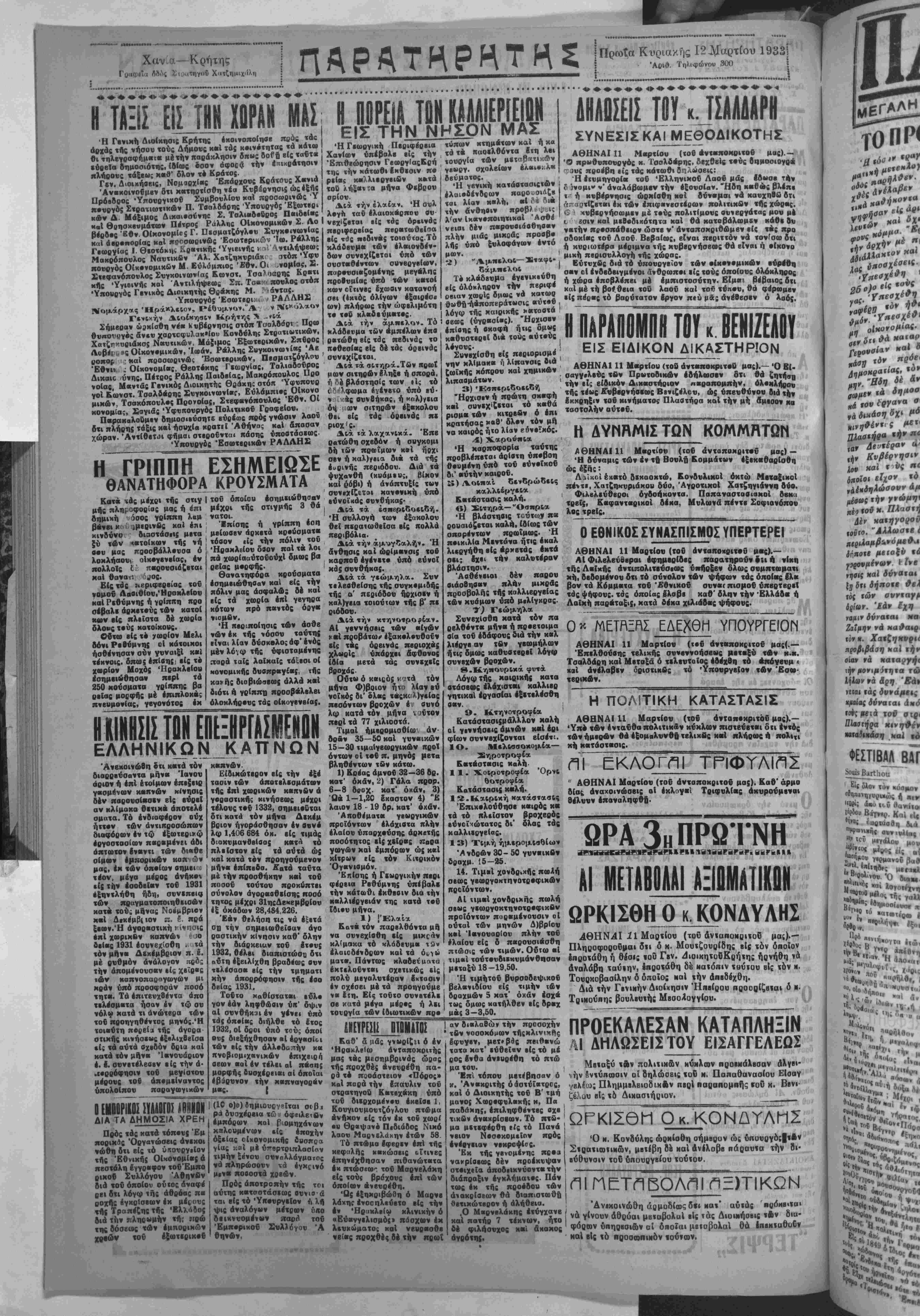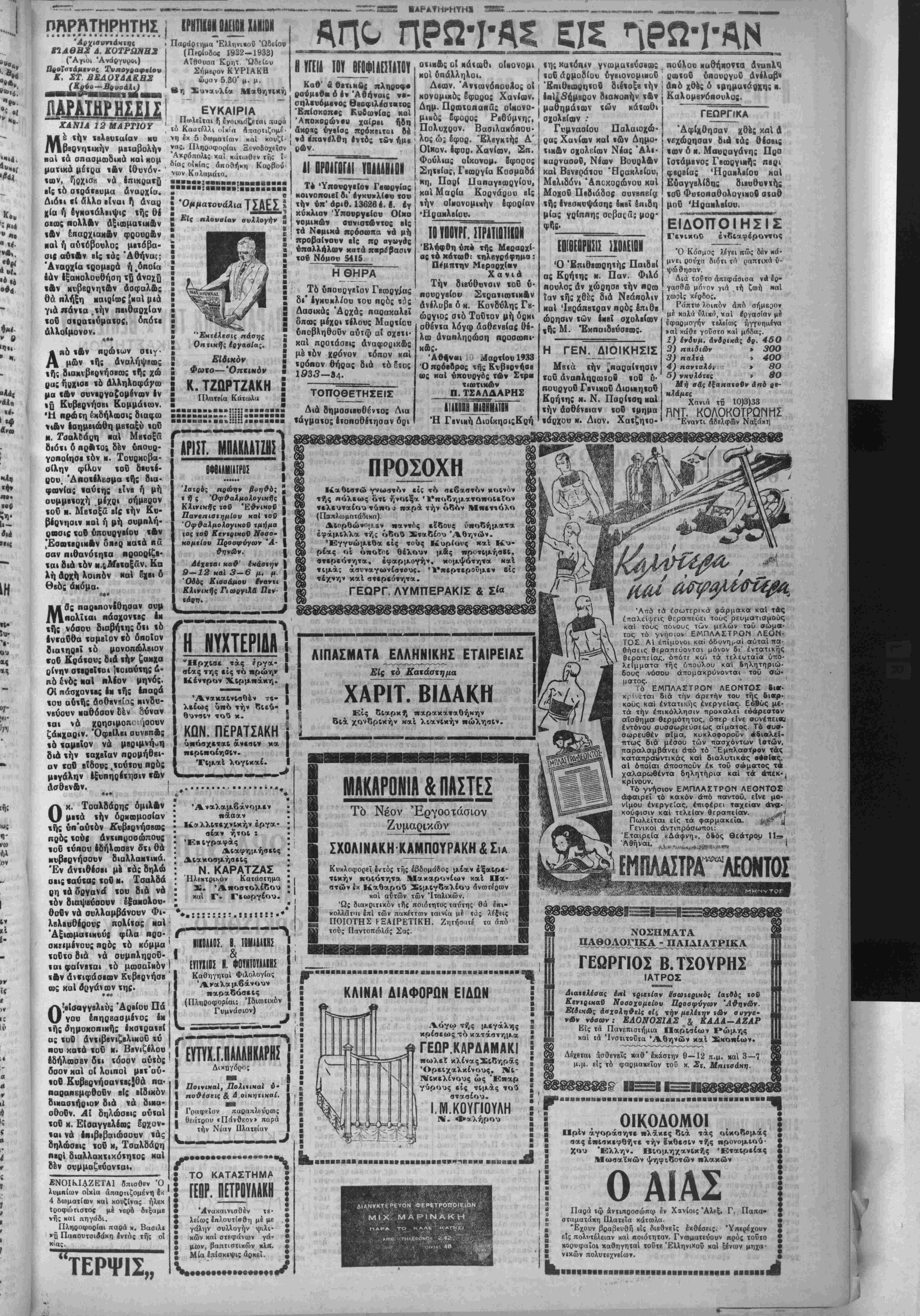 Τσαλδάρη καί Μετάξια ό τελεντοίος εδέχθη «ό βπόγβνμ < χαί άνέλαβεν δριστιχβς τό Ύπονργβϊον τΔν Έσω- τβρικΑν. Η ΠΟΛΙΤ^ΚΙ-^ΚΑΤΑΣΤΑΣΙΣ ΑΘΗΝΑΙ 11 Μαρτίον (τοδ άνταποκριτοΰ μας).— •Υπο «Αν ένταΰθα πολιτικόν κύκλων πιστεύβτβι διι έντός «Αν ήμβρών θά έξομαλννθβ τβλικβς χαΐ πλήρως π πολιτι χή κατάστβσις. Υ εκλογπι ' ΑΘΗΝΑΙ Μαρτίον (τοθ άνταποκριτοΰ μας). Καθ* άρμο βίας άναχοινώσβις οί εκλογαί Τριφνλίας άχυρούμεναι θέλννν επαναληφθή. ΩΡΑ 3η ΠΡΩΊ ΝΗ ΜΙΗ,«βΕΒ?(«»Ιε»Β«»«»Ι11ΒΜΒΒ?βΡέίΡϊ ΕΕΨΛΙ* ΑΙ ΜΕΤΑΗΙΛΛΙ ΑΞΙΩΜΑΤΙΚΩΝ ΩΡΚΙΣΘΗ Ο κ. ΚΟΝΑΥΛΗΣ ΛΘΗΝΛΙ 11 Μάρτιον (τοΰ ανΐαποιιηιτοδ μας).— Πληροφοροΰμαι διι ό κ. Μουϊζουρίδης βΙ( τόν οποίον έπροϊάθη ή θέσις ΐοΟ Γεν. ΔιοιχητοθΚρήΐης ηρνήθη νά αναλάβη ταύιην, επρονάθη δέ κατόπιν τούτου βΐς τδν ν. Τουρκοβασίλην δ οποίος Ναί την απεδέχθη. Διά «ήν Γενικήν Διοίκησιν Ηπείρου προορίζβιαι δ Ν· ΤρΐΜούηης βουλιυνής Μβσολογγίου. ΠΡΟΕΚΑΛΕΣΑΝ ΚΑΤΑΠΛΗΞΙΝ ΔΗΛΩΣΕΙΣ ΤΟΥ ΕΙΣΑΓΓΕΛΕΩΣ Μβιαξύ «Αν πολιτικών κύκλων προεκάλεσαν αλγβ·- νήν Εντύπωσιν οί δηλώσ&ις «οθ η. Παπαθανασίου ΕΙσαγ νβλίω; ΠλημμβλειοδικΛν πβρί παραπομπής ϊοϋ κ. Ββνι ζέΐ.ου βΐς «ό -ΐκασιήριον. ______ ΩΓΚΙΣ6Μ Οκ.ΚΟΝΔΤΛτΐΣ Ό ν. Κονδύλης ώοκίσθη οήμβρον ώς ύπουογός|»*ν ΣτρατιαοιΐΜών, μβτίβη 08 καΐ άνίλαββ πάςαυτα την δι* βύθυνσιν «οθ ύπουργβίου τούιου. (II ΠΕΤγΊΒΟΛΠΙ ηΞ)ΤΙΚΩΝ Ανεκοινώθη άρμοδ(σ>ςδ«ι κατ' αύΐάς πρΟΜβ««αι