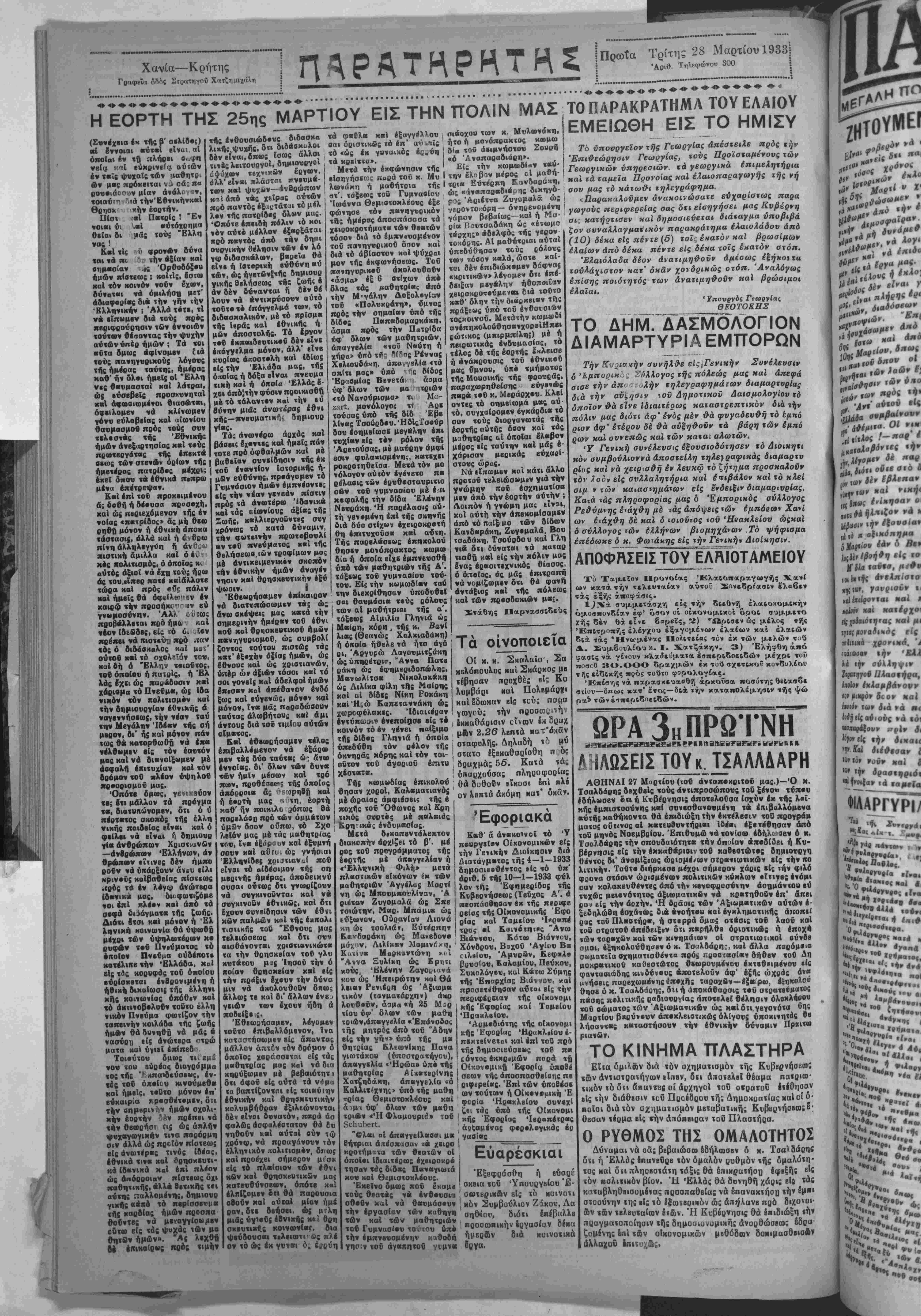 ών ε<άχθη δέ χαϊ δ τοιούτος τού Ήοακλείου ώςκαΐ ό σύλλογος των έλλήνων βισμηχάνων .Τό ψήφιομα επέδωκε δ κ. Φωχάπης είς την Γενικήν Διοίκησιν. ΑΠΟΦΤΐΣΈΪΣΤΟΥ ΕΛγΑΙΟΤΑΜΕΙΟΥ Τό Ταμείον Προνοίας Έλαιοπαραγωγής Χανί ών κατά την τελευταίαν αυτού Συνεδρίασιν έλαβεν τάς εξής απόφασις. 1(Νά συμμετάσχη είς την δΐεθνή έλαΐοκομικήν ομοσπονδίαν έφ' όσον οί οικονομικόν όροι συμμετο Ζής δέν θά είνε βαρείς, 2) "Ωρισεν ώς μέλος τής Έπΐτροπής έλέγχου έξαγομένων έλαιων καί ελαιών διά τάς "Ηνωμένας Πολιτείας τόν έκ των μελών τού Δ. Συμβουλίου κ. Ι. Χατζάκην. 3) Ελήφθη άπό φασΐς νά γίνουν κλαδεύματα έσπεριδοειδών μέχρι τοΰ -οαοΰ 30.000 δραχμών έκ τοΰ σχετικόν κονδυλίου τ^ς είδικής πρός τούτο φορολογίας. Έπίσης νά παραβκευασθή άρκοΰσα ποσότης θειασβε στίου—όπως κατ' έτος—διά την καταπολέμησιν τής ψώ & των έσπεριδοειδών. ^ΙΛΟΣΕΙΣΤΟΥκ.ΤΣΑΛΛΑΑΡΗ ΑΘΗΝΑΙ 27 Μαρτίου (τού άνταπβκριτοΰ μας.)—Ό Κ. Τσαλδάρης δβχθβίς τούς άντιπροσώπους τοδ ξένον «ύπβυ εδήλωσεν ότι ή Κυβέρνησις άποτβλοϋσα Ισχύν έκ «ής λσϊ- κής έμπισ«οσύνης καί συνβσθανονμένη «ά έηιβαλλόμβνα αυτής καθήκοντα θά επιδιώξη την έκτέλβαιν τοϋ προγράμ ματος ούτινος αί κατευβυντήριαι ιδέαι έξ ετέθησαν άπό τοϋ μηνός Νοεμβριού. 'Επιθυμώ νά τονίσω έδήλ^υεν δ κ. Τσαλδκρης την σπουδαιότητα «ήν οποίαν «ποδίδβι ή Κυ¬ βέρνησις Είς «ήν εκκαθάρισιν τοΰ καθβστώτβς δημιουργή θέντος. δι' άναμίξιως ώβΐσμέ/ων στρατιωτικών είς την πό λιτικήν. Τουτο διήρκεσε μέχρι σήμερον χάρις είς την φιλό φοονα στάσιν ώοισμένων πολιτιχών κύκλων οΐτινες ένόμι σαν κολακβνθέντβς άπό την κενοφροσύνην ασημάντου ·ύ «νχώς μβιβνότητος άξιωματικδν νά χρατηθοβν έπ' άπβι ρον είς την άοχήν. Ή δράσις των Αξιωματικών αυτών ε¬ ξεδηλώθη εσχάτως διά «νοήτβυ και έγκληματικής άίΐοπεί ρας τοδ Πλαοτήρκ, ή στερρά δμως στάσις «ου λαοΰ καί «οδ οτρατοΰ απέδειξεν δτι παρήλθβ οριστικώς ή έποχΑ των ταρβχών καί «ών κινημάτων οί στρατιωΐικοί αύνδε σμοι, εξηκολούθησεν ό κ. Τσαλδάρης, καί δλλα παρόμοια σωματβΐιΐ οχηματισθέντα πρό^ ΐΐβοοτασίαιν δήθβν τοΰ Δή μοκρκτικον χαθεστώτος θεωρονμένου εκτεθειμένον >·ί