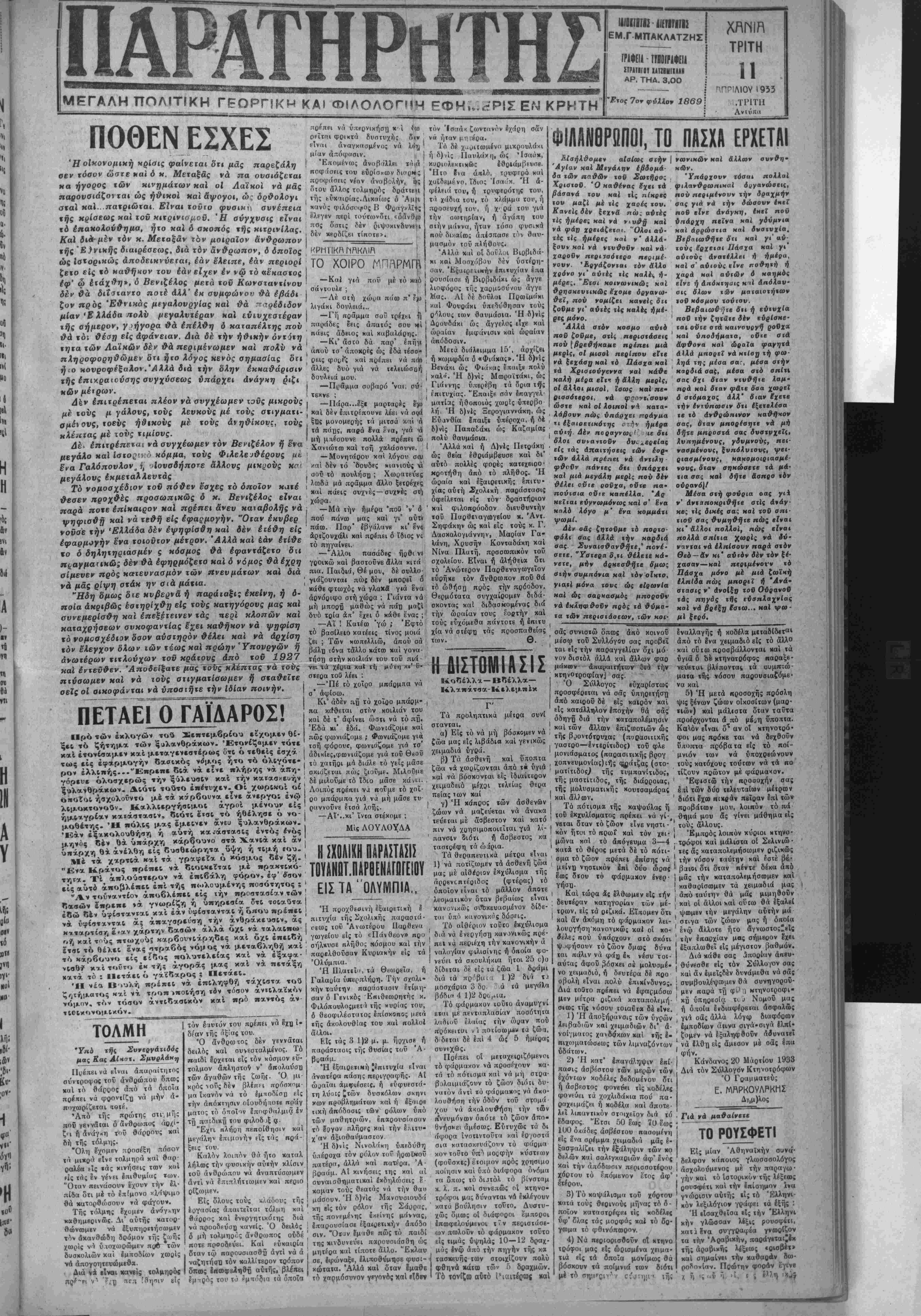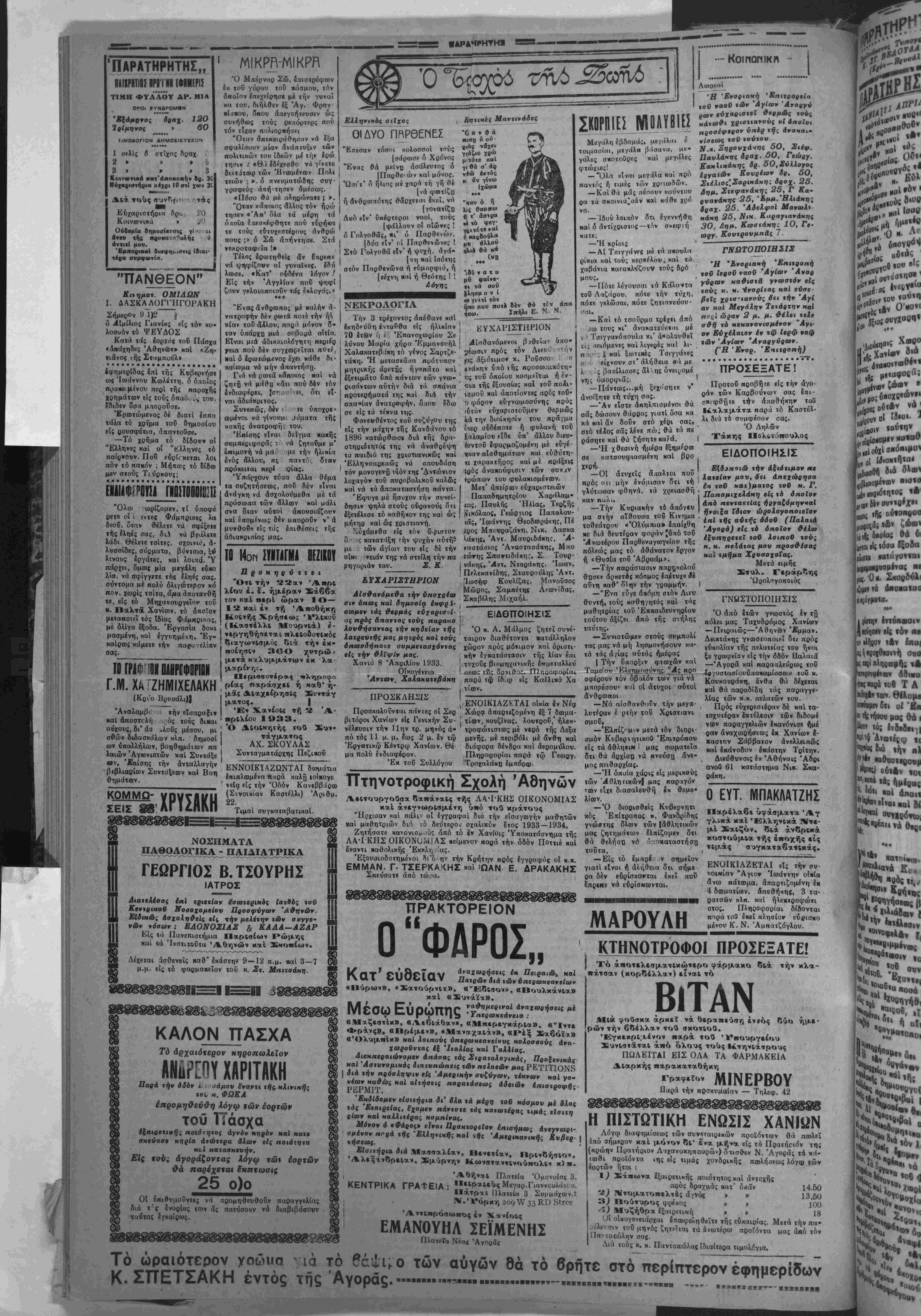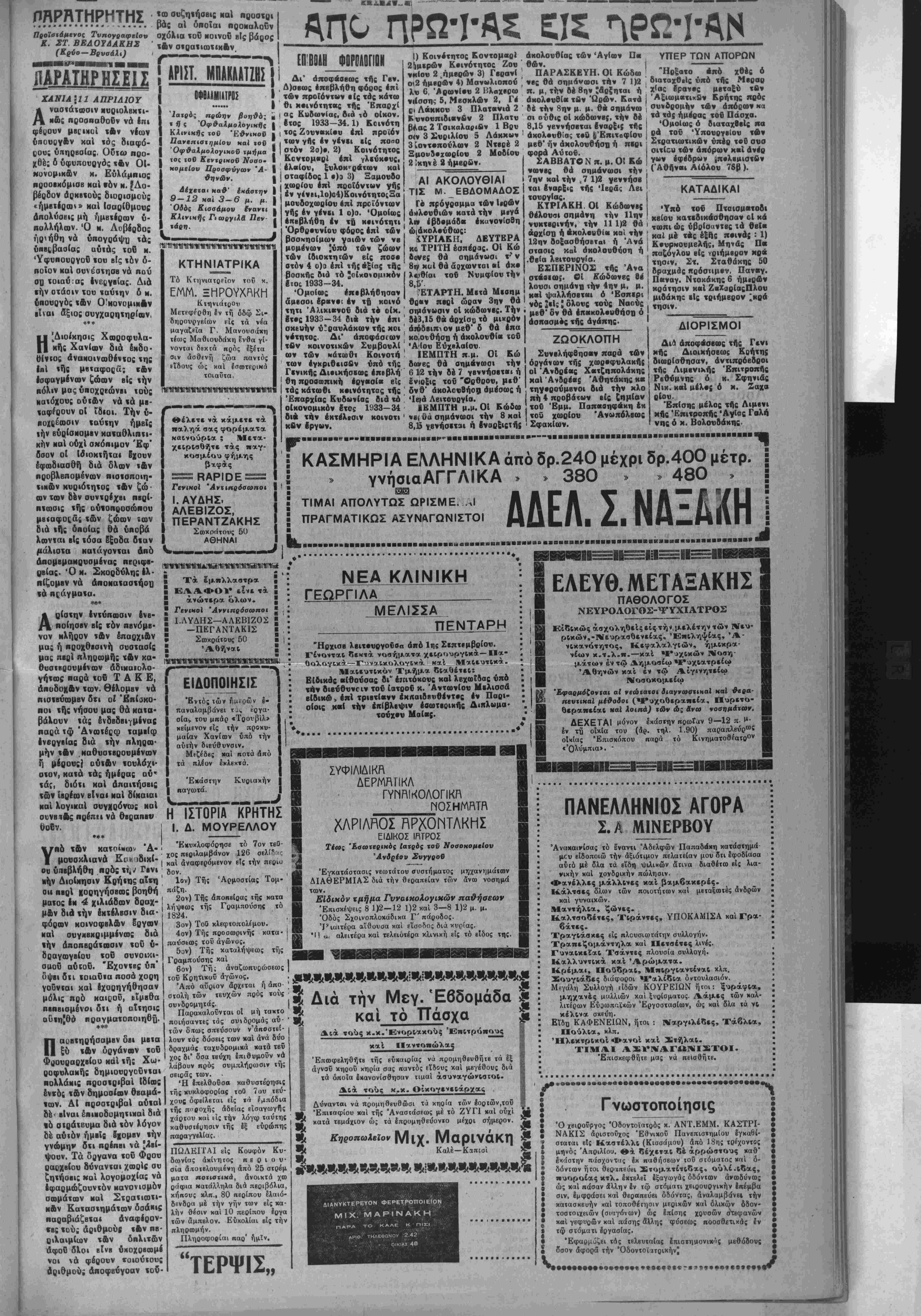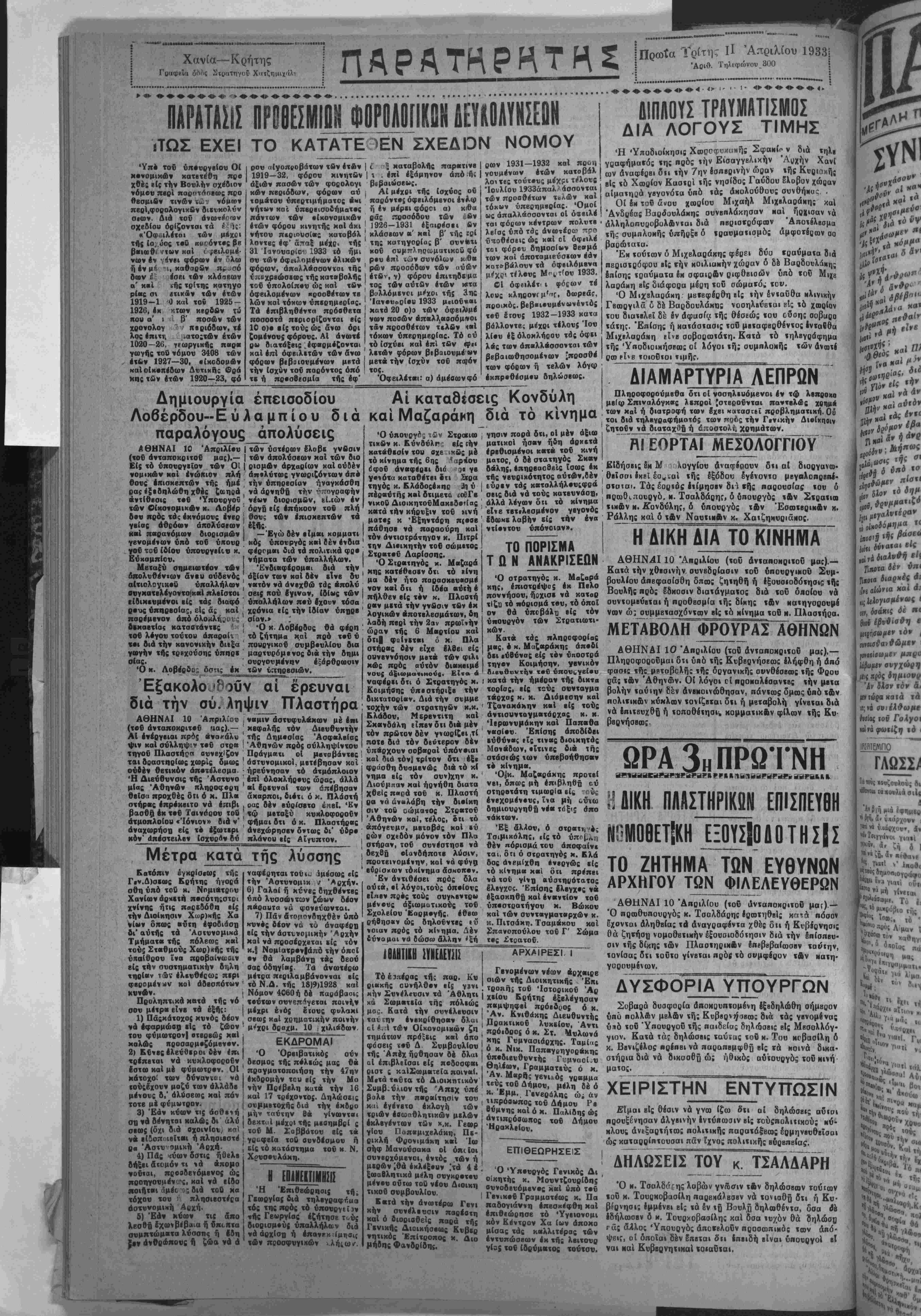 νά αρνηθή ττ>ν -<πογοαφήν νέ«ν διορισμόν, βί.ιών έν όργή ϊίς έπήκοον τοϋ πλή Οους των έπισχβπτων τα έξ«ς. —Έγώ δέν είμβι κομματι κός ύπουργός χαΐ β έν ένδια | φέρρμαι διά τα πολιτικά φρ· νήματα των ύπαλλήλων. Ένδιαφέρομαι διά την αξίαν των καί δέν είνε δν ' νατόν νά άνεχθώ τάς 6πολύ σεις πού έγιναν, (δ(»ς των | ύπαλλήλων πβύ έχουν τόσα χοόνια είς την Ιδίαν ύπη,ρ,Β ' οίαν.» ; Ό κ. Λοβέρδος θά φέρη ' τό ζήτημα καί πρό τοΰ ύ πουργιχοδ συμβουλίου δια μαρτυρόμενος διά την δημι ονργονμένην έξάρθρωσιν τ&ν υπηρεσίαν. αι ερευναι διά την σύλληψιν ΤΤλαστήρα ΑΘΗΝΑΙ 10 Απρίλιον («ου άντα-οκριτοΰ 'ΐας).— ΑΙ ενέργειαι πρός ανακάλυ ψιν καί σύλληψιν τοΰ οτρα τηγοΰ Πλαστήοπ οννεχΐζον ται δοαστηρίως χωρίς δμως ουδέν θβτικόν άποτέλβσμα. Ή Διβύθννσις τής Άστννο μ(ας Αθηνών κληροαορη θεϊσα προχθές δΐι ό μ. Πλα στήρας επρόκειτο νά έ~ιβι βασθό έκ τον Ταινάρον τού ατμοπλοίου «Ίόνιο*» διά ν' αναχωρήση είς «· έξωτερι κόν' απέστειλεν Ισχυράν δύ ναμιν άστνφνλακων μέ επι Μβφαλής νόν Διευθυντήν «ής Δημοσίας Άσφαλβίας Αθηνών πρός σύλληψίντου Πράγματι οί μεταβάντες άστννομικο), μβτιβησαν κοί ήρβύνησαν «ό ατμόπλοιον επί ολοκλήρους ώρας, άλλά αί δρευναΐ των απέβησαν ακαρποι, διότι ό κ. Πλάσ«ή οας δέν ·ύρίσβ«ο έ«βί. Έν Τφ μβταξύ χνκλοφοροΰν φήμαι δτι ό χ. Πλαστήρας ανεχώρησεν όντως δι' ύδρβ κλάνου είς Αίγυπτον. Μέτρα κατά τής λύσσης Κατόπιν έγκρίσεω; τής Γ·ν.Δ)σεως Κρήτης ήγορά οθη υπό τοδ κ. Νομιβτρον Χανίων άρκε.ή π·σό«ηςσ«θι χνίνης ήτις ποθίβόβη β($ την Διοίκησιν Χωρ)κής Χά νίοιν δπως «ΰτη έφοδιάσΐι δι* αυτής τα Άσ«ννομικά Τμήματα τής πόλεως καί «ούς Σταθμούς Χωρ) κης τής ύκαίθρον ίνα προβαίνωοιν είς την συστηματικήν δτ,λη τηρί«ν τ&ΐ έλευθέςως περι φέρομεν ιΐν καί άδβσπότΜν κννών. Προληπτικά κατά τής νό σον μέτρα είνβ «ά εξής: 1) Πάςκάϊθχος κννός δέον νά εφαρμώση είς τό ζώον τον φύμωτρον| οτβοβώς καί καλώς προσαρμοζόμβνβν. 2) Κΰνΐςέλβύθεροι δέν επι «ρέπε«αι νά κνκλοφοροΰν έστω καί μέ φύμω«ρον. ΟΙ κάτοχο' των δύνανται νά ιονςέχονν μαζύ των άλλάηε μέτονς δ,' άλάσεοος καί πάν τοτβ μέ φίμ«τρον. 3) Εάν κύων τις άοθ·>ή