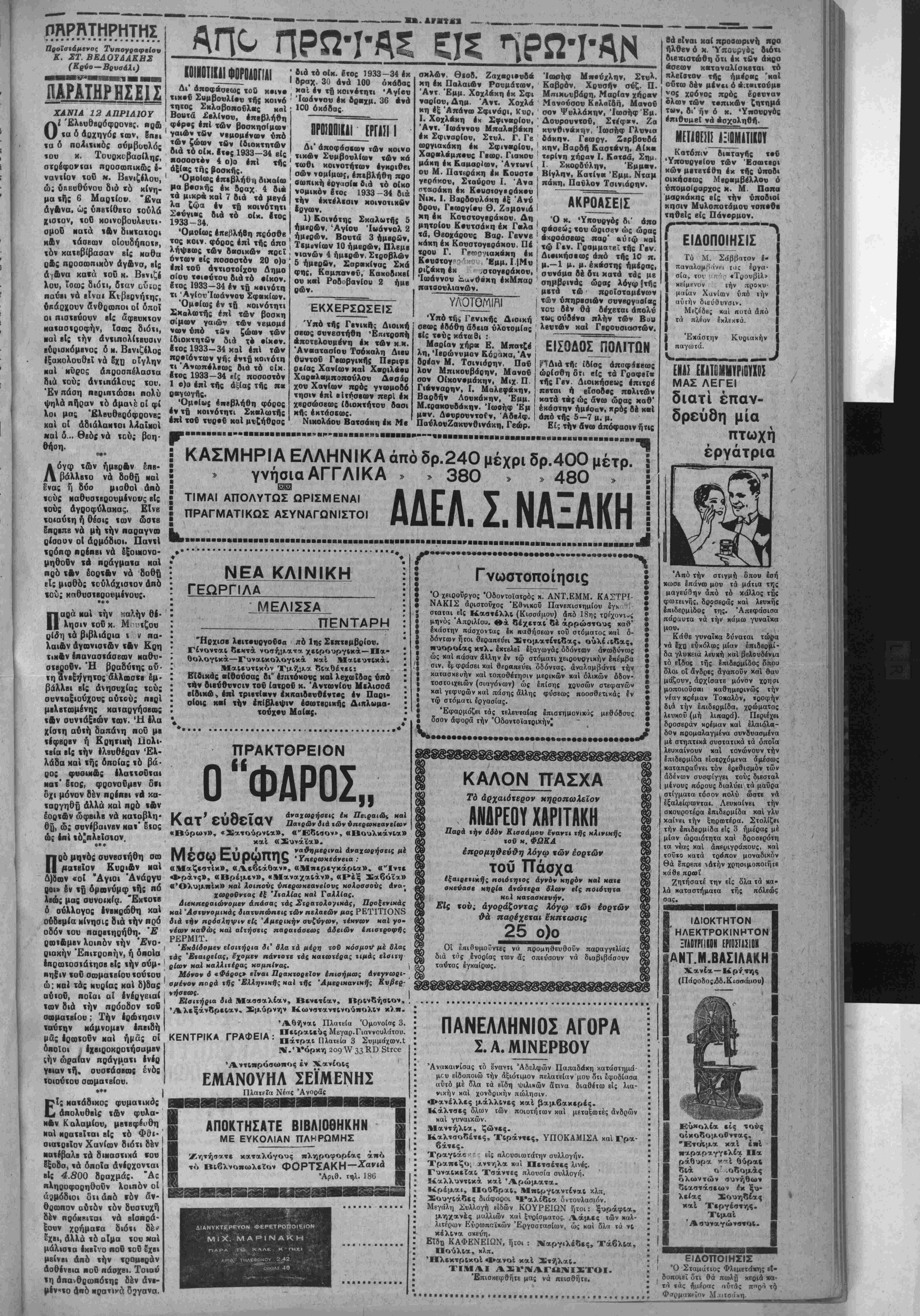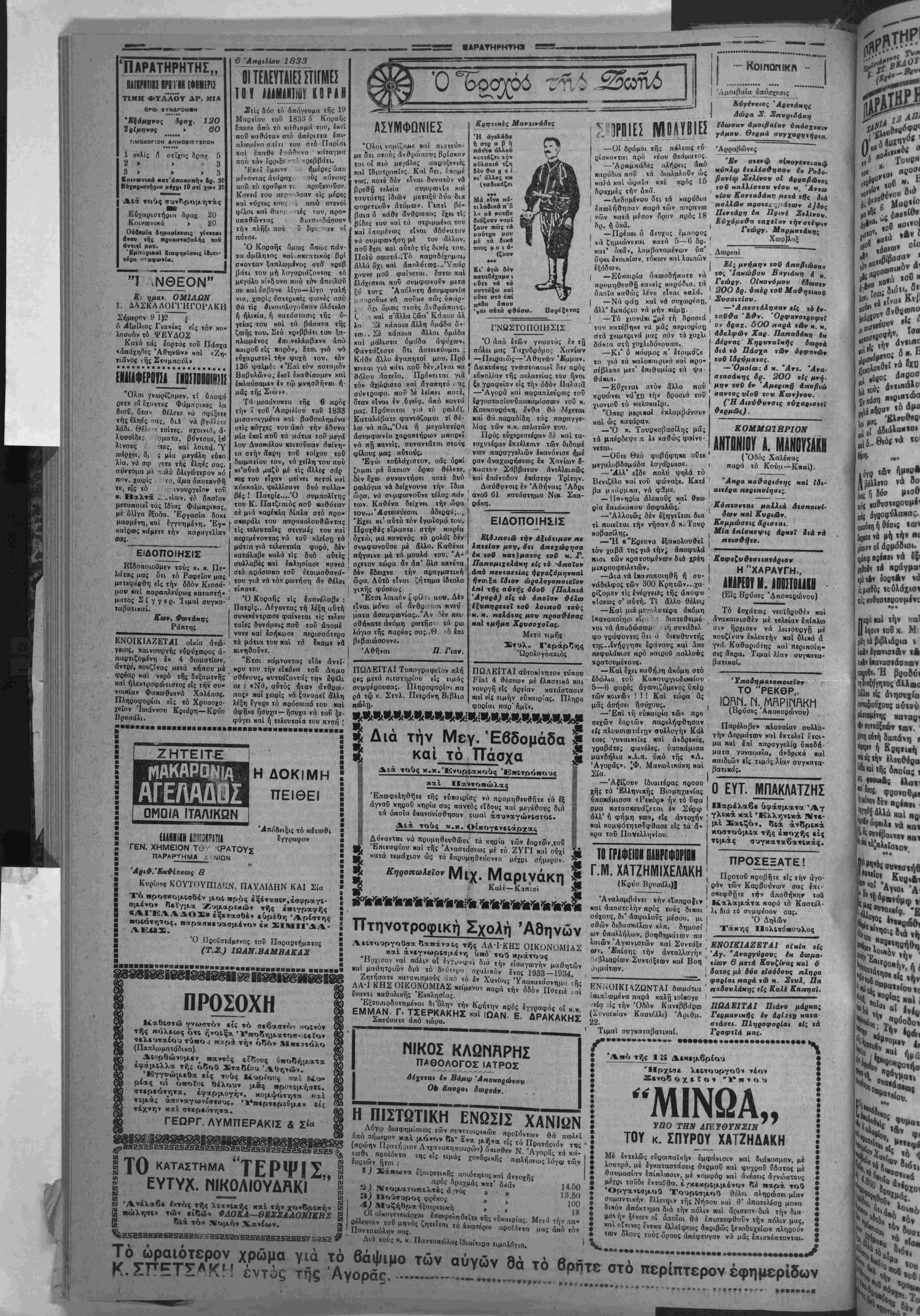 Έτο< 7ον φύλλον 1670: ΤΕΤΑΡΤΗ 12 ΑΠΡΙΛΙΟΥ 1933 Μ.ΤΕΤΑΡΤΗ ΒασιλεΙου ΣΥΝΕΑΘΩΜΕΝ Ας ήαυχάσουν χά πάθη, άς Ηΐπάαουν χά μίση, άς νεκρωϋοϋν αί κακίαι, ά; παραβλέψωμεν χά έπ/νεια, πανε οτα τς6ρΓμι«. Αφηχ*ς μω τα φ&αρχά καί τα μάΐαια. Έ Έβδομάς των Παθών ' ρ8 χατακομίνο 8να γχουκί έτου- Α'<· ιιΑε ναπαιαεύθΏ νά συνέλθωιιεν καί νά απεφ&ώ δα ·. Μαγάοιγειά, ταχεκι στ' ά- τ' άλλ ιυνοϋ νά πάη ταϋτέρου (Ίπό τή κάτω γειτονιά νά πάρη τό Βλεπέ και τό στιμαδόρο νά τό σιτιμάρη ξέφλημα. —'Ανάθεμά σ* ααραταΐλεμε μά ότι δουλεύγης Μαχορίζικο θά πά νέ στά τζβρεμιά. Άφηχες μω δα ; Μαγάοι γειά, ταχεκι στ γρονομειύ νά τ' άρνιέσαι. —Ντήριξε μωςέ Μιχέλη εια ό ά ό ζί διάολο άς επήγανε γιατί μοί ξρ- σιοαμπουλτίσανε τάπόδια μού¬ χαν ω δπροθές τό τσουβάλι, χά νω εδά την μποδιά μου, άνάθε- μά μκ άδέ χάσω ώς όξω καί τή κάρτσα μου. .Άς πάω τι κακο- μοίρα στΐ) βουϊδοσπιτο μή μπα- νά μοΰπεσε όντε νέ πηγά ΐαϋίέ- ά λύ α βύ 00υ νά λύσω τα βούγια. Άνάθε-μά τα γιά βούγια άδέ ι τη— ν —εγέμισαν* βουτσιές. θω ' --?__λΓ. ϊ/......______Α ,^Κγ οί*.. ΙΗ Τ Κ---- · . · - άς μάς χρηοιμεύοη νά συν έλθωμεν καί νά ακεφθώ μέν χαί διά τό ϋψιοχον τοϋ άνθρωπον, τήν ψυχήν. Ας ξεχάσωμεν πρός στιγμήν τό συμφέρον την «ο- , ,^ ϊ^ζ—^%^ ] -Γ _ _................. λΐτ-ικην, τα χόμματα καί τάς οιαιρεσεις. Χχερ παν , νύ δ-ς δνέ δη-ς τί)ν μπΟδ,ά μου χ(ϊημένη χι' 'γώ 'λεγα κώς την ! άλλο Ι'σταται δ ϋνθρωπος ώς σύνολον, δ &νθρωπος } αναθεμάτηνε *ι' ρχασό τη καί ' |ϊαΟα στό πλάι ; Όϊ τάξε ώς ■ψννή. δέν Ιί-ιοθεύγομαι ή καχομοίθα | ΑνΛά^'θρωπ^ης επέτυχε ιεραστίας προόδους ! ι"" "Ο" χωοΐς μποδιά χ«1 πρά- Λ* ' * '" - Λ ... , μα να τού δωσουνε κιανπους έ- ΐΒΐά τό βάνει. Έγώ ή χαχομοίοα ίκουζου- λάθηκα πρέπει. Χάνω στήν δλ- καί εάν δ Άνθρί'- ς Ηατέχιηαε χήν φύσιν, όλα εί " άτελη καί άβέβαιιζ καϊ τα πλοϊα καΐαποννίζονται ν«. «ά άεροπλάνα χαχαπίπτουν χαι ή Γή σείεχαι και δ άνθρωπσς πεθαίνει.Ή £ωτι είνε μία μικρά σκηνή, διατί νά μη είνε ευχάριστος ; Διατί νά καθίιχαται δνσχυχής ; Ό Θεός χ αί ΠΧάατης μας ηθέλησαν νά μάς βοη θήση 'ινα «αι μίνοι μας εϋρωμεν χον ορθόν δρόμον χής σωτηρίας, διό καί επεμψεν «ό» Μονογενή Αν χον Υϊόν είς τήν Γήν διά νά αρτ/ την άμαρχίαν τοϋ κόσμον καί νά ανοίξη τούς οφθαλμούς μας. Πλήν χαι αυτόν δέν έδιστάσαμεν νά θανατώσωμεν. Πλήν χαΐ χάς ένιολάς τού παρέβημεν χαί τόν άνχί- Εϊον δρόμον έβαδίααμεν. ΤΙ καί άν ή άνρθωπόιης έφθασεν είς τό ζενίθ κης -ροόόιυ ; Μήπως χαί χώρα δέν παρατηρήται μία λης τα λαλήνια μου—μά σιό χαλάρωσις της συνοχης, μία συγχυσ,ς, που εάν δέν ευρεθή ό υπό «ου Θεοΰ ένιει-αλμένος, εάν δέν έμ- πληαθώμεν πίστεως, κινδυνεύει νά ίδωμεν καΐαρ ρέον όλον «ό δημιούργημα χον ανθρωπίνον πολιτι- σαοΰ, θρυμμαχιζόμενον ώς πήλινον άγγεΐον ; Ούδ ί| κακομοίοα πώς τάοο χαη- μΐνα μπλειό. — Δέν την πλύνης θριά ; — "Οί παιδί μου, ντά έγώ την έτίναξα καί δέν εει πβάμα. λΥΓΙΩΜΙλ ΡΡΙΣΤθνΡΓΗΜΒΤΓΑ ΤΟ ΤΡΑΓΟΥΔΙ ΑΝΑΜΕΣΑ ΣΤΟΥΣ ΚΟΜΠΡΑ άντρας σουμπορεΐ νά τό κάμη. —Μά.... — Μή διακόττετε. }Σεΐς θά τού γράψετε §να γράμαα, δ- πον θά εκτεθή ή άπελπιστι- κτ) θέση στήν οποίαν βρίσκε- στε σεϊς καί δ γυιός σας, θά Ή Ίωάννα Ντεννύς βγ λε μιά φωνή τρόμον, καί έσ Φΐξε στό στήθος της τόν μι- »ρό της Τάκη μέ μιά αύθόρ· Μητη χειρονομία ηοοοιαοίας, τή χειοονομία τής μητέρας πού στόν κίνδυνο, σκέπτεται όμέσως τή αωιηρία τού σπλί ξώ η ίδ τού λέτε πώς ό μοναδικός ό χνου τπί ξεχνώντος τήν ίδια ρι·ς χαρή στόν δηοϊο θά μπο ρέση νά ξαναδβ τή γυναΐχα τού καί τό γυιό τού σώους καί ύγΐΒΪ*, είναι,. — Ποίος ; », νρτ//*/»»*·.!,»^*"— ~> -.,— - -.. ΰρα μέ τό νά μ* ΐΤεΧήσο ν