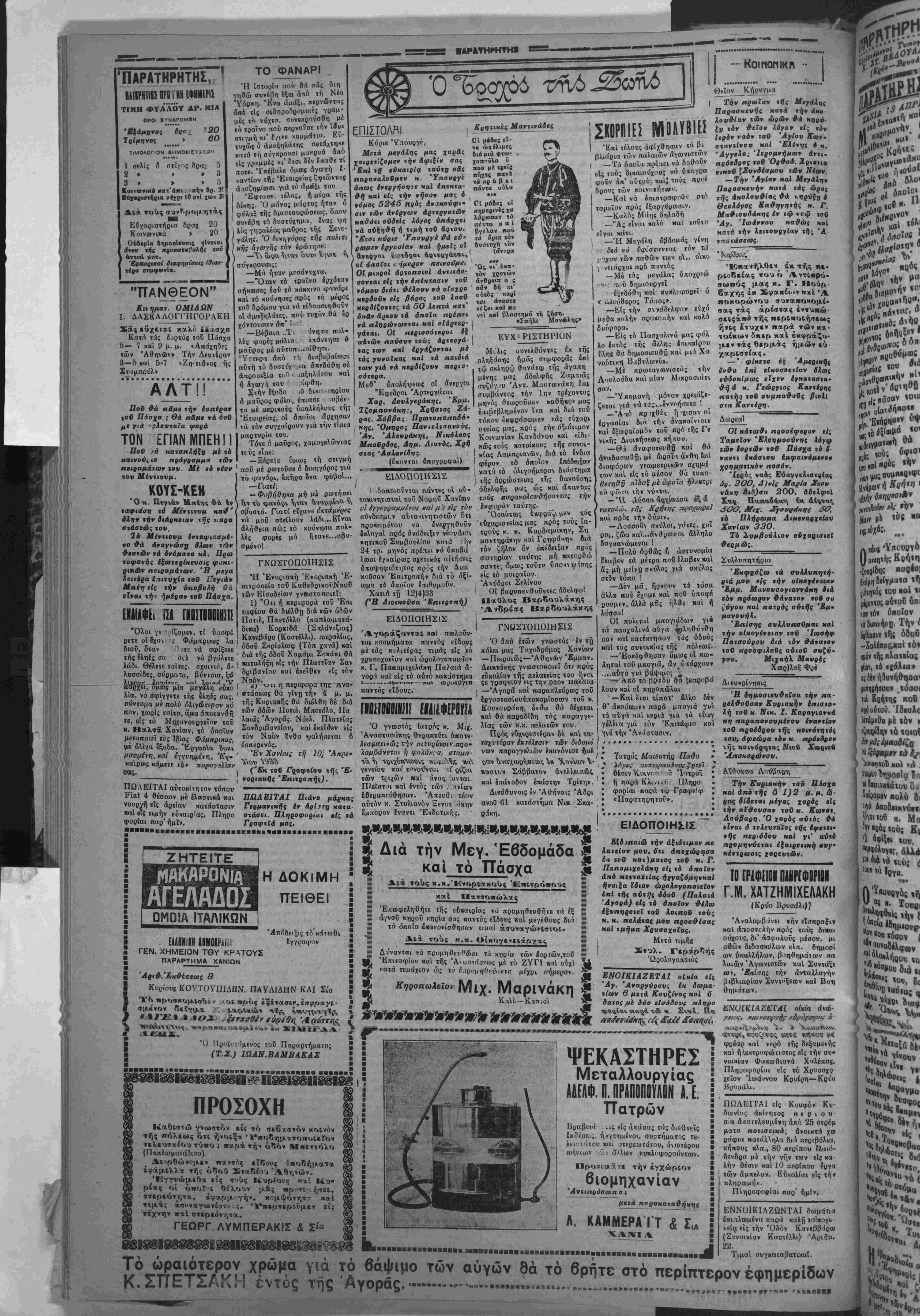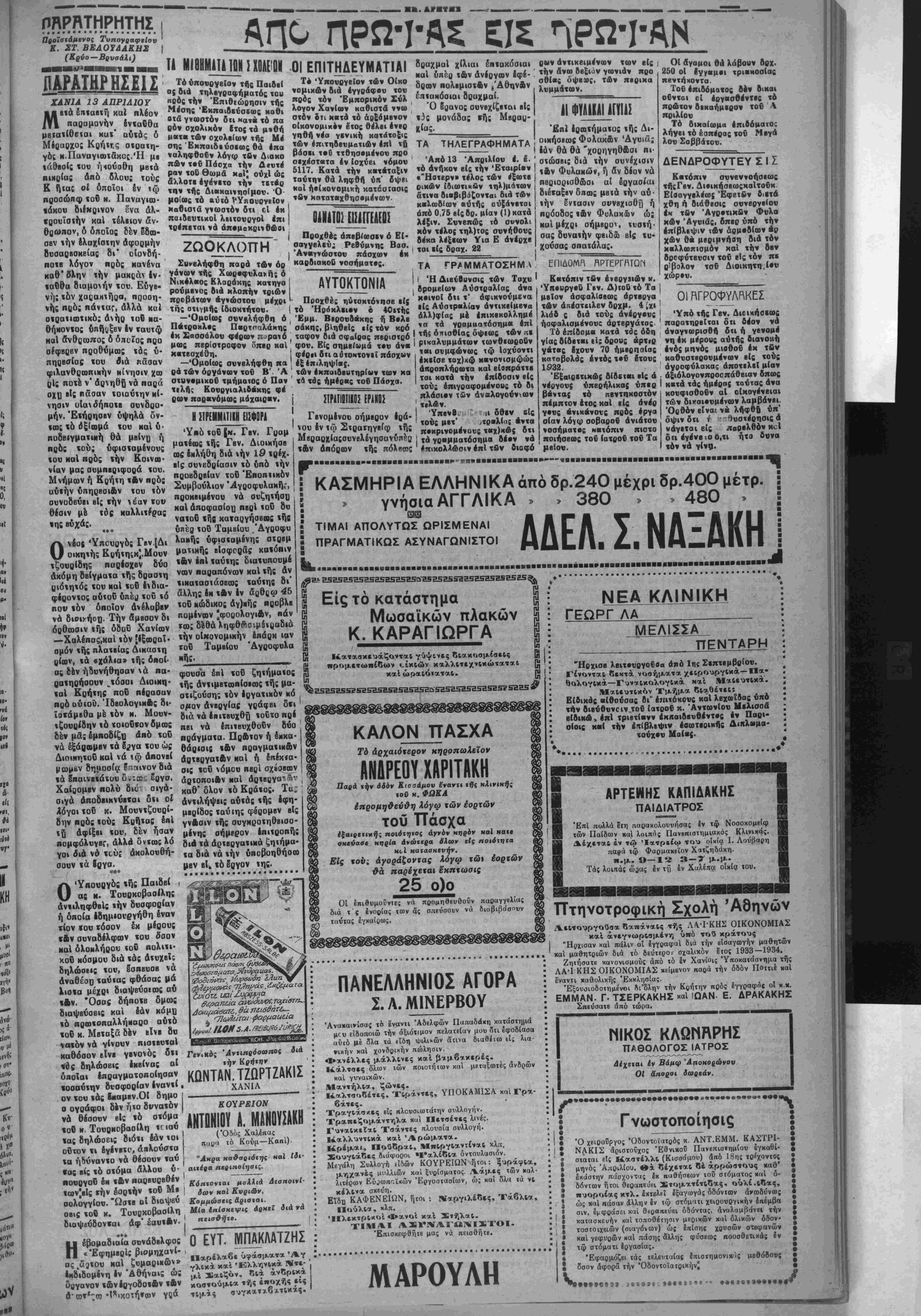 έλ·ύθ<ροι καί δνευ αιμώ «ρο«—"Ασφαλώς πολλοΐ δεν ά.τβλήφθηααιν τόν μέγιστον κίνδυνον δν διατβέχομβν καίήμβΐςκαί «ά ζώα μας. Τον μόνον καθιστώμεν γνωστόν κατά πληροφορίας μας δτι είς «ό Λνοσια«ρείον Οπνς καί χθές έγράψα μέν απεστάλησαν είς «ό «α μβΐσν Χανίων «ά βιβλιόρια «Δ βοηθηματούχων. Πάλαι &ν 'ΑγωνισιΑν τέως Κρητι κης Πολιτειαι:. Χορήγησις των νέων βιβλισρίων ένερ Υ·ϊ«αι κο«' έ.άο«ην ύκό «·€ Τίμιον Χανίω» έκΐ »β προσογωγΰ. 1) Τοΰ στελέ χο;ς «οδ παλαιοϋ βιβλιαρί ου κα', 1) βεβχιώσβως ιον οίχεΐου Πυυεδρον «ής Κοι νό«ητος καί «τ}ς 'Αοτν ομι **ί6 Άίίχήςβι' ή; νά βββαι οΰντιη κρσκειμένον π«οΐ τΔν βθηθημΐτούχνν,δτι εύ ρΐσκονται έν ιη ζω& καί δέν λαμβάνονσιν έτέραν 8η μοσίαν σύνταξιν ή μισθόν (πλήν συντάξ,ως θυμ. πολέ Ρβθύμνηςθεοαπενωνταιήδη ' πεοί «ούς 200 λνσσσδήκτονς κατο.κονς Ρεθύμνης Ήο« 1 κλβίον «άδέ βιάφορα ζβα έν τφ Νομφ Ήρακλιίφ κύνβς Γάτβςόνβι κλπ. λνσσΑνΐα έπιτίθενται κατάτών άνθρώ κων ή καναιταρόζουσι Τας έβυτών σάρκοί. Παρ(σ«αται δσεν έκιτα κτικτ) άνάγκη δκως οί χάτσ χοι κννΑν κατανοήσωσι «όν κύνβυνον δστις μάς άπβιλεΐ εάν τυχόν ήθελεν έξοκλω θή καί ένταΦβα ή λύσοα Τής οποίας είς 'Αρμένονς Άκσκορώνου ιίχομεν τα πβΑτα χρούσματα καί συν ι σιώμβν ιύΐβιςδπως έζαοφα λ σωσι τούς κύνας των μέ χριςδΐονκαοέλθη δ χίνδυ νος καθόσον δι* είδιχών ύκηρβαιβν διετάχθη άφέτσς ή δηλητΐΐρ.ασις «Αν άδβσπό των καί άφ' έτερον ή ποβοβ ' γωγή «Αν κατόχων είς «ό ' Δικαστήριον. μόν Νο, 3122), κροχ» μ* νόν δέ κβρί χηςών καί ό& φαν&ν νά βιβ«ιΑ««ι έκίσης έκτος «Αν ανωτέρω καί δτι δένήλβονβίς β'γομονί ιά τος χήοβς) καί δτι δέν έν Μ φβύθησατ (διά τας όο,φανάς). ΙΥΑΑΙΙ'ιΙ ΦΙΓΟΟΙΙΝΟ» Παρά των όίγάνΜν «ής Χωροφυλακής σννελήαθηό Φνγόκοινος Ανδρέας Κοντο θίνης έ{ Άνωκόλβως Σφα κ Ιω ν κατβοιω» όμενος δν^ά μει αποφάσεως τοθ Πλημμβ λβιοδιχείον Χανίων δι" ής ■ 'χε καταδικασθή είς φνλά κιθιν 52 ήμερΑν κατηγορη θείς έκί παρββίσει «ου νό μόν π«ρί χατοχής στρατιωτι "Αν β(δβν. Η ΕΞΕΤΑΣΙΣ ΤίΙΝ ΟΙΚΟΝΟΜΙΚΟΝ ΖΗΤΗΜΑΤΟΝ ΤΗΣ ΧΩΡΑΣ ΜΑΣ ΑΘΗΝΑΙ 12 "Απριλίου (ιοϋ ανταποΜρΐϊοΟ μας),-— Ι Ή Δημοσΐονομική Έπιτροπή κατόπιν «Αν ένβργειΛν »ής ' ΈλληνΐΜή; Κιβϊρνήσβοος ΝαΙ «ί|ς προσκλήσβως διά «ήν αποστολήν αντιπρόσωπον της διά «ήν Ιξέτασι» *Λν δή μοσιονομικ&ν μας ζητημάτων άπίστειλβ τη- λβγράφημα διά «οθ δποίου ζητεί νά έίοιμασθοθν «ά άνα γΝαιοΟντα διά. «όν δΐΒνβργηθβισομένον ίλβγχον «όν δ- ποϊον θά ένβογήοουν οί ερχόμενοι κατ' αύτάς αντιπρό- σωποι «ής 'Επιτροητ,:· ΟΔΗΓΙΑΙ ΤΟΥ κ ΤΣΑΛΔΑΡΗ Ή ϋβόβδρος *ϊ|ς Ειβιρνήσβως ν. Τσαλδάοης κατό¬ πιν τοθ Ανωτέρω τηλεγραφήμαιας έξβδωκβ ιάς δεούσας δδηγίας και έν.όλος β(ς «άς αρμοδίας ύπηρβσ.ας διά «ήν δσον Ινβστιταχυΐέοαν συγκέντρωσιν των Απαιτουμένων διά «όν έλεγχον στόιχβίων. ΕΔΟΘΗΕΞΟΥΣΙΟΔΟΤΗΣΙΣ Υπό «ή( Βσυλής διακοψϊσης «άς εργασίας της λόγφ των έορτων τοδ Πάσχα εδόθη είς ιήν Κυβερνησιν ή I- υσιοδότησις διά την τροποποίησιν «αν άθρων τής Π' ίΛικονομίας πρός βΐσαγοογήν των κινηματι&ν βΐς δίκην. ΕΓΚΡΙΣΙΣ ΝΟΜΟΣΧΕΑΙΩΝ 'Γ.πίση; ή Βουλή ένίπρινβ διάφορα νομοσχέδια «ά δ- πι/υ ή Κυβέρνησις παρπυσίαθΒ >Ις αυτήν.
