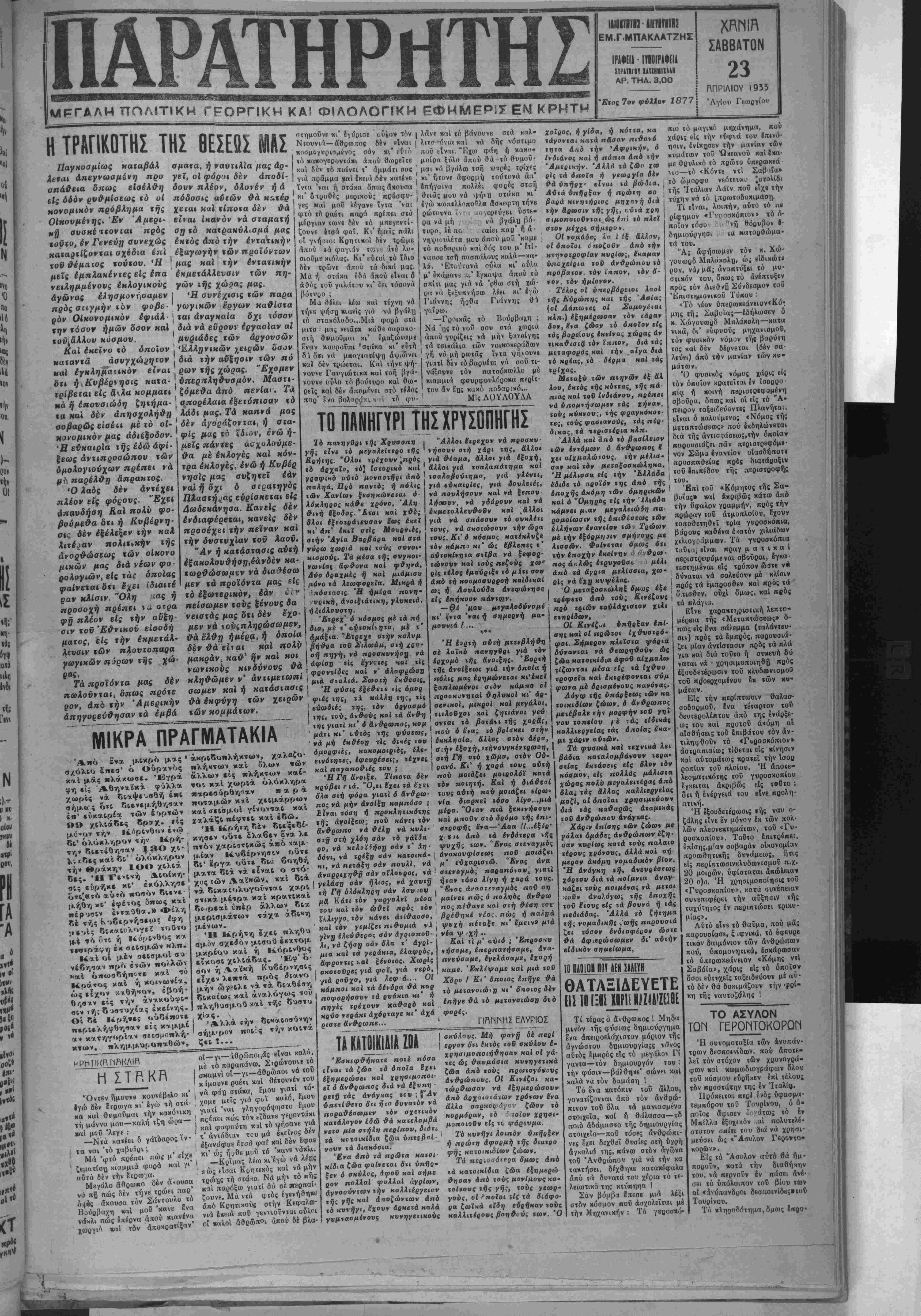 κ# συσκέττονΐαι πρός οη ιό κα<ρακύλ<,σμά μας τουτο, έν Γενεύτ} αυνεχώς έπχός άπό ζήν ένχαιπήν ααχαρχίζονχαι οχέδια επί εξαγωγήν χών προϊόντων ϊθθθέμαιος χούχου. Ή μας ΗαΙ χήν ένχατιηήν μεΐς έμπλακένχες είς έπα εκμετάλλευσιν χών πή- νειλημμένονς έηλογικονς γών ιής χώρας μας. αγώνας έ*ησμοντοαμεν Ι «Η συνέχισις των παρα πρόςσιιγμην ΐόν φοβε ' γωγικών έργων καθίστα ρόν Οικονομικόν έφιάλ χαι άν αγ παία δχι τόσον ζήν χόσον ημών όσον καί διά νά εύρουν εργασίαν αί χοϋί&λλου κόσμον. μνριάδες χών άργονσών Και έπεϊνο χό δποΐον [ «Ελλ,ηνικών χειρών 'ύαον ηαχανχά άανγχώαηιον , διά «ην αύξησιν των πό καί έγκλημαΐικόν είναι ρων «ής χώρας. "Εχομεν όϊ» η Κυβέρνησις κατα- όπερ/τληθυσμόν. Μαστι- ίρίβεΐαι είς &λα ηομμαχι ζόμεθα άπό πενία·. Τά Μάήέπονοιώδη ζηΐήμα- σ,πορέλαια εξετόπισαν «ό «α και δέν άπησχολήθη Αάδι μας. Τά παπνα μας σοβαρώς ε'ισέιι μέ τό οί-' δέν άγόράξονχαι, ή σία ■- - " ' φίς μαςχο ϊδ.αν, ενώ η μεΐς πάντες ασχολούμε¬ θα μέ έπλογες και κόν- ΐρα έκλογές, ένώ ή Κνβέρ νησίς μας συζηιεϊ εάν ναΐηδχι ό σιραιηγός Πλαστήρας ευρίσκεται είς 4ωδεκάνησα. Κανε.ς δέν Ίούμε&α ότι η Κνβέρνη- ένδιαφέρειαι, κανεΐς δέν οκ δέν ε§έλεξεν την καλ προσέχει την πείναν καΐ Αιτίαν «ολιΐ.κήν ιης την δυστυχίαν *οΰ λαοϋ. ανορθώσεως χών οίπονο Αν η κατάστασίς αύτη «Ικών μας διάνέωνφο- Ιξακολουθήσ3,έανδεν κα- ροΓγιών,εΙςτά, οποίας ,ωρθώσωμεν νά διαθέσω φαίνετα, ότι Ιχ.ι ίοΐαιχέ μέν τά προιόντα μας είς ραν κλίσιν. "Ολη ;ιας ή τό εξωτερικόν, εάν £ προσοχή πρέπει »α στρα πείσωμεν χονς ψονςδα IV πλέον είς χήν αϋξη- νεισχάς μας δχι δέν έχο· II χον Έ&νΐΗοϋ είσοδή μέν νά ,ονςπληρώσωμεν, μάχας, είς την έκμεχάλ- θά Μ#9 ήμέβα,ή δποία ίευσιν των πλ,ουτοπαρα **· θά ε?να. «Λ «£ γωγ.κώνπ3ρων^ς #~- μ»*<>αν{ καθ « και κοι