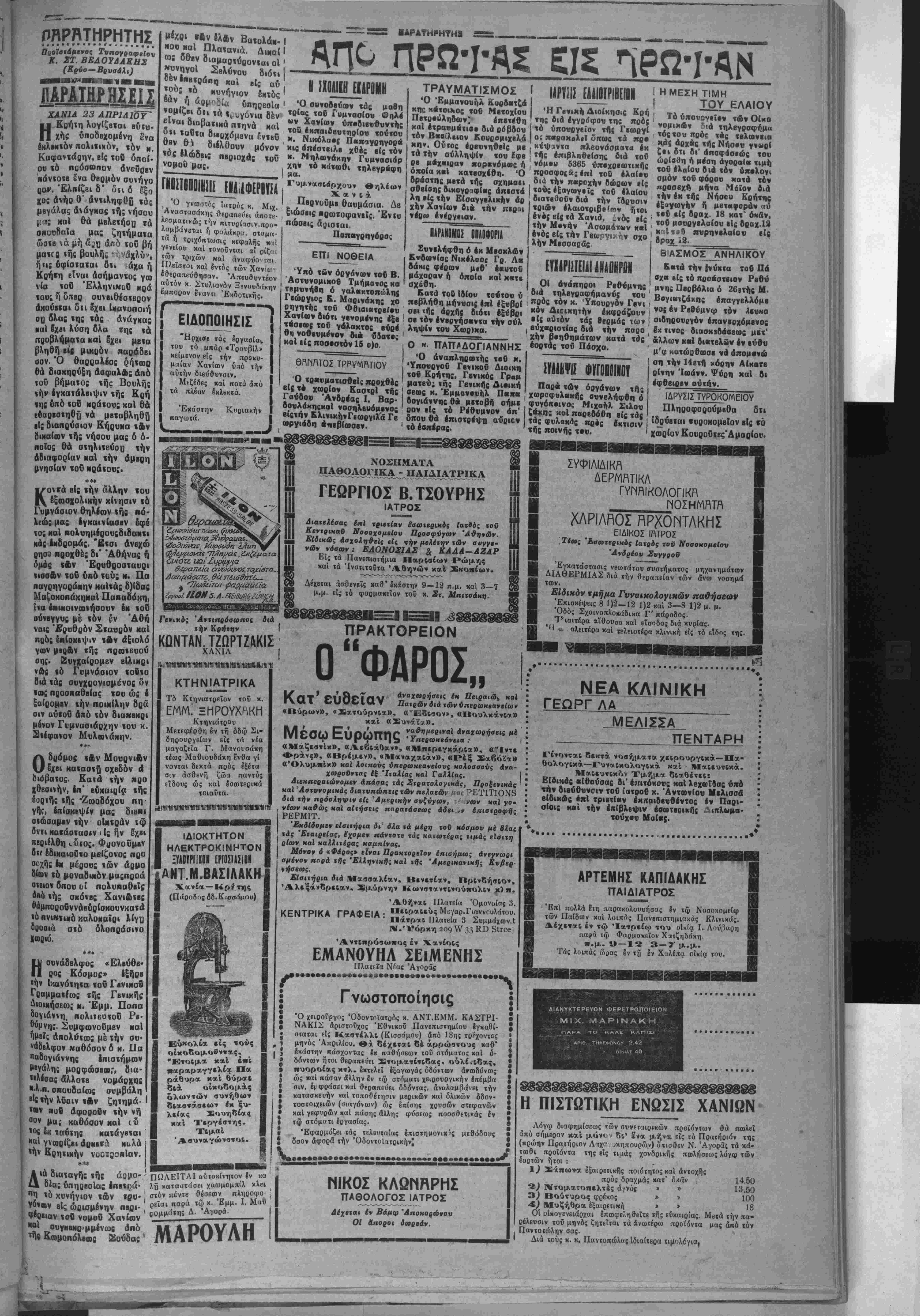 ρον αύιόμα«ο< άνα«ίμησιν «ών ηροίόννων, άναζωογο νουμένου «οδ διβθνοδς έμπορίου καί «Αν οικονομικήν δροβν «ής ζωής. ε(ας βίντίπθινα θο· έφαβμώ οουν καί τα Σοβιέτ επί των βίς την χώοαν των εί σαγομέναν Άγγλικβν προΐ όννων. "Ετεραι πληοοφορίβι έκ τού έξωτβρικοΰ άναφέρουν δτι ή Αγγλικη ΆστυνομΙα ϊίθοποίηοϊ «αν έν Λβνδί»Φ έδρβύουσαν μεγάλην Σοβιβ τικήν επιτροπήν νά έγχατα λβ ψιι ένχός ώοών χήν 'Αγ γλί&ν καθόσον ήρθη ή πρός αυτήν χορηγουμένη διπλω μαχική άουλίν. ΤΑ ΕΚΚΡΕΜΗ '^ράφο νικος ΑΘΗΝΑΙ 22 "Απριλίου οβως καίχοίχο διότι ή δκδο (τοΰ άνχαποχοιτοΰ μ·ς).— Ι σι$ «ού στρατηγόν Πλασχή Είς τάς χθεσινάς καί σημβρι' βα υπό των Ίτολιχων άρχων νάς εφημερίδας ανεγράφη ή »'·"·■ Αλώ«η«ηΓ κπΑΑπον &ίν κληρ·φ·ρΙα δτι ό είς χήν ' Πάτμον καί ίύχί χήν Ε«- λνμνον, ώς Αρχικώς έγρέφη, ευρισκόμενος στοατπγός Πλαστήρας πρόκβιται ν ι *κ- δοΒή καρά «ής, Ίχβλινν Κνββρνήσιως κατόπιν δ^ βημάτων «ής ημετέρα: τοιαν της. Καθ* ά εΐμαι είς θέσιν νά γνωρίζη αί πληρ·φΰβ!«ι ού χ«ι περί εκδόσεως 5£ν είναι κκριββίς καί ότι εύ( ι θεώ ροϋνται καί ανάξιαι ι1»·-·.· ΐύ είναι άδύνατος καθόσον δίν υφίσταται τοιαύτη σύμββ αίς· εκδόσεως άιόμων καχη γοοονμένων δπως έν προκεΐ μένορ α Πλαστήρας, διά πό λιτικά ά&ικήμαχα. Έξ άλλου, Αλλαι πληροφο ρίαι βεβαιούν δχι ή Κνβέρ , νησίς δέν προέβη είς ούδε | μίαν ενέργειαν διά την Ικ&· αιν τού στρατηγόν κ·1 οΰΊε φαίνβτοΐι διοιτβθειμένη ηρ5ς χό παρόν τουλάχιστον νά προβή είς τοιαύτας ενερ¬ γείας. "ΟπωίχαΙ οχ μέν ό κ. ύπουργός Διοικητής πρός της χ ρήσεώς τ·υ δι* «άς '/ ήτας Ιλοβε σημειώσεις δλ& / «ών ι έχχρεμών ζητημ«χ«ν τής νήσον μας τδν οποίων ή λν 1 οις έξαοιάοι άπό »ό Εέν τρον , ίνα άσχοληθϋ διά την λύσιν τούτων εάν δυνηθή νά παραμείνη είς τ«ς Άθή νας επί πολλάς ημέρας. Κα χ« τας πληροφορίας μας ό κ. Γβνιχός Διοικητής εΐδιχώ χερον θό «σχοληθό διά χήν χορήγησιν πιοχώθΒ»ν πρός Ι1ΡΥΟΙΤΛΙ1ΑΓΜΑΤΑ ΑΜΥΝΗΣ ΕΙΣ ΤΗΝ ΝΗΣΟΝ Μ ΑΣ; Κατόπιν των είδήσιων | παραρτήματα βΐς 6λ« τα χω «σν 'Αθηναϊκοΰ χύϊΐ·ν ηβρΐ βΙ· βέν θά προβαίνει δέ σνγκρ·τήσεως έ.όπλων κομ εί£ ουδεμίαν έχδήλωσι πρίν ματικων σωμάχων, «τατμά 1 χά έν Αθήναις τάγμϊχα έ «ών έφόδον»ώί όνομάζ·νται πολλοί ονμπολίται εσκέφθη σαν νά συγχροτήσουν «ανο μοιότυπα οώμοτα, τάγματα αμύνης, ώς λέγουν. Εάν αί πληροφορίαι μας ιΐναι άκριββίς ή (δέα κάμνει ήδη «όν γ€ρ·ν τής νήσου· ΟΙ σχόντβς την πρωτοβοιλίαν Ι&χονχαι *1ς σννενοτοβις μεχά παοαγόνιωντων αλλων ΝομΛν τής Κοήχης, ϊψα άπό κοίνον ΧόΡονν &ποφάο«ς. Τα σχηματιοθησόμβνα «τάγματα αμύνης» Θά εχουν φόδου τού Λ»ϊκοϋ κόμμα τος έκδηλωθώσι όπωσδή ποτε. Έπβιδή ούχ ήττον προ βλέπβτεΐι δτι ή ίδέα «ά συναντήσο Ισχυράν την άν «ίδρασιν δλων των Φιλΐλευ θέρων παραγόντων χής νή σου μας βραδύνη ή έναρξις οοβ&ρας ζνμά> ιως ηοός