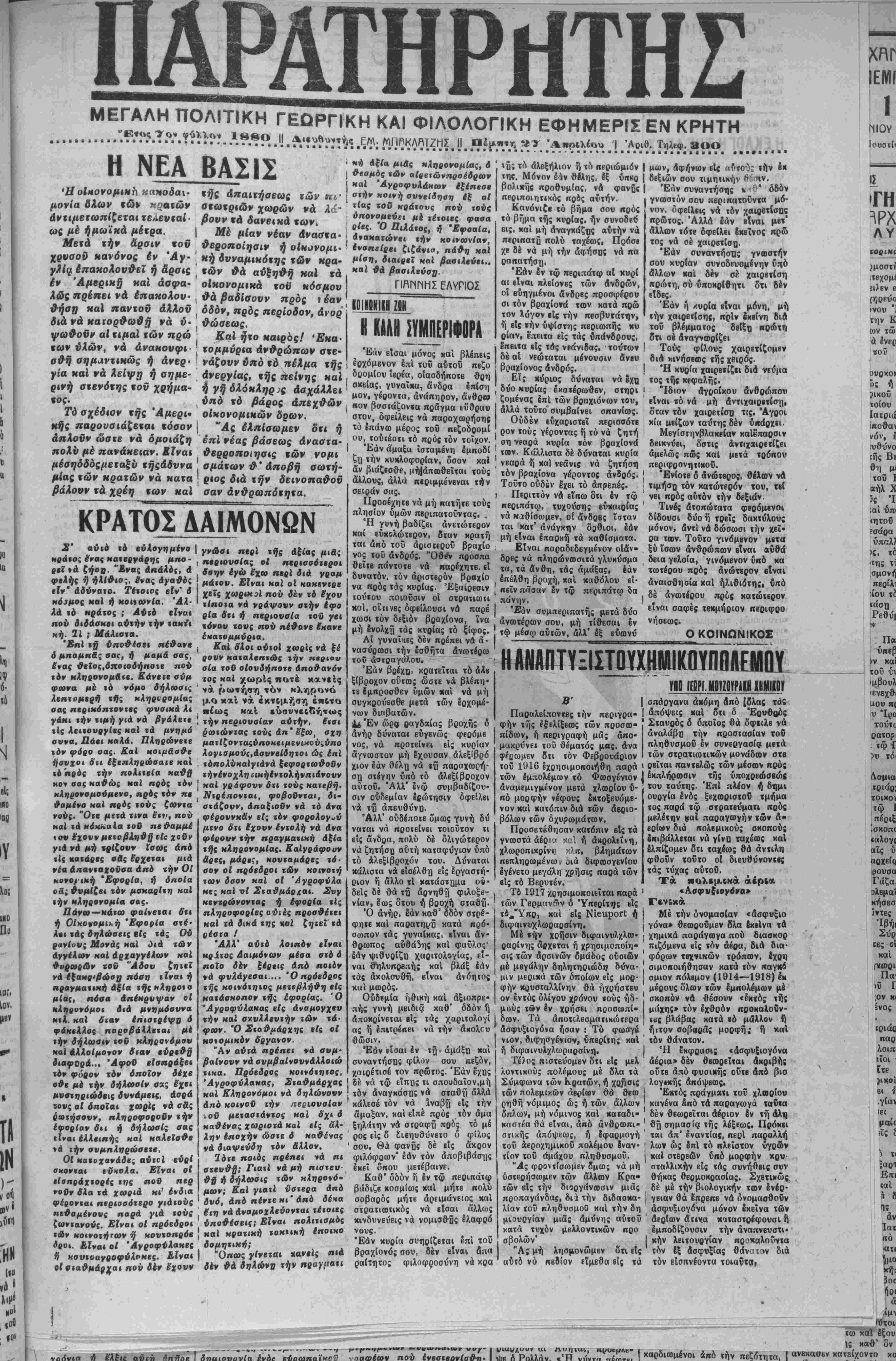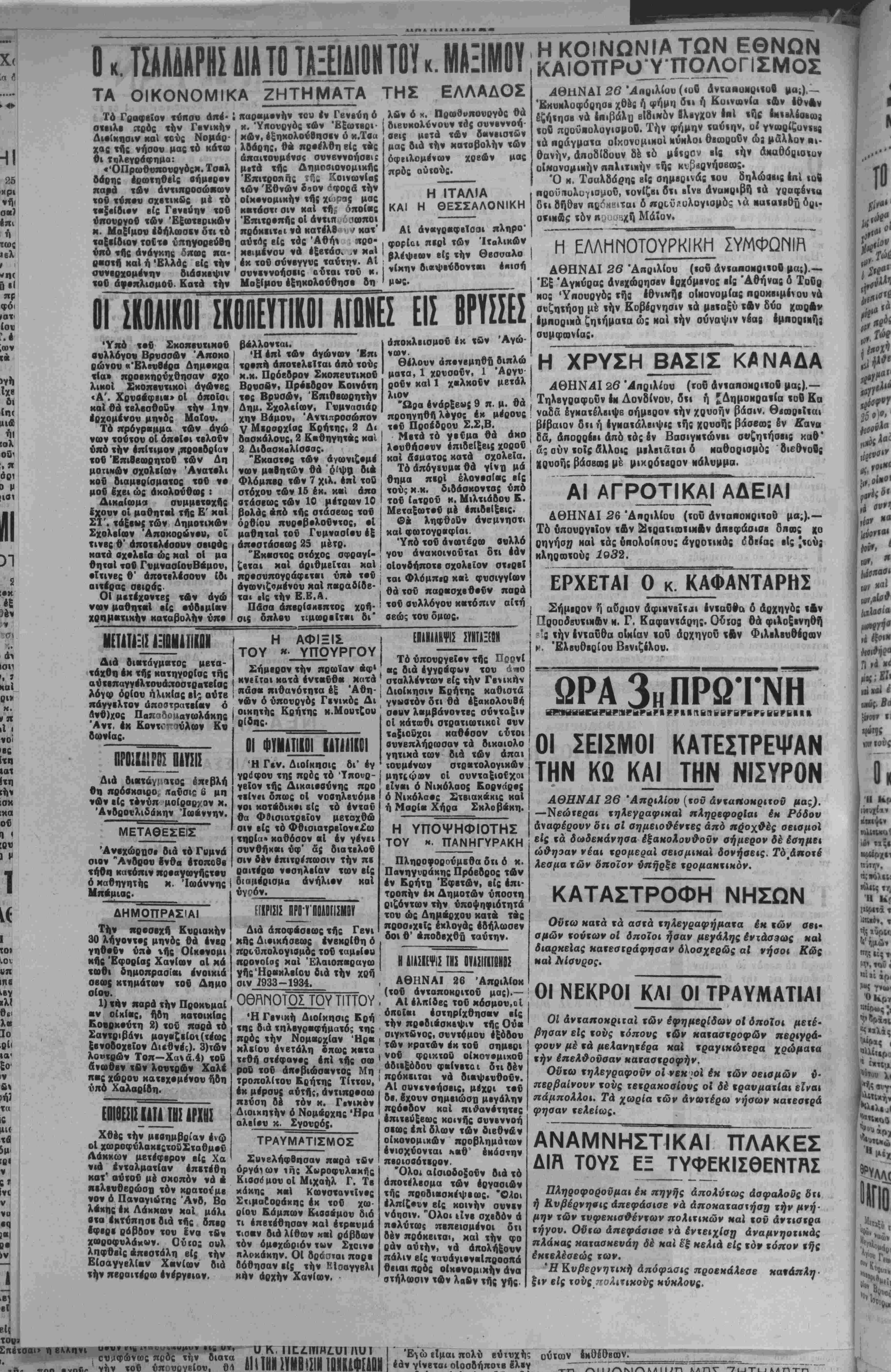ξενοδοχείον Διεθνές). 3)<ών λοντρών Τόπ—Χά» ά.4) τοδ ανωθιν «βν λοντρών Χαλί πας χώρον κατεχόμενον ήδη υπό Χαλαρίβη. ΕΟΙΟΕϋΣΙΑΙΠΗΙΛΡΚΐ: Χθές «ήν μεσημβρίαν ένφ οί χωροφνλαχ·ς«οδΧ«αθμ·ΰ Λάκκων μετέφερον βίς χα νιά εντολματίαν επιτεθή κα« αΰτοβ μέ σκοπόν νά ■ κΐλινθβοώσυ τόν κρατοιμε νόν ό Παναγιώτης Ανδ, Βο λβκης έκ Λάκκων καί μάλ* β«α έκτύπησι διά «τίς δπερ έφερε ράβ&ον τον ενα τ6ν χηροφυλάκ»ν. Ού»; ουλ ληφθείς απεστάλη είς την ΕίσαγγβλΙαν Χανίων διά «ήν πβραιτίρω ενέργειαν. ΚΡΙΣΙΣ ΠΡΟ Υ ΠΡΑΟΓΙΣΜΟΪ Διά αποφάσεως τής Γεν ι κης Διοικήσεως ενεκρίθη δ προϋπολογιομός τοΰ ταμιίου προνοίας καί Έλαιοπαραγω γήςΉραιχλΐΙον διά «ήν χρή σιν 1933-1934. θθΑηοτ~ΓΓοΫΤπΤογ Ή Γενική Διοίκησις Κρή τας διά τηλεγραφήματός της πρός «ήν Νομαρχίαν Ήρα κλείον ένετάλη όπως κατα τεθή στέφανος επί «ής σω ροδ τοΰ αποβιώσαντος Μη τροπολίτου Κρήτης Τίττον, έκ μΐ'ρσυς αυτής, άντιπροσω πβΐση δέ τόν κ. Γενικόν Διοικηττΐν ό Νομάρχας Ήρα αλεΐον κ. Σγονρός. τραυ"ματισμοσ Συνελήφθησαν παρά τβν όργάϊω» ιής Χνροφυλακτϊς Κιαοό μόν οί Μιχαήλ Γ. Τε κάκης καί Κωνσταντίνος Στιμαι,οράχης έκ τοΰ χω¬ ρίον Κάμπων Κιοονμου διό τι επετεθησαν κα· έτρανμά τισαν διά λίθων κ«1 ρόβδοαν τόν ομοχώριον των Σχοινο πλοχάκην. ΟΙ δράαται παρ· Οόθησαν είς την Κίοαγγβλι κήν Αρχήν Χανίων. Τό ΰπονργβϊον «ής ΠρρνΙ άς διά εγγράφων τον Ληο ; σταλλέντων βίς την Γενικήν | Διοίκησιν Κρήτης κοθιστά , γννατόν δτι θά εξακολουθή σ·»ν λαμβάνοντες σύνταξιν οί κάτωθι στρατιωτικαί ανν «α{ιοδχοι καθόσον ούτοι οννβπλήρωσαν «ά διχαιολο γητικά των διά «ών άπαι τονμένων στρβτολογικών μητςφΐον οί ουνταξιοίχοι είναι ό Νικόλαος Βοβνάρος ό Νικόλαος £«Βΐακ«κις καί ή Μαρία Χήρα Σκλοββκη. Η ΥΠΟΨΗΦΙΟΤΗΣ ΤΟΥ κ. ΠΑΝΗΓΥΡΑΚΗ Πληροφορούμεθα δτι ό κ. Πανηγυράκης Πρόβδρος «ών έν Κρήτα 'Εφβτών. είς επι¬ τροπήν έκ Δημοτών ΰηοστη ριζόντων «ήν νποψηφιότητά τον ώς Δήμαρχον καί β τβς προσεχιΐς εκλογάς εδήλωσεν δοι θ' «ποδεχθη ταύτην. Ν ιιιιιιψιΐ ϊη. ιηι\ιΈι , ΑΘΗΝΑΙ 26 Άπριλίοχ («ου άνταποκριτοΰ μας).— . ΑΙ έλπΐδβς τοΰ κόσμον,ο Ι οποίαι έστηρίχθησαν είς «ήν πρβοι«σκίΐ|}ΐν «ής Οϋ« σιγχτβνος, σνντόμον έξόβον ' «ών κρατών εκ «όν σημερι Ι ν ου Φβικτοδ οίκονομιχοΰ άδιεξόβου φαίνετοι δτι δέν Ι ποόχειται νά διαψενθοΰν. ΑΙ ουνενοήσβις, μβχρι τ·0 δέ. έχονν σημβιώστι μεγάλην πρόοδον καί πιθανοτη«ες έπιτεύξβως κοινής βννβννοή σιως επί δλων «ών διεθνάν οίκονομικών προβλημάτων ένισχύονται η·0' εκάστην πεοισοότερον. "Ολοι αΐσιοδο,οΰν διά «ό άποτΐλβσμα των εργασιών τής προδιασκίψεως. Όλοι έλπίζουν βίς κοινήν σννιν νόιισιν. "Ολοι ιίνε σχεδόν ά η·λύτω$ πεπεισμένοι δτι δέν πρόκβιται, καί την φο ράν αυτήν, νά άπολήξονν πάλιν βίς νανάγιβναίπροοπα θειαι πρός οικονομικήν άνα στήλνσιν τ«ν λαβν «ής γής. ΑΘΗΝΑΙ 26 "Απριλίου (τοΰ άνιαηοκριτοθ μα;).— Τό υπουργείον «Αν ΐ«ρα«ιαιΐΝΑν άπΒφάσισε δπως χο ρηγήσ27 καί «άς υπολοίπους αγροτικάς έδιίας είς *«οί»3 κληρη«ούς 1932. ΕΡΧΕΤΑΙ Ο κ. ΚΑΦΑΝΤΑΡΗΣ Σήμερον η αυριον αφικνβΐυι Ινιαθΐα δ Αρχηγός «Αν ΠοοοδβυϊΐκΑν ν. Γ, Καφαντάρης. Ούτος θά φιλοξινηθή ^3 «ήν Ινΐαΰθα οΐκίαν ι ου άρχηγοϋ «Αν Φιλιλβυθέοαν ν. Ελευθερίου Ββνιζίλου. ωρα3ηΠΡωίνη ΟΙ ΣΕΙΣΜΟΙ ΚΑΤΕΣΤΡΕΨΑΝ ΤΗΝ ΚΟ ΚΑΙ ΤΗΝ ΝΙΣΥΡΟΝ ΑΘΗΝΑΙ 26 Απριλίου (τοΰ άνχαηοΜριχοΰ μας). —Νεώτεραι τηλεγραφικαί πληρεφορ.αι επ Ρόδου άναφέρουνόπ σί σημειοθέντες από πρΌχθές σεισμοΐ είς «ά δωδεκάνησα εξακοΛσυθοΰν σημερον δέ έσημει ώθησαν νέαι τρομεραϊ σεισμικαί δσνήσεις. Τό,άαοτε' λεσμα των δηοϊον ύηήρξε