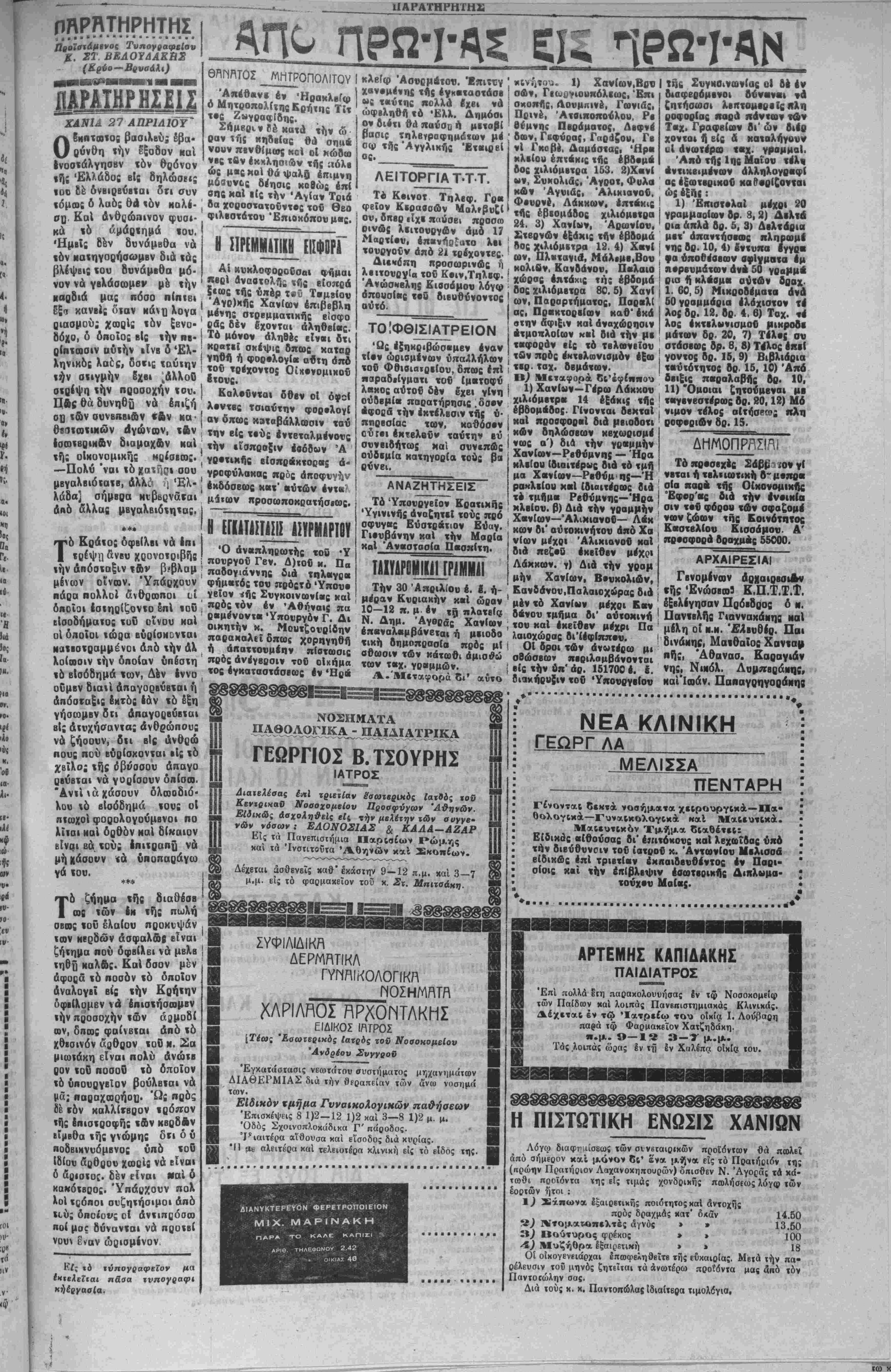 »· ί< ΒΒεΜ ■ ΑΡΤΕΜΗΣ ΚΑΠΙΔΑΚΗ! ΠΑΙΔΙΑΤΡΟΣ Επι πολλά εΐη παρακολουυήσας 8ν τω Νοσοκομείω των Παίδων καί λοιπάς Πανβηιστημιακάς Κλινικάς. Δέχεται έν τώ Ιατρείω τού οίκία Ι. Λούβαοη παρά τφ Φαρμακείον Χατζηδάκη. «.μ. 9—1« 3—Τ μ.μ. Τάς .λοιπάς ωοας έν τη έν Χαλέπα οίχία τού. Η ΠΙΣΤΩΤΙΚΗ ΕΝΩΣΙΣ ΧΑΝΙΩΝ Λόγω διαφτκλίσεωί των σινεΐαιρικών προΐοντοον θά πόλει άπό σημεοον καί μόνον 6ς' ενα μήν« είς τό Πραιήοιόν τη; (κρώην Πρατήοιον Λαχανοχηπουρών) δηισθεν Ν. Άγοράί χά κά¬ τωθι ποοϊόντα της είς τιμάς χονδρικώς πωλήσίως λόγφ των εοοτών ήτοι : 1( Σάπωνα έξαιοετικής ποιότητος καί άντοχής πρός δραχμάς κατ' δ*αν 14.50 2( ΝτοματΛπελτές άγνός » » 13.50 IX) Βούτυρος φρέκος > > 100