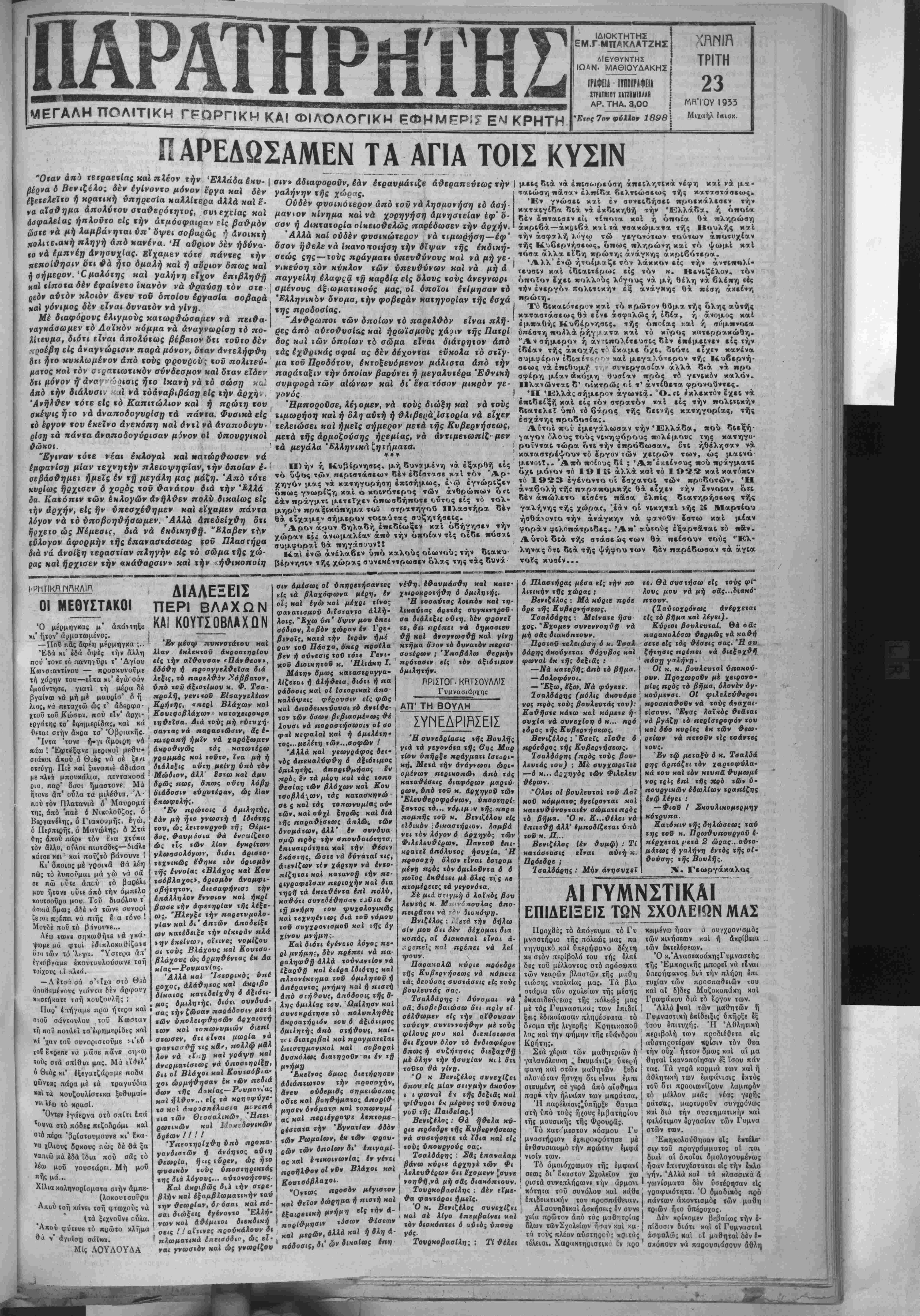 τό ΰψος των περιστάσεων δέν εδίστασε κ<αί τόν "Αρ¬ χηγόν μ»ς νά κατηγορήση επισήμως, έ* ώ εγνώριζεν όπως γνωρίζη καί ό κοινότερος των άνθρώπων όίΐ εάν πράγμτι μετεϊχεν όπωσδήποτε οίτος είς τό τολ¬ μηρόν πραξικόπημα τοθ στρατηγοΰ Πλαστήρα δέν θά είχαμεν σήμερον τοιαύτας συζητήσεως. νΑρον αοον δηλαδή έπεδίωξεν καί όδήγησεν την χώραν είς ανωμαλίαν άπό την οποίαν τίς οίδε πόσχΐ συμφοραί θά πηγάβουν!! Καί ένώ άνέλαβεν υπό καλούς οίωνού; την διακυ¬ βέρνησιν τής χώρας συνεκέντρωσεν όλας της τάς δυνά μ.εΐς διά νά έπισ«ορ·ύση άπεΐλητΐκά νέφη καί νά μα¬ ταιώση πάσαν έλπίδα βελτΐώαεως τής καταστάσεως» Έν γνώσει καί έν συνειδήσει προεκάλεαεν την καταΐγίδα διά νά έκδΐκηθή την Έλλάδα, ή όποία δέν έπταισεν είς τίποτα καί ή όποία θά πληρώση άχρΐβά—άκριβά καί τα τσακώματα τής Βουλής καί την άσφαλή λόγω τώ γεγονυτων τούτων άποτυχίαν τής Κυβερνήσεως, όπως πληρώνη καί τό ψωμί καί τόσα άλλα ειδή πρώτης άνάγκης άκριβότερα. Άλλ' ένώ ήτοίμΐϊζε τόν λάκκον είς την άντιπβλί- τευσιν καί ιδιαιτέρως είς τόν κ. Βενιζέλον, τόν οποίον έχει πολλούς λόγους νά μή θέλη νά βλέπη είς την ένεργόν πολιτικήν έξ άνάγΜης θά πέση άχείνη πρώτη. Τό δΐκαΐότερον καί τό υρώτονθΰμα τής όλης αυτής καταστάσεως θά είνε ασφαλώς ή ιδία, ή άνομος καί εμπαθής Κυβέρνησις, τής οποίας »αί ή σύμπνοΐα υπέστη πολλά ρήγ;κατα καί τό κνρος κατερρακώθη. "Αν σήμερον ή αντιπολίτευσις δέν έπέμεινεν είς την ιδέαν τής άποχής τ" έκαμε ό'/ΐ, διότι είχεν κανένα συμφέρον ίδιαίτΐφί>ν χαί μεγαλύτερον τής Κυβερνή¬