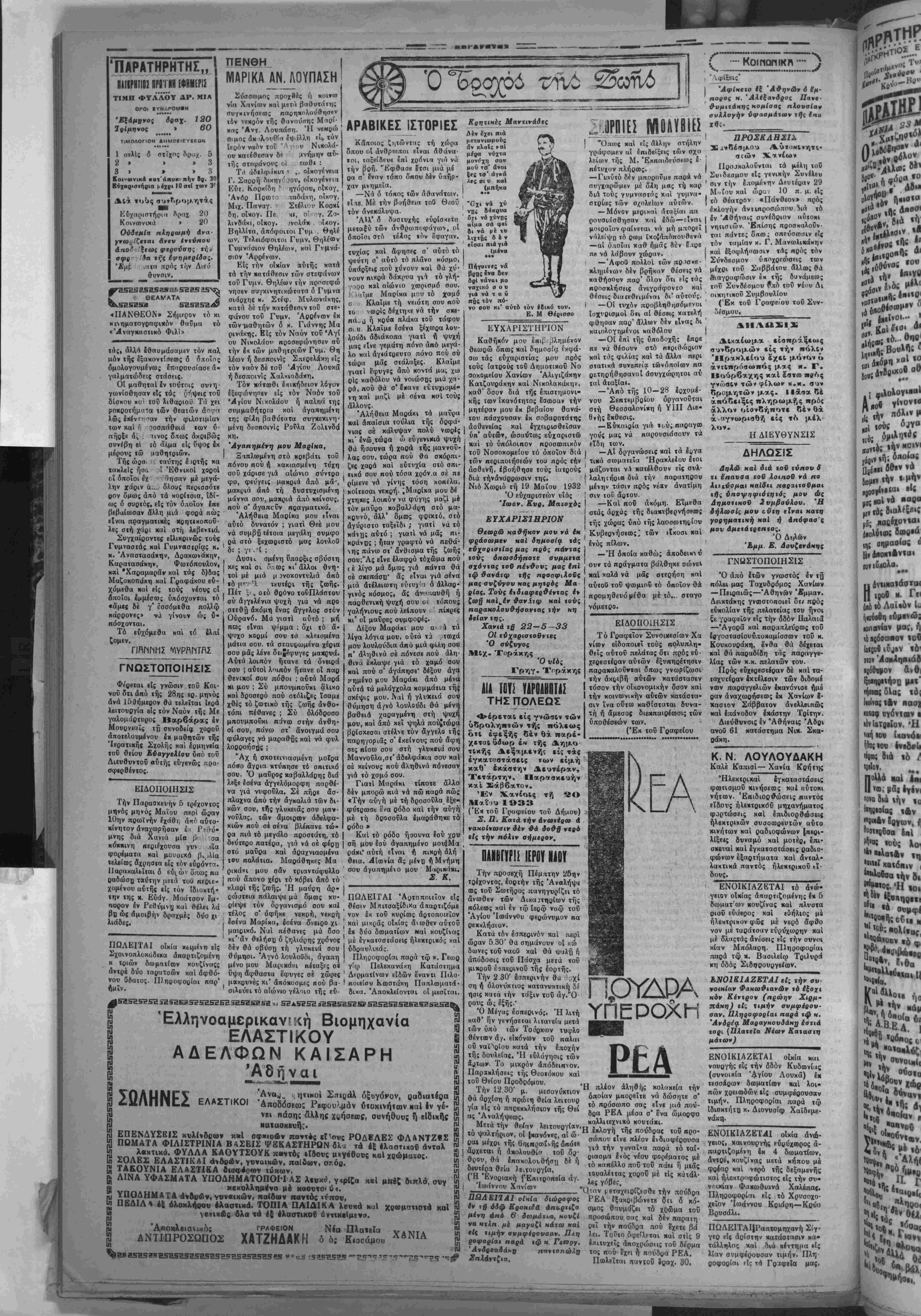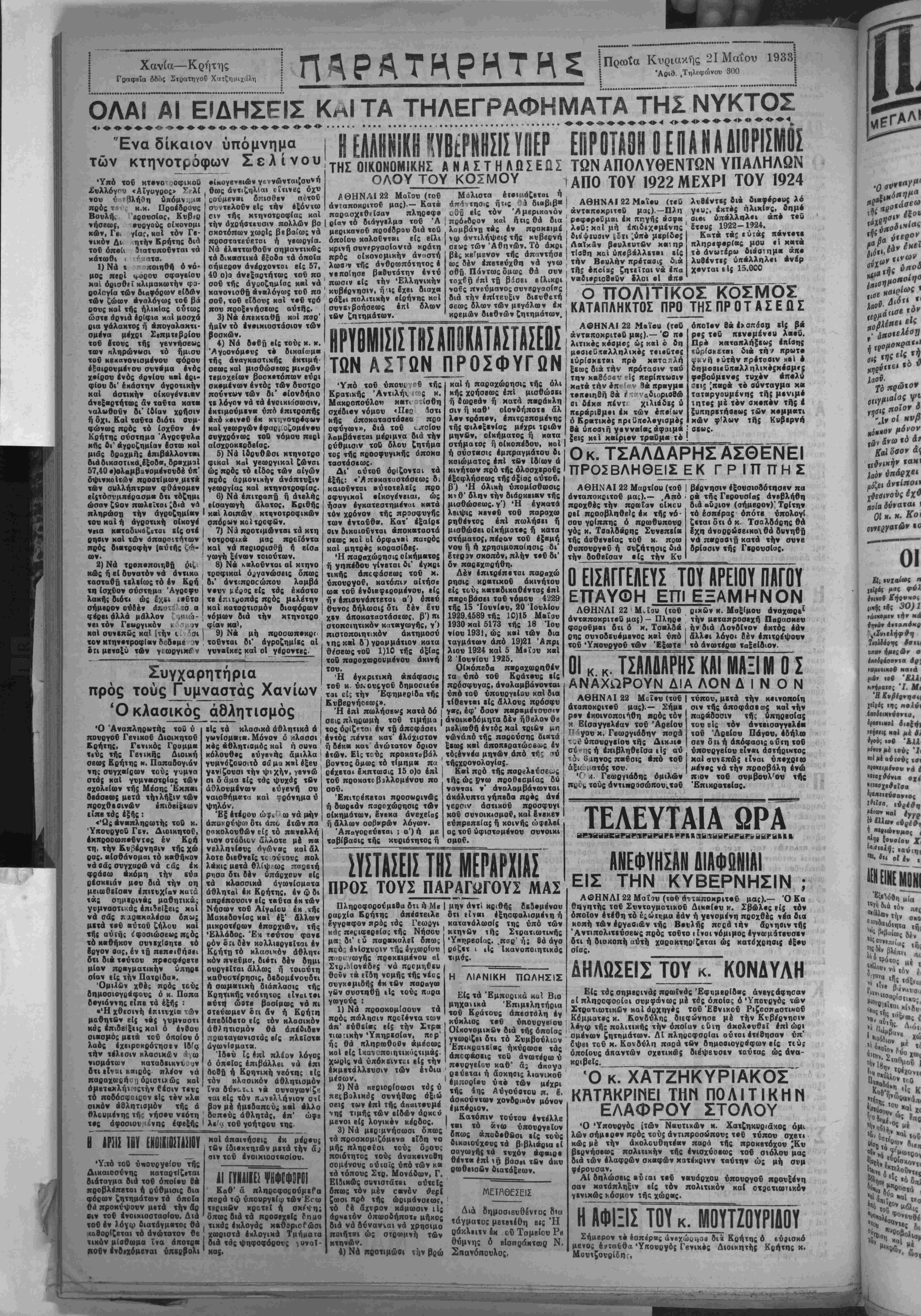 σχέδιον νόμον <Πβο κης άποκαταστάοβα σφύγωι», διά τοΰ λαμβάνβται μέριμνα διά την ρύθμισιν τοδ όλον ζητήμα τος τής κροσφνγΐΜής όποκα ταστάσεως. _ι' αύτοΰ όρΐζονται τα εξής: «Άποκαταστάσεως δι καιοννται βύ.οτβλείς προ αφνγικαί οικογένειαι, ώς ήσαν έγκατβστημέναι κατά τόν χρόνον τής προοφυγής των ένταΰθν. Κατ' «ξαίρε οιν δικαιοΰνται «ποκβταοτά σεως Μοί αί όρφανβί πατρός καί μητρός κορασίδβς. ■Η παραχώοησις οίκήματος ή γηπβδου γίνβται δι' έγκρι τικής άπεφάσεως τοΰ μ. υπουργόν, κατόπιν αίτήσβ ωα τοΰ ένδιαφεοομένον, είς ήν έπιθυνάπτεται α') ΰπβύ θυνος δήλωσις δτι Β έν £<υ χιν άηοκαταστάσεως, β') πι στοποιητικόν καταγωγής, γ') πιστοποιητικόν άκτημοσύ %ηςκ«ί δ)γραμμάτιον κατα θέσεως τοδ 1)10 τής όξίας τοδ παρσχωρονμένον άκινή τού. Ή έγκριτική άπάφασις τοΰ κ. ύ}»ουι;γοΰ δημοοιβύε ται είς την Εφημερίδα τής Κυβερνήοεοοί». Ή έηί πωλήσεως κατά δό καί ή παραχώρησις τής όλι κης χρήσεως επί μισθώοει ή βωρεάν ή Ματά παράκλη σιν ή καθ' οιονδήποτε δλ λον τρόπον, έπιτρΐπομένης τής φιλοξενίας μέχρι τριών μηνβν, οίκήματος ή κατα στήματο; ή οΐκοπέδου, κοΐ ή σύστασις έμπραγμάτον δι καιώματος επί τβν Ιδίων ά κινητών πρό τής όλοσχερο€ς έξοφλήσβως τής άξίας αύτοΰ. β) Ή όλική ύπομΐσθωσις κτθ' δλην την διάρκειαν τής μισθώσβως. γ') Ή έγκατά λβιψις χβναΰ τοΰ παραχω ρηθβντος επί πωλήοει ή μισθώαβι οίκήματσς ή κατα στήματος, πέραν τοΰ έ,«μή νού ή ή χρησιμοποίησις δι' έτίραν σκοπόν· πλήν τοΰ δι' δν παβκχοσρήθη. Λέν έπιτρέπεται παραχώ ρήσις κρατικοΰ ακινήτου είς τούί καταδικαθέντας επί παραβάσει ταΰ νόμον 4229 τής 15 Ίουνίου, 20 Ιουλίου 1929,4589 τής 10)15 Μαΐον 1930 καί 5173 τής 18 Ίου νίου 1931, ώς καί των δια ταγμάτων άπό 19)21 'Απρι λιον 1924 καί 5 Μοΐον καί 2 Ιουνίου 1925. Οίχόπεδα παραχωρηθέν τα υπό τοΰ Κράτους είς πρόσφυγας, άναλαμβάνονται υπό τοΰ ύπονργείου καί δια τίθενται είς δλλους πρόσφυ γας, έφ' δσον παραμένουσιν σεις πληρωμή τοΰ τιμήμα | άνοικοδόμητα δέν ήθελον θε τος ορίζηται έν τρ αποφάσει μβλιωθή έν.ός καί τριών μη έντός πέντβ κατ' ελάχιστον δέκα κατ' ανώτατον δριον ή κατ έτών. Είς Τΰύς προκατοβόλ βοντας δμως τό τίμημα πά «έχεται έκπτωσις 15 ο)ο επί τοΰ προκατοβΐλλομένου πό σοΰ. Έπιτοέπβται προσ«ρινώς ή δωρεάν πσροχώρησις των οίκημάτων, ένεκα άνβχείας ή δλλων σοβνρών λόγων. 'Απαγορεύβται ; α') ή μβ ταβίβαοις τής «νριότητος ή νώνάπό τής παρούσης Οι«τά ξεοος καί άποπερα.ώοβόκς έν τόςέννέα μηνών άπό τή; ϊ»ύ τήςχςονολογίας. Καί ποό τής παρελβύσεινς τής ώς 5νω προθεσμίας δύ νσνται ν' άναλαμβάνωνται άχάλνπτα γήπβδα πρός άν έ γεοσιν άστιχοΰ προσφυγι κου συνοικισμο€ι καί ένεκεν εύπρβπκίαςή κοινής ώφβλβί άς τοΰ ύφιστομένον σννοιχι σμόν. ΣΥΣΤΑΣΕΙΣ ΤΙΣ ΜΕΡΑΡΧΙΑΣ ΠΡΟΣ ΤΟΥΣ ΠΑΡΑΓίίΓΟΥΣ ΜΑΣ Πληροφορούμεθα δτι ή Μ« ραοχΐα Κρήτης απέστειλε έγγραφον πρός τάς Γεωογι κάς πίςιφβρβίας τής Νήσου μβ: δι' (δ πσραχαλβΐ δπως πβό', ένΐσχνοιν ΐτ|ς £γχωρ<ου π«0' νωγής προκειμένον αί Στρ.ΐΜονκδις νά π&ομηΰευ Οούν τκ ιϊδη νομής τής νίος σνγκομιδής έκ τβν παραγω γδν συστηθή είς τούς παρα γωγούς : 1) Νά προσκομίσονν τα πρός πώλησιν προϊσντα των άπ' εΰθεΐας είς την _τρ« τιωηκήν Υπηρεσίαν, πορ' ής θά πληρωθοΰν αμέοως κοί είς Ιχανποιητικάςτιμας. χωρίς νά ύπόκεινται βΐς την εκμετάλλευσιν των ένδια μέσων. 2) Νά πκριορίσωσι τάς ύ πεςβολΐΜός συνήβως όξιώ σβις των επί τής άηαιτβυμέ νης τιμής των βΐδών άρκεύ μβνοι β(ς λογικόν κέοδος. 3) Νά μιριμνήσωσι δπως τα προσκομιζόμβνα ειδή νο μής πληοοΕσι τούς δοους ποιότητος τούς άνακοινοθη σομένο