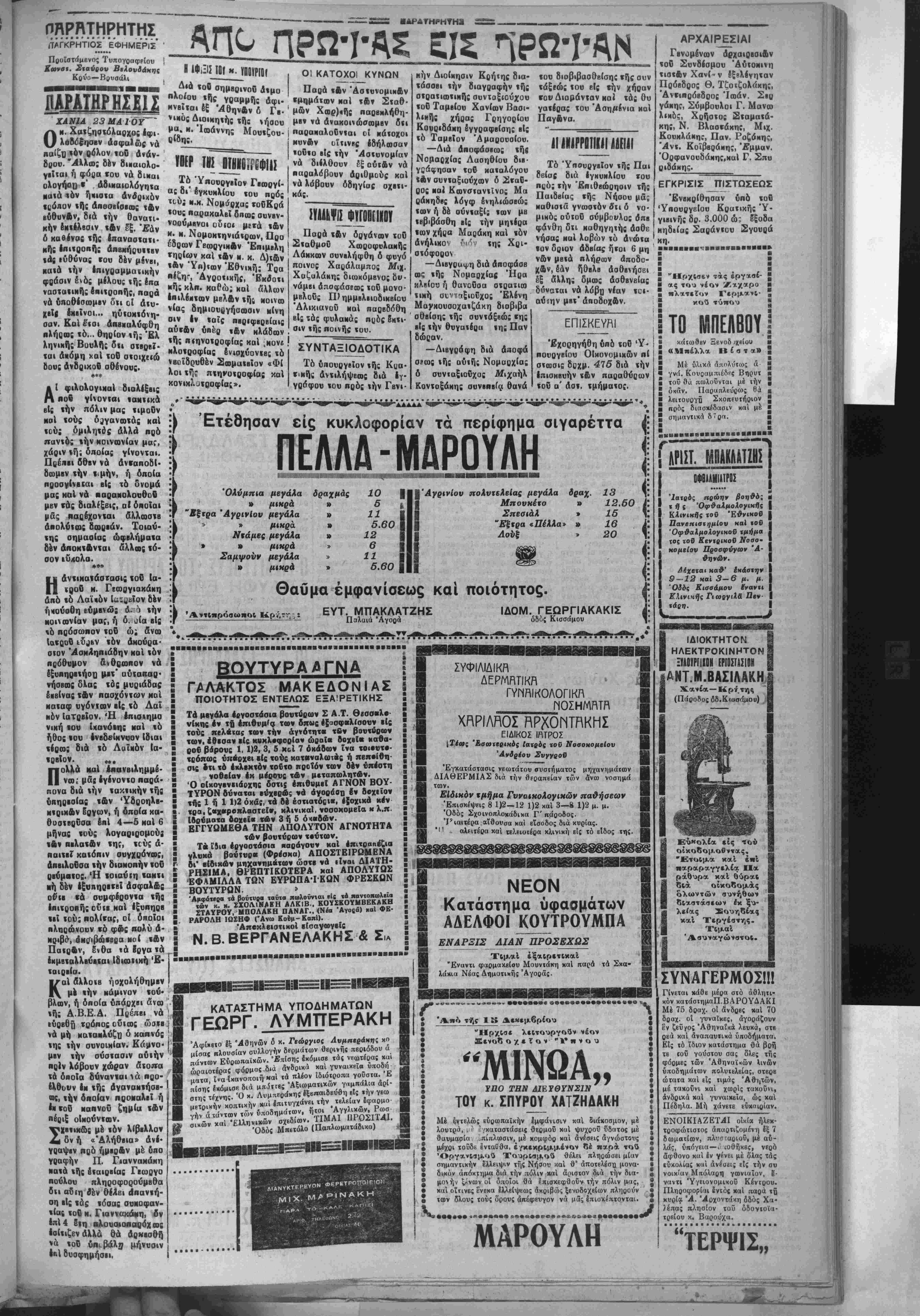 ΑΘΗΝΑΙ 22 Μαΐαν (ΐανά%ΐ<κ-0Μριτ·ΰ μας).— Ό Κα θηγητής το€ Σννταγματικοΰ Δικαίαν κ. Σβώλος ίίς τόν οποίον ετέθη τό έίώιημα εάν ή γβνομένη ποοχθές νέα δια κοπή των εργασιών τής ΒουΗς πό ε ά ιήν δρνηβιν τής "Αντιπολιτεύσεως πρός τοδτο ιΐναι νόμιμος έγνοομάτβνσιν δτι ή διακοπή αυτή χαρακτηρίζβται ώς κατάχρησις έξου οίας. ΑΗΛαΣΕΙΣΐΟΤκΓκθΝΑΥΛΗ Είς τάς σημββινάς πρωϊνάς Εφημερίδας άνβγςάφηοαν οί πληροφοοίαι σνμφώνως μέ τάς οποίας ό Ύπονργός των Στρατιωτικών καϊ άρχηγός τοΰ Έβνικοΰ Ριζοσηαοτικοΰ Κόμματβς κ. Κονδύλης διιαώνησβ μέ την Κνβίρνηοιν λάγφ τής πολιτικάς την οποίαν εϋιη άκολουθΐΐ επί ώρι σμένων ζητημάτων. ΑΙ πληροφορίαι αύται ετέθησαν ύπ' βψβι τοΰ κ. Κονδυλη παρά τβν βημοσιογρίφων βίς τιύς όποίους απαντών σχετικώς διέψβυσβν ταύτας ώς άνα- κριβεΐς.____ Ό κ. ΧΑΤΖΗΚΥΡΙΑΚΟΣ" ΚΗΤηΚΡΙΜΕΙ ΤΗΝ ΠΟΛΙΤΙΚΗΝ ΕΛΑΦ ΡΟΥ ΣΤΟΛΟΥ Ό Ύπουργός (των Ναυτιχών κ. Χατζηχϋρΐάχος όμι λών σήμεο·ν πρός τούς άντιπροσωπους τού τύπον σχβτι κώς μέ την ακολουθητέαν παρά τής προκετόχον ,Κν βερνήσεως πολιτικήν τής ένισχύσιως τοϋ στόλον μας διά των ελαφρών σκαφών κατβκρινν ταύτην ώς μη σνμ φέρουσαν. ΑΙ δηλώσβις «ΰ (αι τοΰ νβυαρχου ύπονργοΰ προυξένη σαν κατάπληξιν βίς τόν πολιτικόν καί οτβατιοοτικον γενικώς κόσμον τής χώρας. ΗΜΕΙΣ ΤΟΥ κ. ΜΟΥΤΖΟΥΡΙΛΟΥ Σήμερον τα εσπέρας άνβχώ^^αό δια Κρήτης δ εύυισκό μβνος έοΐαίθα Ύπονργός Γβνικβς Διοικητής Κρήτης κ. Μοντζονρ,Ιδιτ, ΛΟΙΟ¥ ο & οί ηυβ Ηό»Ηθν μόνον φ &νω »ό ά» ά «ν».ποιι ηοΐα ίοναται ι ΟΙ ν. κ. Κο ε ο ΟΙ ΕΙ, ιυχαίως ΐιίίέί μ"ί ϊνικον ή ,11*1* 30)1 »ώα«ομ«ν την κά §ράψ ανιαπόκο ^-%<2ν* ελήφθη Τϋύ Ισιΐι μοψ άρ; καιά ιού Έλλί Ί. Μ· οί διεξήι καί μέ 6>