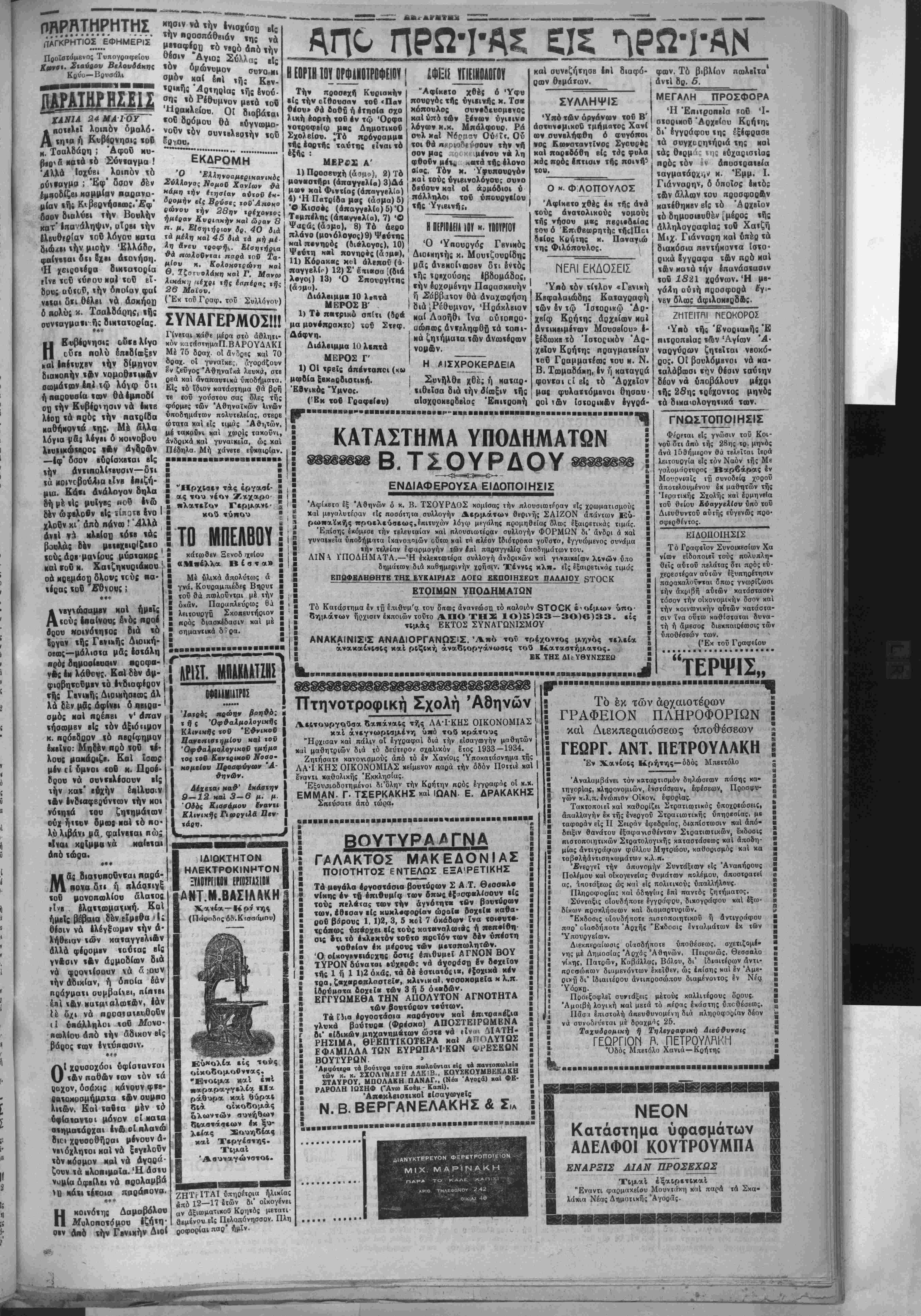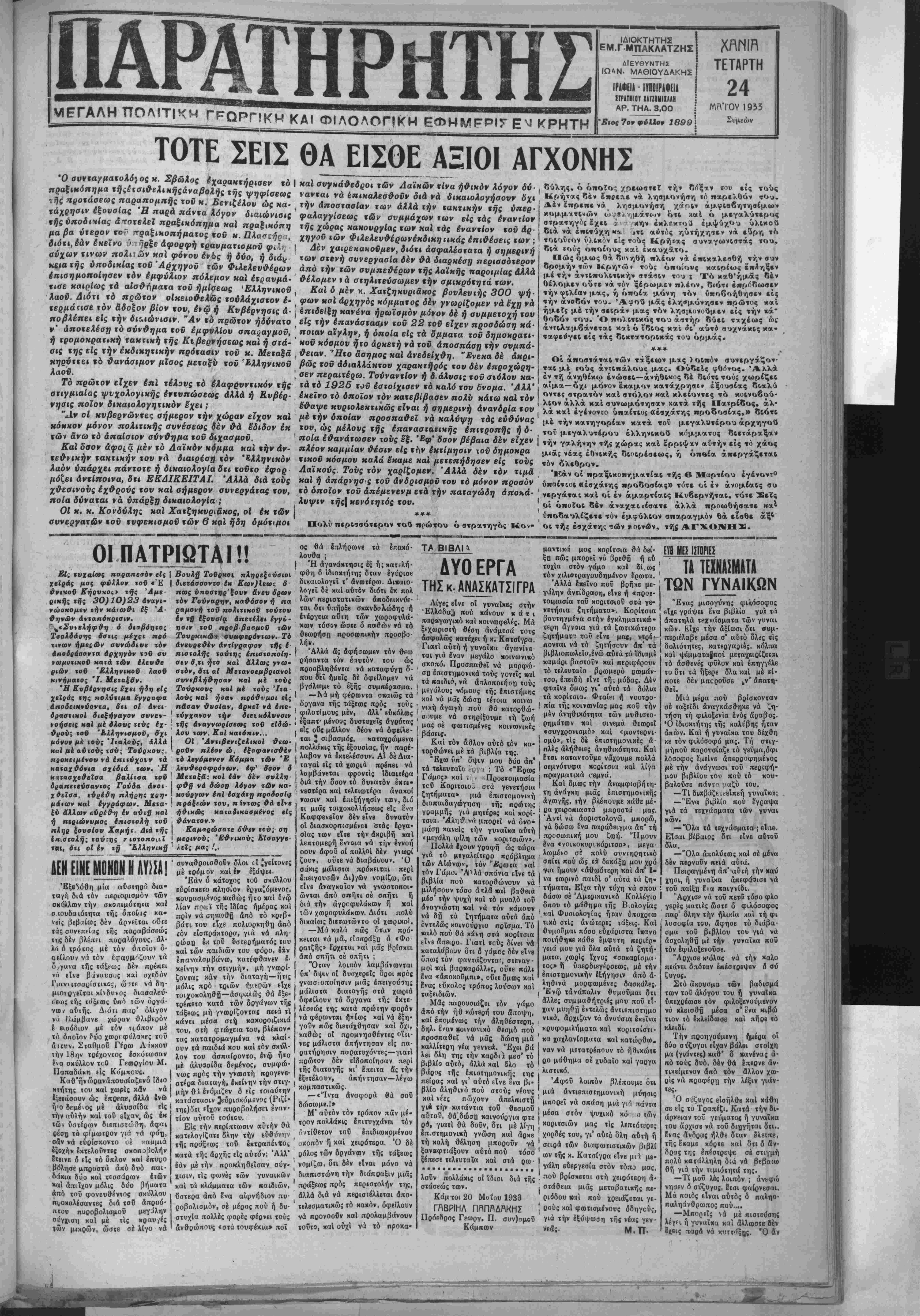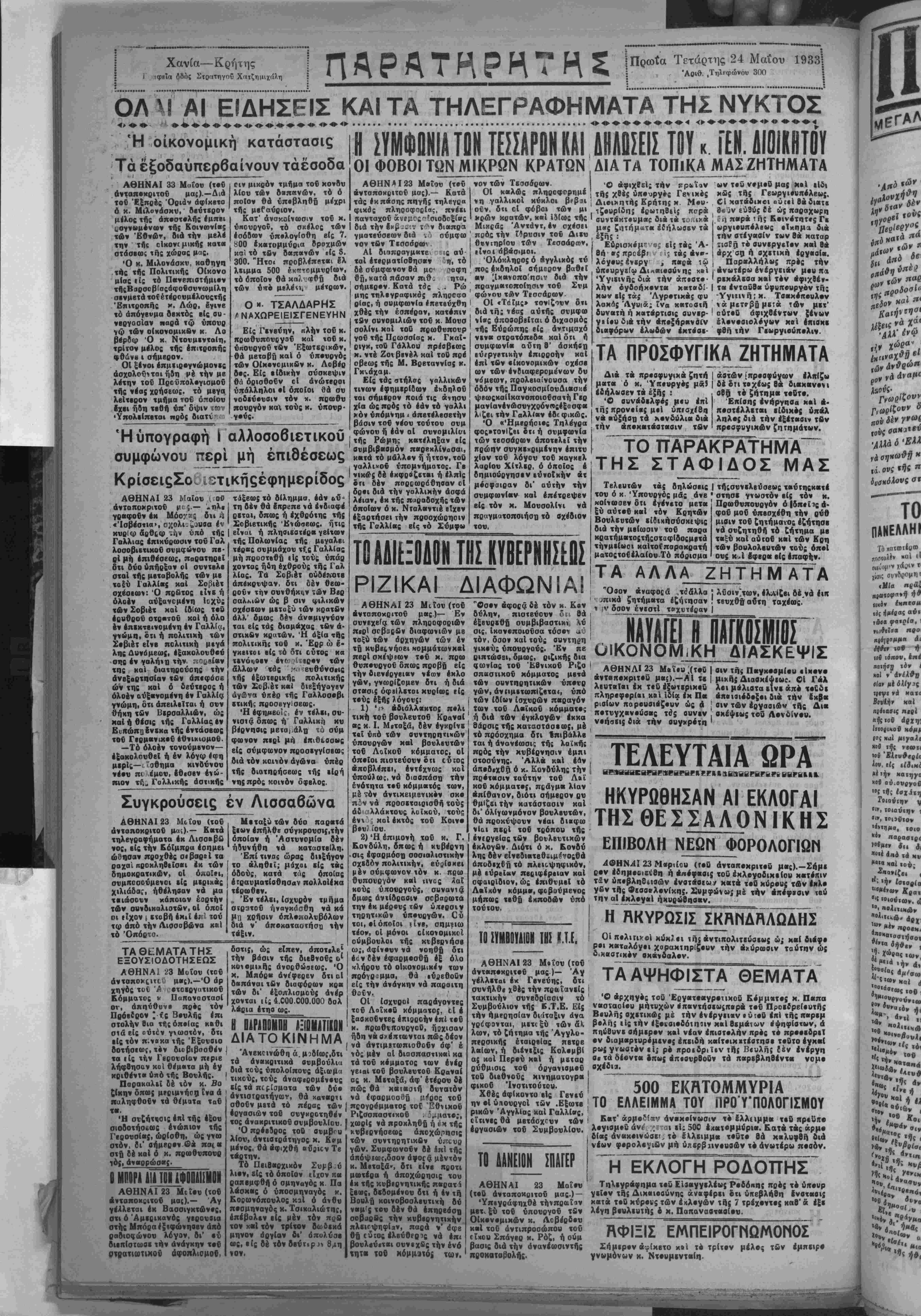 στρατηγός έχει <£"■ «ην έκλ?κτο3 έμψύχθυ ύλΐκού διά νά επιτύχη κ». ίΤι αύνός ηύτήχησεν νά εΰρη τό τοιούτον υλικόν εις τούς Κρήτας αυναγωνιστάς τού. διά τούς οποίους καί έκαυχάτο. Πώς όμως θά δυνηθή πλέον νά επικαλεσθή την συν δρομήν των Κρητώ* τούς όποίους καιρίως έπληξεν μέ την άντΐπολΐτΐκήν στάσιν τού ; Τό καθ'ήμάς δέν θέλομεν οΰ«ε νά τόν ξέρωμεν πλέον, διότι έηρόδωαεν την φιλίαν μας, ή όποία μόνη τόν ύποβοήθησεν είς την άνοδόν τού. Άφού μάς έλησμόνησεν πρώτος καί ημείς μέ την σειράν μας τόν λησμονούμεν είς την «ά* θοδόν τού. Ό πολιτικάς τού άστήρ δύεΐ ταχέως ώς άντιλαμβάνεται καί ό ΐδιος καί δι" <αύτό συχνάκΐς κα- ταφεύγεΐ είς τάς δΐκτατορΐκάς τού όρμάς. Οί άποατάταΐ των τάξεων μας )οΐπόν συνεργάζον- ται μΐ «ούς άντΐπάλους μας. Ουδείς φθόνος. Άλλά έν τή άνηθίκω ένώσει—άνήθΐκος δέ διότι τούς χωρίζει αίμα— δχι μόνον εκαμον κατάχρησιν έξουσίας διαλύ όντες στρατόν καί στόλον καί κλείοντες τό κοινοβού¬ λιον άλλά καί αυνωμότησαν κατά τής Πατρίδος, άλ· ι λά καί εγένοντο ύπαίτιος «έσχάτης προδοσέας,» διότι μέ την κατηγορίαν κατά τοΰ μεγαλυτέρου άρχηγοθ , τού μεγαλυτέρου έλληνικθύ κόμματος δΐετάραξαν Ι την γαλήνην τής χώρας καί έρριψαν αύτην είς τό χάος μιάς νέας έθνικής διοιρέσεως, ή όποία άπεργάζεται τόν όλεθρον. Εάν οί ηραξΐκοπν,ματίαΐ τής 6 Μαρτίου εγένοντο υπαίτιοι «έσχάτης προδοσίαςΒ τότε ^ί έν άνομίαΐς συ ' νεργάται καί οί έν αμαρτίαις Κυβερνήταΐ, τότε Σεϊς οί όποίοΐ δβν άναχαι.ίβατε άλλά προωθήσατε κα& ύποδαυλέζετε τόν εμφύλιον σπαραγμόν θά είσθε άξ' οί τής εσχάτη; των ϊιοΐνων, τής ΑΓΧΟΝΗΣ. ΜΜΙΜΗηΐΙΙΙΙΙΙΙΗΗΙΜΙΙΙΗΙΙΙΗΜΙΙΙΙΙΙΙΗΚΗΙΙ Ι ΙΗ!ΙΙΗ!ΙΙΙΚΙΠΙΙΗ1ΐυΐΜ|Ι|[Ι111Ι*η[»η[1ΗΙΠΜ»ΙΐηΐηΜΜ ΟΙ ΠΑΤΡΙΩΤΑΙ!! —ίί τυϊαίως ηαο.αηεο&ν είς χβϊράς μας φύλλον τσΰ «Έ Θνικσύ ΚήουΗος» τής Άμε- βικής τής 30)10)23 Λναγι- νώσκσμεν την κάτωθι έξ Α¬ θηνών άνταπάκ0ΐσιν. ρ-%«Σν*ελήφθη δ διαβόητον Τσαλδάοης όστις μέχοι ηοό τίνων ημερών βυνώδευε τόν όποδράσαντα αρχηγόν τοΰ αν νωμοΜΗοϋ καΐά των έλευθβ ριΔν τού ΈλληνΐΗθΰ λαού κινήμαΐος Ί. Μειαξθν. Ή Κυβέρνησις έ'χει ήδη είς χβΖοάς της πολύτιμα ϋγγοαφα .αποδεικνύοντα, ότι οί άντι- δραστικσί διβξήγαγον συνεν- ιοήσεις καί μέ Ολονς τβύς έχ· θρούς τού Έλληνισμοΰ, δ'χι μόνον μέ ιούς Ίταλούς, άλλά κσί μέ αύτούς τσύς Τούρκσνς, προκειμένον νά έηιτνχοχ,ν τα καταχθόνια σχέ&ιά των. Ή κατασχεθείσα βαλίΐσα τού δραπΐιεύσαν'σς Γούδα άνοι- χ&εΐσα, ενρέΰη πλήρης Χΰη· μαΐων καί εγγράφων. Μβτα- ξύ άλλων βύρέ&η έν αύι# καί ή περιώννμσς έπιστσλή τού ηΧηβ ςΌνοίον Χαμήί. Διά τής έπισΐολή; ιανιης πσταηοαϊ ται. ότι οί έν τή Έλληνικβ Βονλβ Τούρκαι πληρεξούσιοι διετάσσσντσ έκ Κων(λεως ό πως ύποστηρ'ξσυν άνευ ό'ρων τόν Γον*αρην, καθόσον ή ηα ραμονή τού πολιτικόν" τούτου έν ΐ0 έξουσ/α άπετέλει εγγύ¬ ησιν τού π0θβ<βασμο{) των Τουρκικών συ«φ«βόνιων. Τό άνευρεθέν αντίγραφον τής έ πιστολής ταύτης έηιατοηοίη- α εν ό,τι ήτο καΐ άλλως γνω¬ στόν, ότι αί Μετανσεμβριανοί συνεβλήθησαν κα) μέ τούς Τούοκσυς καί μέ τούς Ίτα λούς καί ήσαν ηοόΰνμοι είς ηάααν θυσίαν, άρκεί νά έπε· τύνχανον τή·* διεικόλυνσιν τής άναγνωοίσεως τού είδώ- λσυ των. ΚαΙ κατόπιν... ΟΙ Άντιβενιζελικοί θεώ- ρσύν ηλέον ώ, έξσφανισθέν τό λεγόμενον Κόμμα των Έ λευθεοοφρόνων, έφ' όσον ό Μεταξάς κοί εάν όέν συλλη- φθ0 νά δώσο λόγον των κα- κούογων έηΐ εσχάτη ποσδοσ/νι πράξΐών τού, π ίνιως θά είνε ήθικώς καΐαδικασμένσς εί; θάνατον » Καμαρώσατε 6ΰ·εν τού; οη μεοινούς Έθνικούς Βΐααγγε- /είς μας !.. ΑΕΗ ΕΙΗΕΜΟΗΟΗΗ ΛϊίίΑ! μία αΰσ