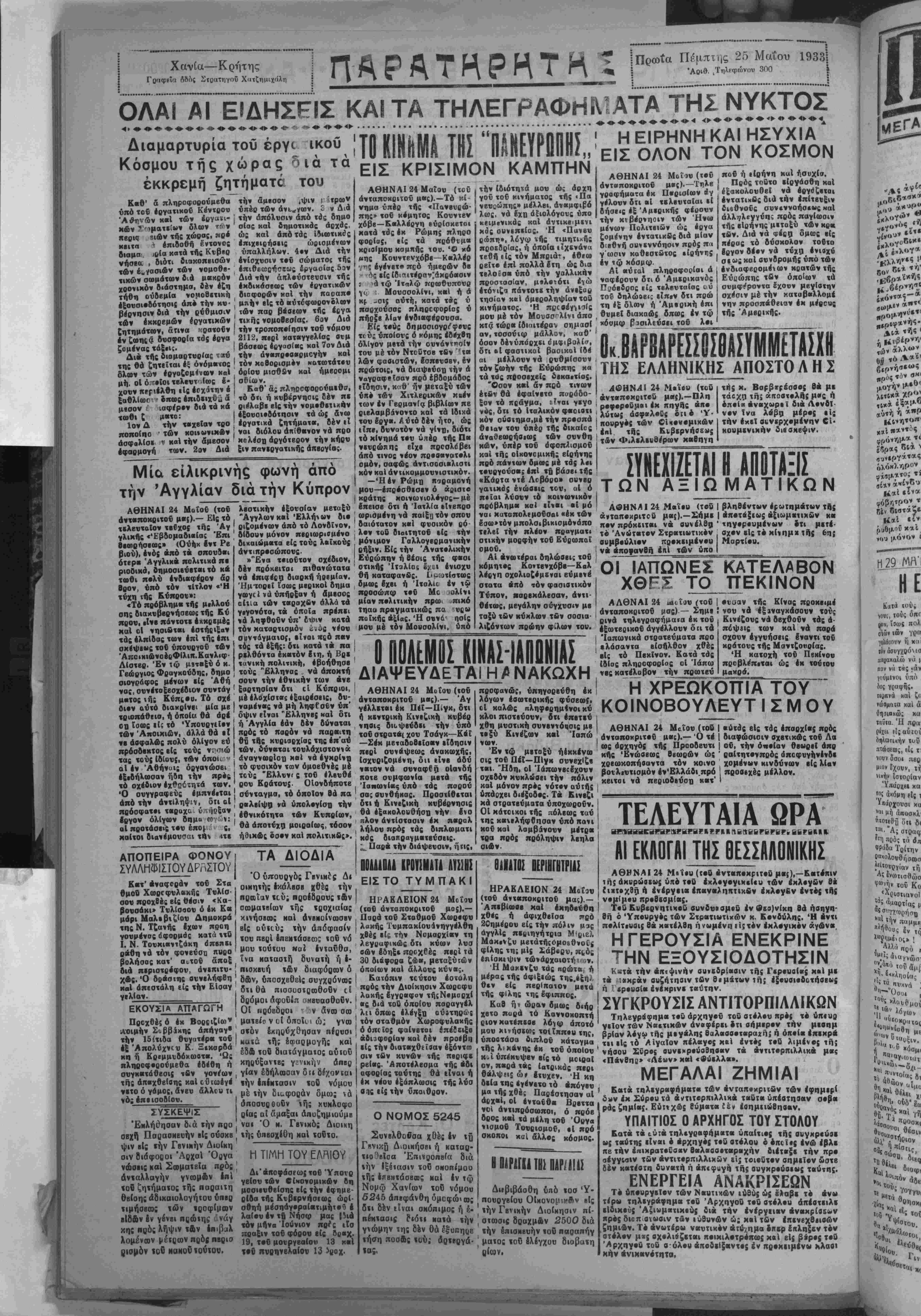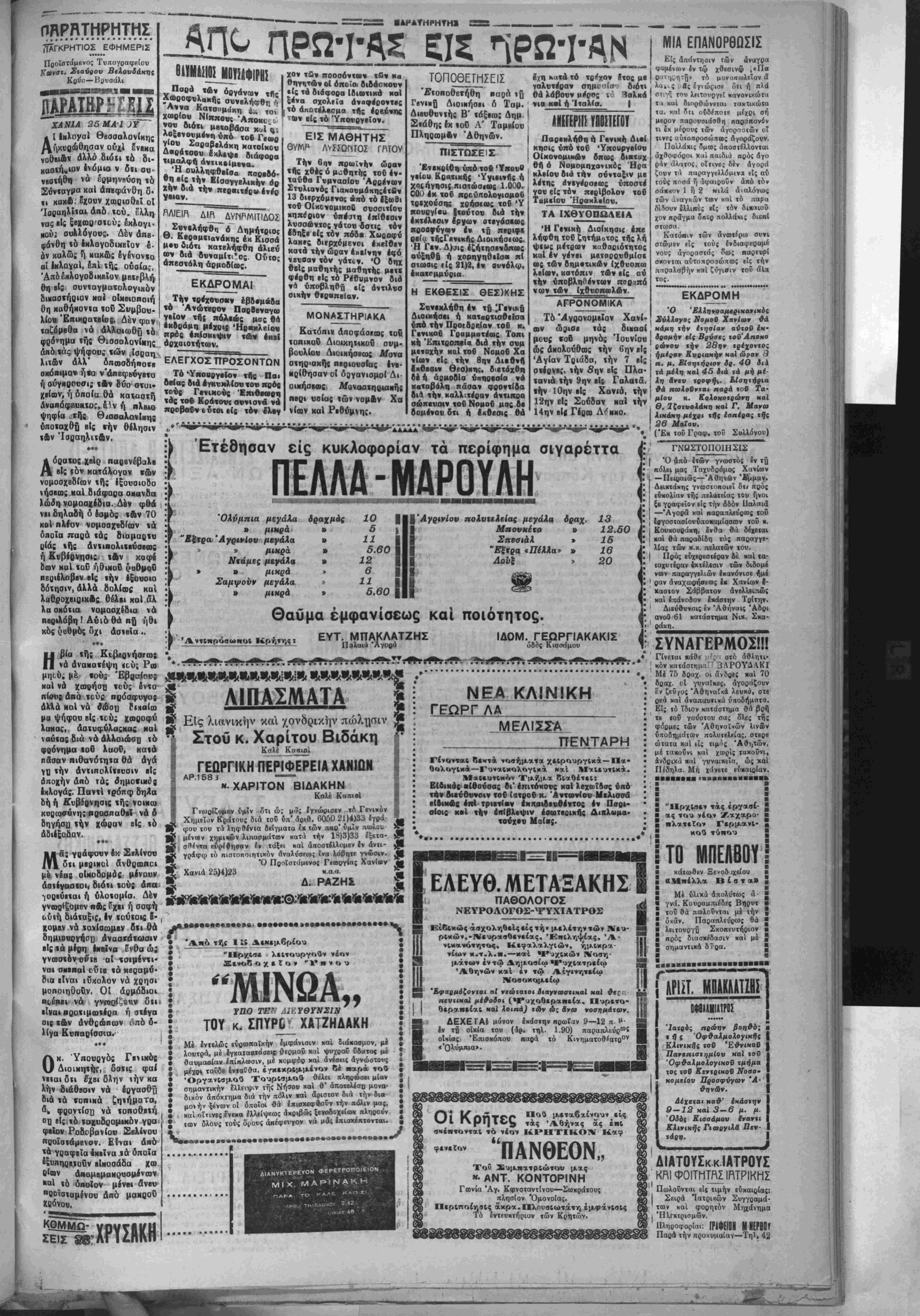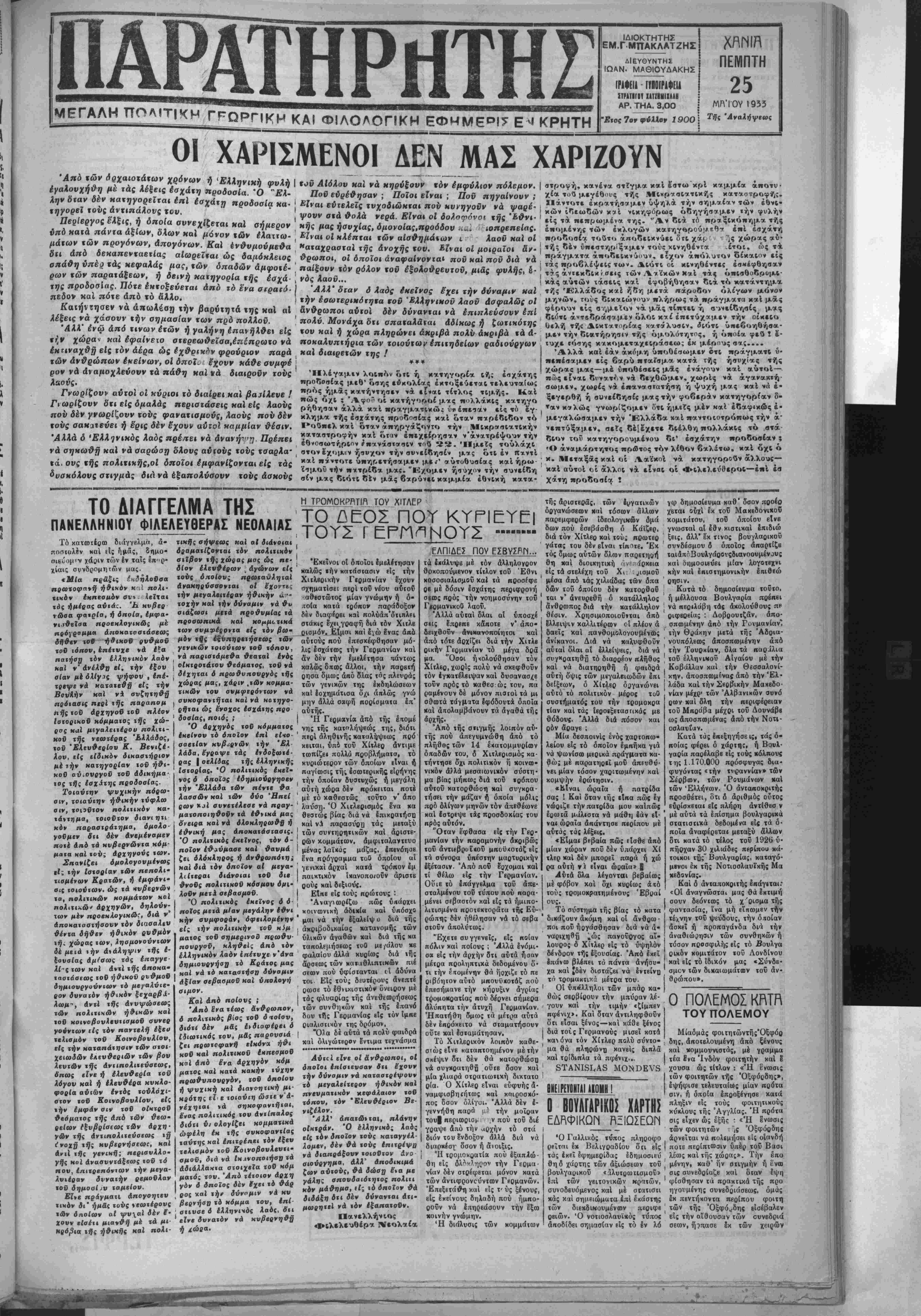 ' χύί%ν λ φ° 1° <τ'βΡε«θεΐσα,επεπρω«ο νά ποκαλυπιήρια των τοιούτων επιτηδείων ραδιούργων τυχε εόσης κακομεταχειράσεω; έκ μέρους σας___ εκπναχθή είς τον αέρα ώς εχθρικήν φρούριον παρά κα διαιρετών της ! Άλλά καί εάν άκόμη υποθέσωμεν ότι πράγματι ύ- «ών άν&ρώπων έκείνων, οί δποϊ^ έ'νουν κάθε ανμφέ ' * ♦♦♦ πεπέσαμεν είς βαρύ πταϊσμα κατά τής ήσυχίας τής οί δχι είς ομαλάς περιστάσεις «αί είς λαονς γνωρΐζονν χονς φαναχιομούς, λαονς πον δέν χονς σακϊΐεύει η έρις δέν £χουν αύτοι καμμίαν θέσιν. Άλλά ό ΈλληνΐΗΟς λαός πρέ/ΐει νά άνανήνη Πρέπει νά σηκωθή καί νά σαρώση δλονς αΰϊονς «ούς χσαρλα- «ά, ούς «ής πολιτικης,οί δποϊοι έμφανίζονται είς τάς δυοπόλονς στιγμάς διά νά έξαπολύσονν «ούς άοκονς ΙΗΙΙΙΙΜΗηΐυΐΙ ΙΠΐηΐΙΗΙΙΝΙΙΙΙΙΙ ΗΙΜιΙΙΙ1ΙΜΜΙΙ»ΒΙΦΒΙ·ΚΙΗΙΙΙΙΙΙ<»Ι11ΙΙΙ(ΗΙΐαΗΙΙπ1 ΤΟ ΔΙΑΓΓΕΛΜΑ ΤΗΣ ΠΑΝΕΛΛΗΝΙΟΥ ΦΙΛΕΛΕΥΘΕΡΑΣ ΝΕΟΛΑΙΑΣ Τό κατωτέρω διιίγγελμα, ά- ίτοσιυλϊν καί ίΐς ημάς, δημο- οι&ιίομ'-ν χάοιν των έν ταίς έπ"ρ· χίαις σννδρομητΓΟν μας. €_!ία πράξις ■'ηϋηλούσα ποωτοφηνή ηθικόν κ Λ πολι¬ τικόν εκπεσμον αν χ Ιεΐται τας ημέρας αύτάς. '_ πνβεα ιώσα φατρία, ή όηοία, έμφα- νι ιθβΐσα ηοοβχλογικώς μέ πρό]ρομμα άποκατοστάσεαις δήθεν τού ·ή$ΐΗθϋ ρυ&μοϋ τού ΐόπου, επέτυχε νά έ*α πατήση τόν ελληνικόν λαόν καί ν' ανέλθη εί, την έξσυ σίαν μέ ολίγας ψήφον , έπέ· τοεψβ νά κατατεθή είς την Βουλήν καί ν! συζητηθή ηοό%ααις πεβ» τής παοαηομ ηήςτοΰ άρχηγοΰ τοΰ ηλέον ίστσοικσύ κόμματσς τής χώ¬ ρας καί μεγαλειτέρον πολιτι- κοΰ τής νεωτέρας Ελλάδος, τού Ελευθερίου Κ. Βενιζέ¬ λου, είς είδικόν δικαστήριον μέ την κατηγορίαν τού ήθι- κού αν,,ονογοΰ τοΰ άδικήμα- τος τής έσχϊτης ηαοδοσίας. Τοιαύτην ψυχικήν πόρω- σιν, τοιαύτη* ηθικήν ΐύφλω σιν, τοιούτον πολιτικόν κα· ΐάντημσ, τοιούτον διανι τ)τι κόν παραστοάτημα, ομολο¬ γούμεν Οιι δέν άνεμέναμεν ποτέ άπό τα κνββρνώντα κόμ- ματα καί τούς άρχηγσύς των. Σπανίζει όμοΐογονμένως είς την ίστορίαν των πεπολι- τίσμένων Κρατών, ή εμφάνι¬ σις τοιούτων, ώς τα κνβεονών τα, πολιτικών κομμάτων κοί πολιτι^ώ" άρχηγών, δηλούν- των μέν ποοεκλογικώί1, διά ν' άποκατσστήσουν τόν διασαλευ θέντα δήθεν ηθικόν βαθμόν »ή. χώρας των, λησμονούκτων δέ μβιά ι ήν ανάληψιν τής έ- ξουσίας άμίοως. τάς έηαγγε λί-ς των καί άντί τής άποκα- ταστάσεως τού ήθικού ονΰμοϋ δημιουργούνιων τό μεγαλύιε- ρον δυνατόν ηθικόν ξεχαρβά- λωμ-', άντί τής άνυψώσεως των πολιτικών ήθικών καί τού κσινοβονλευιισμού συνερ γούντων ιΐς τόν παντβλή έξε<; τελισμόν τού Κοινοβούλιον, είς την καταπάτησιν των «τοι χειωδών έΛευθεοιών των βου λευτών τής αντιπολιτεύσεως, όπως είνε ή ελευθερία τού λόγον καί ή ελευθέρα χυκλσ- φορία αύι&ν έντδς τουλάχι¬ στον τού ΚοινοβονλΙον, είς την έμφάν σιν τού σΐκτοσΰ θεόματος τής άπό των θεώ- οείων Ιξνβοίοεως των άοχη· V ών τής αντιπολιτεύσεως »ή" Γ'νοχη ·9· κυβερνϊίσεω^, καί άνιί τής γενική; περισυλλο- γής κοί ανασυντάξεως τού τό που, έπιτοεπόνιων την μενα- λυιέβαν δυνατήν οεμοΰλαν τού δημοσίου ταμείου. Είνε πραγματι άπογοητευ τικόν δι* ημάς τούς νεωτέρονς των οποίων αί ψυγαί δέ» έ· χούν εισέτι μιανθή μέ τα μι- Ηοόβια τής ήθικής καί πολι- τικής σήψεως καί αί διάνοιαι δοαματ/ζονται τόν πολιτικόν στίβον τής χώρας μας ώς πε· δίον έλευθέρων . άγώνων είς τούς ΟΛθΙον· πρακαΰΛηΐαΙ άνακηρύσσονται οί έ'χοι-τβς την μεγαλειτέρον ηθικήν α ■· τοχήν καί ιήν δύναμιν νά θν σιάζωσι μετά προθυμίας τα ποοσωπικά καί κσ^μοτικά των συμφέβοντα είς τόν βω¬ μόν τίς έζυπηοετήσεως των γ εν ι* ώ* τοιούτων τού τόπ
