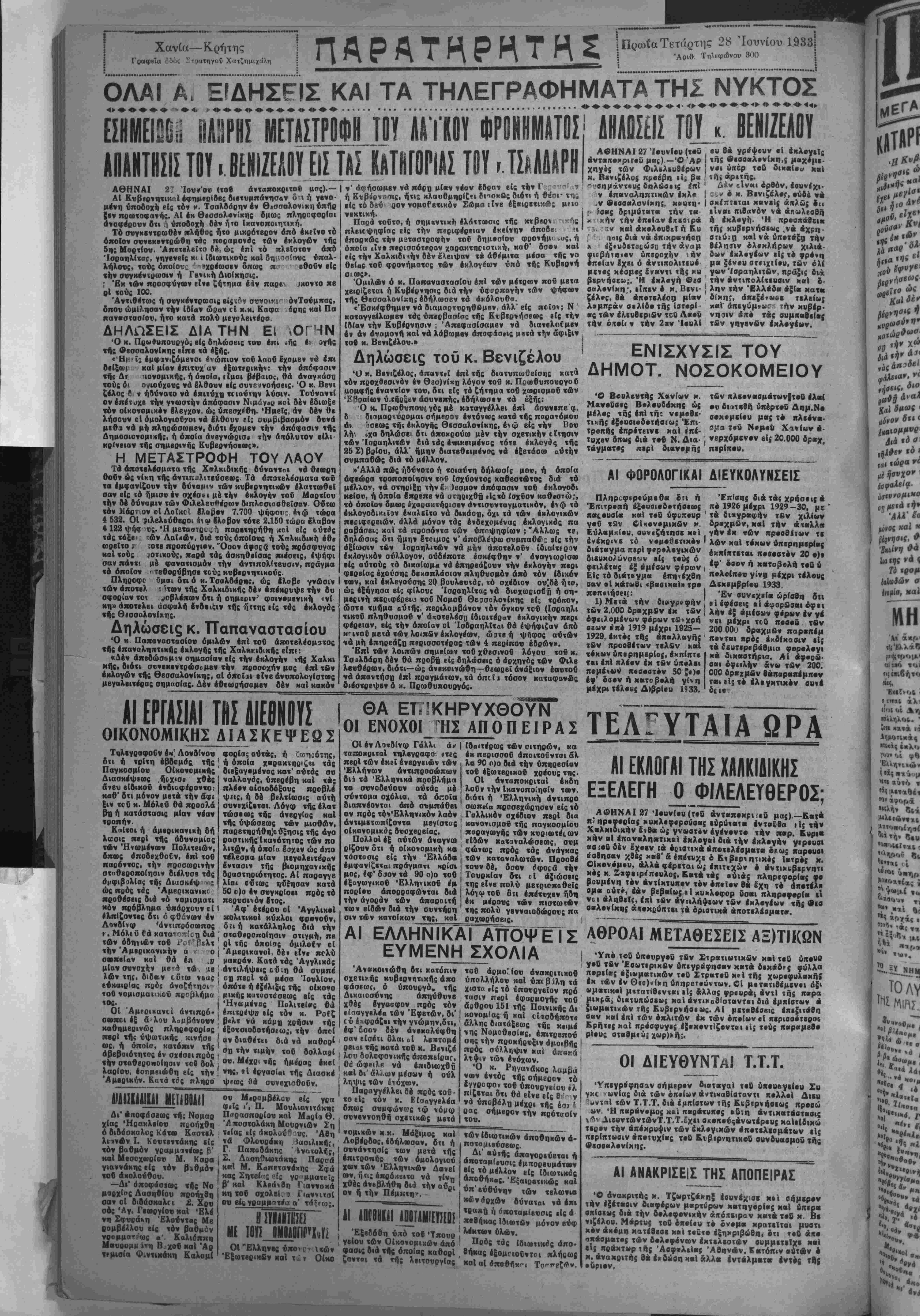 'Κ*ο(7οψ φύλλον 1924 Κΰ°ου '1™<νου ΤΕΤΑΡΤΗ 28 ΙΟΥΝΙΟΥ 1935 ΩΡΑΙ ΑΓΩΝΙΑΣ Ή Ελλάς διέρχεταί ι άίσα; δεινης άγωνίας. ΑΙ εκλογαί της Θεσσα¬ λονίκης επίκειται καΐ τα ηόμματα ξ,ριψαν όλας • ών τάς δυ»άμεις είς ΐόν ατϊβον. ΑΙ 20 εδραι είνε γέρας ηρώχης τάξεως δι' αμφοτέρας τος ηαραχά ξεις. Ή νίκη κατά κάς εκ¬ λογάς αύτάς είνε ζήτημα ζωής παΐ θαιάτσυ Μ,αΙ διά «ούς μέν καΐ διά χονς δέ. Ή Κυβέρνησις μειώκοι σεν εί; Θεσσαλοι ί«ην άλλά καΐ η άν γ ι πό λ. τε υ σις σύσσωμος σνρρέει έκεϊ.Μληύι ή μετοικεσία Βαβυλώνος....Κανείς δέ ν δύναται νά προΐδη δχι τδ άποτέλεσμα τής έκλα» γής, τό δή Χον πάσαι αί παρανομίαι καί τού κό σμου αί καΐποισθεύσεις καί ή μεσαιωνιχή τρομο- ΜρατΙα δέν μπσρσΰν νά τό άλλάξονν, όπως δέν γνρΐζει πίσω τού ποτα· μοΰ ιό ψερό, άλλά τί μπο ρεϊ νά συμβή άπό ώρας είς ώραν άπό ημέρας είς ημέραν...Μέ την καρδίαν συνεαφιγμένην αα την όναπνοήν σνγ*ρατημένην όλόκλήρος ή Ελλάς στρέ φεΐ τα βλέμμαιά της πρός χό πεδίον τής μάχης, την Θεσσαλονίκην. Ή Κυβέρνησις χρειά £εται την πλειοψηφίαν των 20 έδρών δχι τόσον διά νά αυξήση την πλειο¬ ψηφίαν ης, δχι τόσον διότι της χρειάζεΐαι διά * ά εργασθή, όσον διά »ά ένισχύστ) την ανωμαλίαν την οποίαν έδημιούργη σεν, διά νά δυνηΰβ καΐ •ην Γερουσίαν νά θεσ» έπποδών καΐ (ά Συμβού λια της Έπικραιείας »ά άχοησεεύση «αί πάσαν φω-ήν αντίθετον νά κα ταπιΐξΐ]. Θέλει τοϋς 20 βουλευτάς διά «ά * γσ- σθή, όπως εκείνη ϊέλει, διά νά δράαουν αέ μέγα λυ τέραν ελευθερίαν τα έκτελεστικά άποοπάσμα- χα, διά νά μπορή νά Ιαχυ ο έεται δτι έλαβεν άφεαιν άμαριιών διά την δολο- φονίαν τής δδοϋ Κηφιθ σία;, ηοΧ δι' όλας «άς μέ- χ>ι τούδε άνομίας της.