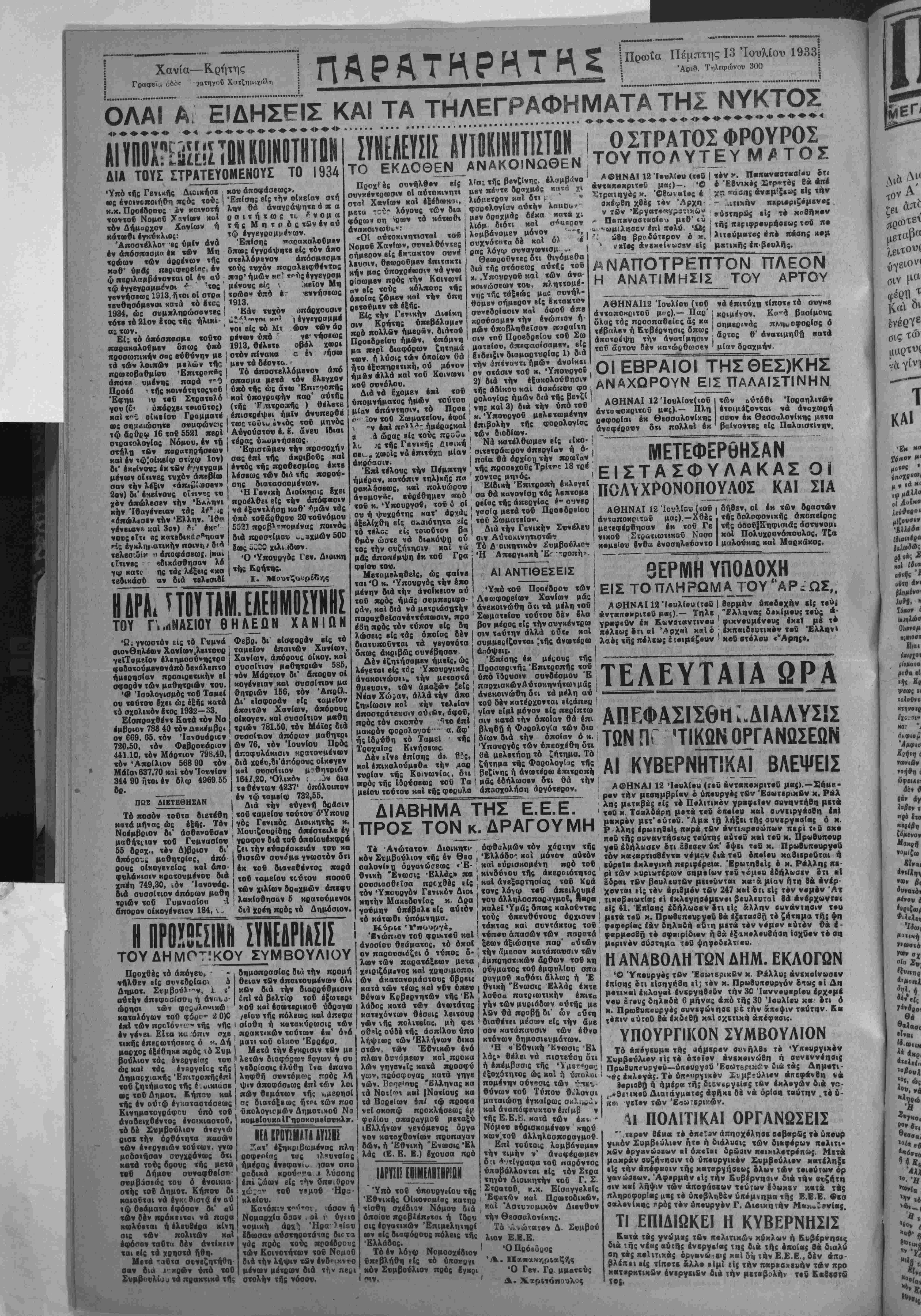 Νομαρχία δσον , αί ι< ύγίΐο νομική άοχν, Ήρα ?^ίον Ιδωσαν αύστηροτά.ας βκτα γάς πρός «ούς προέδρους «ών Κοινοτήτων τοδ Νομοΰ διά «ήν λήψιν «βν ένδ^ικννο μένων μέτρων διά την στολήν τής νόσον. Τ· Ανώτατον Διοικητι¬ κόν Συμβούλιον «ής έν θεσ σαλονί«ΐ) οργανώσεως <Έ· Ονικτι "Ενωσις -Ελλάς» πά ρουσιασθ(ϊαα πρΕχθές ιίς «όν Υπουργόν Γενικόν Διοι κητήν Μαχεδονίος κ· Δρα γούμην υπέβαλε είς αυτόν τό κάτωθι ύπόμνημα. Ι Κύριε Ύπουργέ, Ι Ίνώπΐον τοΰ φρικτβΰ καί Ανοσίου θεάματος, «ό όποί όν παρουσιόζβι ό τύπος δ- λων των παοατάξεων μετα χειοιζόμ·νος καί χρησιμοποι ών άκατανομάστονς υβρείς κατά των τέως καί νδν ύπεν θύνοον Κοβερνητών τής Έλ λάδος κατά «ών άνωτάτας κατεχόντων θέσβις λειτουρ γών νής πολιτείας, μή φεΐ οτ}°ίς ουδέ τής άσπίλον υπο λήψεως των Έλλήνων δικα στών, των Έθνιχών ένό πλων δυνάμεων κσΐ.προκα λών γηγενεΐς κατά προοφύ γων, πρόσφυγας κατά γηγβ νών. Βο*]ε«ηνς "Ελληνας κα τα Νοΐί^ν καί |Νοτίονς κα τα Βορεΐων επί τώ προφα νεΐ σκοπώ προκλήσεως έμ φυλΐου . σπαραγμοΰ μεταξύ ιΕλλήνων γενόμενος δογα νόν καταχθονίων προπαγαν δών, ή ΈΟνική Ένωσις Έλ λάς (Ε. Ε. Ε.) έχουσα πρό ΙΔΡΥΣΙΣ [ΊΗΜΕΑΗΙΗΡΙΟΝ "Υπό τοδ ΰπουογίίου τής Έθνικής Οίκονομίσς κατηρ τίοθη σχέδιον Νόμον διά οποίον ποοβλέπ·ται ή Ιδρυ σις έργατικών Έπιμβληιηρί ών είς δισφόρονς πόλεις «ής Ελλάδος. Τόέν λόνφ Νομοσχέδιον υπεβλήθη «Ις «ό ύη κόν Συμβούλιον πρός όφθαλμών τόν χάρτην τής , Ελλάδος καΐ μόνον αυτόν , καί εύρισκομένη πρό τοδ , κίνδυνον τής άκερσιότητος καί άνεξαρτησίας «οδ Κρά «ονς λόγφ τβΰ άπειλονμέ νόν Αλληλοσπαραγμοΰ, λάρα καλβϊ Υμάς δπως καλοδντες «ούς ύπβνθύνονς άρχισυν τάκτας καί συντάκτας «οδ τύπον άπασών των παρατά ξεων άξιώσητε παρ' αυτών { την άμεσον κατάπανσιν των , έμποηστικών δρθων τοΰ κη ρύγματος τοδ εμφύλιον σπα οαγμοδ καθότι δλλως ή Έ Ι θκική "Ενωσις Ελλάς έχτε λοΰσα πατριωτικήν έπι«α γήν «ών μνριάδων ού τής με λων θά προβή Βι' ών οΰιη διαθέτει μέσων είς την άμβ σον κατάπαυσιν των έθνο κτόνων δημοσΐευμάτων. •Η «Έθνικη 'Κνωσις Έλ λάς» θέλει νά πιστεύση δτι ή επέμβασις τής ' εξοχότητος ώς καί ή πομένην ούνσις των θύνων τοδ Τύπον θ,'λογοι ματαιώση εγκαίρως σκλ.ΙΗ», καί Αναπ^φενκτον έκίμβ ν τής Ε.Ε.Ε. κατά των έκν » Νόμον ευρισκομένων κηρύ κων.τοδ Αλληλοσπσοαγμοδ· Επί τούτοις λαμβάνομεν την τιμήν ν* Αναφέρωμεν Οί *ντίγραφα «οδ παρόντος υκοβάλλονται είς τόν Στοα «ηγόν Διοικητήν «οδ Γ. Σ. Στρατοδ, κ.κ. Είσαγγελεΐς Έφβτών καί Πρωτοδικών, καί ΆστυΎομιχόν Διευθυν την Θεσσαλονίκης. ϊό Α.ώτ«ΐ·ν Δ. Σνμβού λιον Ε.Ε.Ε. *Ο ΪΊηΑ ** Ά. Παπακηρΐαζής Ό Γεν. Γο μματεύ; Δ. Χαρΐτόπουλος ΜΕΤΕΦΕΡΘΗΣΑΝ ΕΙΣΤΑΣΦΥΛΑΚΑΣ Οί ΠΟΛΥΧΡΟΝΟΠΟΥΛΟΣ ΚΑΙ ΣΙΑ ΑΘΗΝΑΙ 12 Ίονλίόϊ (<οδ | δήθβν, οί έκ των δραστών άνταποκρ'.του μας).—Χθές . τής δολοφονικής Αποπείρας μετεφέρθησαν έκ «οδ Γβ Ι «ής όβοδΙΚηφισιάς Αστννομι νικοδ Στρατιωτικοΰ Νοσο Ι κοί Πολυχρονόπονλος, Τζα κβμε^ου ένθα ένοσηλεύοντο Ι μαλούκας καί Μαοκάκος. ΘΕΡΜΗ ΥΠΟΔΟΧΗ ΕΙΣ ΤΟΠΛΗΡΏΜΑΤΟΥ'ΆΡ^ΩΣ,. ΑΘΗΝΑΙ 12 Ιουλίου(τβδ Ι θερμήν ύηβδβχήν είς τού, άνταπβκριτβϋ μ«$)-— Τηλΐ "Ελληνας δε>ίμους τβύς «-