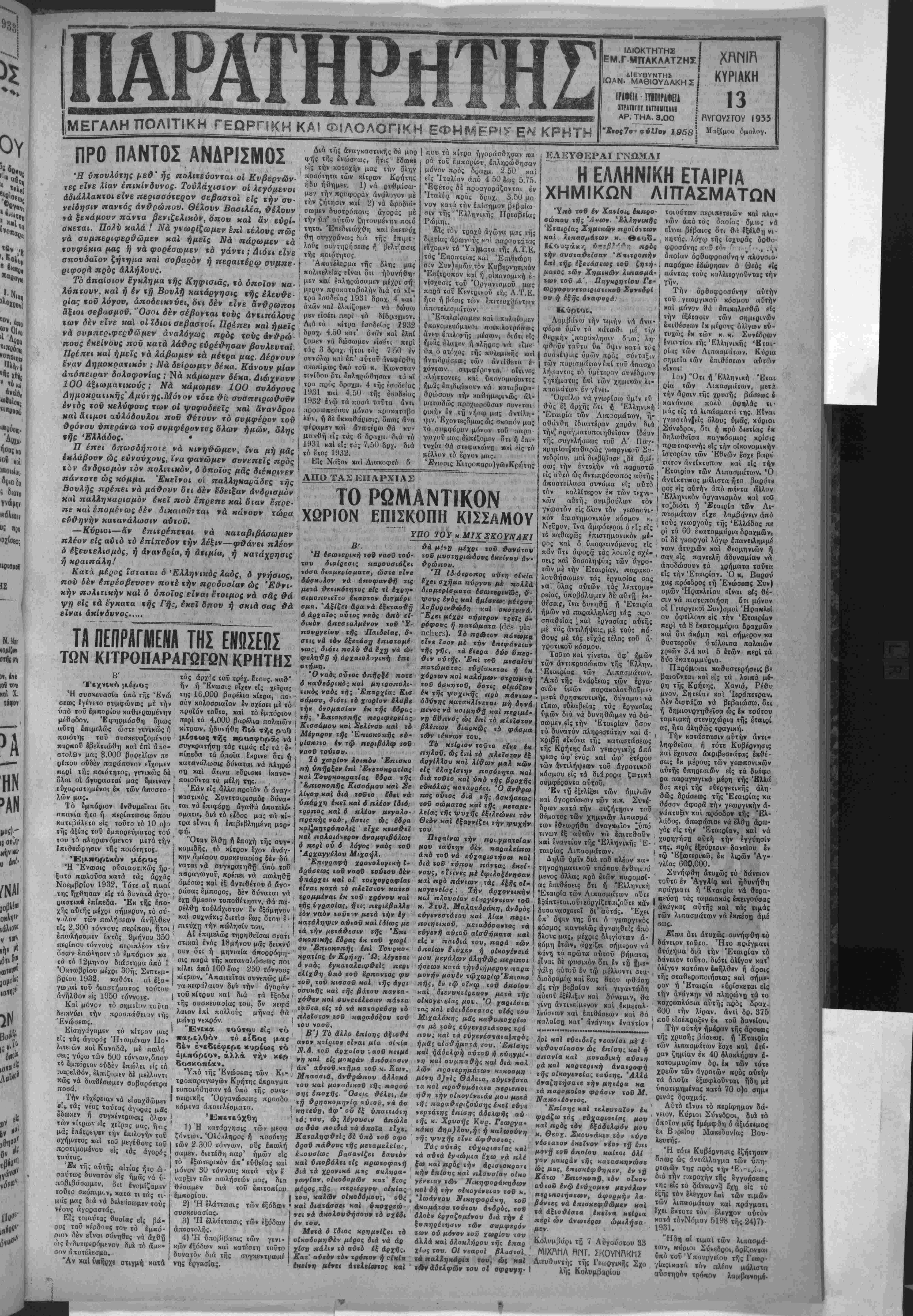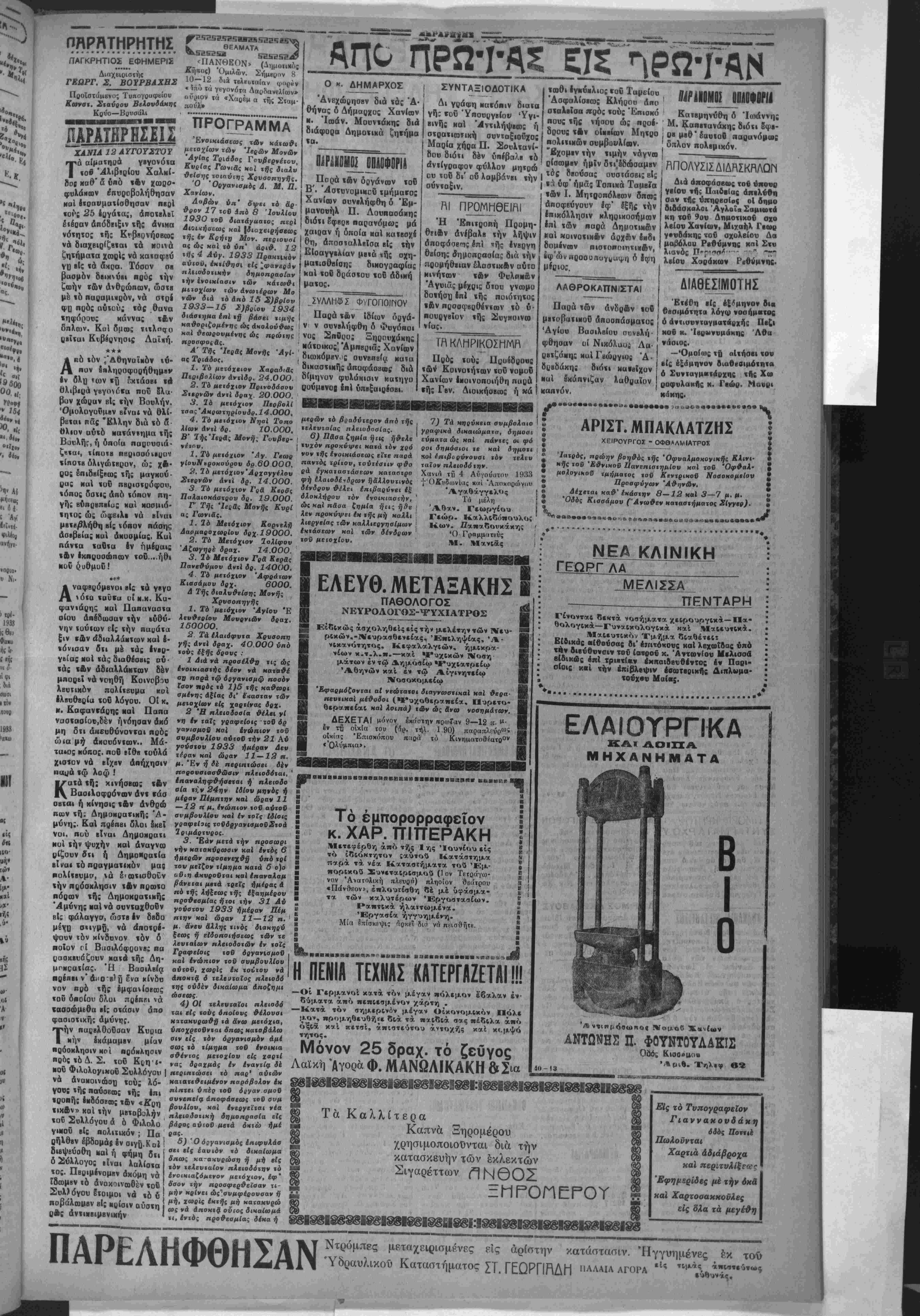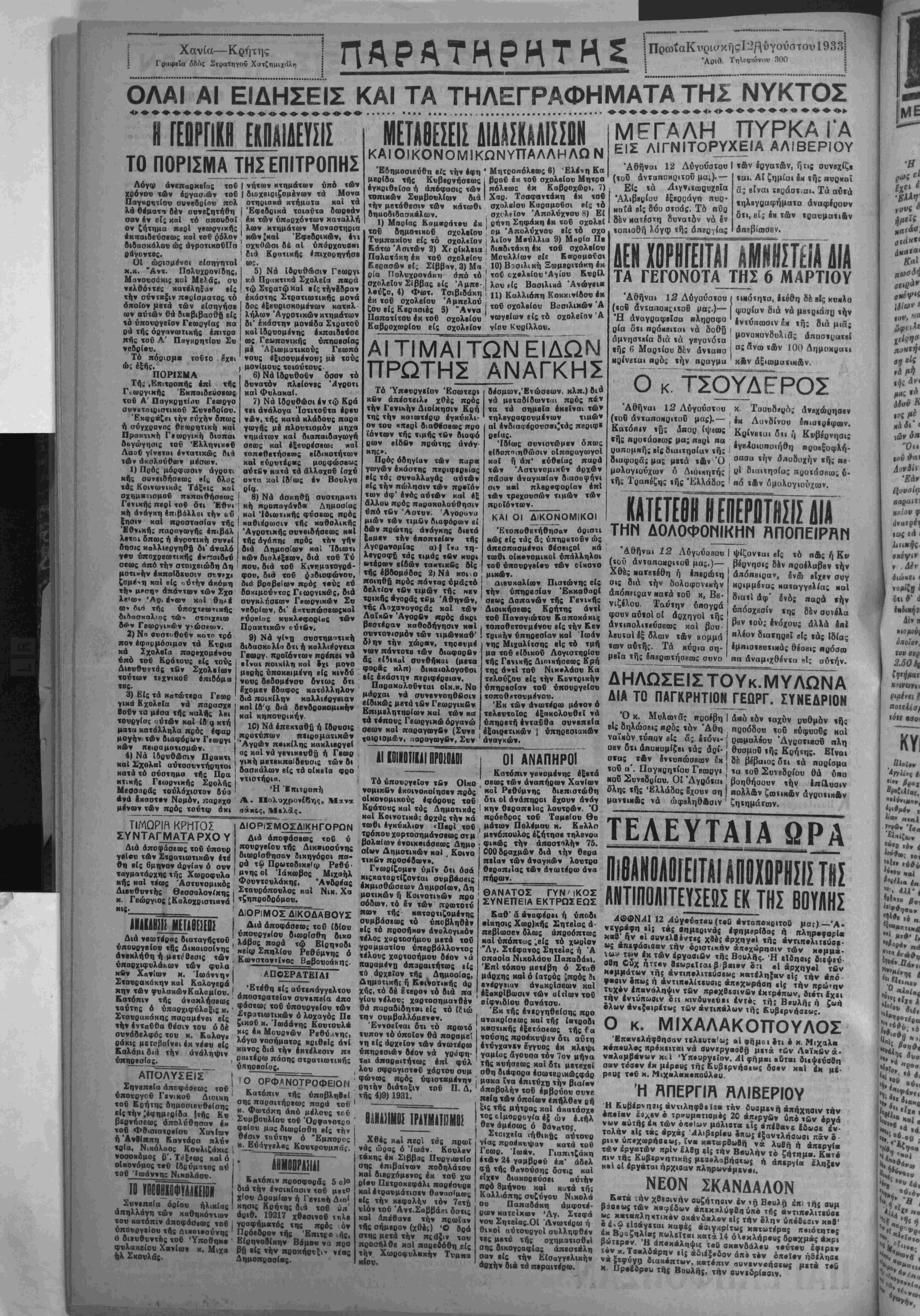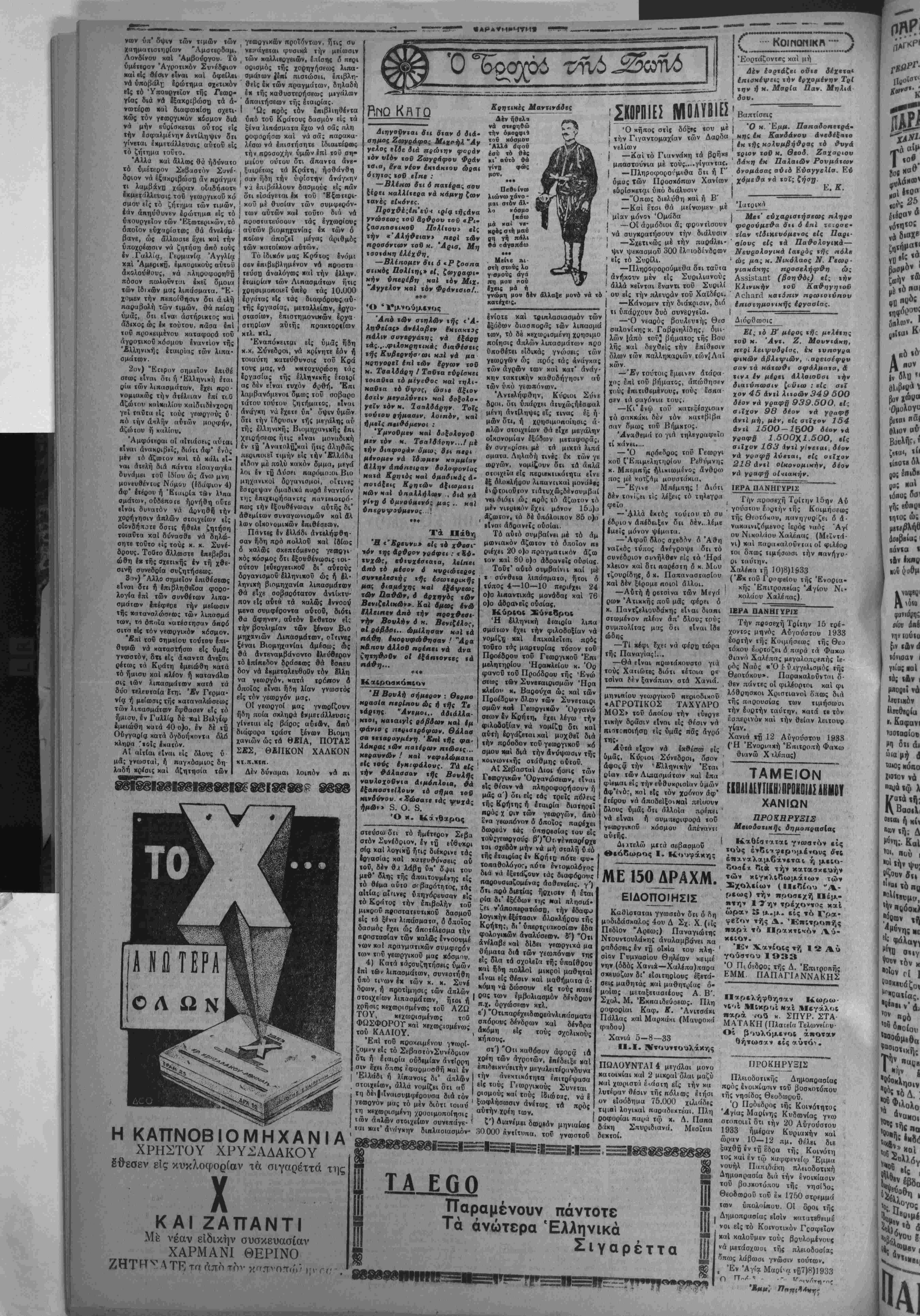 σπουδαίον ζήτημα και σοβαρόν ή περαιτέρω σνμπε· < ριφορά πρός αλλήλους. | Τό απαίσιον έ'γκλημα χής Κηφιαιάς, χό οποίον κα- λύητουν, καί ή έν τ$ Βουλί} κατάργησις χής ελευθε¬ ρίας τοϋ λόγον, άποδεικνύει, δνι δέν είνε άνθρωποι αξιοί σεβασμόν. "Οαοι δέν σέβονται τούς άντιπάλους των δέν είνε κα οί ϊδιοι αεβαστοί. Πρέπει καΐ ήμεϊς νά σνμπεριφες&ώμεν αναλόγως πρός τονς άνάρώ- πους έκείνονς ποϋ καχά λάθος ευρέθησαν βονλευταί. Πρέπει καί ήμεϊς νά λάβωμεν χά μέχρα μας. Δέρνουν έναν Δημοκρατικόν ; Νά δείρωμνν δέκα. Κάνουν μίαν απόπειραν δολοφονίας ; Νά κάμωμεν δέκα. Διώχνουν 100 άξιωμαχικούς; Νά κάμωμεν 100 συλόγους Δημοκρατικής" Αμύιης.Μό* όν τόχε θά συσπειρωθοΰν ένιός τοϋ χελύφους των οί ψοφοδεεϊς καί α'νανδροι ηα άιιμοι αύλάόΌυλοι ποϋ ΰ·έτουν χό συμφέρον χοΰ θρόνον υπεράνω τοΰ συμφέροντας ο'λων ημών, 'όλης τής Ελλάδος, · Π έπει δπωσδήποιε νά κινηθώμεν, ίνα μή μάς ίκλάβουν ώς εύνούχους, ίνα φανώμεν αυνεπεΐς πρός «όν ανδρισμόν ΐόν πολιτικόν, δ δποϊος μάς διέκριεν πάντατε ώς κόμμα. Έκεϊνοι οί παλληκαράδες τής Βουλής πρέπει νά μάθουν δτι δέν εδειξαν ανδρισμόν ΗαΙ παλληπαρισμόν έπεϊ ποϋ έ'πρεπε καί διον επρε- πε Ηάί έπομΗως δέν διχαιαϋιται νά κάνουν τώρα εύ&ηνήν κατανάλωσιν αύχοϋ. — Κύριοι—δν έπιτρέπεται νά καταβιβάσωμεν πλέον είς αύιό τό επίπεδον την λέξιν—φθάνει πλέον δ έξενιελισμός, ή άνανδρία, ή άτιμία, ή κατάχρησις ή χραιπάλη! Κατά, μέρος ίσταται δ Ελληνικάς λαός, δ γνήαιος, πον δέν έπρέσβευσεν ποχέ χήν προδοσίαν ώς Εθνι¬ κήν πολιτικήν καί δ οποίος είναι 'έτοιμος νά σας θά ψη είς χά έ'γκατα τής Γής, έκεϊ δπου ή ακιά σας θά είναι άκίνδννος..... ΤΑ ΠΕΠΡΑ7ΜΕΝΑ ΤΗΣ~ΕΝΟΣΕδΣ ΤΩΝ ΚΙΤΡΟΠΑΡΑΓΩΓβΝ ΚΡΗΤΗΣ Διά τής αναγκαστικήν δέ μοο ψής τής ενώσεως, ίίιις έδωκε ε/ις την κοτοχήν μας ττιν όλην ίτοσότητα των κίτρων Κρήτης ήδυ ήθημεν. 1) νά ρυθμίσω- μεν την προφοράν ανάλογον μέ την ζήτησιν καί 2) νά έφοδιά- σωμεν δυστρόπους άγοράς μέ την ύτ* αυτών ζητουμένην ποιό τητα. Έπβδϊΐώχθη καΐ §πετε·ύχ θη συγχρόνως διά τής έπιμε- λοΰς συντηρήσεως ή βελτίωσις τής ποιότητος. Άποΐέλεομα της δλης μας πολιτελείας είναι δτι ηδυνήθη· μέν καί εΊτληοώσαμεν μέχρι σή¬ μερον προκατοβολήν διά τα κί- τρα Εσοδείας 1931 δραχ. 4 κατ' οκάν καί ελπίζομεν νά δώσω μέν εισέτι π«ρι τίι δίδραχμον. Διά τα κίτρα εσοδείας 1932 δριιχ. 4,50 κατ' οκάν καΐ έλπ( ζομεν νά δώσωμεν βΐσέτι πβρί τάς 3 δραχ. ήτοι τάς 7 50 έν συνόλω «(«Ι έπ' αυτού ιΐνεςρερθη σκοπίμως ΰηό τού κ. Κωνσταν τινίδου ότι επληρώθηπαν τα κί το·» πρός δραχμ. 4 τής ϋσοδΐ'ίας 1931 χμϊ 4.50 τής εαοδβίας 1932 ένω τα πησά ταύτα άντι ΐιθθϋίθιτεύηυν μόνον πμοκατ«βο λ/ιν, ή δέ βχχαΰάοισις, όπως άν« φέραμεν καί Ανωτέρω θά κυ· αηνθή ΒΪς τάς 6 δροχμ. διά τό 1931 καί βΐς τάς 7.50 δρχ. διά τό Ρΐος 1932. Είς Νάξον Χαί Διακοφτό ο που τα χίτρα ήγοοάσθησαν πά ρά τοϊ εμπόριον, έπληρώθηααν μόνον πρός δραχμ. 2 50 χαί είς Ιταλίαν άπό 4 50 Ιως 5.75. Εφέτος δέ προαγοράζοντκι έν Ιταλία προ; δραχ. 3.50 μο νόν χατά την επίσημον βεβαιοί σιν τής Έλληνικης Πρεσβείας Ρωμη-,. Είς τόν τραχύ άγώνα μας τής διετίας άοωγούς ν»ί παραστάτας ίϊχομ,εν τα 'Υπ)ματα τής Α.Τ.Ε. ;τάς ΈπθΓίΐΒΐας καί ΈπιΘεώρΐ) σιν Συν)ί?μών,τόν Κυβερνητικόν Έπ(τροπον χαί ή οϊχυνομικί, ε¬ νίσχυσις τοϋ Όργανισμοϋ μας παρά τοϋ Κεντοικοΰ τής Α.Τ.Ε. ήτο <| βάσις των επιτευχθέντων άποτΒλΓσμάτων. Έπαλαίααμεν κα* καλαίομεν υπονομευόμβνοι ποιχιλοτρόπως ανευ 63ΐιλουής μέσω ν, διότι ρϊς ημάς ελαχΗν ί «λί]ρης νά ιΐμε θα ό" ατόχος τ ής πθλεμικής χιιί Ι άντιδράσκαις των άνιίθετ