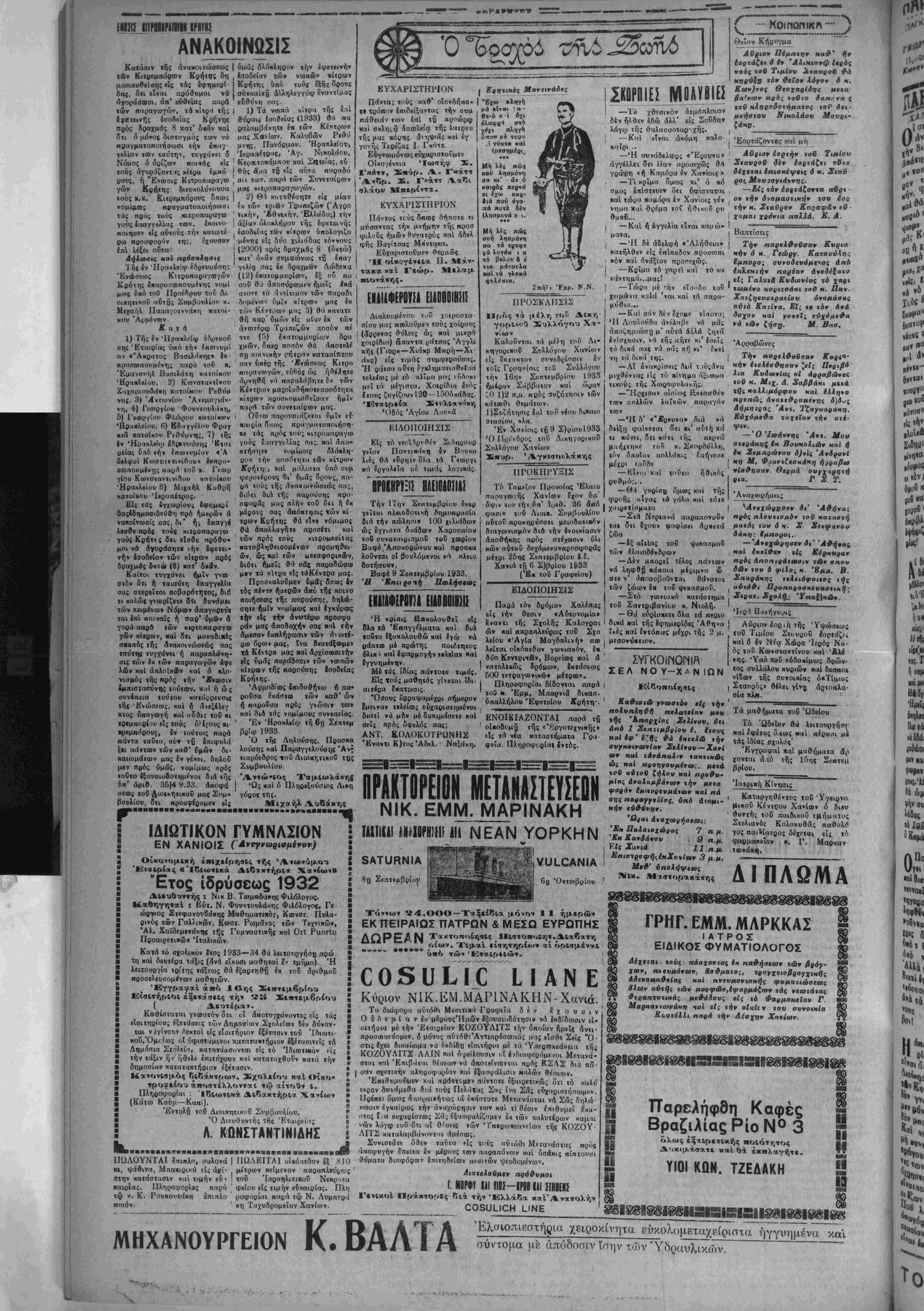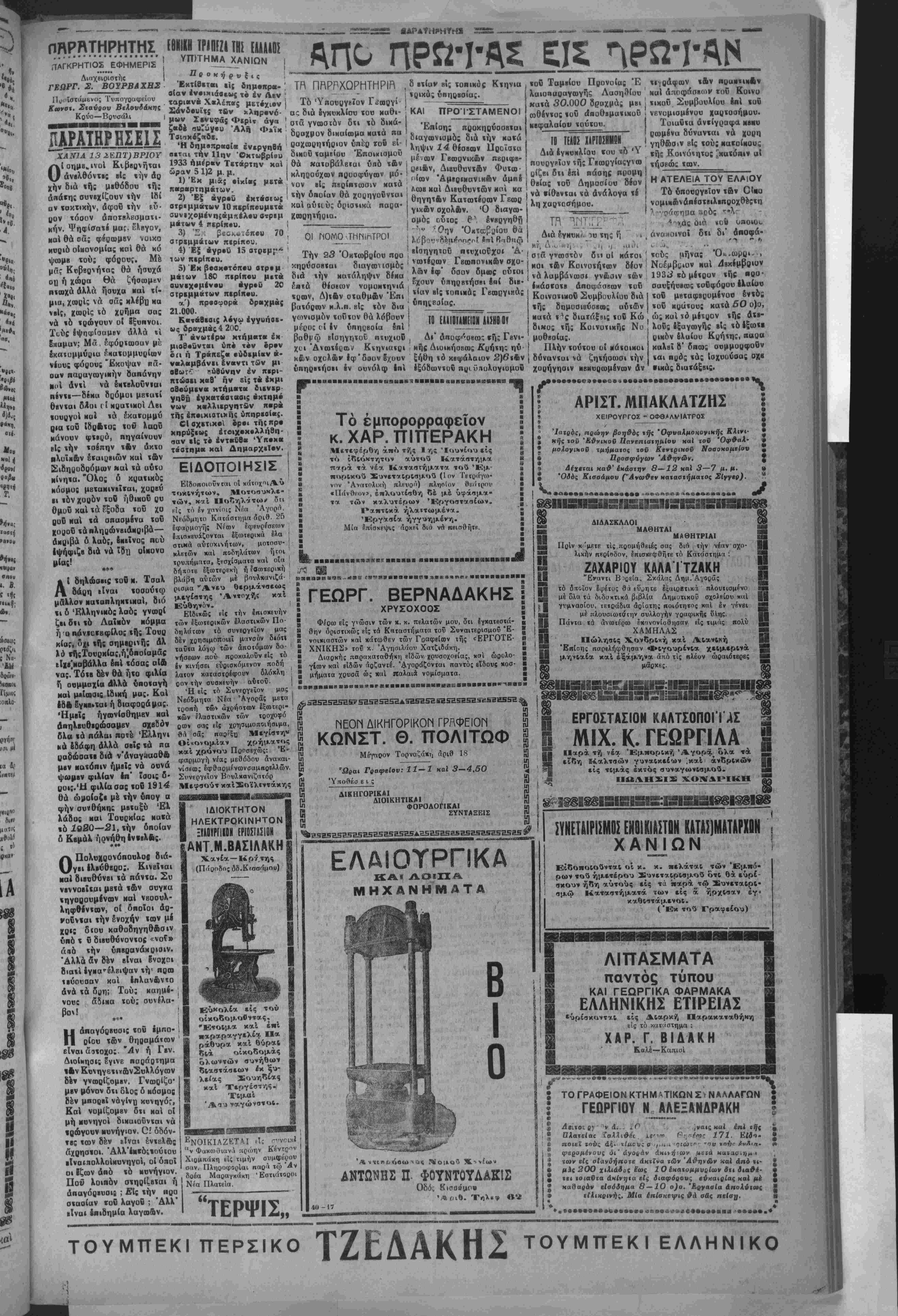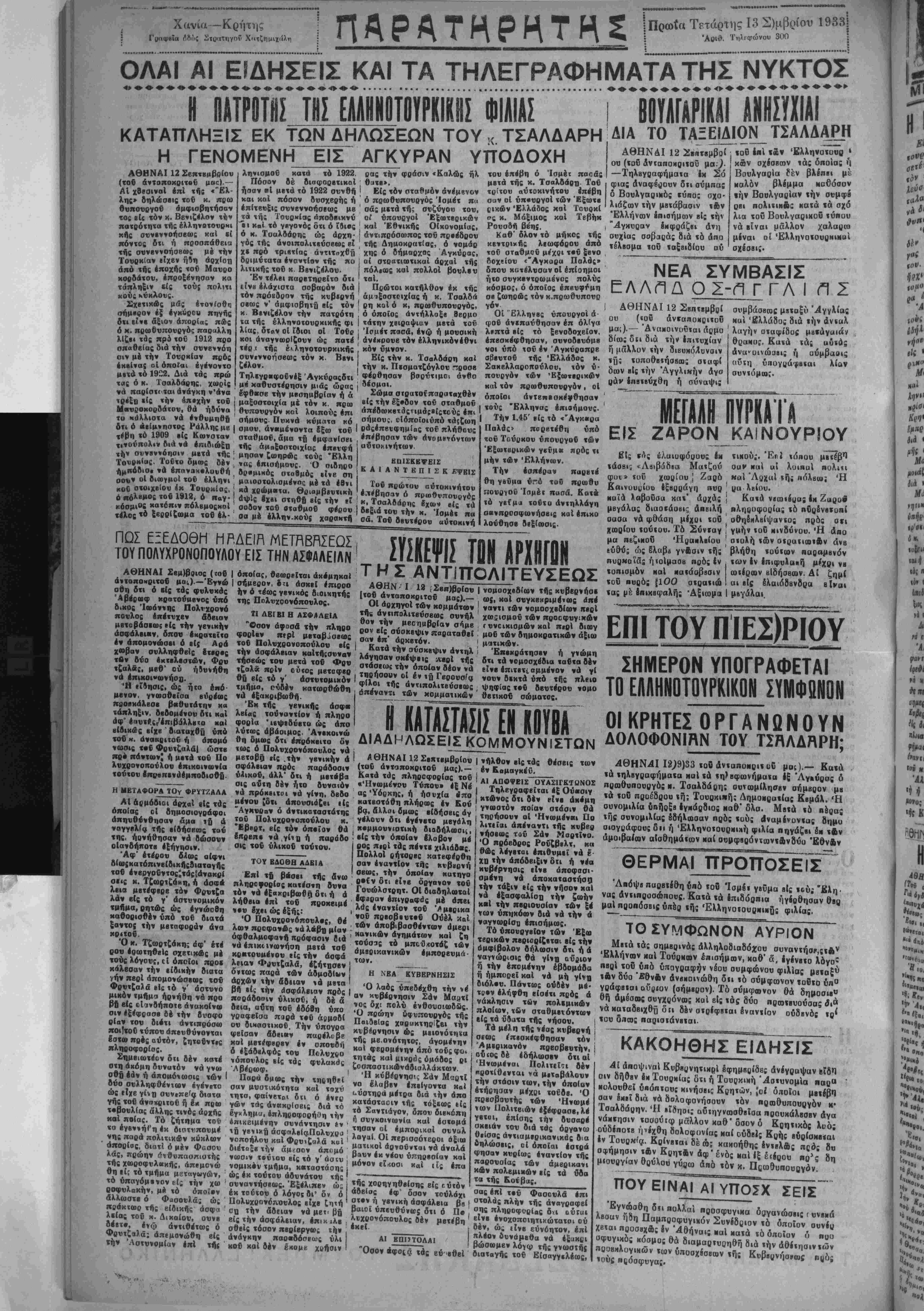 Ικρβπε νά ,γί<υ ή παράδο σις τοΰ υλικόν τούτου. ΣΥΣΚΕΨΙΣ ΤΟΝ ΑΡΧΗΓΟΝ ΤΗΣ ΑΝΤΙΠΟΛΙΤΕΥΣΕΩΣ ΑΘΗΝ Ι 12 Σβπ)β0ίου | [τοΰ άνταποκριτοθ μας).— ΟΙ άρχηγοΐ των κομμάτων | τή6 άνΐιπολιτβνσβως σννήλ θον την μεσημβρίαν σήμε . οον είς σύσκεψιν παρατασεί ! σαν έπ' άρκβτόν. ι Κατά την σύσκβιΐιιν άντηλ Ι λάγησαν σκέψεις Λβρί τής στάσεως την οποίαν δέον νά τηρήσουν οί έν ιη Γβρονσία φίλοι τής άντιπολιτβνσεως άπέναντι των κομματικήν ' νομοσχβδίων «ής κνββονήσ· ω$. καί συγκΒκριμέ*ως Ληέ ναντι «ών νομοοχβδίων πβρί χω^ισμοϋ των πραοφνγιχων γ ννεικιομών καί π*ρ1 διωγ μοθ των δημοκρατικήν άξιω ματικών. Έηεκράτησβν ή γνώμη δτι τα νομοσχέδια ταυτα δέν βϊνβ επιτετραμμένον νά γί νούν δικτά υπό τής πλβιο ψηφίας τβΰ δευτέρου νομο θβτικοΰ σώματος. . β Ματζού φυι» ϊοϋ χωρίου Ζαρό Καινυυυίου ί^Βρράγη αυρ καΐά λαβοΰαα κατ' αρχάς μεγάλας διαοτάθΒΐς Απειλή οασα νά φθάση μίχοι τοΰ χωρίου ιούιου. Τό 2ύνΐαγ μα πεζιιιοΰ Ηρακλείου ευθύς ώς §λαββ γν&οιν <ϊ)ς ηυρκοΐάς ήιοΐμασβ «οόςίν τοπισμόν καί καιάοββσιν τοΰ ηυρός (100 στραιιώ ΐας μέ βπικβφαλή; 'ΔςΊωμα τικού;. Επ2 ιόηου συν χαΐ υ! λυιηυΐ ηολι*ι καί Αρχαί ιη; πόλβω; Ή ρα- λυίου. { Κο«ά νεωιέραβ ·» Ζυιροεΐ ηληροφορία: «ό ηθρδνβνοηί οθη§Μλβ(ψαν<ος πρός ση ! γμήν «οδ κίνδυνον. Ή άοο ' αιολή «ών σ«ρα«ιωνΑν άνβ βλήθη τούιων παραμβνόν «ών 4ν ίπιφυλα»ή μίχρι νΐ ωΐέρων βΐδήσβων. Αί ζημί αι «Ις έλαιόδβνδρα Ι| Ι ΚΑΤΑΣΤΑΣΙΣ ΕΝ ΙΙΙ1Α ΔΙΑΔΗΛΩΣΕΙΣ ΚΟΜΜΟΥΝΙΣΤΩΝ ΕΠΙ ΤΟΥ ΠΐΕΣ)ΡΙΟΥ ΣΗΜΕΡΟΝ ΥΠΟΓΡΑΦΕΤΑΙ ΤΟ ΕΛΛΗΝΟΤΟΥΡΚΙΚΟΝ ΣΥΜΦ-ΝΟΝ ΟΙ ΚΡΗΤΕΣ ΟΡΓΑΝ2ΝΟΥΝ ΔΟΛΟΦΟΝΙΗΝ ΤΟΥ ΤΣΗΛΔηΡΗ; ΤΟΥ ΕΔΟΘΗ ΑΔΕΙΑ Επί τβ βάσει τής δνω πληροφορίος κατέστη δυνα τόν νά εξακριβωθή δτι ή ά λήθβια επί τοΰ πβοκβιμέ νού βχει ώς εξής: Ό Πολνχρονόπονλβς, θε λων προφανώς νά λββχι μίαν όφθαλμοφανή πρόφασιν διά νά έπικιινοονήση μβτά τοΰ κρατουμένον είς την άσφά λειαν Φαυτζαλά, έζήτκσβν όντως παρά των άδμσδΐνν άρχων «ήν δβ«ιαν »ά μβτα βή είς την ασφάλειαν πρός παράδοσιν ύλικσΰ, ή δέ δ δεια, αυτή τοΰ εδόθη υπο γραφβΐαα παρά τοΰ άομοβί ου δικαστικον. Την ύπογοα φείσαν δββιαν παρέλοββ καί μβτέφερβν έν οπονθή δ έξάδελφός τον Πολνχρο τόπονλος κ.ς τάς φυλακάς Αβέρωφ. Ι Πσοϋ δμως την τηρηθ'ί σαν μυστικότητα καί τσχν τητσ, φαίνβταΐ ότι ό ένερ γών τάς άνβχυΙθΕΐς διά τό έγκλημα,έπληβοφορήθη την έηικειμένην συνάντησιν εν ιή γβκιχή άοφαλβίαΠολνχρα νοποήλου χαΐ Φρνιζιιλδ κβί διέταξβ την άμεσον άπ«μό νωσιν τού.όν βίς τό γ' άσιν νομικσν τμήμα, καταστάσης ώς έκ τούτου άδυνάτου τής 1 συναντήσεως. Έξβλιπβν ώΐ έκ τούτου ό λόγοςβι' δ» ό Πολυχρανότΐονλος «ϊχε ζητή ' οί] την άδειαν νά μετ· βό βίς την άσφάλβιαν, έπιχιλε σθβίς τόσον περίβργως την ανάγκην παοαδόσεως ύλι κου κοί δέν έκομι; χρήσιν ΑΘΗΝΑΙ 12 Σεπτέμβριον (το€ άνταποκοιτοδ μας).— Κατά τάς πληροφορίας τοΰ «Ηνωμένον Τύπον» έξ Νέ άς Υόρκης, ή ήσνχία β πό κατβοτόθη πλήβως έν Κου βα, Αλλαι Ομως είδήσβις αγ γέλονν δτι εγένετο μβγάλη κομμοννιστική βιαδήλωσΐ(, είς την οποίαν έλαβον μέ ρος περί τάς πέντι χιλιάδας. Πολλοί ρήτορες κατβφέρθη σαν εναντίον τής κνβεονή Οβως, την οποίαν κατηγο ρ·ίν ότι βϊϊβ Οργανον τοδ Γονώλστρητ. ΟΙ διαδηλωταί Ιφβραν επιγραφάς μέ άπβι λάς εναντίον τοδ Άμερικα νού πρεοβεντοδ Ούέλ »αί των άποβιβασθέντων άμερι κανικών άγημάτων καί ζή τούοαις τό μπιΰχοτάζ των άμερικανικών έμπορβυμα των. νήλθον είς τάς έν Καμαγκέΰ. Η ΝΕΑ ΚΥΒΕΡΝΗΣΙΣ ) Ό λαός "ύπβδέχθη την «έ ' αν κυβέρνησιν Σάν Μαθτϊ νος δχι πολύ βνθουσιωδώς. Ό πρώην ύφνπουογός τής ΠαιδβΙας χαοΜκτηρίζβι