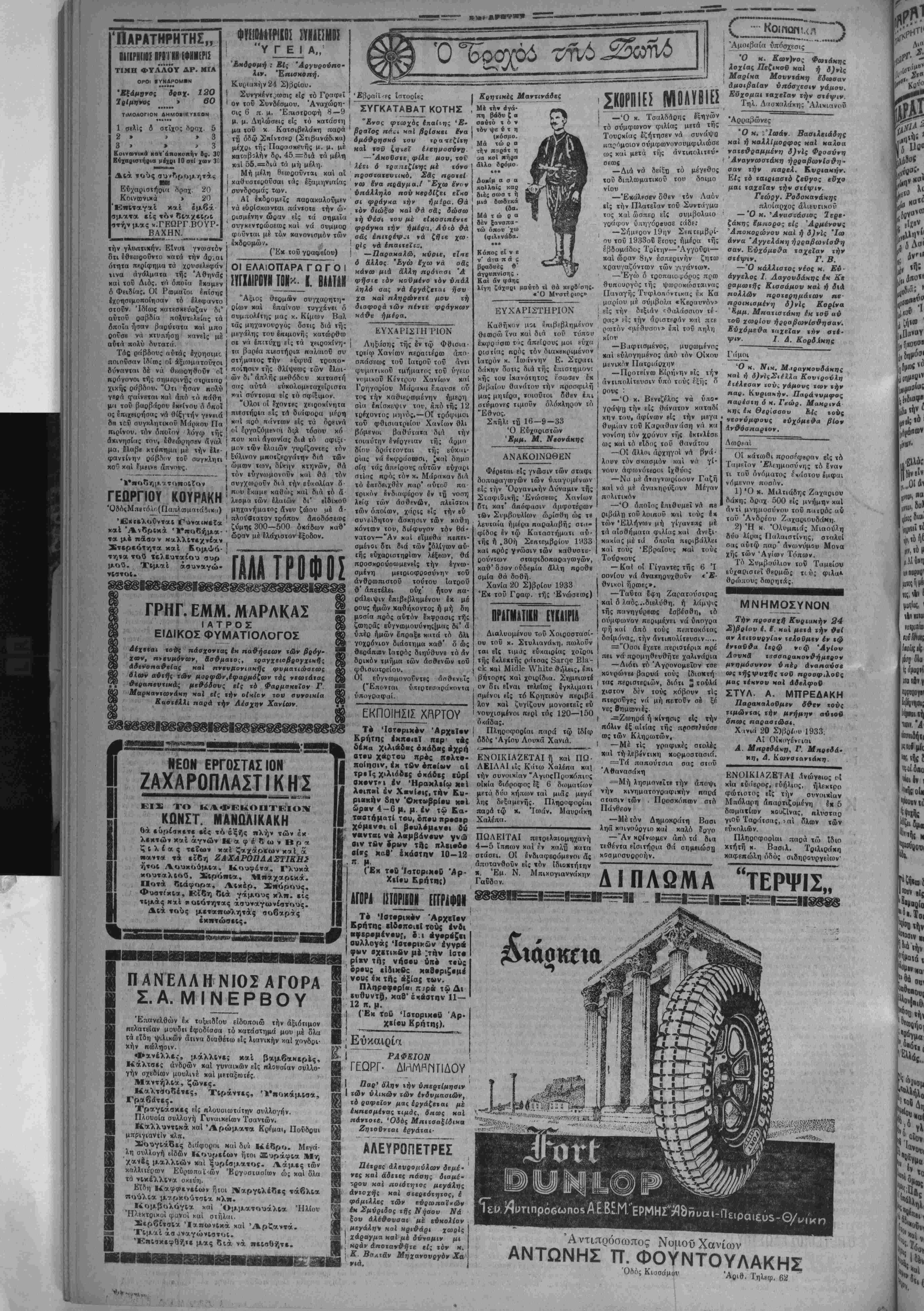 γο<ίΒ.νετε τόν κοινοβουλευτικόν έλεγχον, νά βυσαο δομείτε κατά τοΰ πολιτεύματος, νά τα θέλενε όλα δικά σας χα ϋατερα νά χαλεϊτε τόν λαόν νά σας ονμφιλιώσΐ) μέ τούς άντιπάλους σας! Πςέπει νά άντιληφδήτε δτι ή διακυβέρνησις μιάς χώρας δέν ?ί» αι παιγνίδι. Κ αί εάν, μόλις σήμερον, όπόνε άίχίσατε νά πιστεύετε είς τό μεσονράνημα τον πολιτιχοΰ χαί διπλωματικόν αας άατέρος, άντε λήφ&ητε δτι δέν €ά δυνηϋήτε νά άπολαύσητε πολλάς περιποιήσεως ώς »ης Άγκυρας λ αί νά ίνω τισθήίε πολλά ζήχω, έξ αΐτΐας τής έσωτεοιχής άνω μαίΐας, ευχόμεθα νά μή εί»αι πολν άργά. Διότι, τη άλη&εΐα, ουδέν άλλο ώθησεν τόν κ. Τσαλδάρην νά κάμη την έκκλησιν περΐ μεσιτεύσεως τοϋ Λαοΰ παρά ό φόβος, ή κακη προαίσθησις, δπ είς τό οη μεϊον είς ό ηχθησαν τα έσαοΐερικά μας πράγματα πολν αύντομα θά χάσηΐάςΐιμάςτοΰ Πρωθυπουργόν, άπαράλλαπτα όπως τα χολααμένα γραΐδια προσεύ χονται είς την Θεοτόαον νά μεαιτεύαη παρά τω ΐΑεγάλω της'Υιφ χα τα δεχθή είς τόν πά άδει- συν, διά τόν οποίον δέν ήργάσΦηθΆν άπό την νεό- τητά των άπό τόν οποίον τάς απομακρύνουν α{ πρά¬ ξει; των. ~ ΕΚ ΓΕΝΗΣΑΡΕΤ ΔΥΝΑΤΑΙ"" ΚΑΛΟΝ ΠΡΟΕΛΘΕΙΝ; Ή Γενική Διοίκησις έξέδω «ε ανακοινωθέν σχετικώς μέ τάς ομαδικάς μεταθέσεις έκ τής ενταύθα Φρουράς των α¬ ξιωματικών διά τού οποίον τυνίζει ότι έπρστιμιίθησαν οί ■ ποία· την επομένην διά νά μετατβθούν Ετέροι ηλΙ οί ετέροι κατωοθώνουν νά παοαμείνουν καί νά μετατε- θούν οί πρώτσι καί καμμιά μετάθεσις σχεδόν δέν έπρα- νά ομποδιστή ή Ρρημη γιατί ήτανβ χαλή χλιοσσοΰ. Τόν "Α- πο'λη τσή '/τΐ βαρμένα 19 αύγά καί τάβγαλε ούλπ. Μουοένα δρ ν οΰ'ογιασε. ΚπΙ δέν ίσηκώνουν- τονε δ|ω νόίχα τηνέ σηκώσω νά τσή δώσω τίβ τσι νά τιναχτϋ λιγάιι κι' Λπόβις νά γλακά νά χάτστΐ τσ' ηνψί τζη κι' ίδ ι ίντα θά γϊνίό πού δρ μοΰ κλοισσά άλλη ; —•"Ε, νά βάλης τον πϋτ«ινό σάν κ(ΐί την «'λλοτόσεινη νά κλωσίσχι —"Ιντα λέρις τόν πετεινό ; Ντά ποΰ ρξαναχούστη*ε νΛ χλωσσοϋνβ οί πρτρινοί ; —Λρ ΒΪς τό χωρία μ«ς μιά φοοά μίαν νπικοκροά ρϊχβ θρμέ- νυ μίαν κλωοσοϋ μά χαλή κλσια σοϋ ίΐρβπει. Λέν ΙσηκώνουντονΡ μπκσπρλή (Ίδί> την* σηκώνανε
