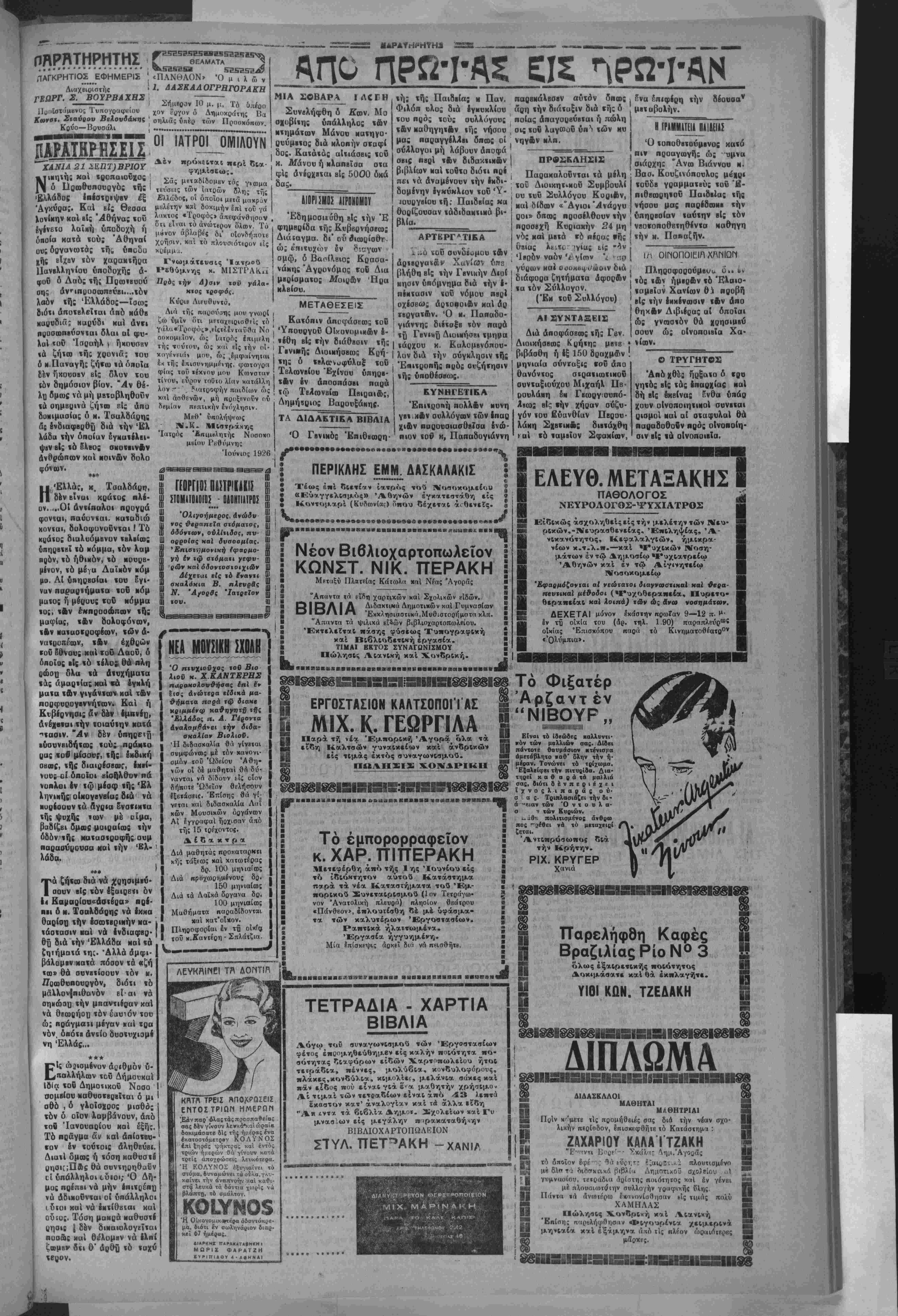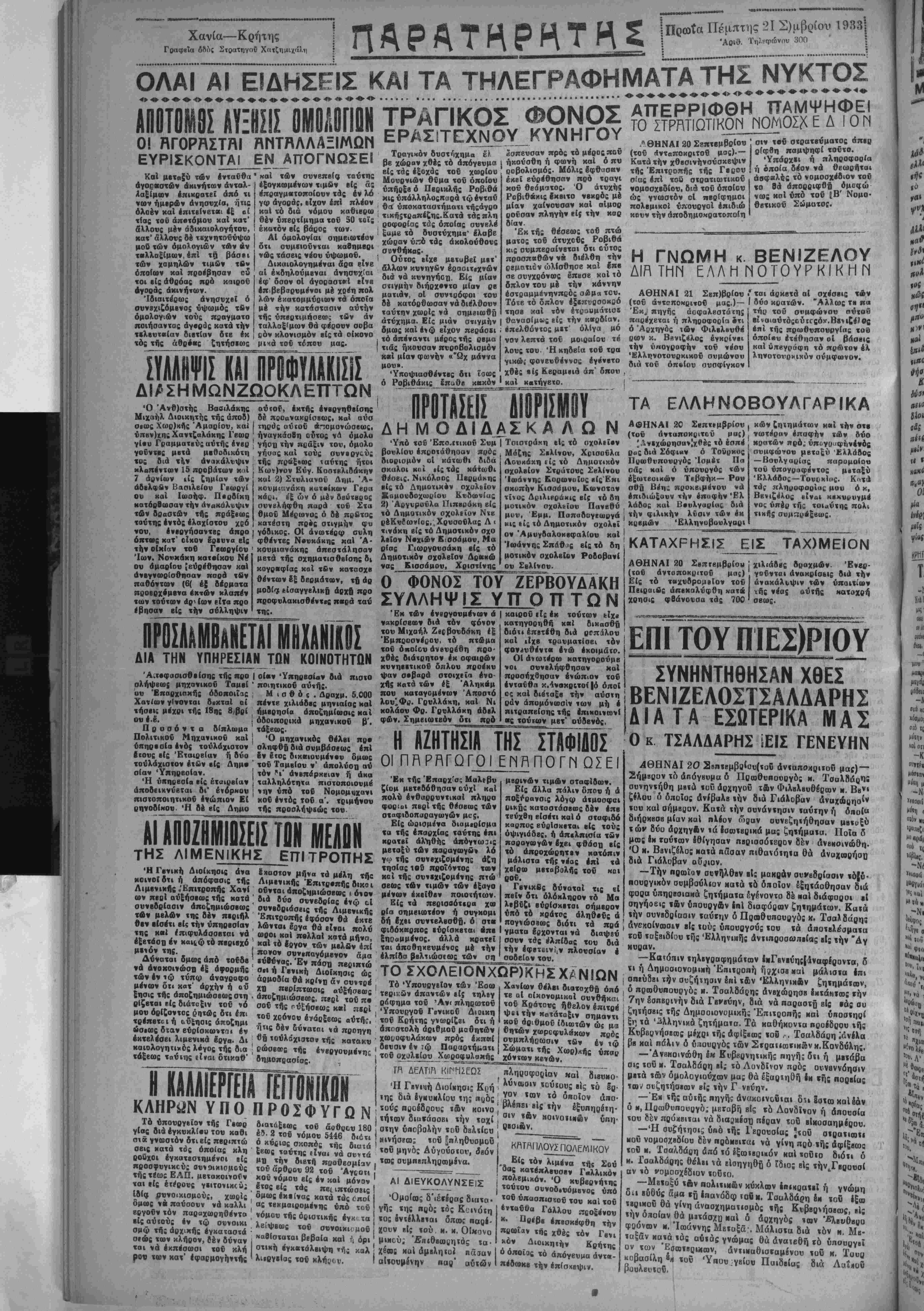 ράφημα τον 'Αν< πληρωτον Ύπονργοδ Γβνικοδ Διοιχη τοΰ Κρήτης γνωρίζβι δτι ή αποστόλη άριθμοδ μαθητων χωι/οφυλάκων πρός έκποιί ββνσιν έν ζφ Παραρτήματι τοδ σχολείον ΧωροφνλαΜής —-..— » „»„«(! διατοχβή όπό τε αί οικονομικαί οννθήκαι τοΰ Κράτους ήθελον έπιτρέ ψβι την κβτβταξιν σημαντι κοδ αριθμόν ϊβιωτών ώς μα βι,ϊών χωροφυλιίκων πρός ονμπλήοωσιν τβν έν ιω Σώματι τής Χωρ)κής χόντων κβνών. ΙΚΑΑΑΙΕΡΓΕΙΑ ΓΕΙΤ0Ν1Κ0Ν ΚΛΗΡϋΝ ΥΠΟ ΠΡΟΣΦΥΓΩΝ ΔΕΛΤΙΓ ΚΙΓΉ2ΕΩΣ Τό υπουργείον τής Γεωρ γίας διά έγχυκλίσυ τον καθι σία γνωστόν δτι βίς πβριπχώ σβις κατά τος οποίας χλη ' ροΰχοι έγχατβστημένοι είς προσφνγιχεΰς αυιοιχιομονς τής τέως ΕΛΠ. μβτακοινοίιν ται είς ετέρους γειτονΐκού; Ιδία ρννοιχισμούς, χωρίς δμως να παύσονν νά χαλλι βργοΰν τόν παραχωρηθέντο βίς αύιονς έν χφ συνοικι σμφ τής άρχιχής έγκαχαστά ■ σιώς των κλήρον, ίέν δνναν «αι νά έχπέσωσι τον κλή ρον των κατ' έφαρμογήντής διατάξεως τοΰ άοθ«ευ 180 έ5. 2 τοδ νόμον 5446 διότι ό χύβιος σκοπός τής διαΐά ξβως ταύτης Είναι νά αννχά μ Β την διβτή προθεσμίαν τοΰ άρθρον 92 τοΰ 'Αγςοτι κου νόμον βίς έν καί μόνον έ τος βίς τάς πβ( ιπτώσβις δμως έκβίνας κατά τάς έποί άς τβκμαιρομένης υπό χον νόμον τής όριστιχής έγχ τα λβίψβως τοδ συνοικκ μοδ καΘΙσταται βεβαία καί ιΊ όρι στιχή έγχαιτάλβιψη (ής καλ λκργιΐας τοδ Λ * Ή Γενι«ή ΔιοΐΊιησι: της διά έγκυκλίου της ίΐοός τούς προέδρους «ών κοινο τήταν διανάαοβι την ταχί στην υποβολήν τού δβλΐ.εα κινήσία; τοΰ |πληθ τοδ μηνός Αύγούοτον, όβόν τος συμπεπληρωμβνα. ΑΙ ΔΙΕΥΚΟΛΥΝΣΕΙΣ Όμοίοος δΊέτέοας δκιχα· πληροφορίαν καί διενκο- ' λύναίοιν τούΐυυς β)ς τα εο· γον ταν τό οποίον άπο- ι βλβΐΐΒΐ Βΐδ <ήν έξυπηρέιη- 1 σιν «&ν ΜθΐνοΐΊΝΐΙν ΰπη' ί ριοι&ν, ρ γής της πρός τος Κ:ιότη τος ένιίλλεται δποος οαοέ- χουν β.ς τού μ. μ. Οίκσνα μιιιεύ; 'Επιθεωςητάς τα· χέαί ηοΙ ώμβληϊϋ. πάααν αΐΐουμβνην παρ' αυτών ™5 ««^λβνσβν Γαλλικόν πολεμικόν. Ό κνββρνήτης «ντον συνοδ,νόμβνος υπό »οβ ύπασπιοτον τον καί τον *»ταΰθα Γάλλον «Βθξένου *· Οβ·ββ έπβσκ^φση την πρωίαν τής χΟ|ς ιόν Γβνι «όν Διοικητήν Κρήτης ό οποίος «ό άπόγενμα άντ«- πέδωκι την επίσκεψιν. ΕΠΙ ΤΟΥ ΠΙΕΣ)ΡΙΟΥ ΣΥΝΗΝΤΗΘΗΣΑΝ ΧΘΕΣ ΒΕΝΙΖΕΛΟΣΤΣΑΛΔΑΡΗΣ ΔΙΑ ΤΑ ΕΣΩΤΕΡΙΚΑ ΜΑΣ Ο κ ΤΣΑΛΑΑΡΗΣ ΕΙΣ ΓΕΝΕΥΗΝ ΑΘΗΝΑΙ 20 2Βητεμβο^υ(τοΟ άνιοπο^ριΐοΰ μας)~ —ήμϋοον τό άπόγβυμα δ Πρωθνπουργός ν. ΤσαλαύρΠί συνηντήθη μεΐά τοΰ άρχηγοδ την Φιλελεύθερον κ. Ββνι ζίλου δ οποίος ανΐβαλβ ιήν διά Γιάλοβαν αναχώρησιν τυυ καί σήμερον, Κατά την συνάντησιν ταύτην ή δποί° διήρκβσβ μίαν «αί ηλίον ώοαν ουνεζηιήθησαν μβϊμξύ των Βύυ άρχηγλν ιά ΙσοοτβρΐΗά μας ζητήματα. Ποία δ μως ίπ τούτων έθίγηααν περισσότερον &εν άνβκοινώθη. Ό μ. Ββνιζέλος καια πάσαν ηιθα>όιηια θά αναχωρήση