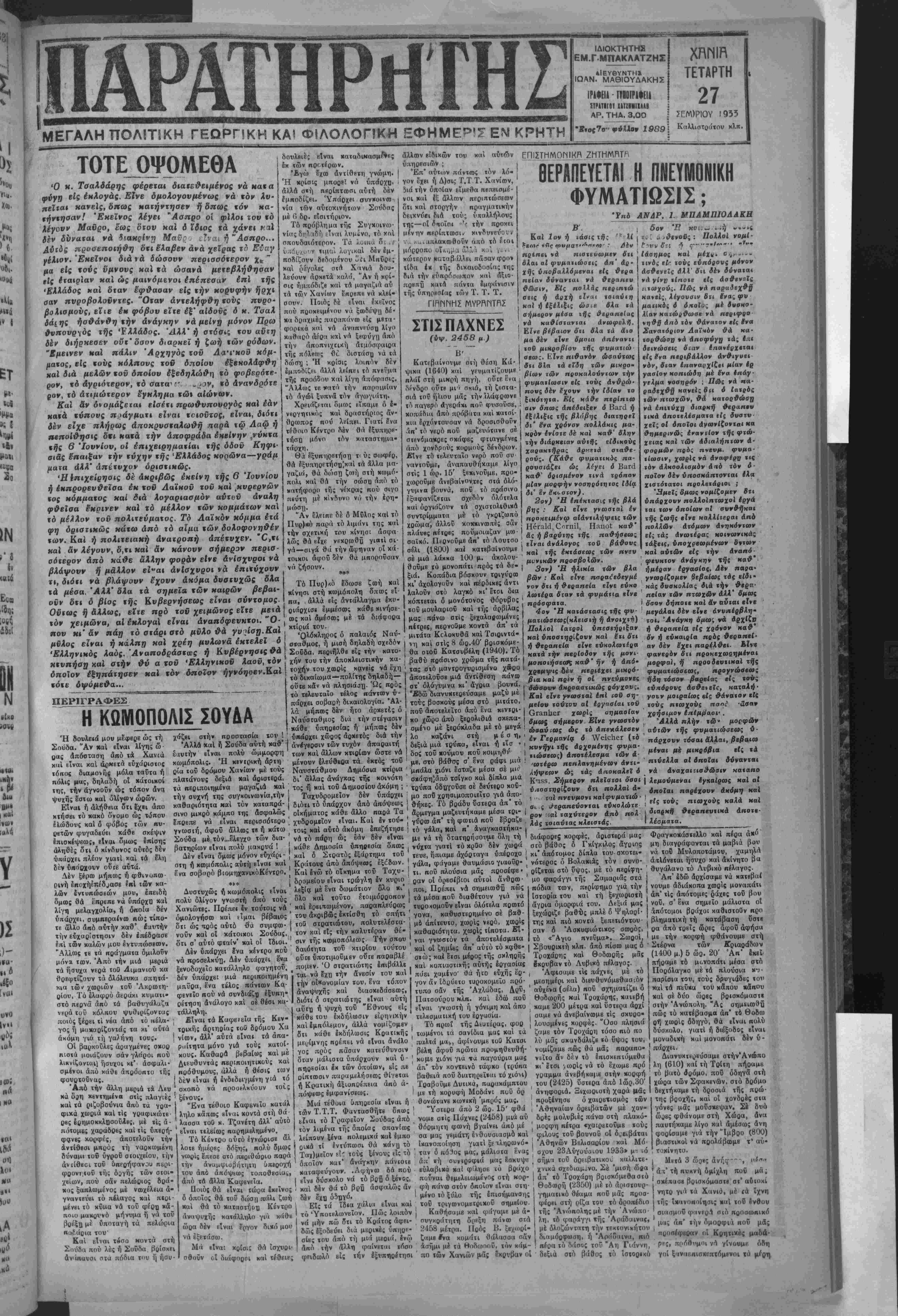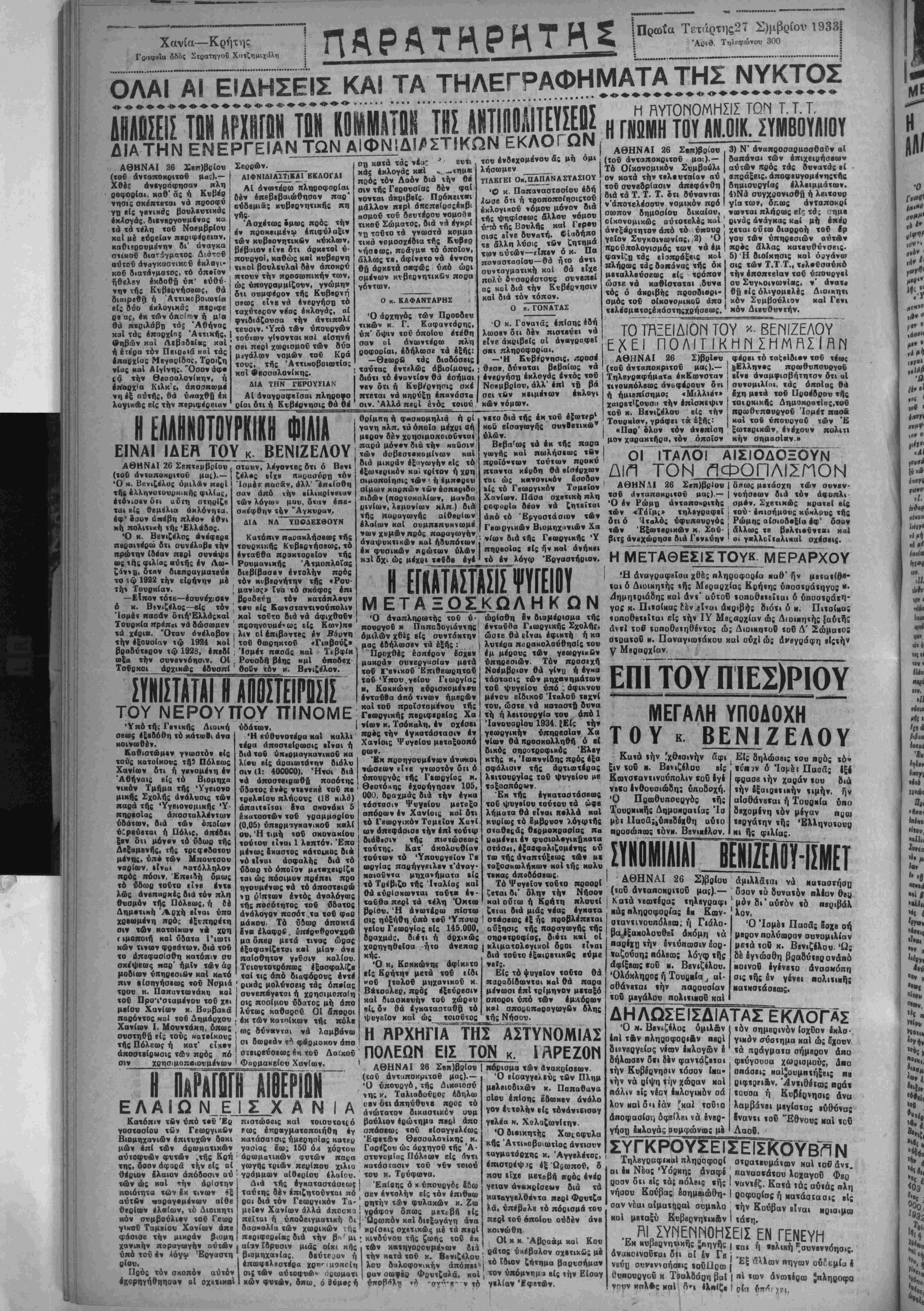 ααρίκΐ] <ήν έν»ύηοοσιν έορ· «αζούοη; ηόλΒοος λόγφ ιής άφίξβως «ου μ. Ββνιζίλου. Όλόκληρος ή Του^α Λ α(· σθάνβτ,αι «ήν παρουσίαν τον μεγάλον πολιτικόν1 καί 'λον. Ό Ίσμέι Παοάς §σχβ οή μβρον πολύωρον συνομιλίαν μειά τ ο Ο χ. Βενιζέλου. Ώς 8έ εγνώσθη βραδύΐΒροναηό κοίνον ίγίνβϊο ανασκόπη έν γένει ΔΗΛΩΣΕΙΣΔΙΑΤΑΣ ΕΚΛΟΓΑΣ Ό η. Ββνίζίλος ομιλών ι ιόν σημβρινόν Ισχθον εκλσ- (π. τΛν πληροφοριών ηερί Ι γικόν συστημα χα· ώ; εχουν δΐϋνβργείας νίαιν ίκλογών έ ' τα πράγμαια σήμερον απο οήλωσβν δτ· 8βν φαντάζβϊαι φεύγουοα χωρισμούς, αβο «ήν Κυβέρνησιν τόσον Ικα¬ νήν νά ρίψη την χώραν καΐ πάλιν βίς νέον ΐΜΛαγικδν σά λονΜαίδηίάν [κα. τοθιο αποφασίση δφΒίλβι νά ένβρ- εκλογάς συμφώνως μέ ΝαΙ]|ουμη«ήξΒΐς π β ν, Άν«ιθέΐως πράι ή Κυβέρνησις άνα λαμβάνβι μβγίσΐας βΰθύνας Ι «ούσα Ιναν«ι «σΰ Δαοδ. "Εθνους καί τον ύπόμνημα βίς την Είσαγ ρζ, , τΑ -<»γ"-·;~ ν τό γελίαν Έφβτών. ΣΥΓΚΡΟΥΣΈΐ_ΕΙΣΚϋΫΒ?ϊ Ν ΙηλΒνοΒφΐΝοΙ πληροφορί στραΐΒνμάΐων καί «ου άντ αι Ιμ Νβας (Υοο.ι«ης αναφέ παναοτάχου ΙοχαγοΟ Φβο ροσν δι. βΐς τάς ηόλβις «ης ναν«έζ. Κατά ιάς αΰΐάς πλη νήσου Κοΐ'βος εσημιώθη- Ι ροφορίαςή Ματάσΐασις είς σαν νέαι αΐματηραΐ συμπλο ιήν Κούβαν βϊναι καί μβΐαξύ Κνββρνη«ΐΝΑν η ΒΙ ΣΥΜΕΜΝΟΗΣΕΙΣ ΕΝ ΓΕΝΕΥΗ Νρισιμοα διι οί ς ρ | θυπουργοϋ κ Τοαλδαοη βαΐ Ι πι 1οον άνω«έρω {πληοοφο νπυν κπλ*ς Ν1 Λ λ(ζ Ι ( ί^ οη βα νπυν κπλ*ς Να1 Λπ ·λη(ζ Η <