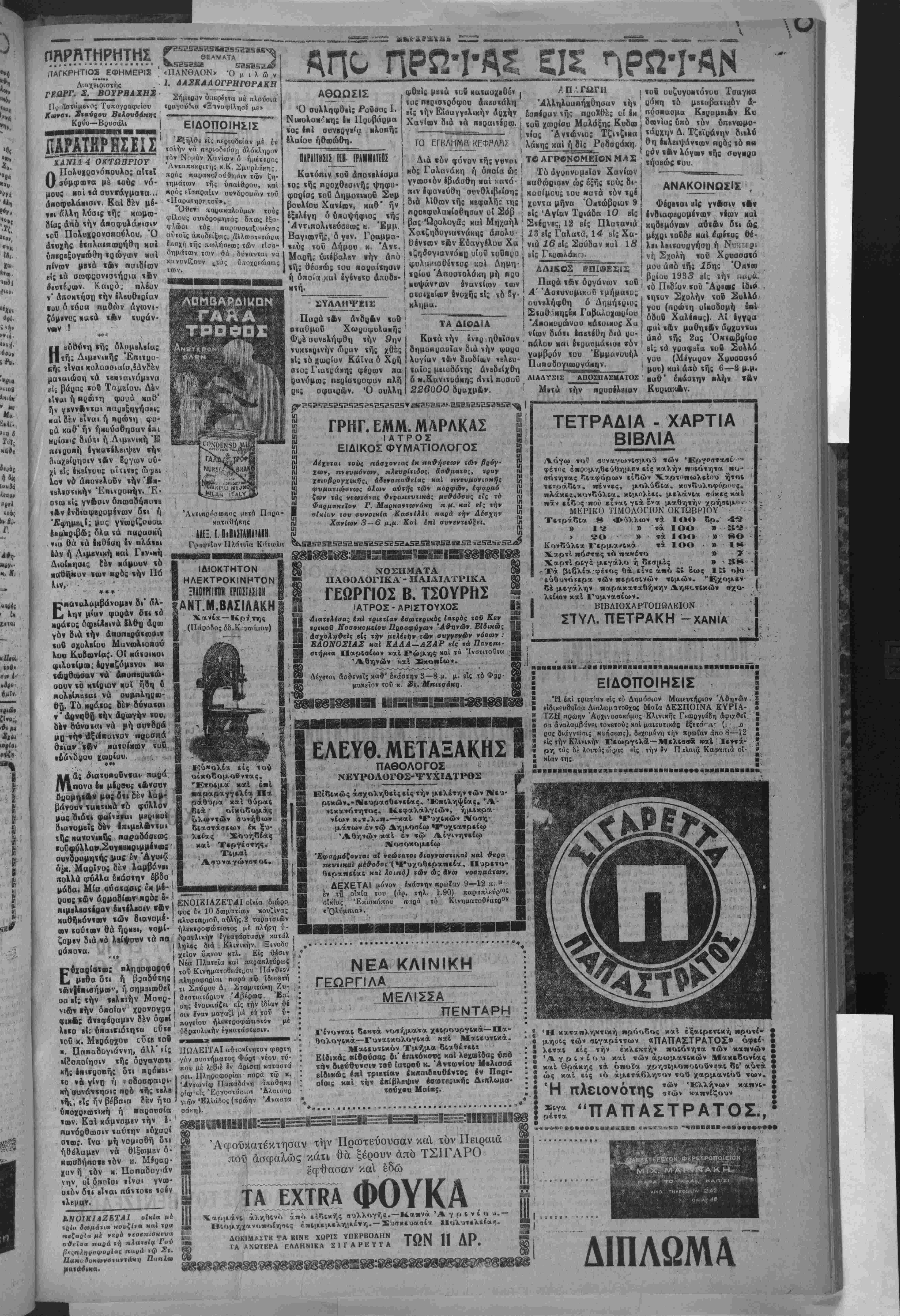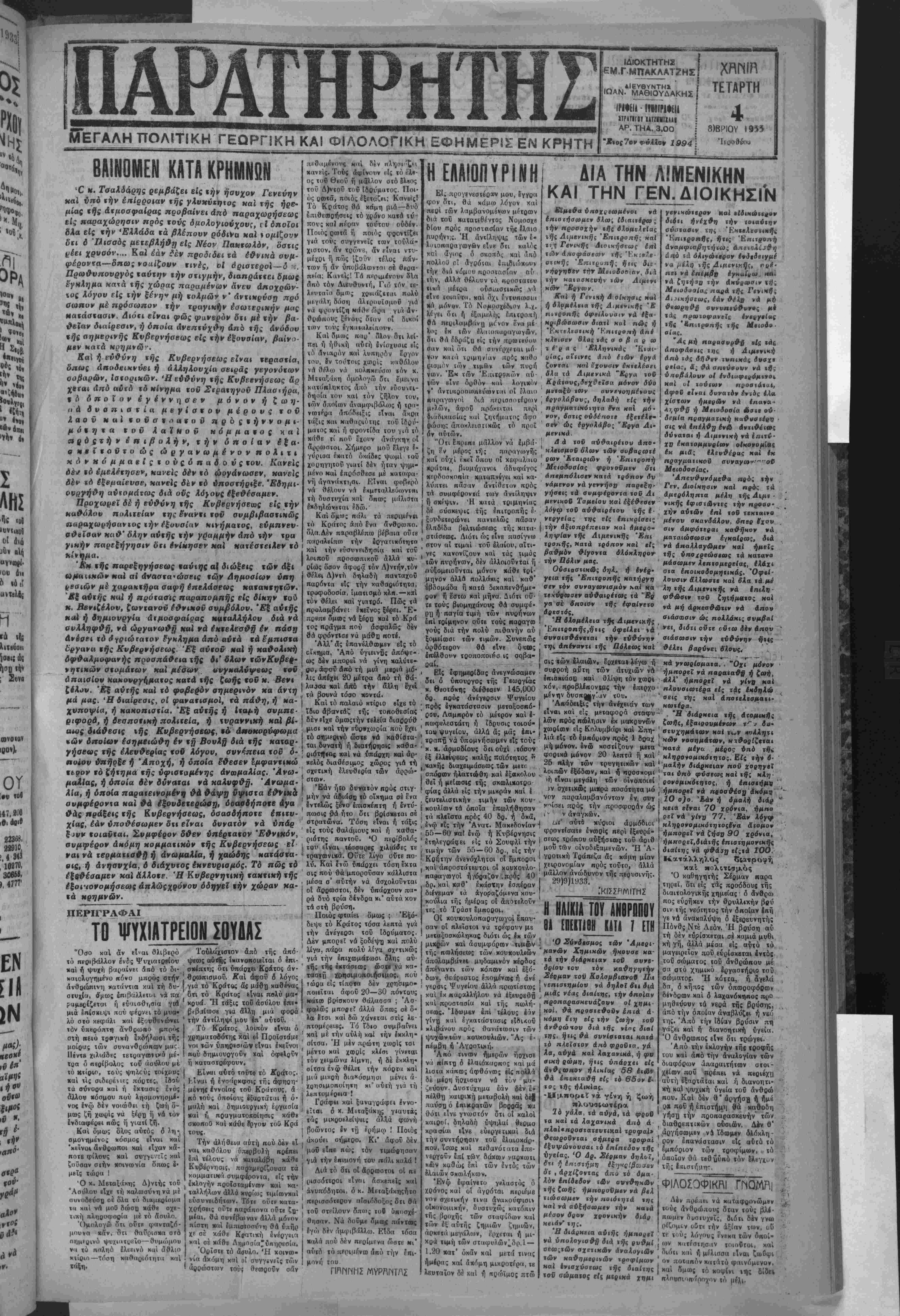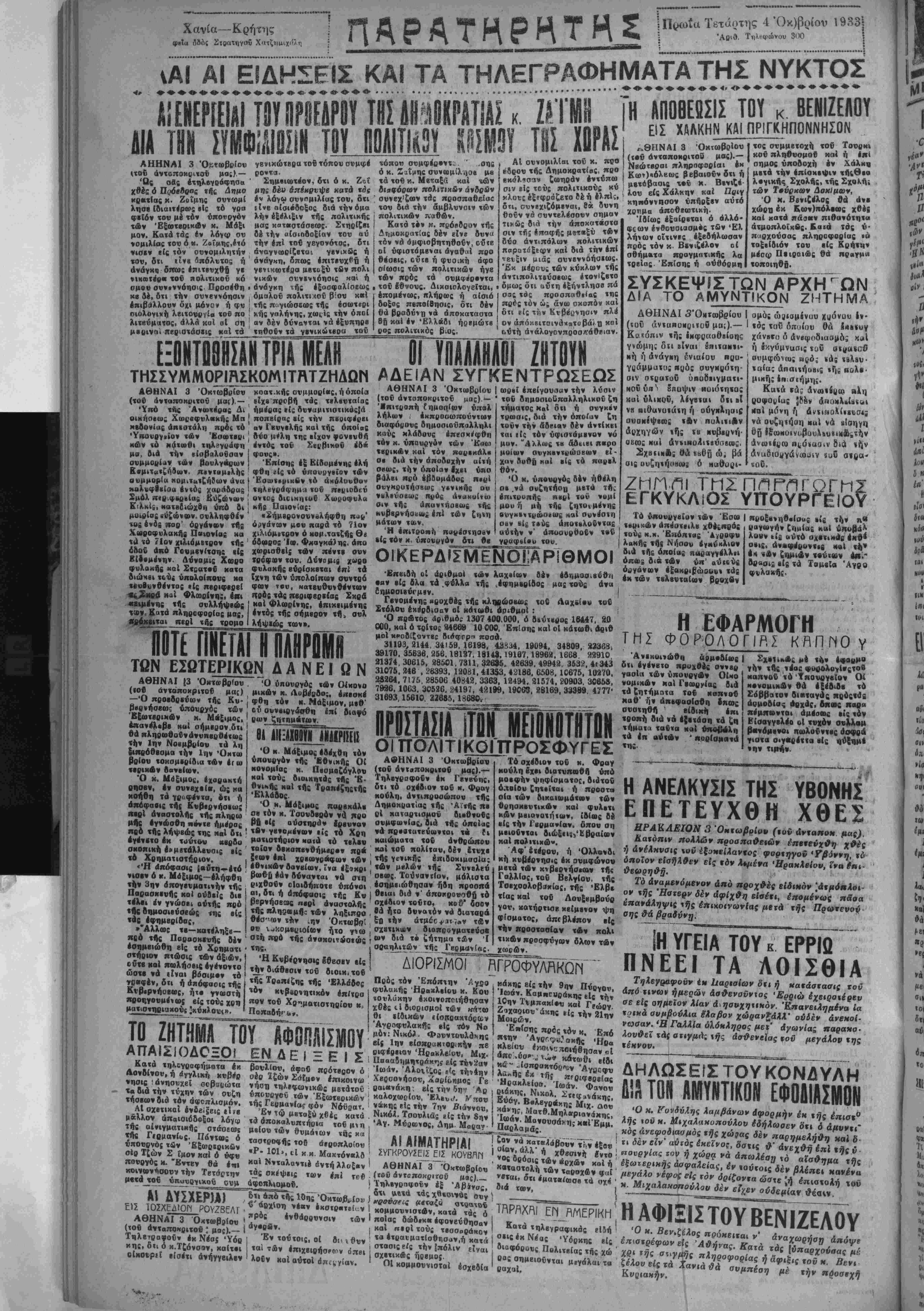μβτά των κν^βονήσε<αν Τής Γαλλΐος, τοϋ Βέλγιον, τής Τοεχοολοβυκίας, τής 'Βλβε τίας καί τοΰ Λονξβμβούο γον, κατήοτισβ κείμενον ψη φίσμοτος, άπϊβλέπον είς «ην προστασίαν των πολι τιχων προσφύγων δλων των χωρών. Η ΑΝΕΛΚΥΣΙΣ ΤΗΣ ΕΠΕΤΕΥΧΘΗ ΧΘΕΣ ΗΡΑΚΛΕΙΟΝ 3 Όητωβρίον (,υϋ άνταηοπ μας), Κατόπιν ηολλών προσπαθβιώ» έηβτεύχ^ χ&ίς ηάνέληνσιςχοΰέξζηείλανχος φυοχηγον ΎβάνΛ τί ί°°!?:ΑεΙαί}"εν ε^ 'όν^έ^4«κ^ι^«ι οψ ΤΟ ΖΗΤΗΜΑ ΤΟΥ λΦΟΟΜΣΙΟΥ ΑΠΑΙΣΙΟΔΟΞΟΙ ΕΝ Δ Ε Ι = Ρ ««ην έΗθΐνοποιήθησαν Ι ΙΟην Τιμ-«κί·ν καί Γεώργ. χΰές ν! διθοισμοΐ των κτιτω Ζιχαοιου άηχί είς την 21 ην θι «ίδιχών είσκβαχτόΰθ,ν Μοιρών. άναμβνόμενον άπό προχ&ές είδικόν "< ,ς Ήστερν δέν άφίχφη είσέτι, έπομένως ηααα έπανάληψις τής έηικοινωνίας μίτά τής Πρωχενον αης θά βραδύνη. ίΗ ΥΓΕΙΑ ΤΟΥ κ ΕΡΡΙΩ ΠΝΕΕΙ ΤΑ ΛΟΙΣΘΙΑ Τηλέγραφον* έκ Ιιαρισίων δτι ή κατάστασίς τοΰ άπό τίνων ημερών ασθενούντος Έρριω έχειροιέρεν σε είς σημείον λίαν ά>ησ*>χηιΐΝον. 'Κπανειλημένα ία