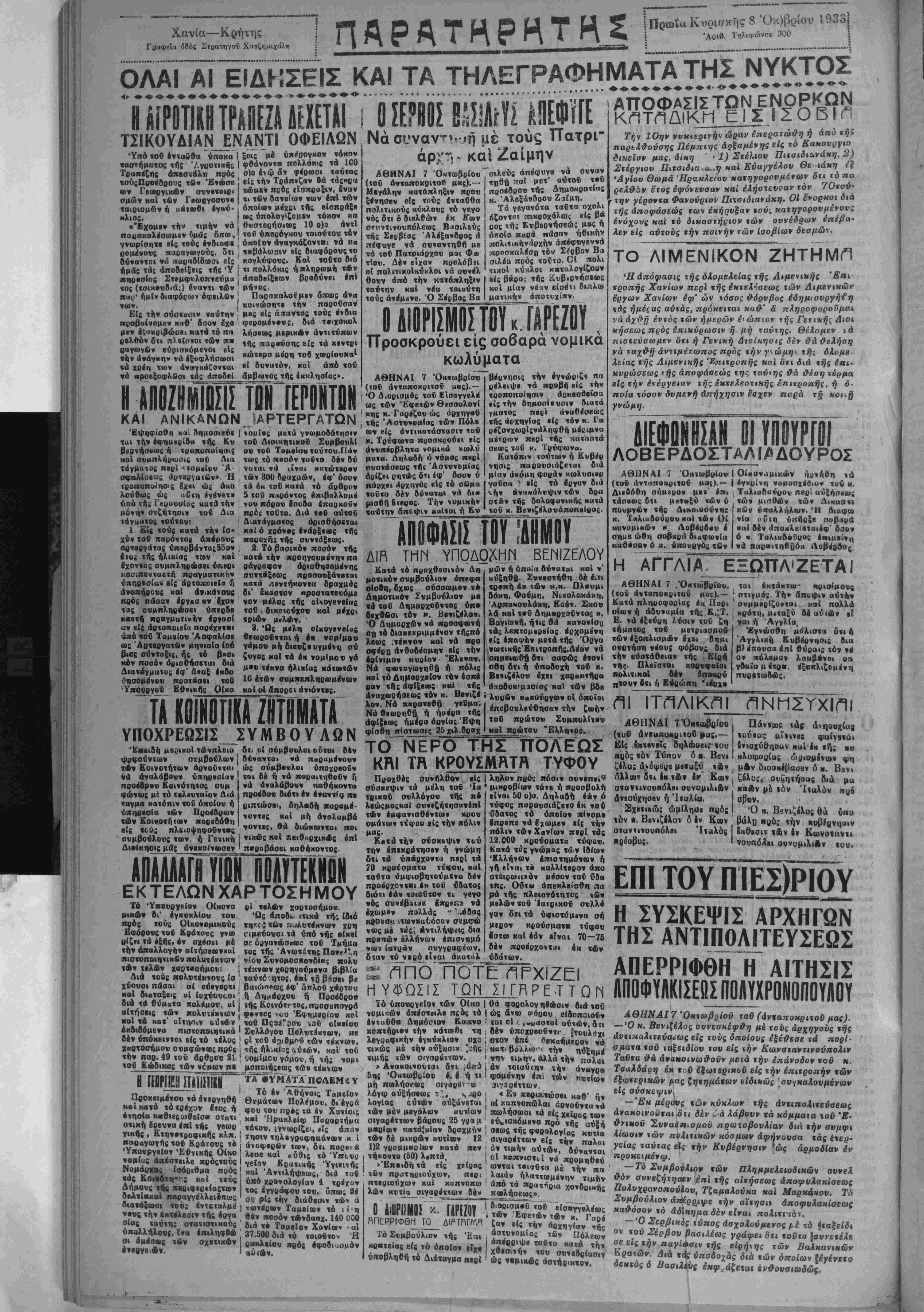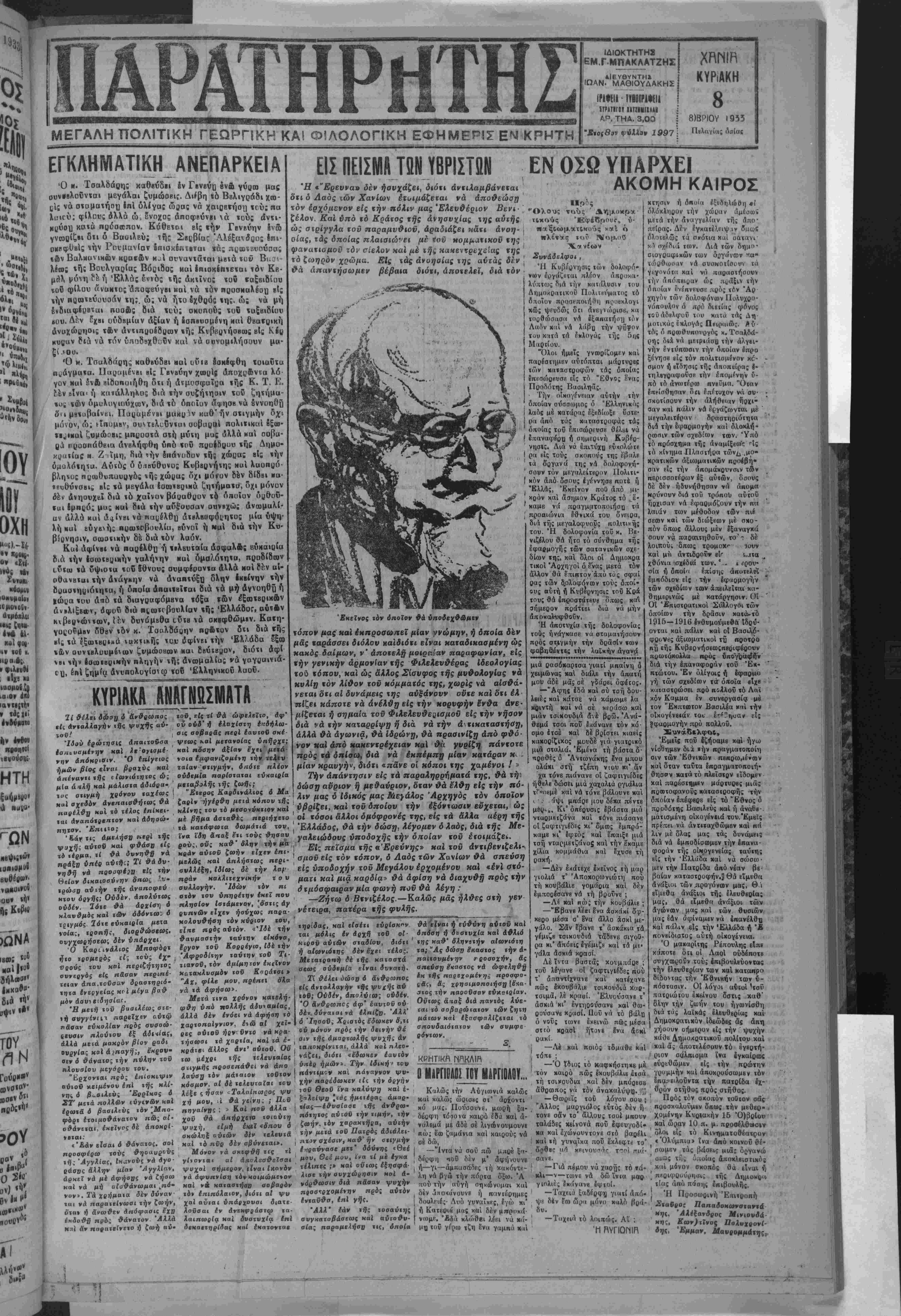 , οψυΓι διά ηιωτ(βοι>λ(αν «ής Έλλάδο;, αύ<Αν {^ν δυνύμ&θα ιΰΐΒ ά σκβφθώμιν. Κάνη· «όν κ. Τσαλδάοην πρΑ«ον διι διά ϊής κ(ς «ά έξωΐΒϋΐΛύ ιακ.ικής «υν ίφίνκι «ήν Έλλάδα έξη ν&ν συνιβλυυμέΜον ζυμώουιην κοη ββύιβ'ΐον, διότι άφί βι «ήν «σαχΒυΐκήν ηληγήν *{)ί άνωμαλ.ας νά γαγπαινιά- ο ό» έι»ί ζημία άνυηολογίσνω «ου Έλληνικοδ λαοδ. Τίρϊ^ΙΙίιΐΣΐΤπ ΕΙΣ ΠΕΙΣΜΑ ΤΩΝ ΥΒΡΙΣΤ&Ν - ( Ή «'Έρευνα» δέ ν ησυχάζει, διό«ι άννιλαμβάνεκαι δι ι δ Λαός των Χανίων έζΐ/ΐμάζεκα! νά άπο&εώση τόν ερχόμενον είς την πόΐιν μας 'Ελευθέριον Βενι¬ ζέλον. Και ΰηό *ό Κοάχος τής ανησυχίας της αύΐής ώ; σιρίγγλα τού παραμυθιοΰ, αραδιάζει «άπ άΐΌη- , οίας, τάς οποίας πλαισιώ"ει μέ ΐοΰ κομμανικσΰ «:ης φαναΐισμοΰ τόν αελον και μέ ιής κακεντρΰχείας της ' τό ζωηρόν χοώμα. Είς «άς άνοησίας της αύτάς δεν | θά άπαν»·ησωμεν βεβαία διόΐι, αποτελεί, διά ΐόν ' ΕΝ ΟΣΩ ΥΠΑΡΧΕΙ ΑΚΟΜΗ ΚΑΙΡΟΣ Ιί θέλει δώση <* Λνθοω«ος ίίς ανταλλαγήν τής ψνχής αύ· ια ο! ι Ιδού ερώτησις άπαιτούσα έσ/ϋινσμένην καί λε'ονισμέ νην άπόκβ<σιν. Ό έπίγιτιος ημών βίθί είναι βραχύς καί άπέναντι τής ρίωνιότοΐος ώς μία ά'ίλή καί μάλιστα άδίόρα- τυς στιγμή χαόγον ταχέως Ι Μοί σχεδόν άνεπαισθήΐω; θά ηαοίλθπ κβι τό τέλος επίκει¬ ται άναπότρεπτον καί άδηαώ' ηντσν. Έλιιϊο; ' Έ,άγ τις άμελήθΏ »*Ρ> ·9ί