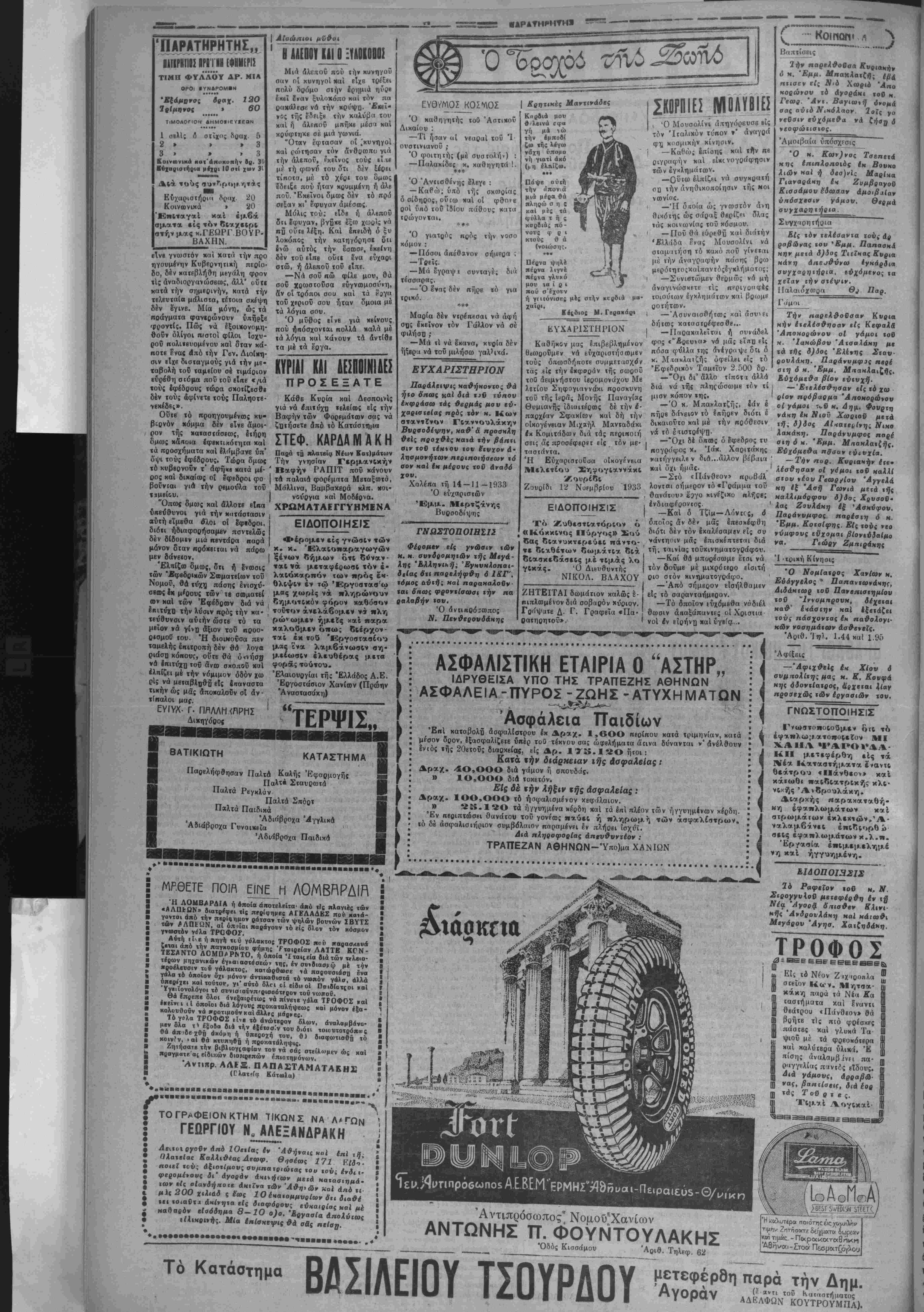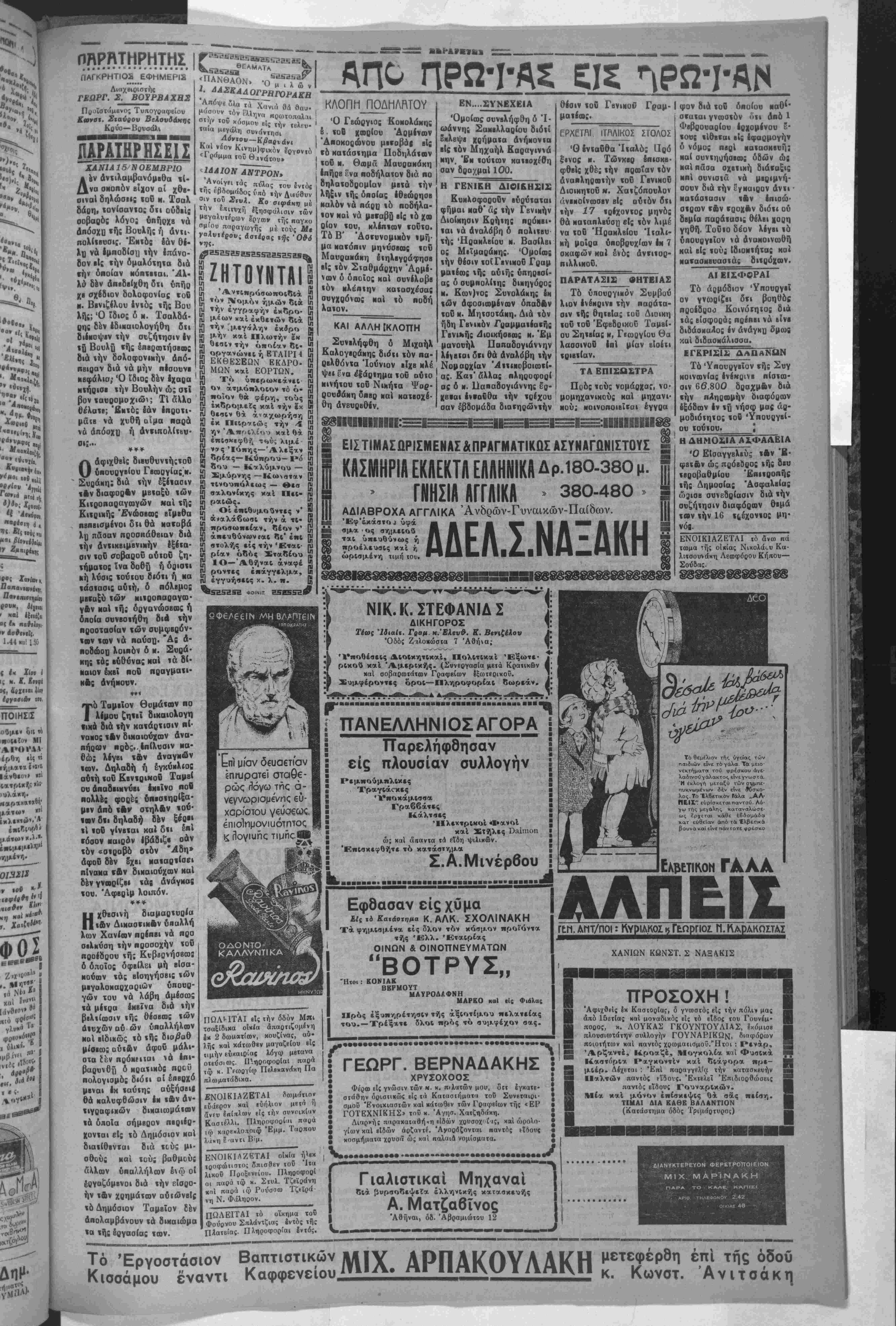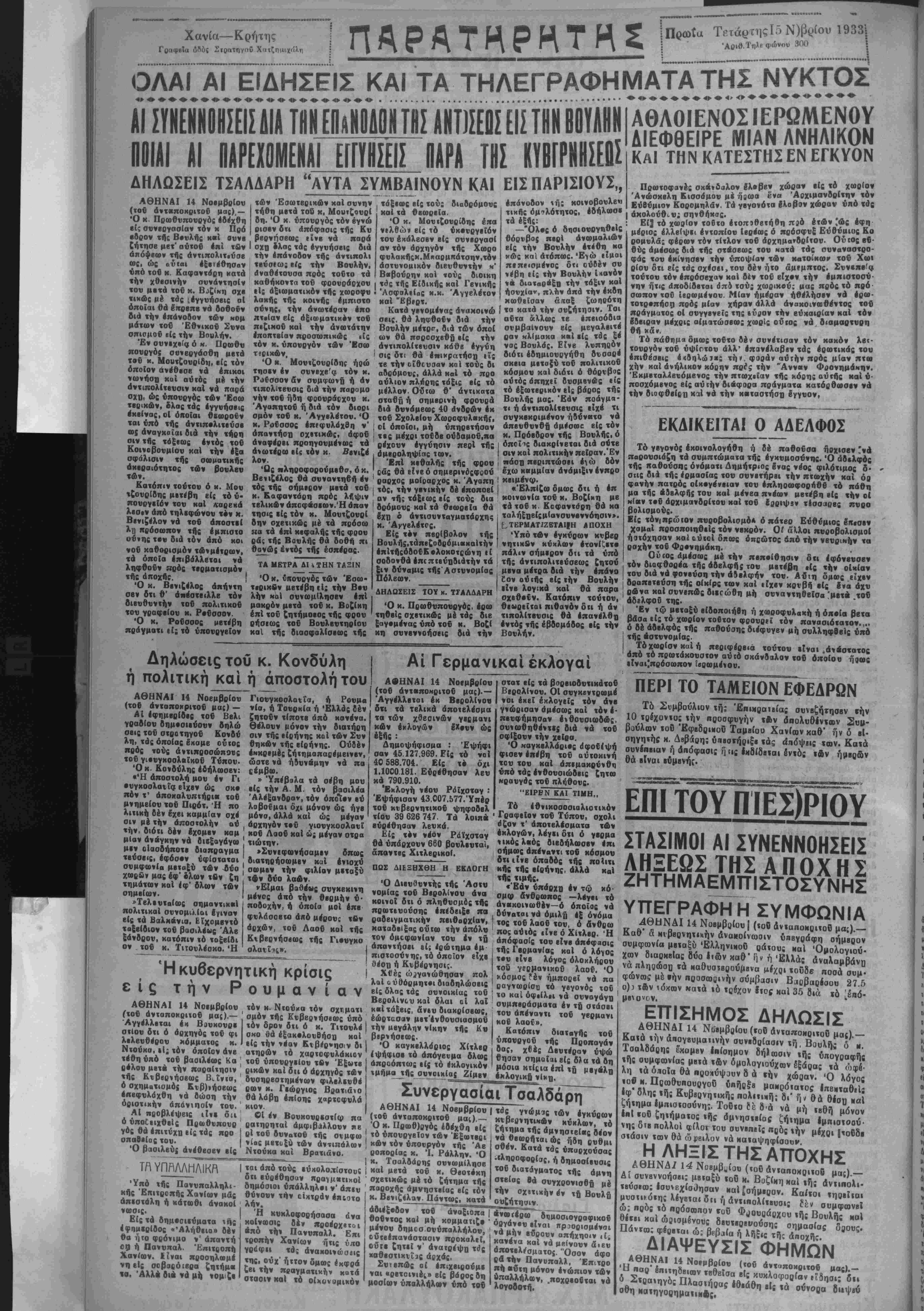 (τού ^«<--οκο»ο« μας).-. κιβερνητικων κύκλων, «ό 5 Ϊΐ5?"!&*?_'Λΐί.1· '1ς "Ψ" *?β »^»1θ«βί«ς δέον ΤΑ ΥΠΑΛΛΗΛΙΚΑ Ι Υπό «ής Παννπαλληλι- χής Έπιτροπής Χανίων μάς απεστάλη ή κάτωθι άνακοί νωσις. Είς «ά δημβσιεύματα ής έφημβρίδος «'Αλήθβια» δέν θα Ί)%ο φρόνιμο ν3 άπαντή 09 ή Παννπαλ. Έπιτροπή Χανίων. ΙΙναι προσηλωμέ νη είς σοβαβόΐβοα ζητήμα «α. Άλλά δια νά μή νομζβ ται άπό τούς ιΰκολθΛίστους διι ευρέθησαν πραγμ«τΐκοί δημόσιοι ύπάλληλοι ν' άπευ θύνουν την οικτράν έηιατο λήν. Ή κυχλοφορήσασα άνα κοίνωσις βέν προέρχβτοι «πό την Πανυπαλλ. Επι τροπήν Χανίων ήτις υπο γρίφιι τάς άνακοινώσβις της, ούχ' ήττον δμως έκφρά ζβι την πραγματικήν κατά στάσιν κα! τό οικονομικόν τό υπουργείον των Έξ«οτβΗι κων «όν υπουργόν «ής Άε ροπορίας χ. Ί. Ράλλην. Ό κ. Τσαλδάρης συνωμίλησβ καί μβτά τού χ. Θβοτσχη σχετικώς μέ τό ζήτημα «ής παροχής άμνηστβίας βίς τόν χ. Βενιζέλον Πάντως, κατά άδιέξβδον τοΰ άναξιοπα Οοΰντος καί μή κομματιζ· μένου βημοσ.ονύπαλλήλου, οΰτβέπανάστασιν προκαλεΐ, ού" γ β ζητεί ν' ανατρέψη τίς χαθβστικτιΐις αρχάς, Συιβπώς οί έπιχβιρούμβ ναι «ρβτοινιές» είς βόροςδη μοσίων ύπαλλήλων υπό τοΰ ίβ«ι ώς ηδη ρυθμι σϋέν. Κατά «άς υπαρχούσας πληροφορίας, ή δημοσίβυσις τοβ διαταγματος «ής βμνη ατβίας Θά συγχρονισθή μέ την σχβτικήν έν τή Βουλή ουζήτησιν. τρω δημοσΐογραφικοΰ οογάνου βΐναι προορισμέναι νάμήν βΰρουν απήχηοιν ,ί^ χανένα καί νά μβίνουν άιευ άπο«βλ»Όματθ{. "Οσον άφο ράτήν Πανυπαλλ, Έπιτρο πή βιΰτη μόνον ενώπιον των ύπαλλήλαν, ,ποχρβοβται νά λογοδοτή. ΑΘΑΟ ΕΝΟΣΙΜΜΕΝ0Υ ΔΙΕΦΘΕΙΡΕ ΜΙΑΝ ΛΝΗΛΙΚΟΝ ΚΑΙ ΤΗΝ ΚΑΤΕΣΤΗΣΕΝ ΕΓΚΥΟΝ Πρωτοφανές σκί.δαλον Ιλ·ββν χώραν βίς τό χωρίον Άνώοχβλη Κισσάμον μίίυω. β·« Α™»™*°1™ ^ϊ Εύβύμιον Κορομηλάν. Τα γβγονότα «λοβον χώραν ύηό τάβ ακολούθων; σηνθήκος. . Είϊ τό χωρίον τοδτο έτοπίθβτήθη π30 »«« ,ας βΦ»ΐ μέριος ελλείψει έντοπίον ίβρέως ό πρόσφυξ Ευθυμιος Κο οομνλδς φέρων τόν τίτλον τοΰ άρχημανδρίτου. Ούτος εβ βύς άμέσως βιά τής στβσβως τού κατά τάς ονναναστρο- Φάς τον έκίνησβν την ύποψίαν των χατοικω»· τοβ Χωι ρίον δτι βίς τάς σχέσβι,τον βέν ήτο «μϊμπτος. -υνεπβία τούτου τόν έπρόσβχαν κα· βέν τοβ ε!χ·ν την εμπιστοσύ¬ νην ήτις άποβίββται όπο τσύς χωρικβύ; μας πρός τό πρό σωπον τού ίβρωμένου. Μίαν ημέραν ήθέλήσβν νά έρω· «ο«ρ·πήοη πρός μίαν χήρβν άλλά άναχοινω«έν«ος τοΰ πράγματος οί συγγβνείς «ής ·ύ?ον «ήν ευκαιρίαν χαί τόν βδβιραν μέχρις αίματώσβως χωρίς ου τος νά διαμαρτυρη Οή κά». Τό πάθημαδμως «οβ«ο δέν συνέτισαν «όν κακόν λβ(· «ουργόν τοΰ ύφίττου άλλ' έπανέλαββν τάς ερωτικάς τού έπιθέσβις έχδηλώι*; τήι, φοράν αυτήν πρός μίαν πτω χήν καί άνήλικον κόρην πρίς την Άνναν Φβονημάκην. Έχμβταλλβυόμβνος την πτωχείαν τής κόοης αυτής καί ύ· ποσχόμενος είς αυτήν διβφορα πράγματα κατόαθωσβν νά την δισφθβίβτι καί νά την καταστήση £γγυον, ΕΚΑΙΚΕΙΤΑΙ Ο ΑΑΕΛΦΟΣ Τό γεγονός έκοινολογήθη ή δέ παθοΐσα ήρχισεν Γνά παρουσιάζη τα σνμπτώματα τής έγκνμοσύνης. Ό αδελφάς «ής παθούσης ονόματι Δημήτριος Ινας νέος φιλότιμος δ· στις διά «ής έρμασϊας «ου συνβτήρβι «ήν πτωχήν καί όρ φανήν πατρός οίκβγβ'νβιαν τον έπληοωφορήθΰ τό πάθη μα «ής β.9βλφής τού καί μένβα πνέων μετέβη βίς «ήν οί κίαν τβΰ άρχιμανδρίτου καί «ου ίοριψβ» τίσσαρβς πυρ,ο βολισμούς. Είς τόνιπρώιον πυροβολισμό* ό πάτβο Εύθύμιος έπεσεν χαμαί προσποιηθείς τόν νβχρόν. ΟΙ άλλοι πυροβολισμοί ήυτόχησαν καί αΰτοΐ δή ως όπεώτος άπό την νβυρικήν τα ραχήν τοΰ Φρονημάκη. Ο υιός άμέσως μέ την πεποίθησιν δτι έφόνβυσβν 